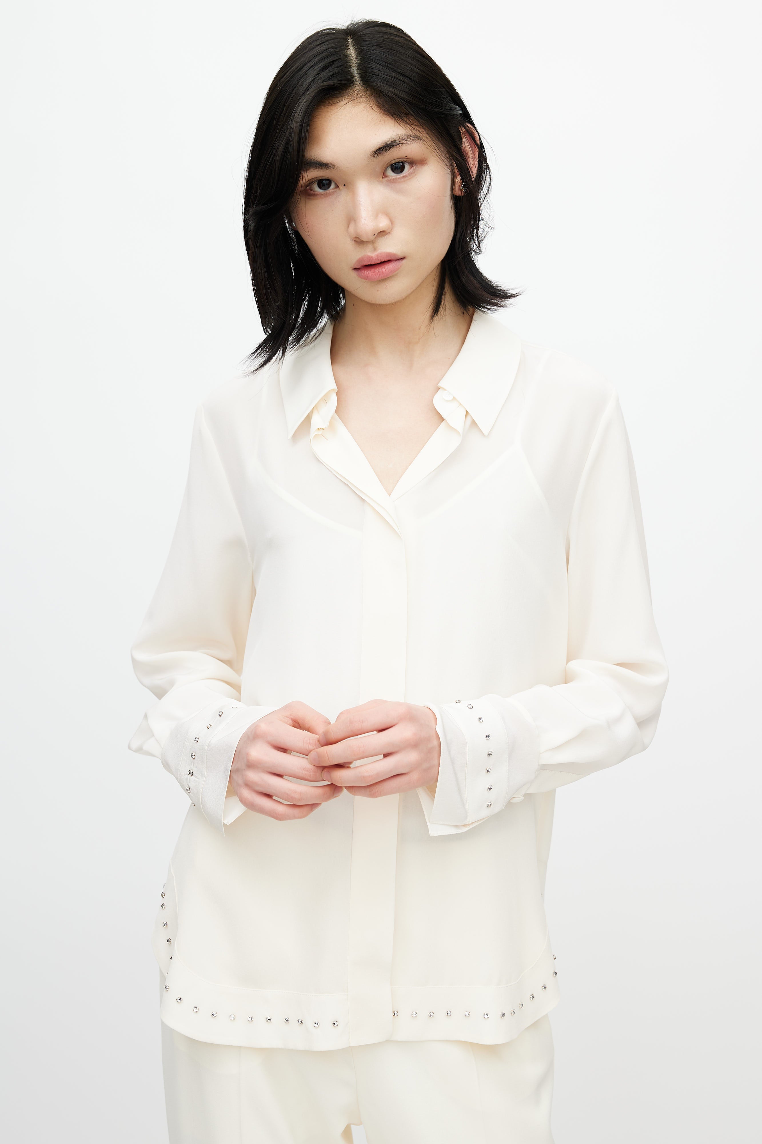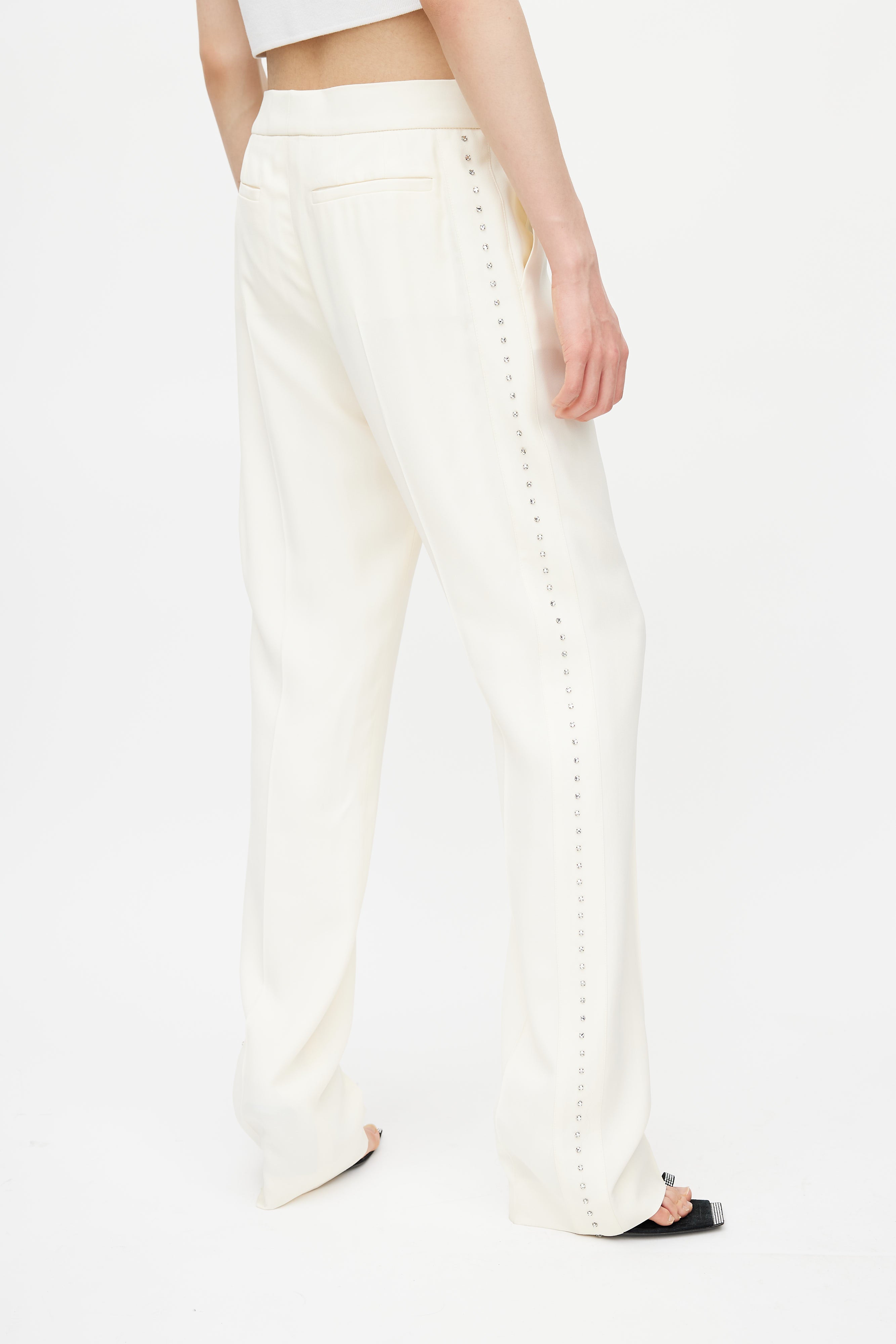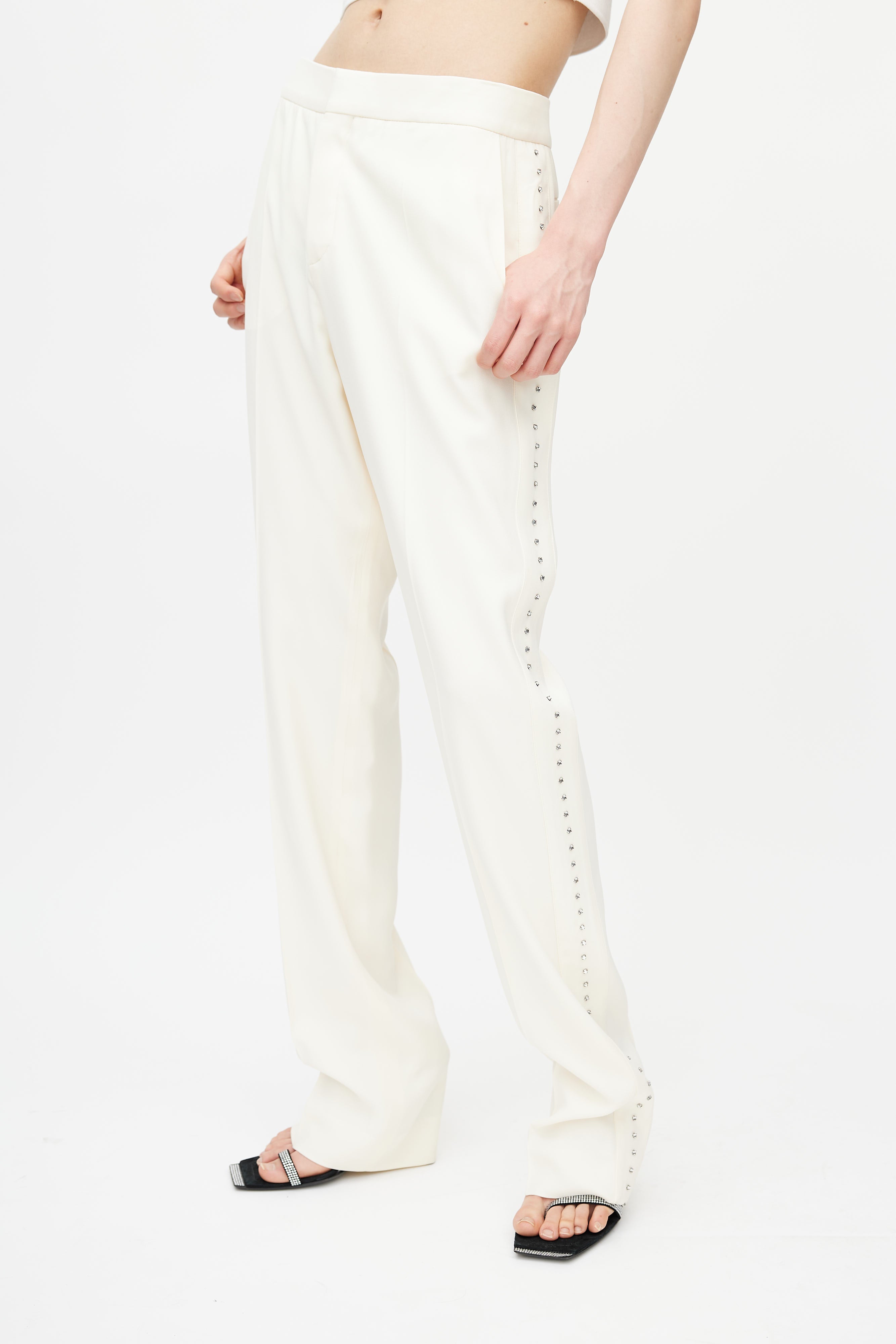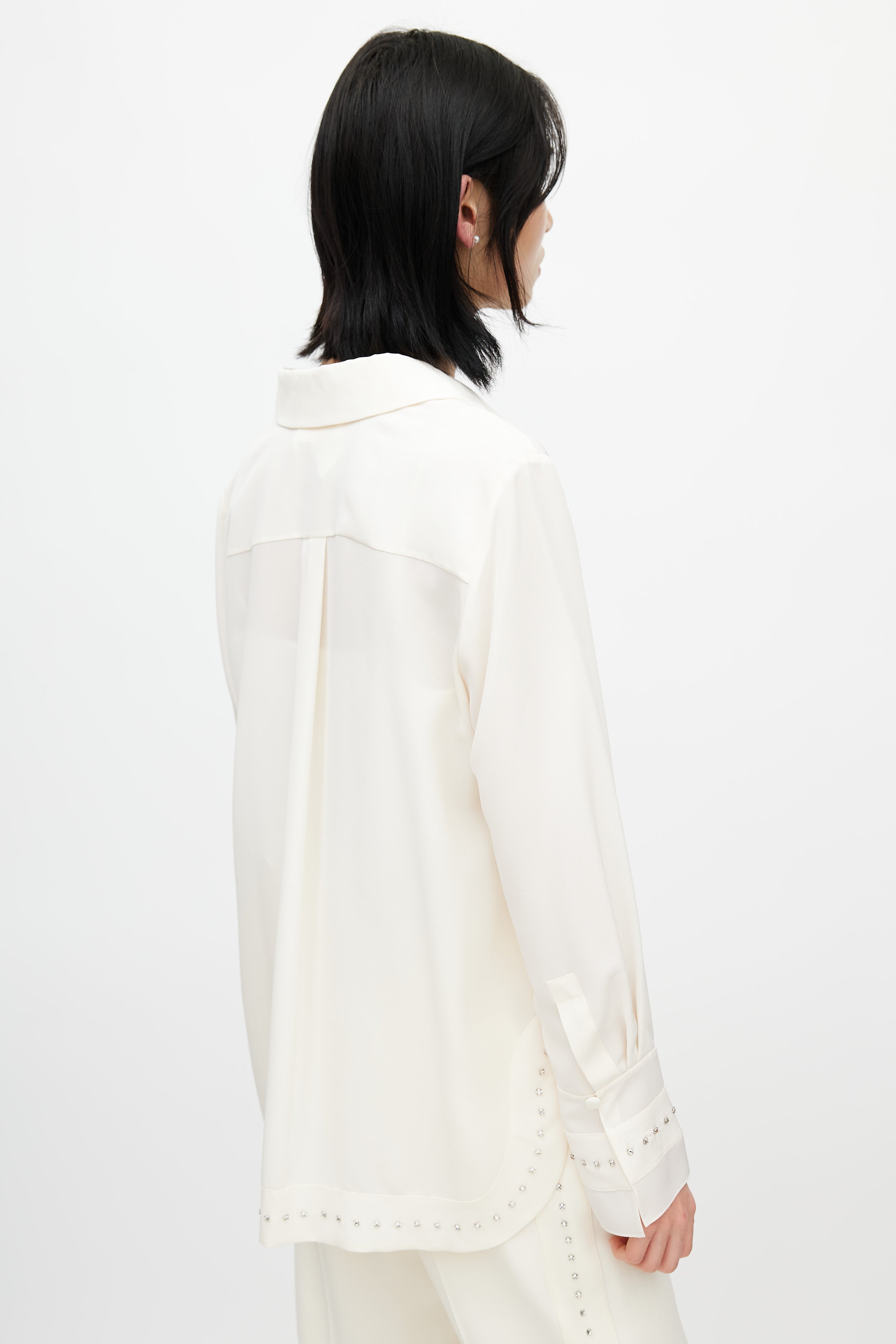 Pre-owned Chloé cream silk shirt featuring a pointed collar, long sleeves with buttoned cuffs, button up front, removable embellished belt, and rhinestone trim at hem. Matching trousers feature rhinestone trim at sides, two slash pockets at hip, two welt pockets at back, straight leg, and zip fly with hook and eye closure.