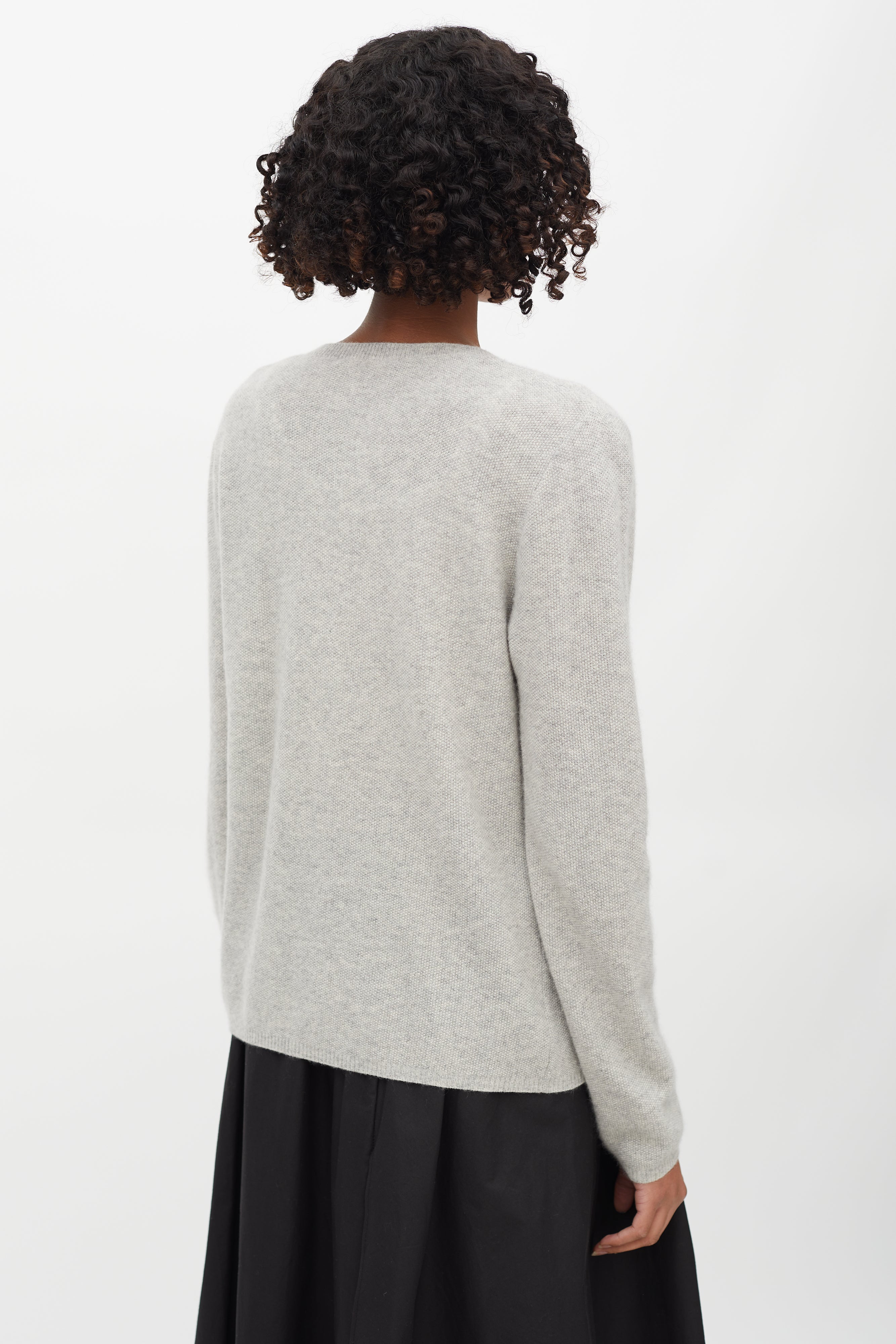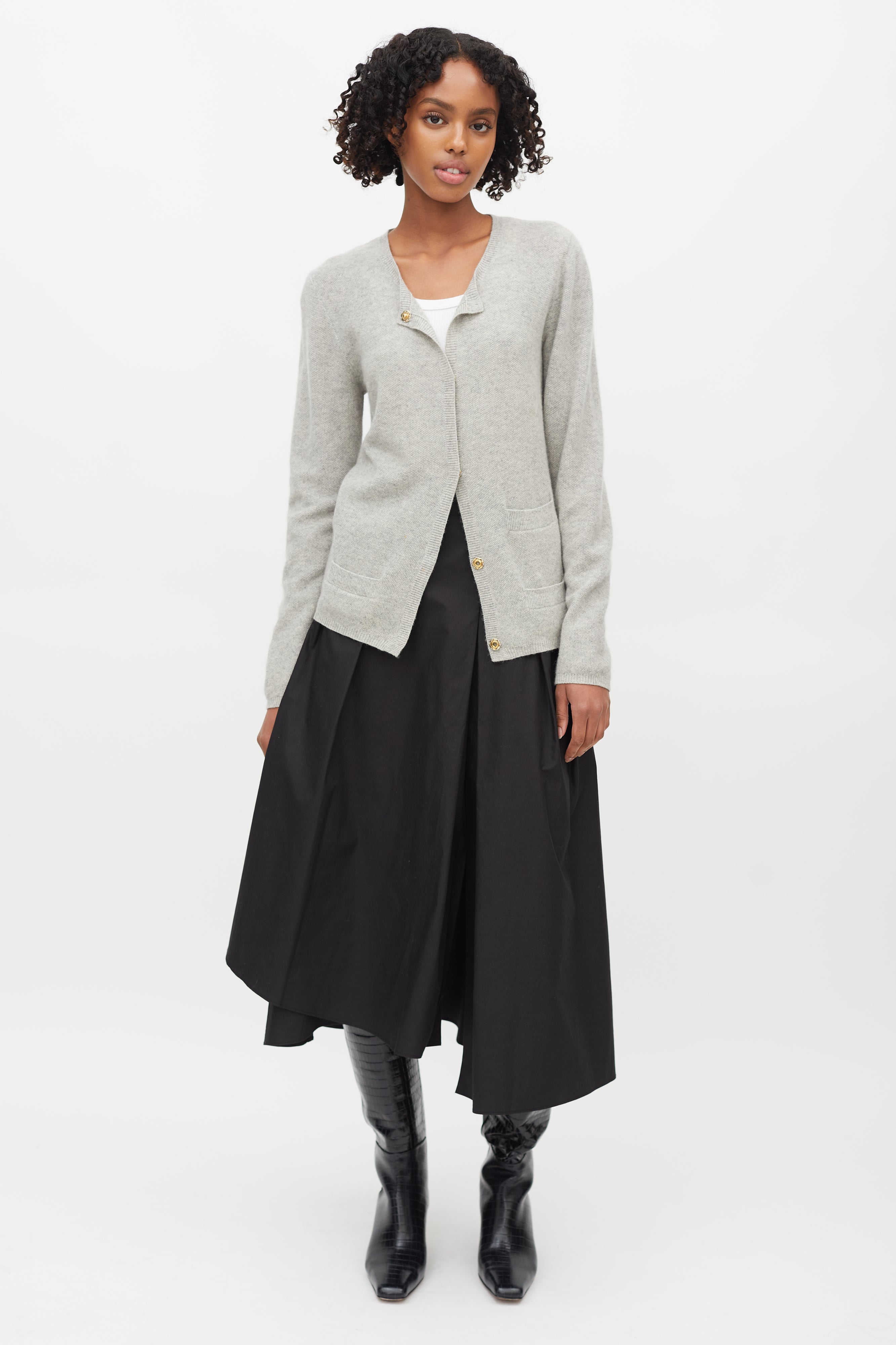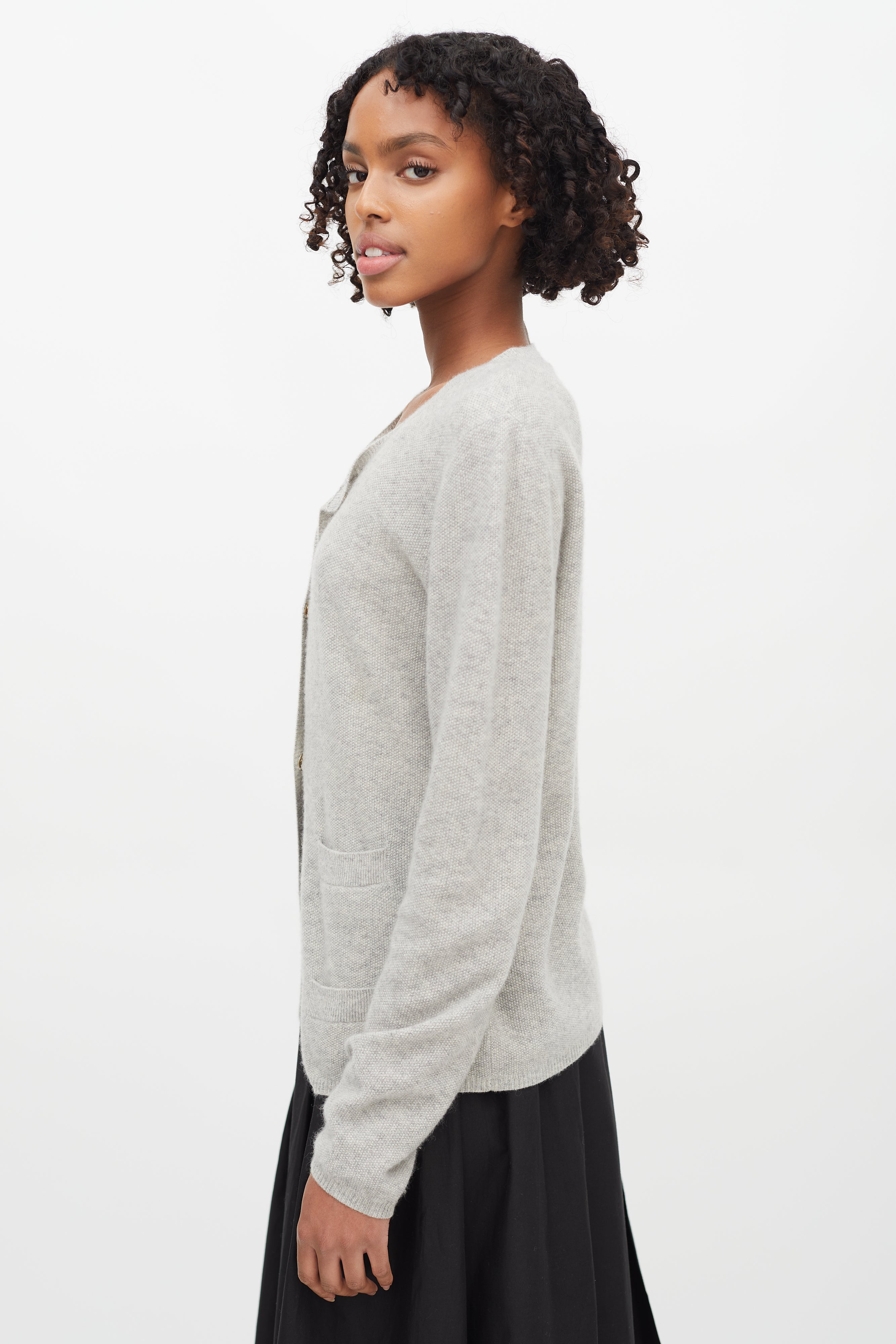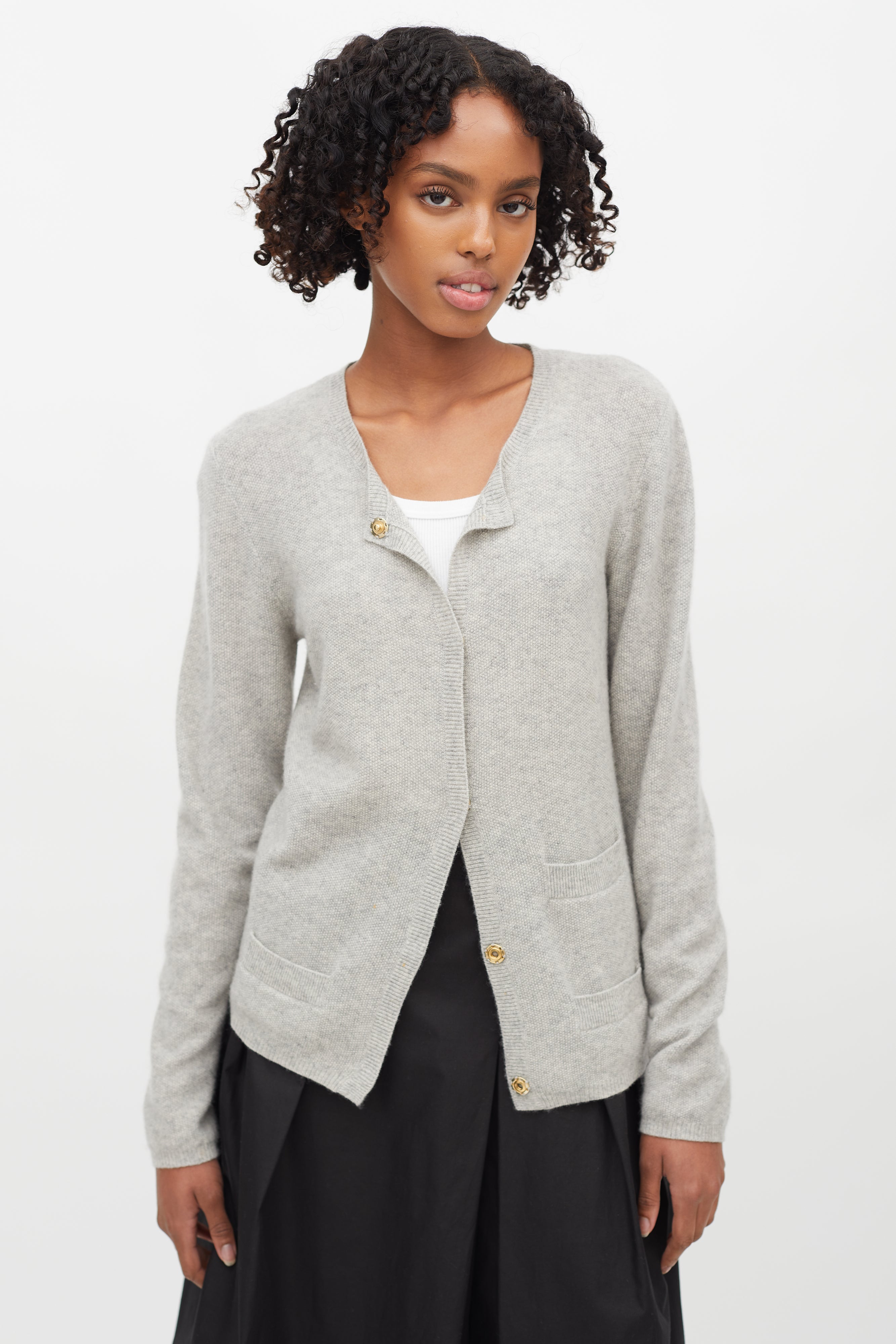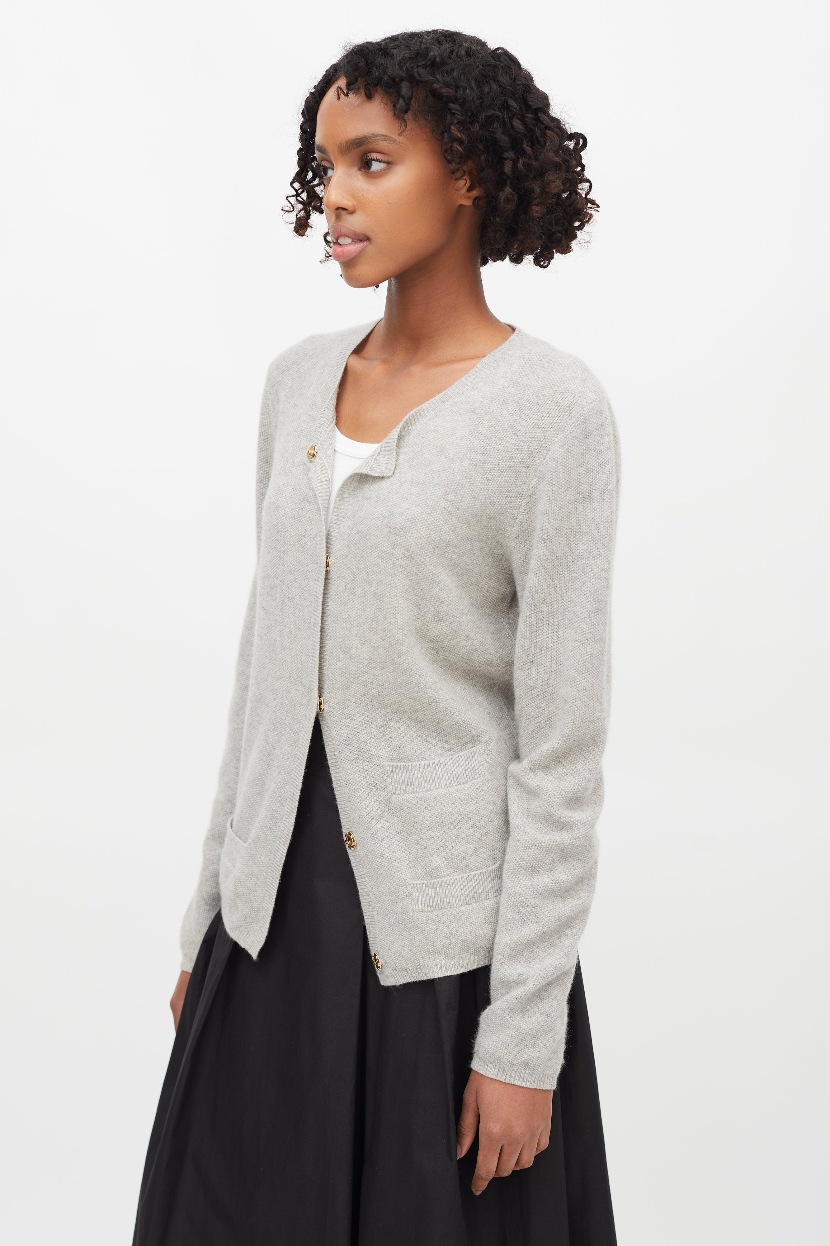 Pre-owned Chloé grey cardigan featuring crew neckline, concealed gold tone snap button up front, three hip pockets, and ribbed hem.