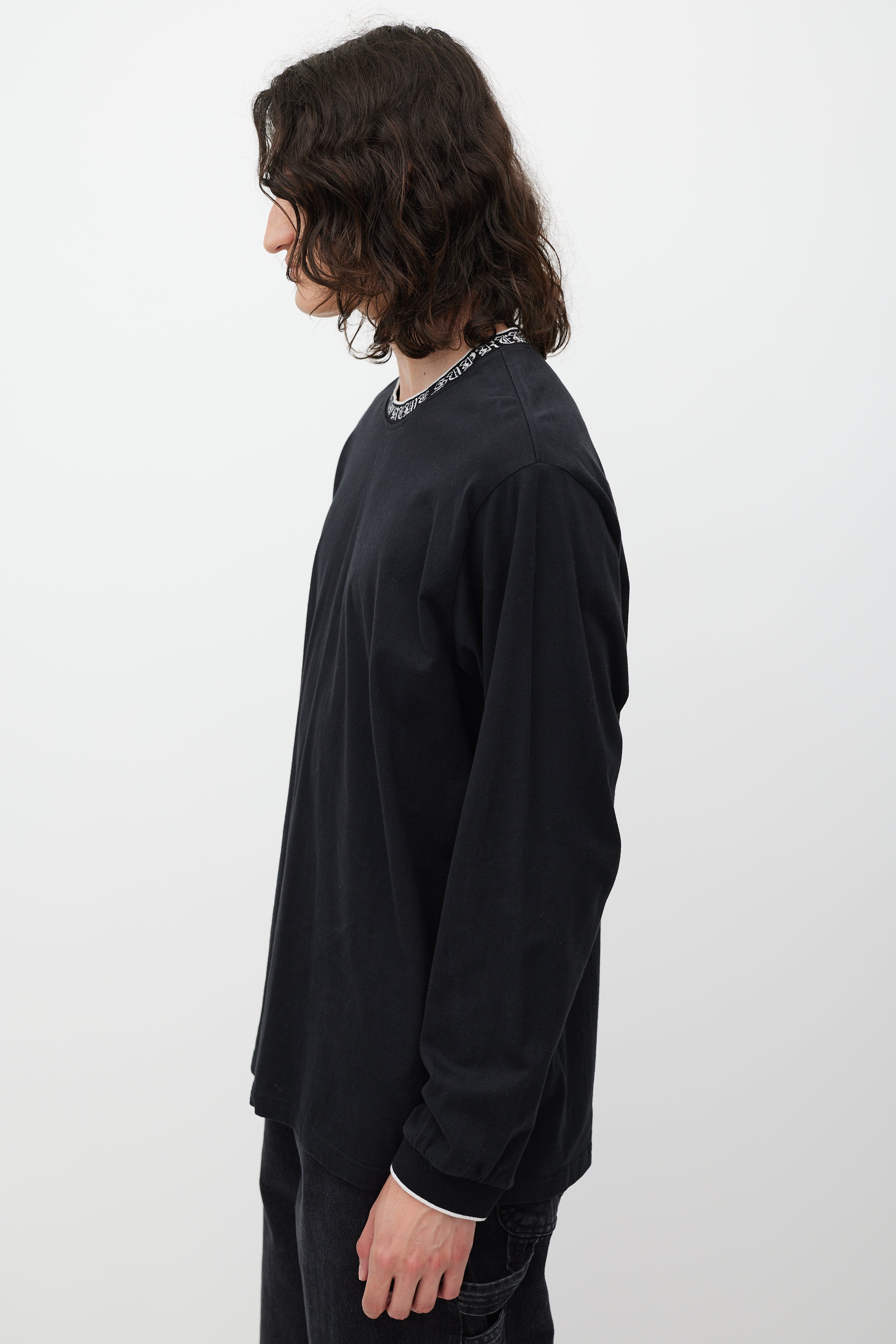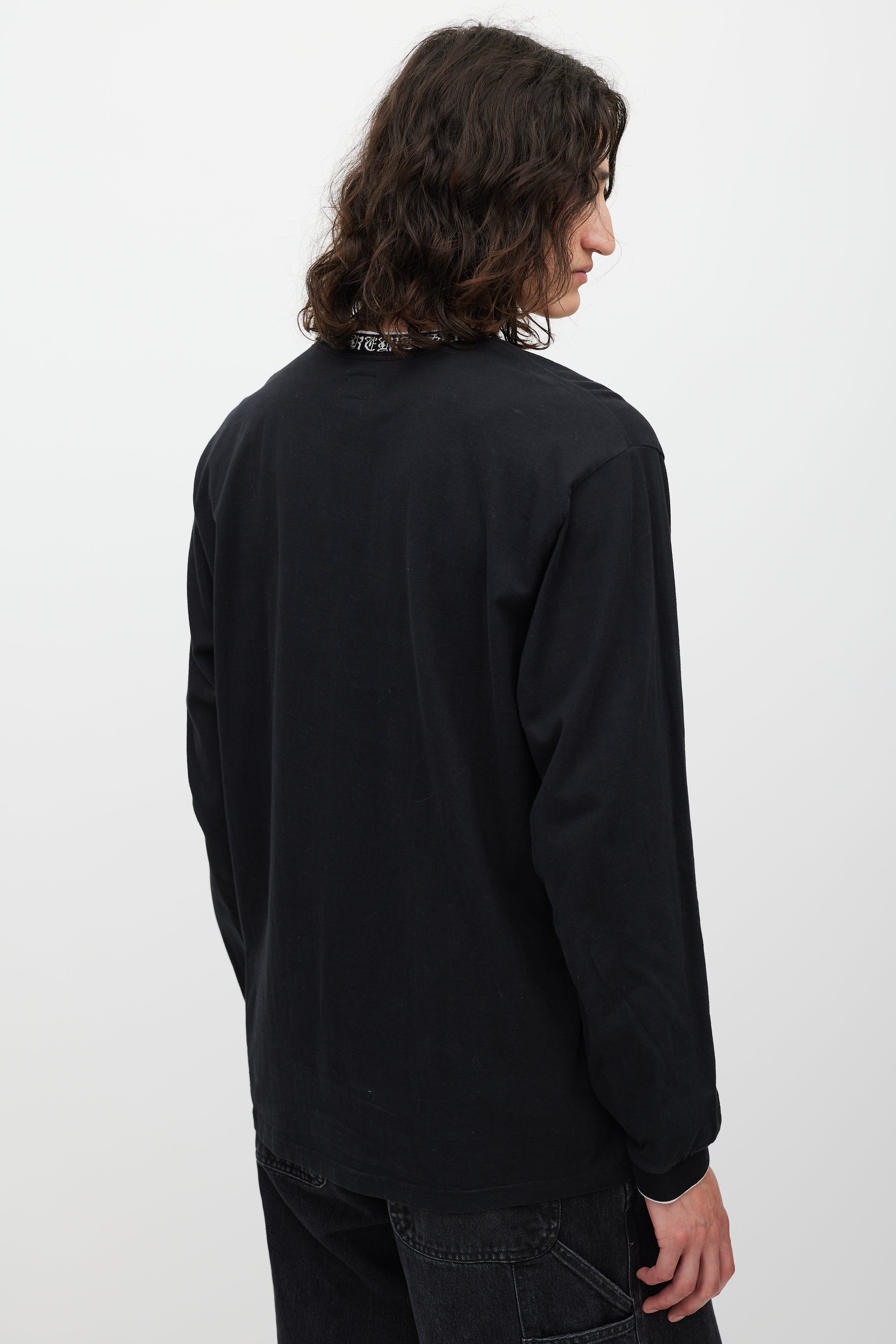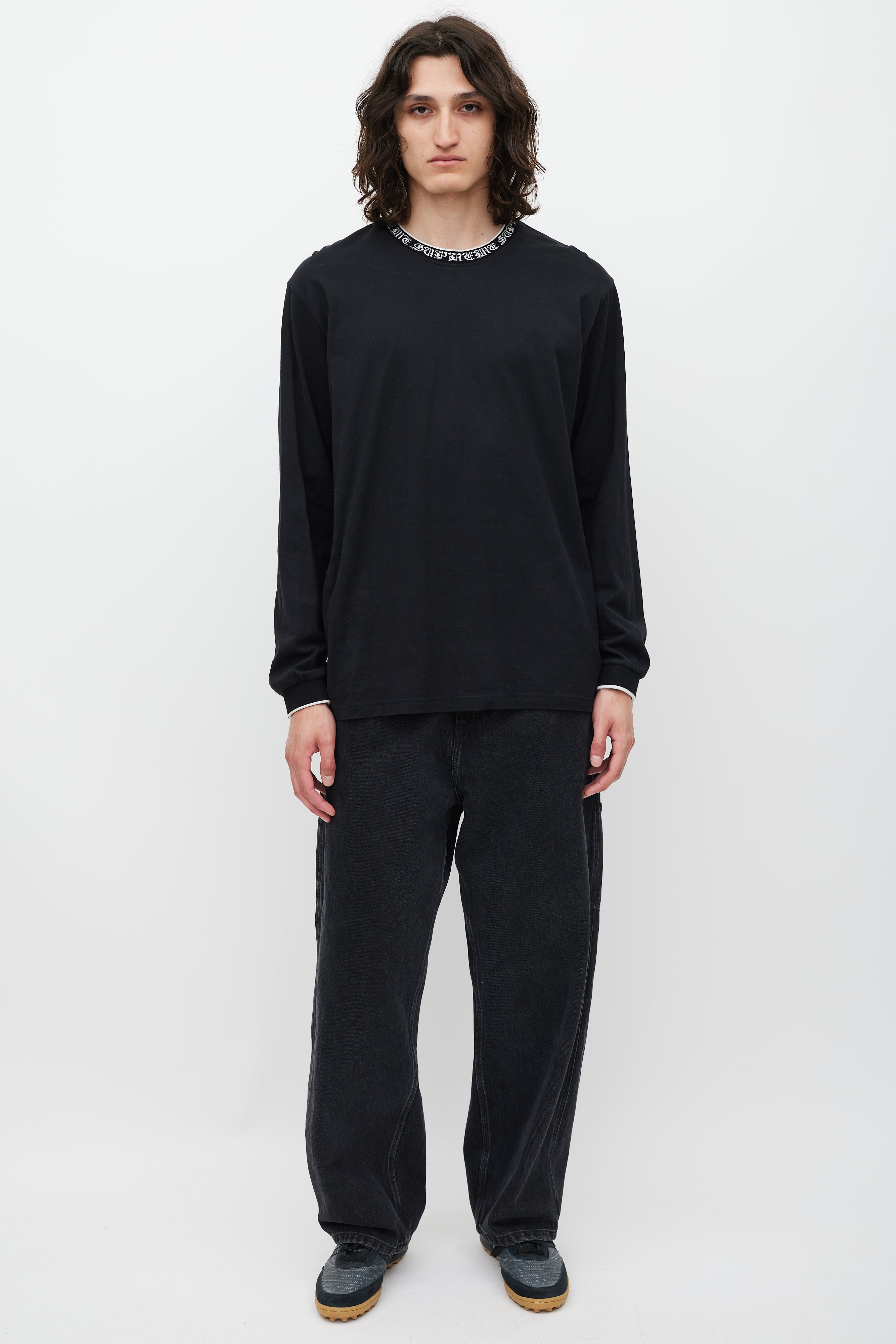 Pre-owned Supreme black top featuring a round neck with white script lettering logo intarsia, even hem, and long sleeves with ribbed cuffs.