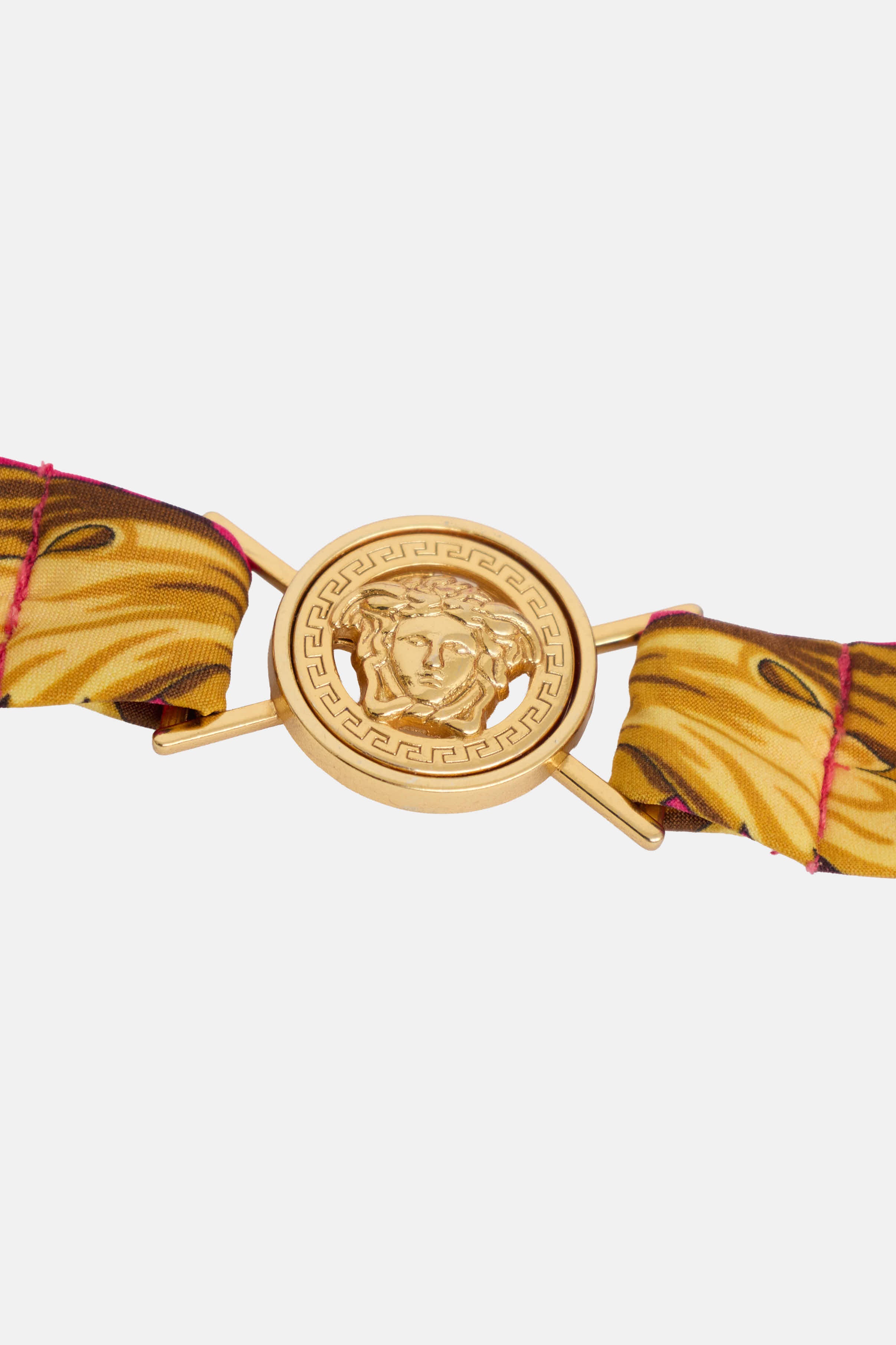 Pre-owned Versace pink and multicolor bikini set featuring top with underwiring, and Medusa push lock closure. Matching bottoms featuring a cheeky cut.