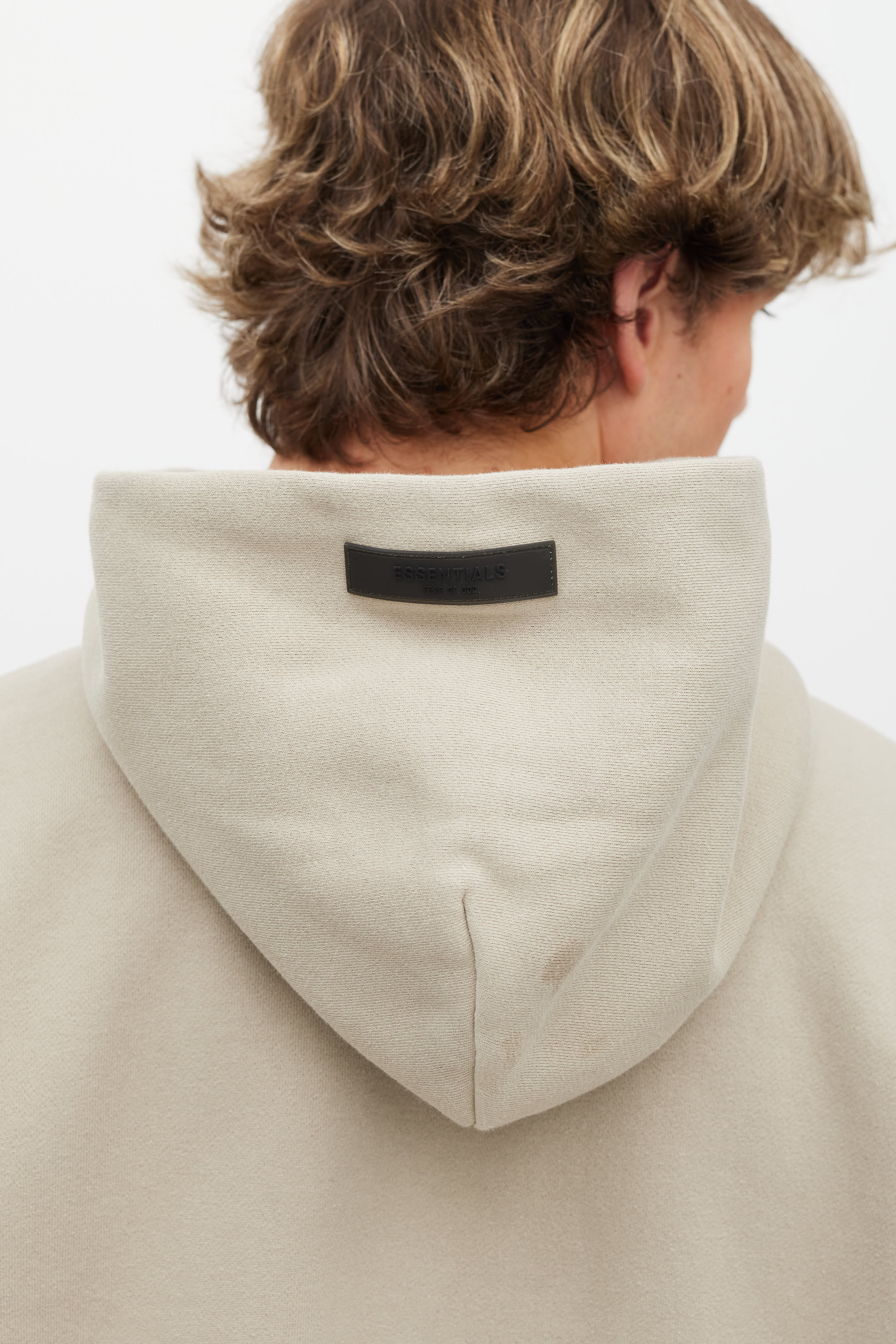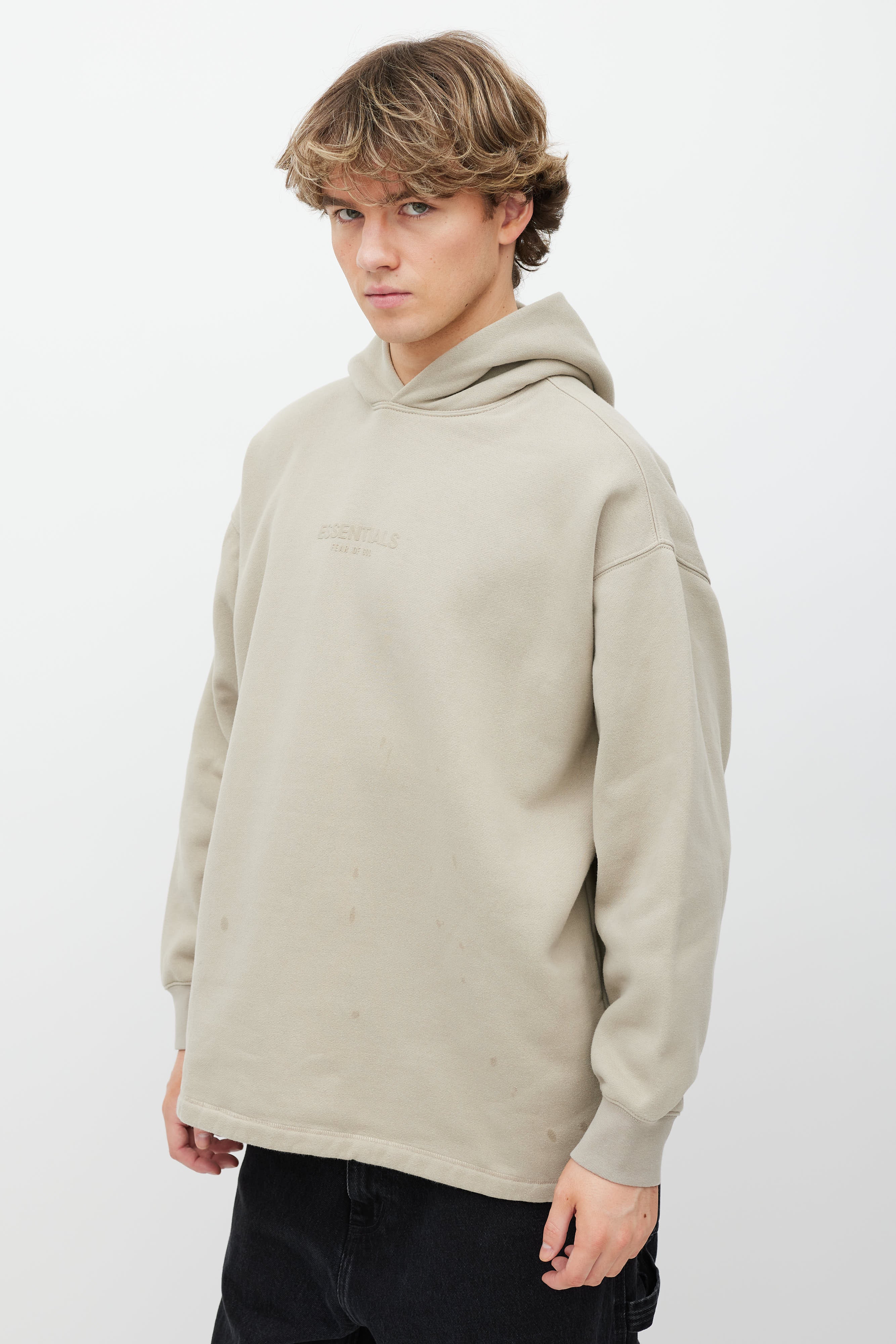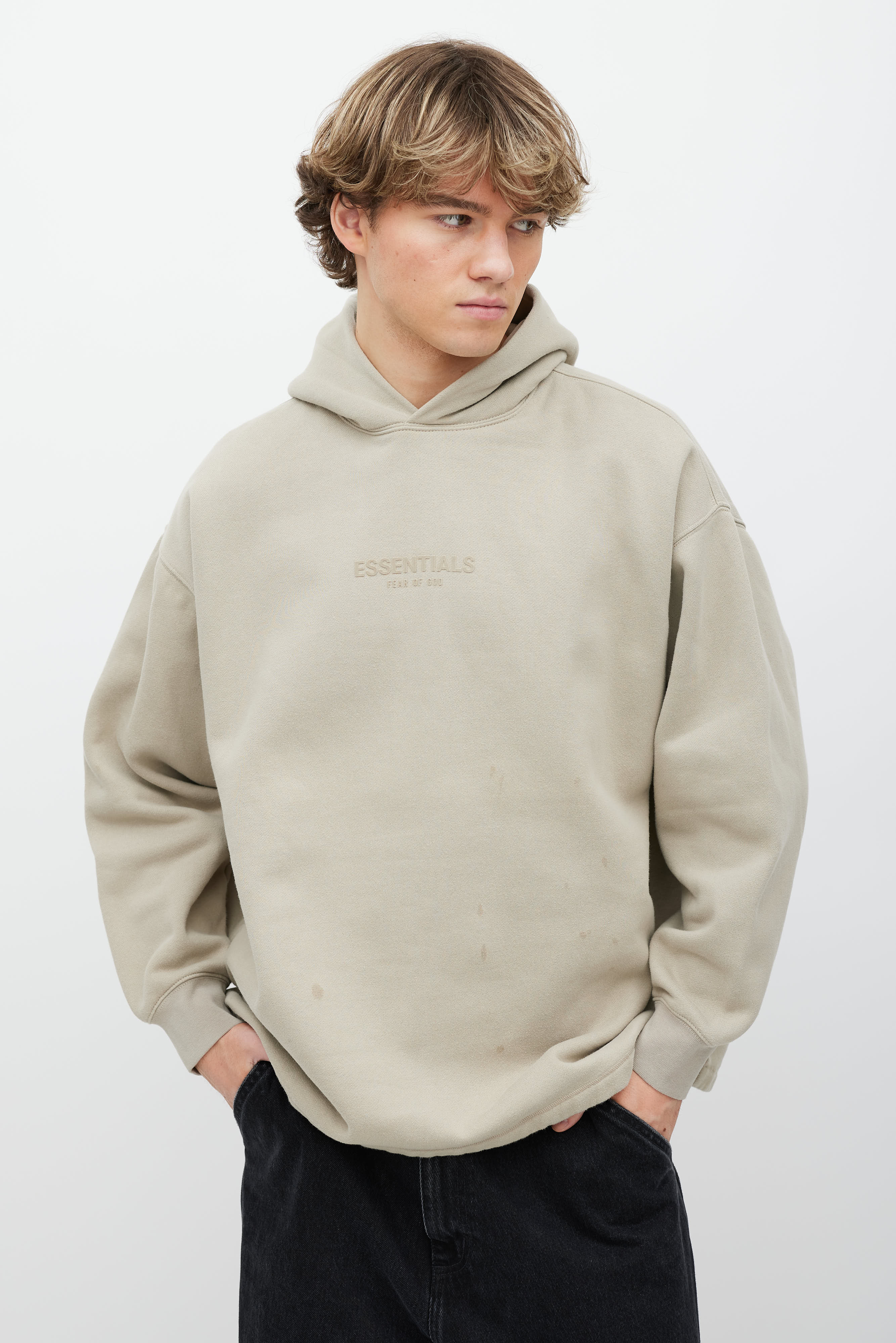 Pre-owned Essentials beige hoodie featuring a rubberized logo patch at hood, long sleeves with ribbing at cuffs, and an embossed logo at chest.