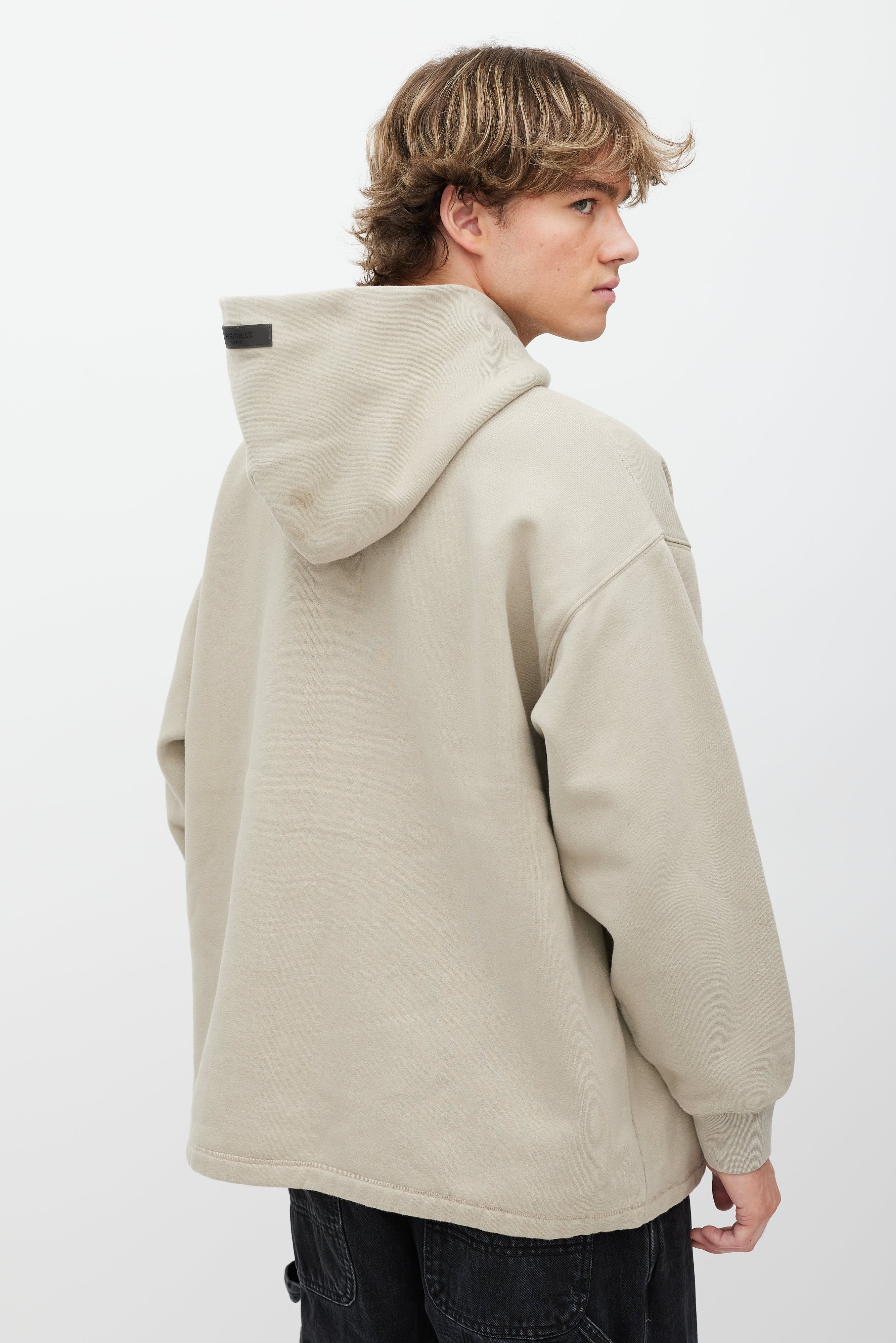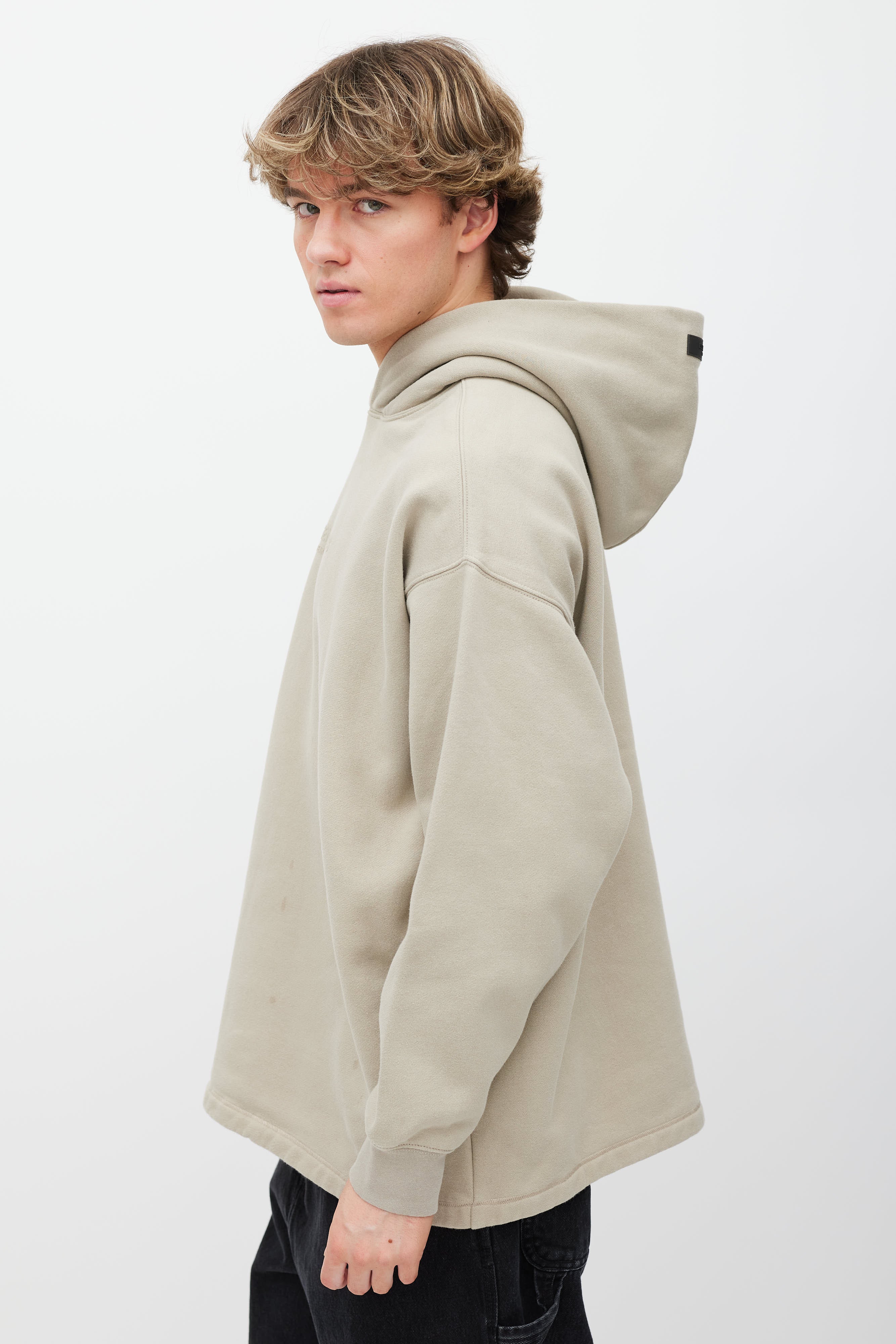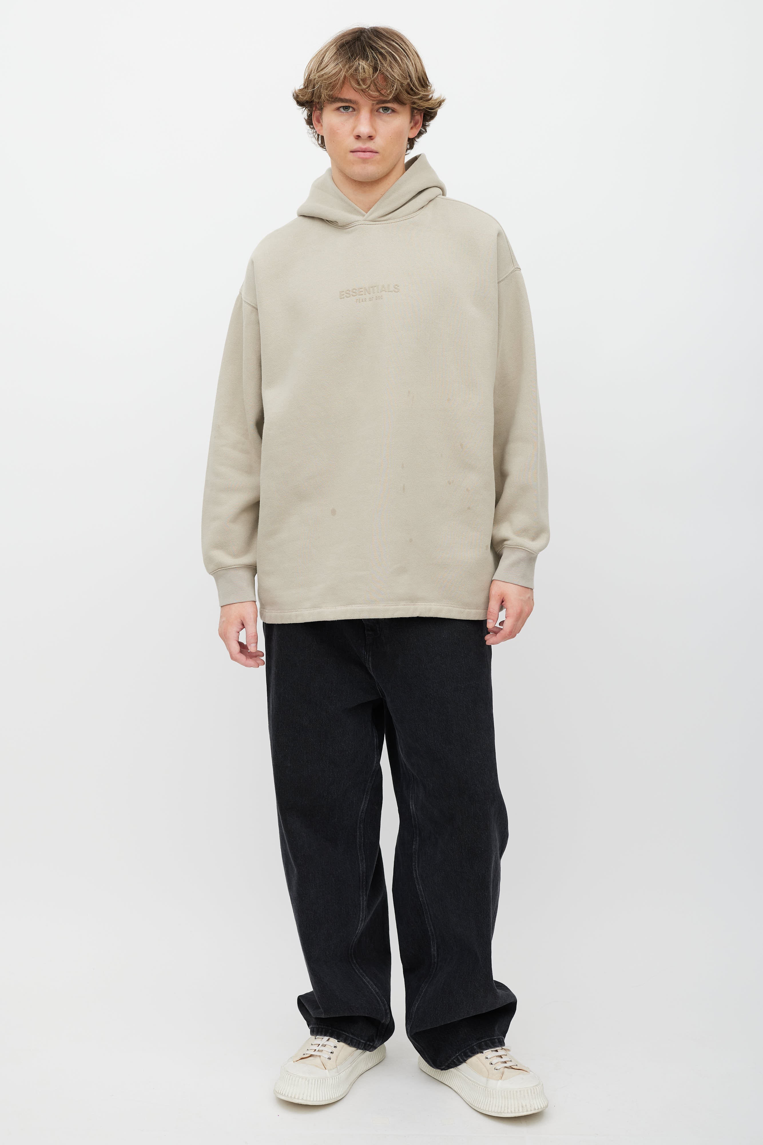Pre-owned Essentials beige hoodie featuring a rubberized logo patch at hood, long sleeves with ribbing at cuffs, and an embossed logo at chest.