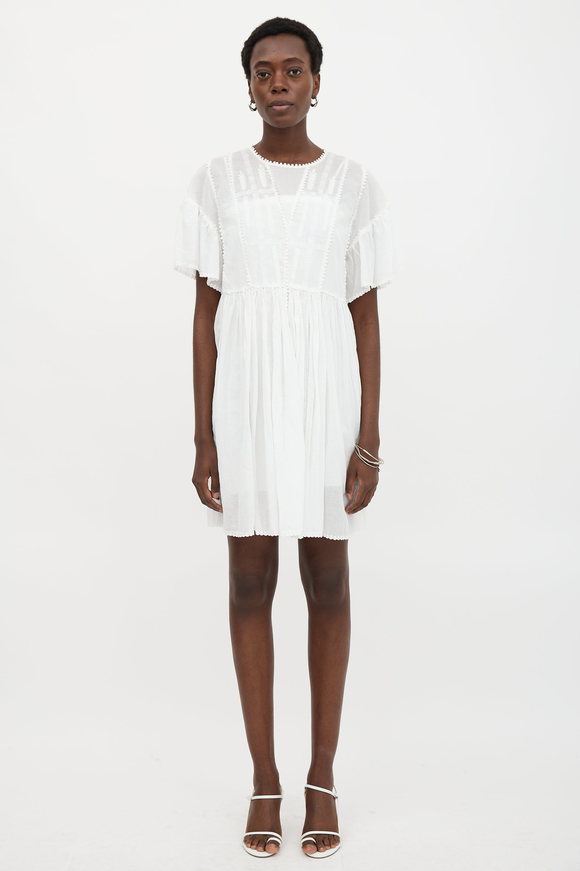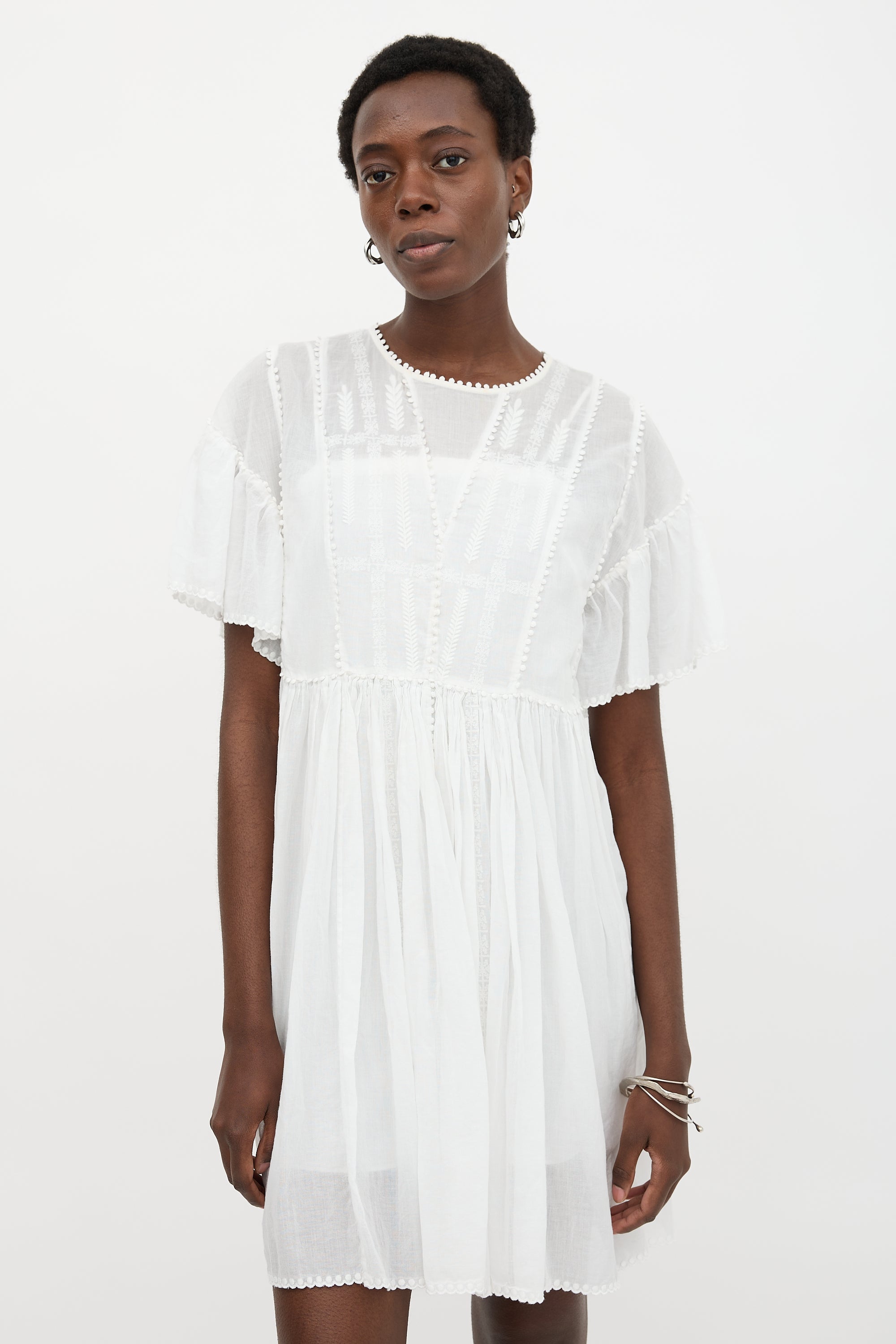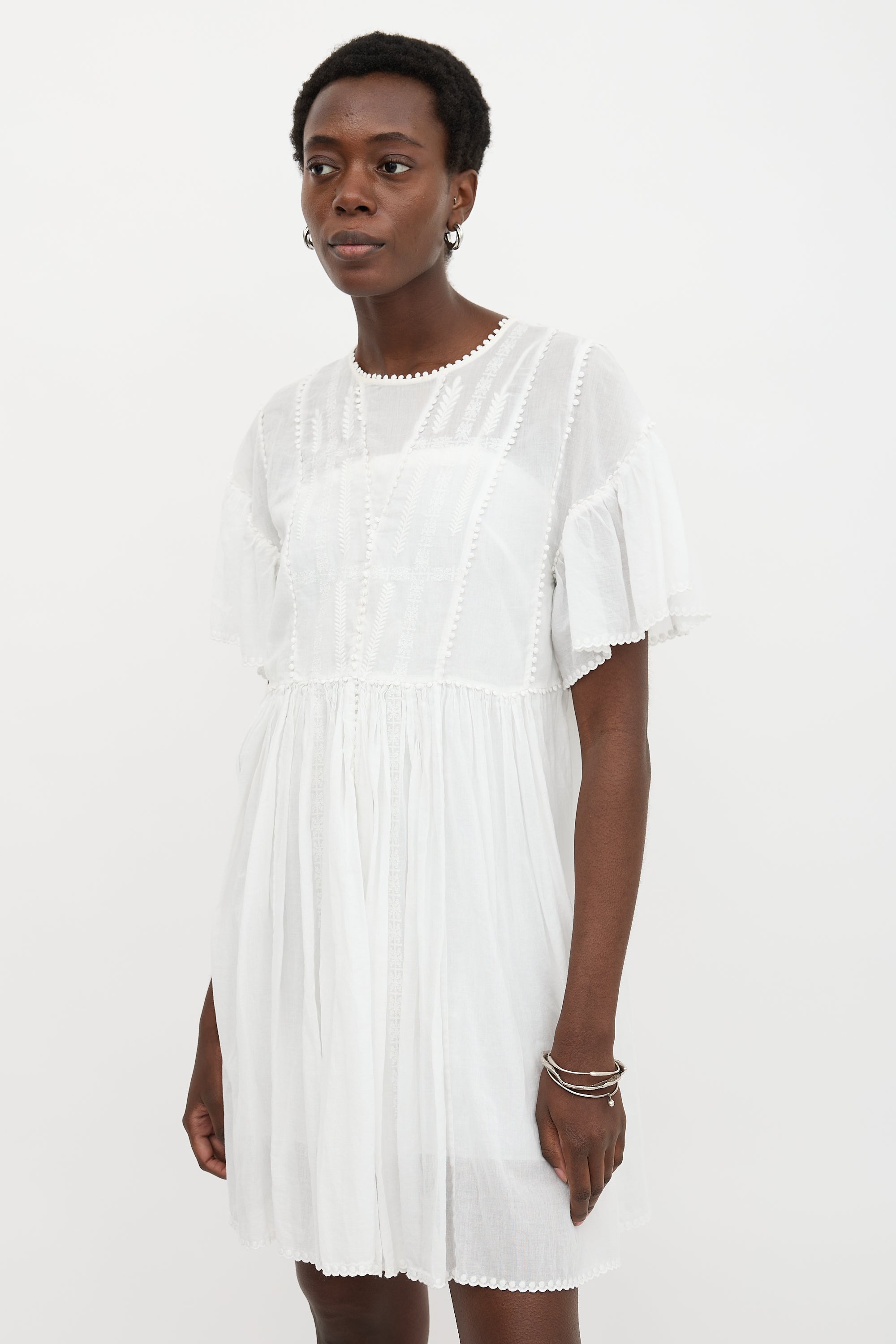 Pre-owned Isabel Marant Étoile white Alba mini dress featuring a round neckline with scalloped detail, embroidery details at chest, sleeves, and centre skirt, keyhole back with button collar closure, gathered skirt, and scalloped hem and cuffs. Slip lining.