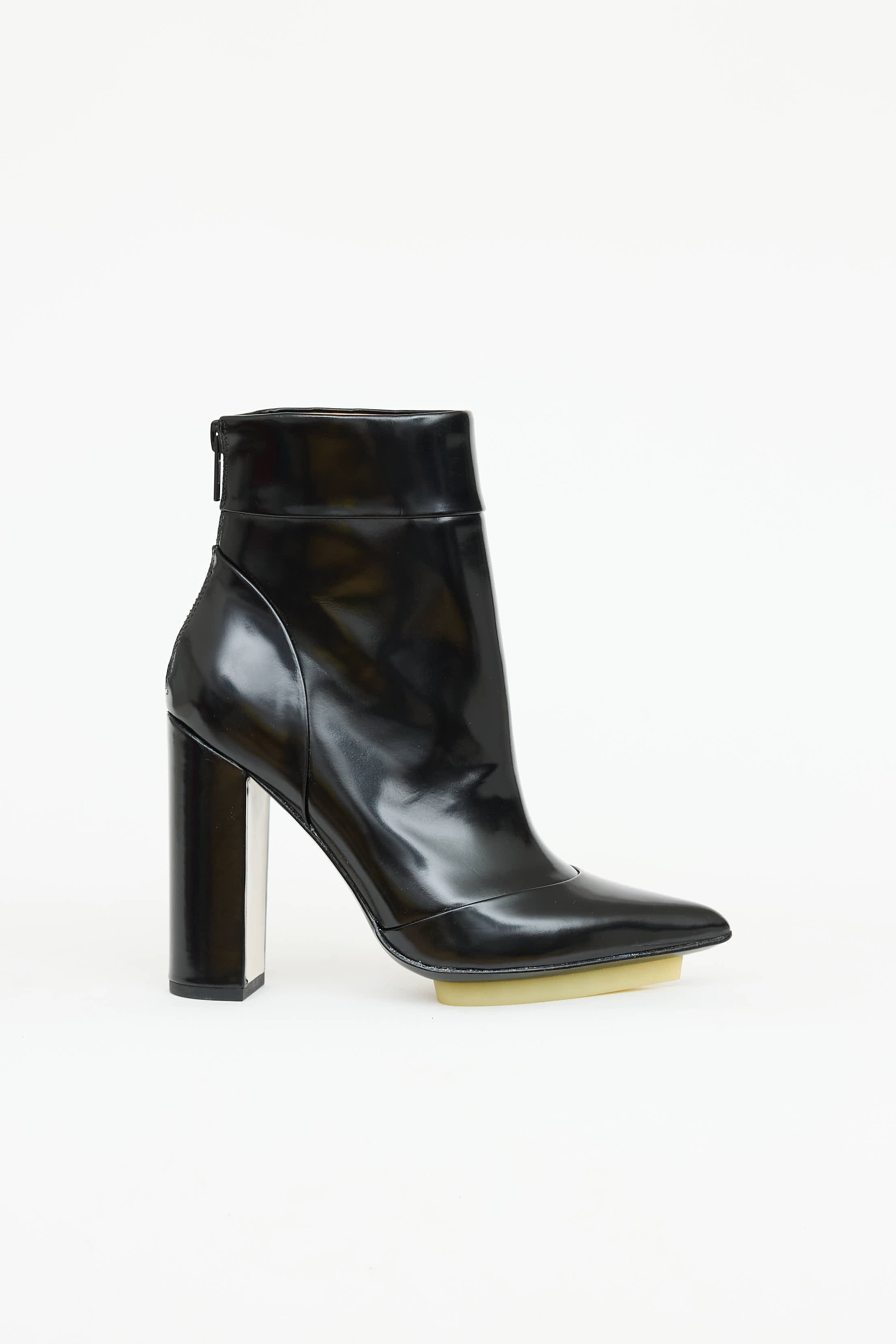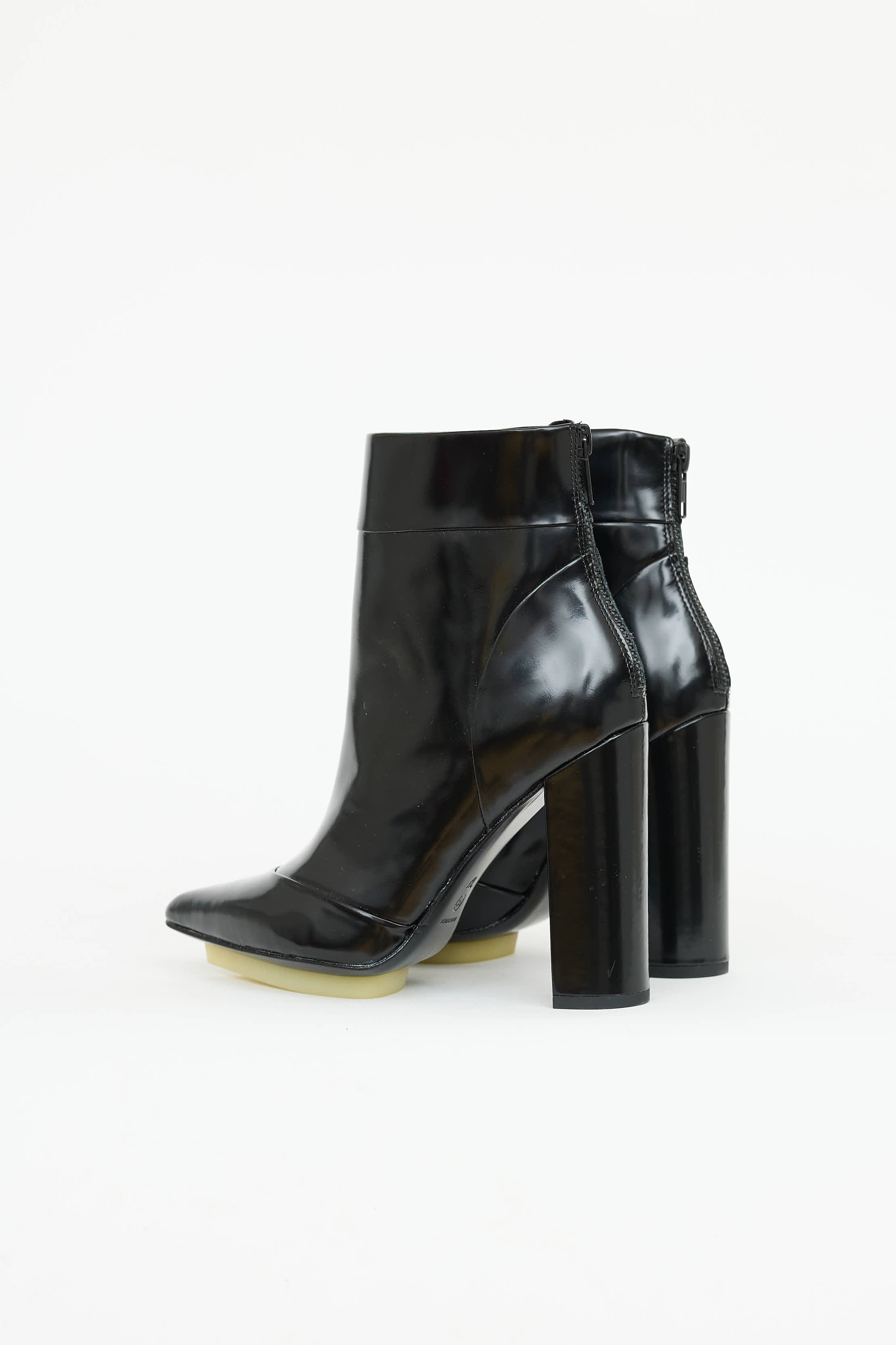 Pre-owned 3.1 Phillip Lim black patent leather Peggy ankle boot featuring pointed toe, rubber outsole, zip closure at back, and covered heel.