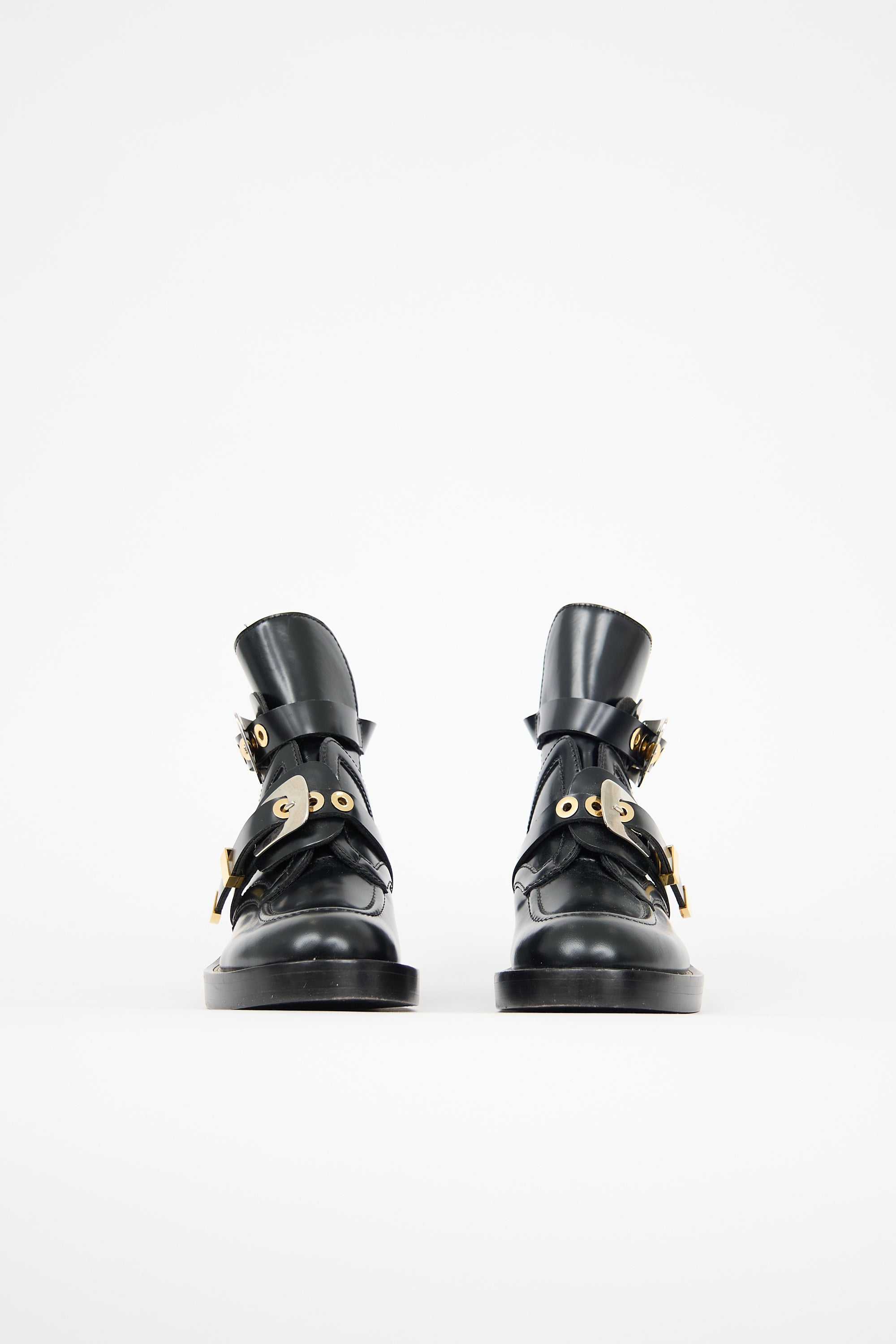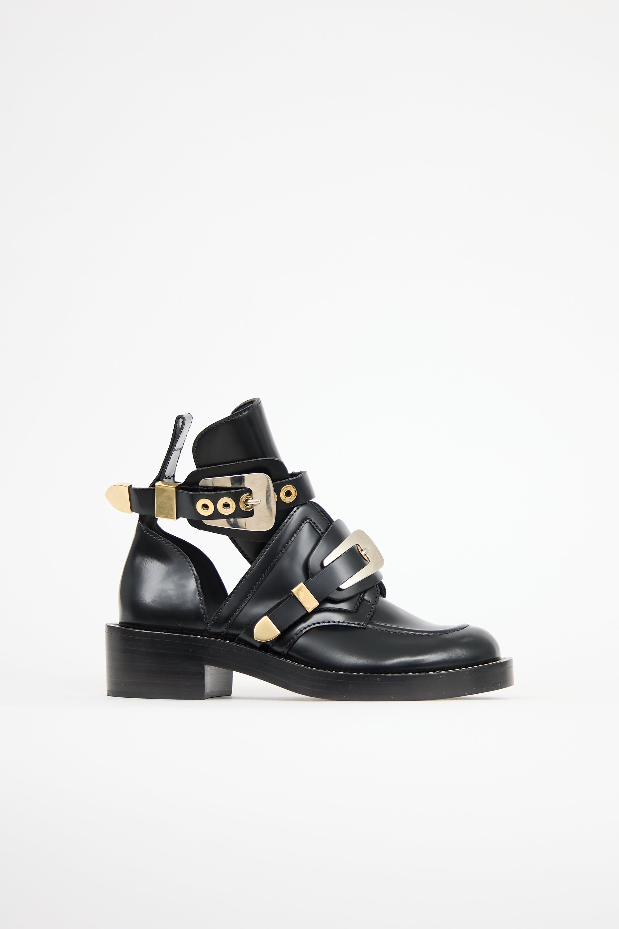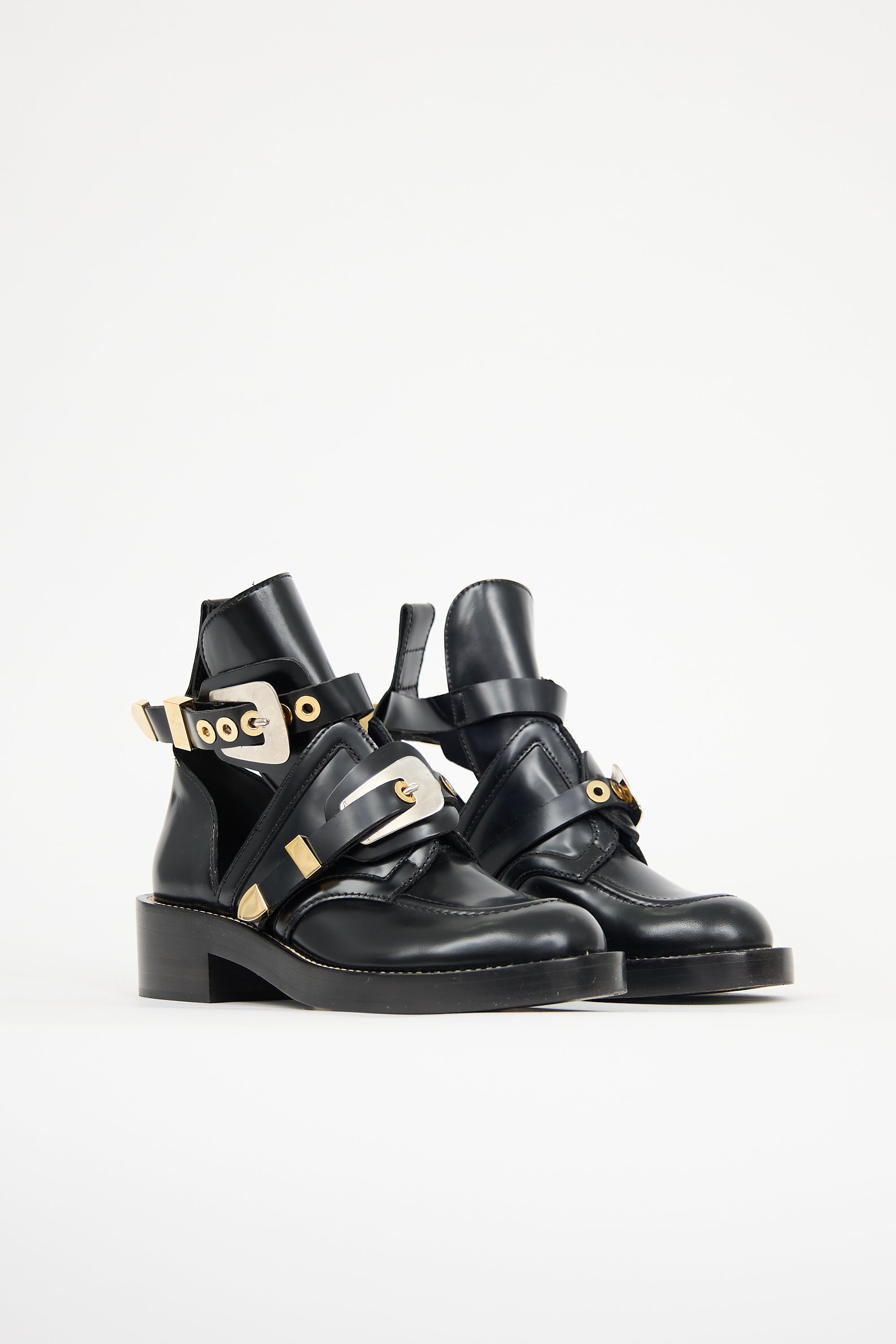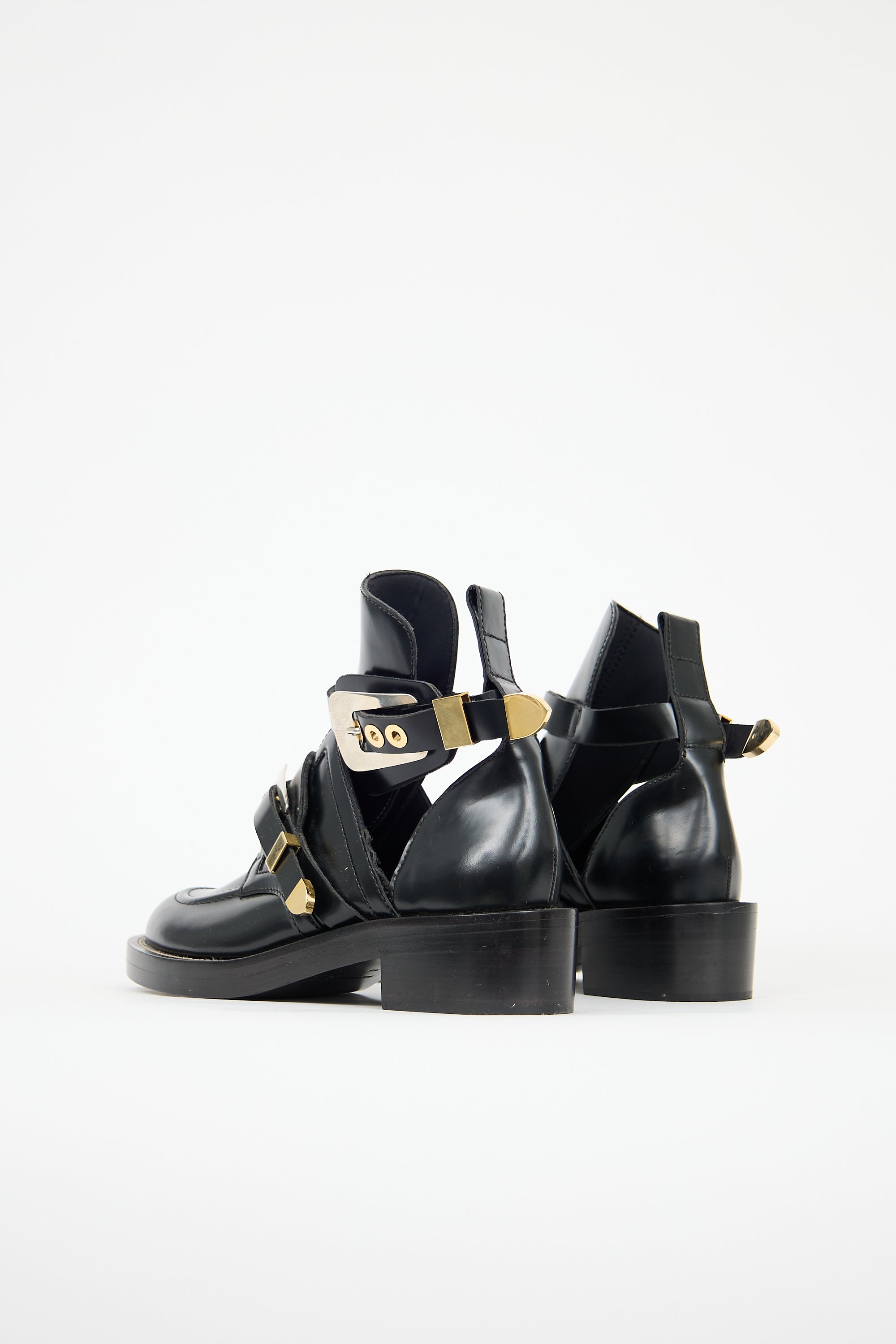 Pre-owned Balenciaga black leather Mollie boots featuring rounded moc toe, cutout vamp, adjustable straps with gold tone hardware, pull tab at counter, and stacked block heel.