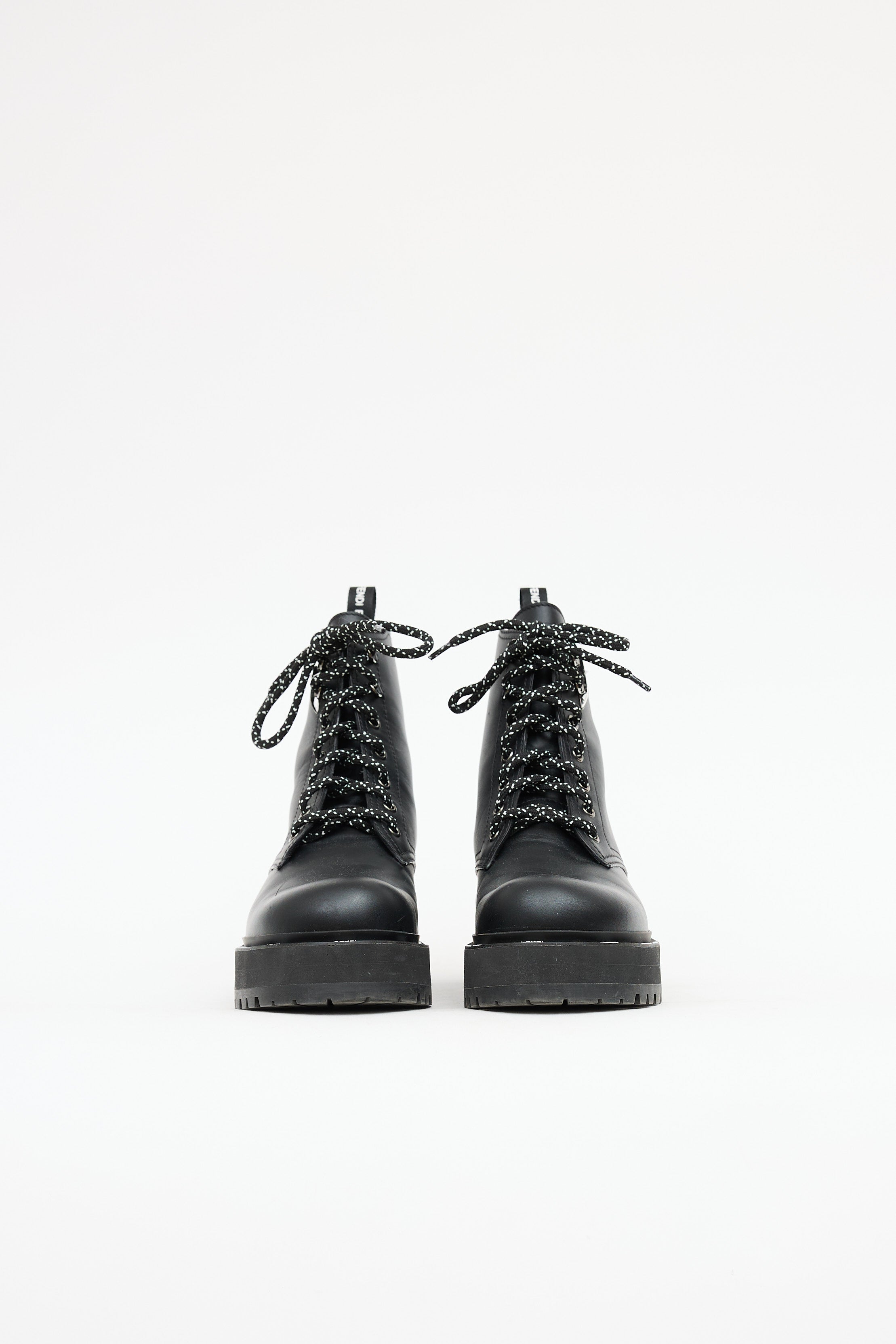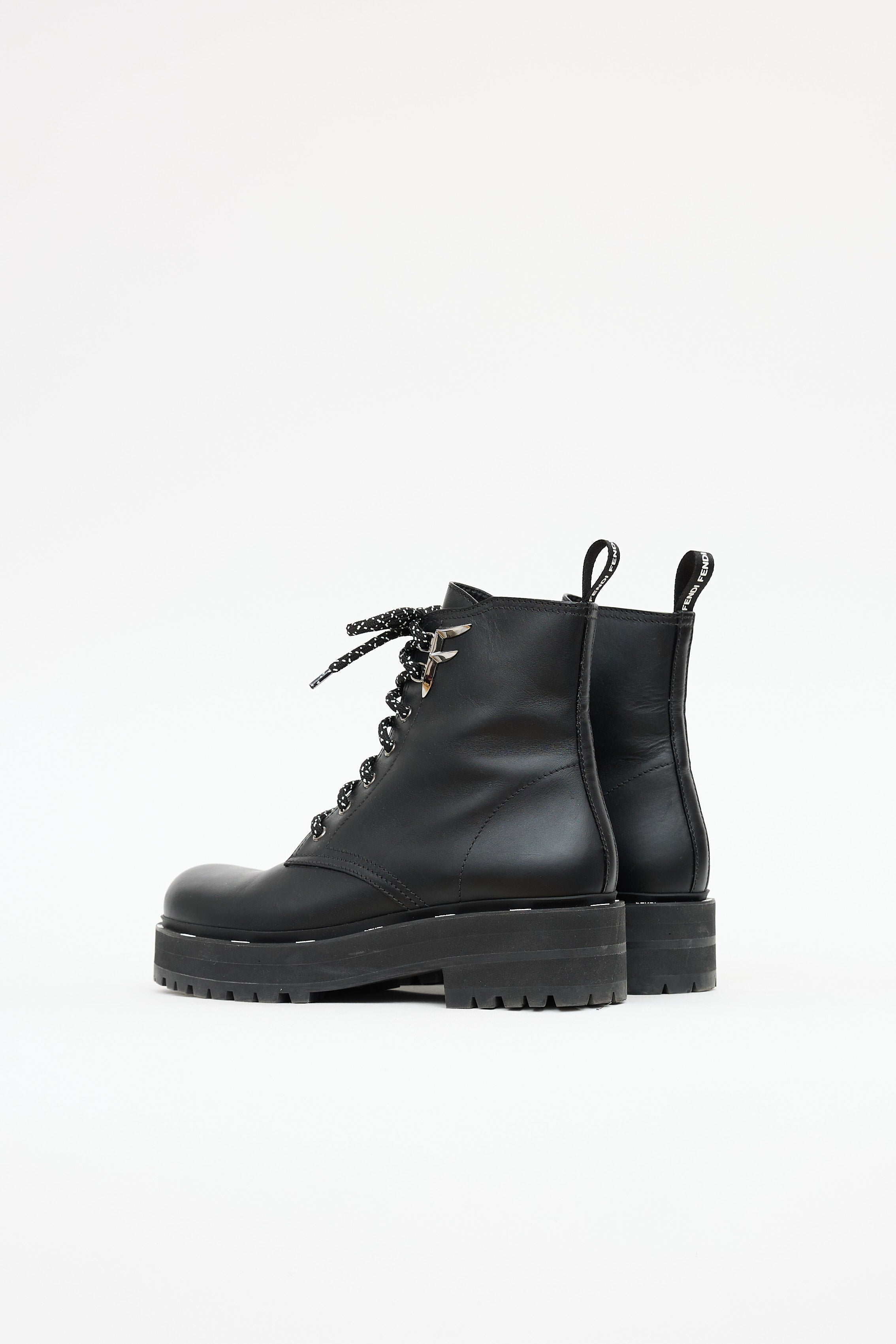 Pre-owned Fendi black leather Freedom combat boot featuring rounded toe, platform midsole with embossed logo, lace-up vamp, and logo printed pull tab at shaft.