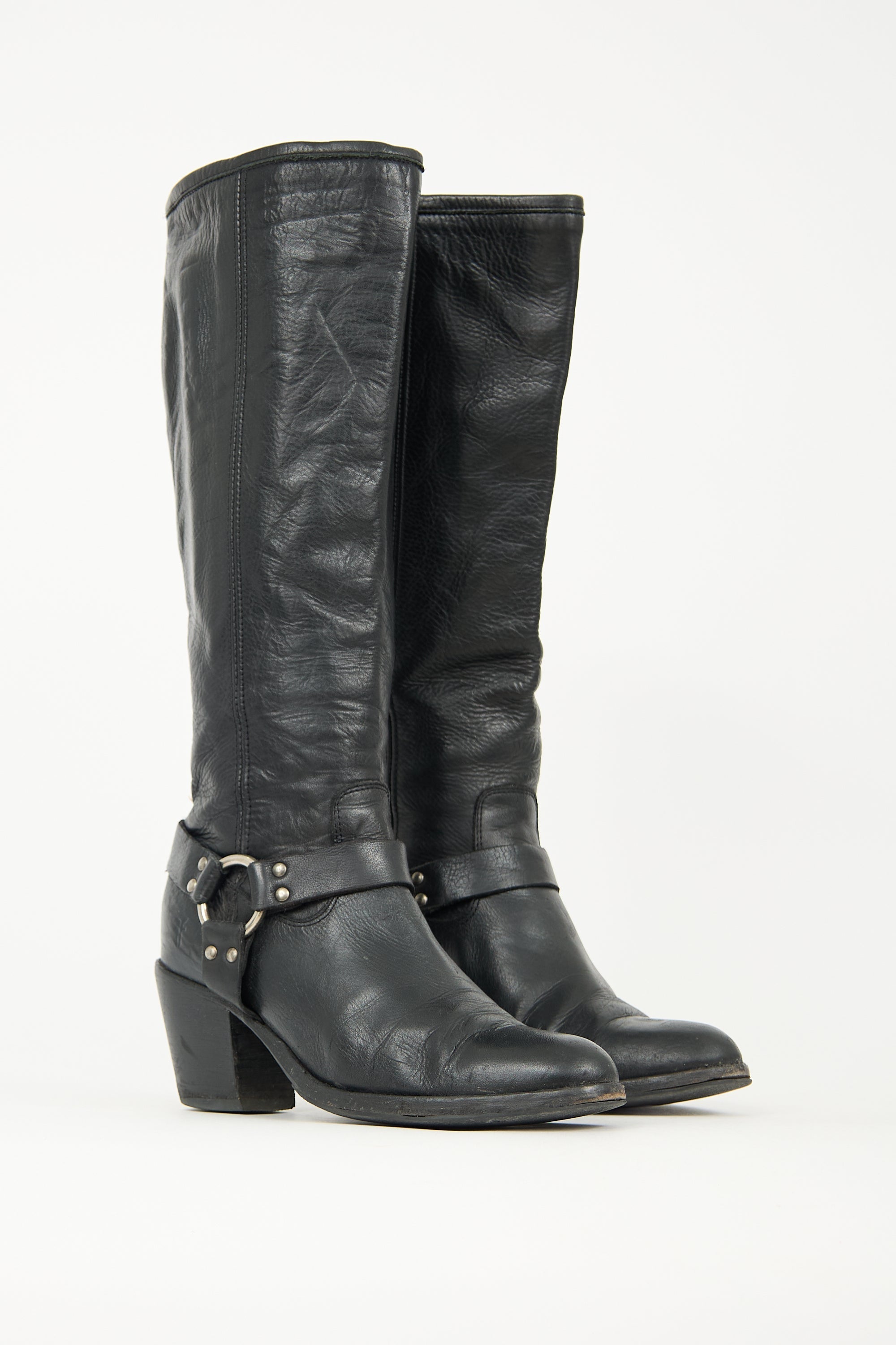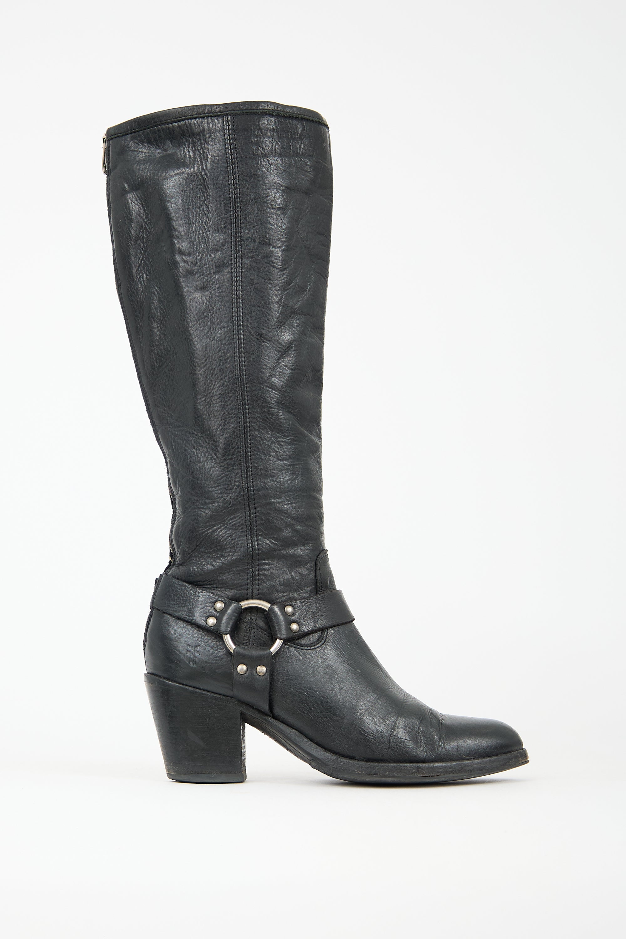 Pre-owned Frye black leather Harness boots featuring an almond toe, harness at ankle, pebbled leather shaft, back zip, and stacked cuban heel.