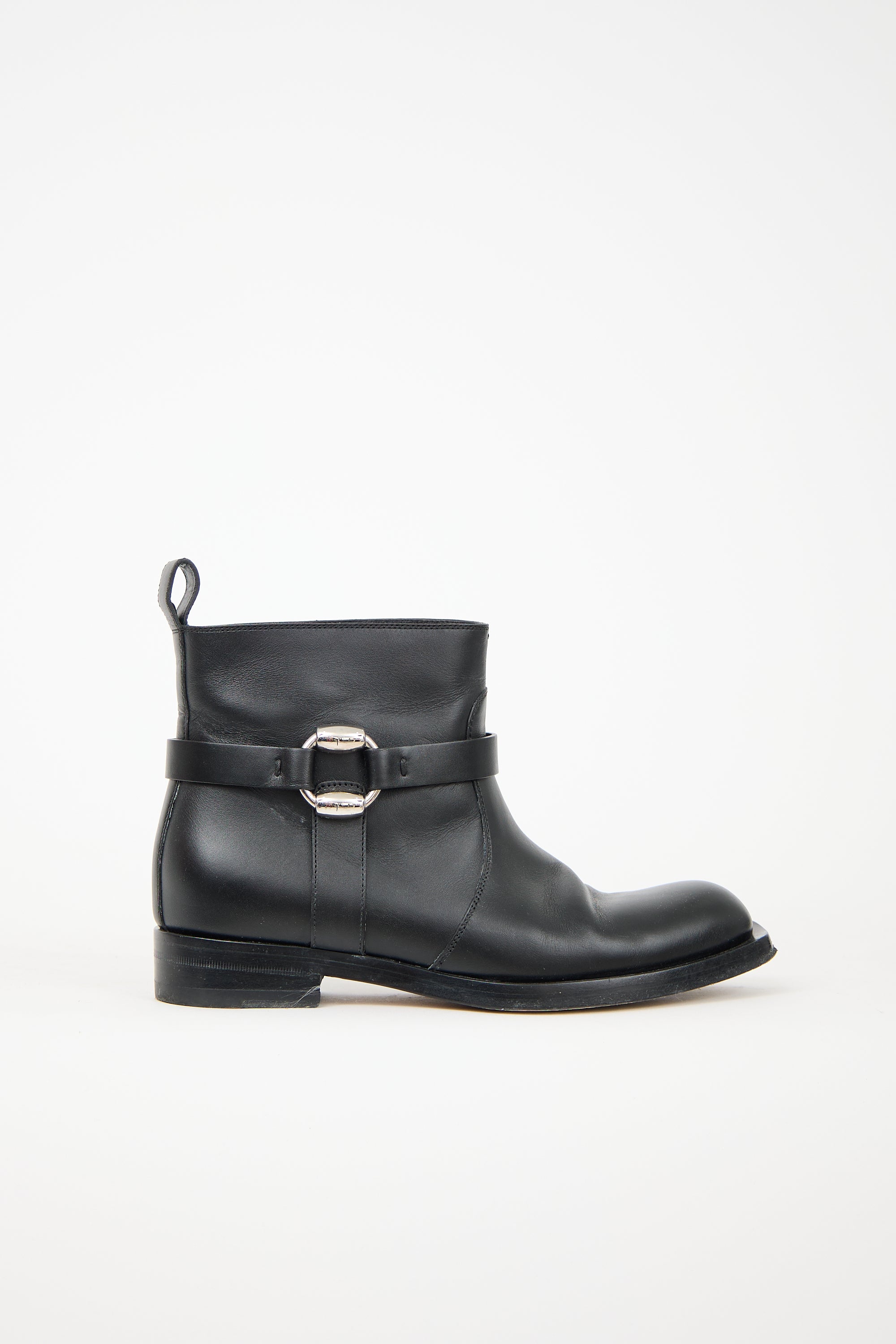 Pre-owned Gucci black leather Cirano Lux ankle boots featuring rounded toe, silver tone buckle, pull tab at shaft, and short block heel.