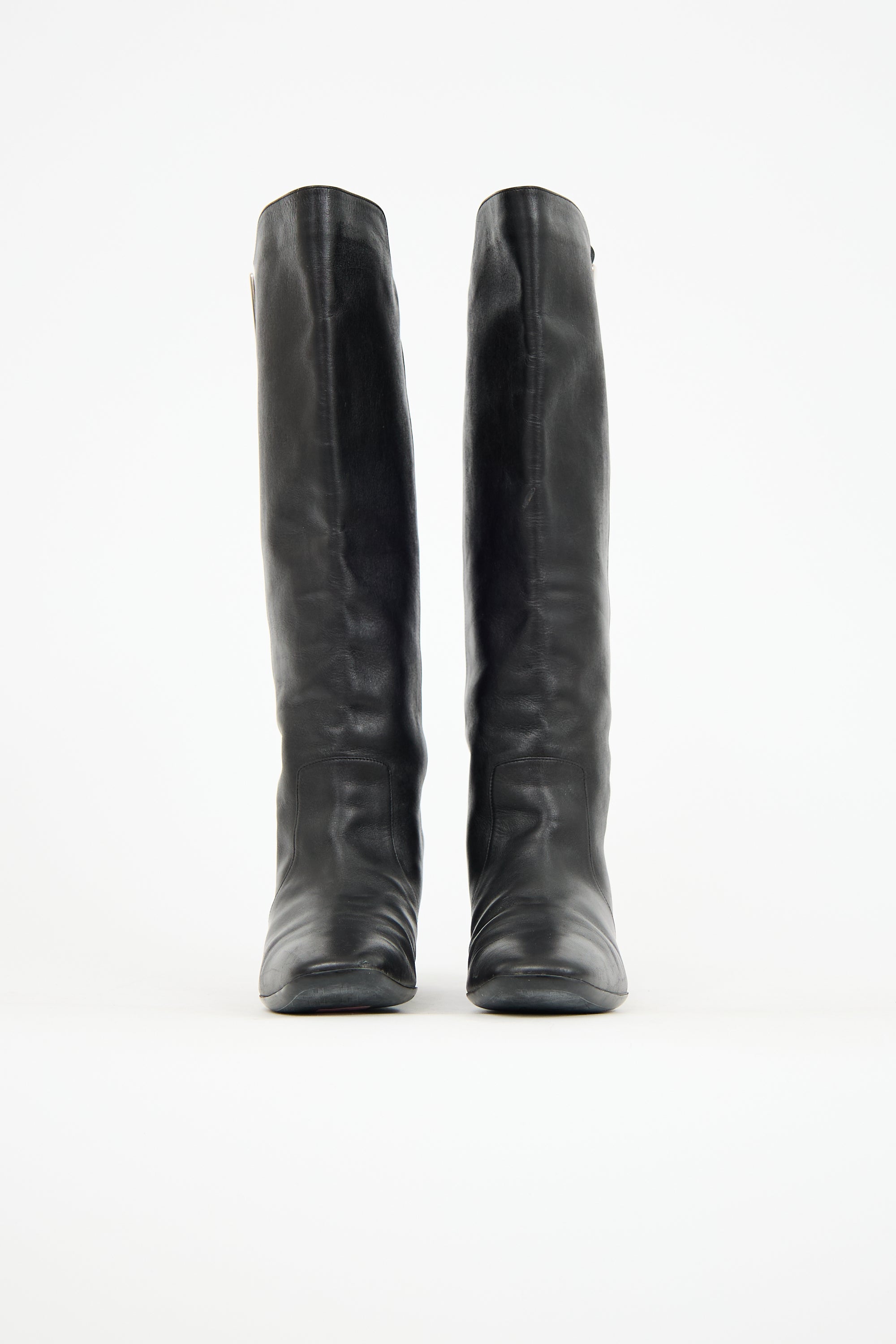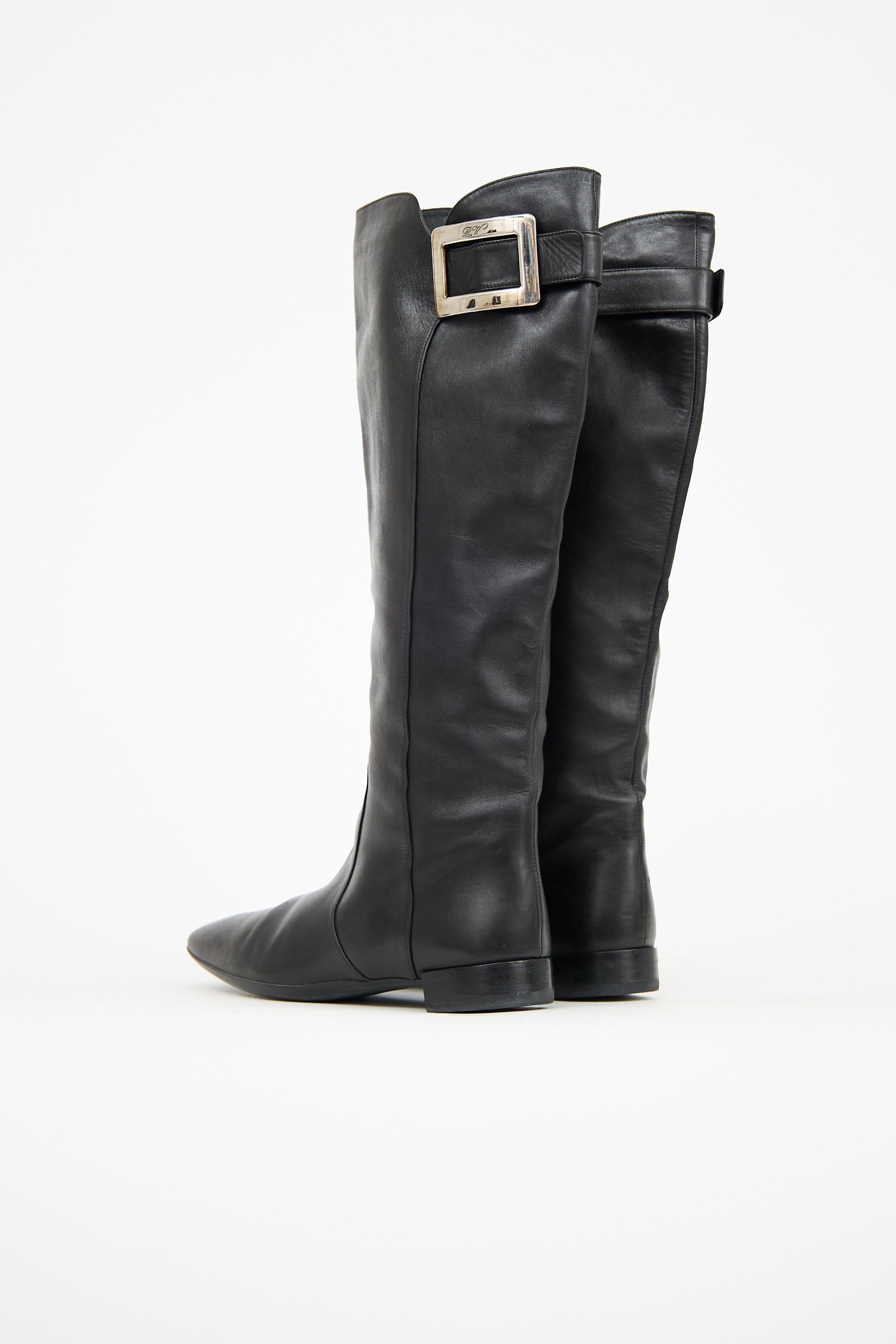 Pre-owned Roger Vivier black leather knee high boots featuring a tapered square toe, notched topline with signature silver tone logo buckle, short stacked heel, and rubber outsole.