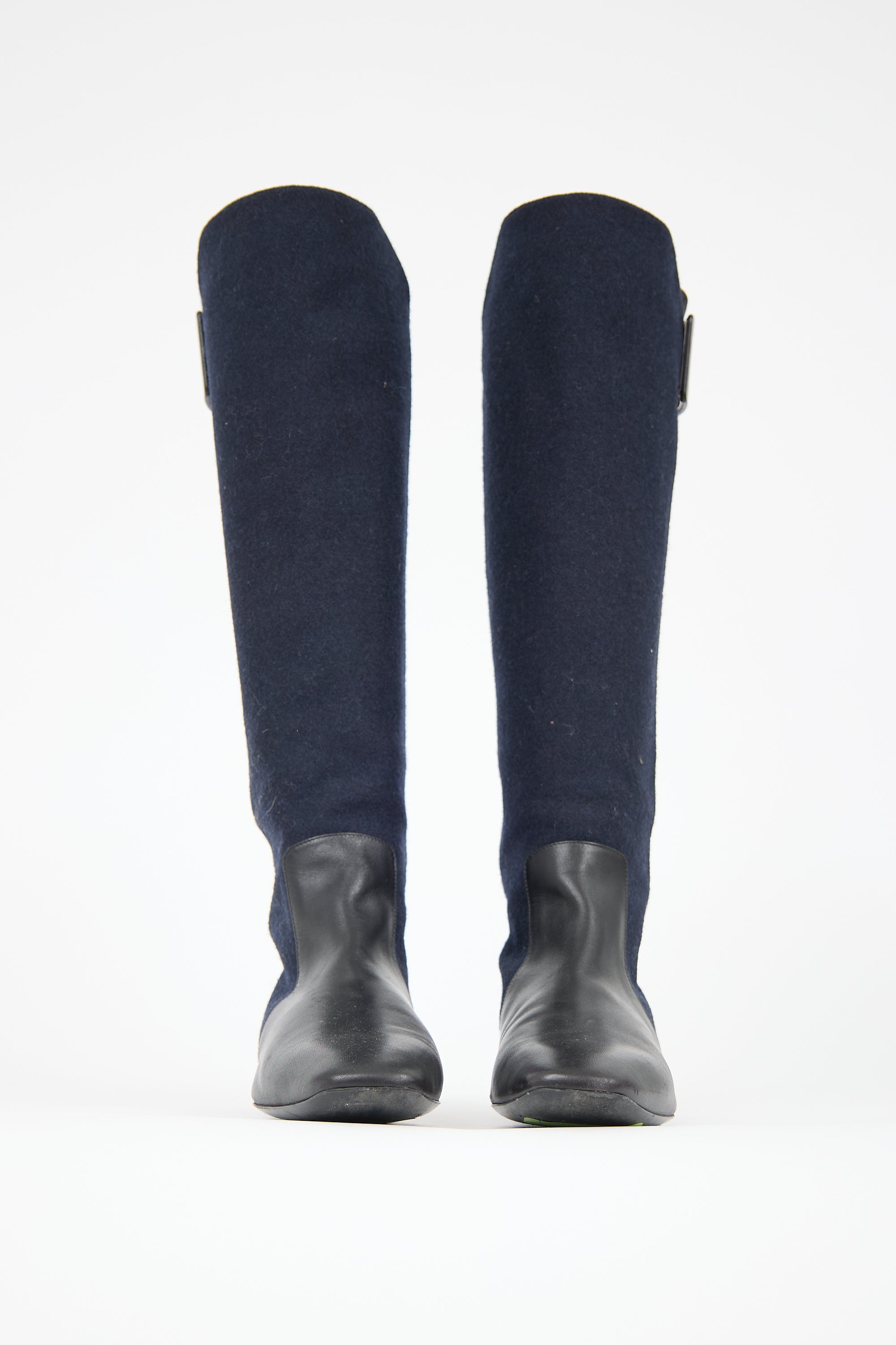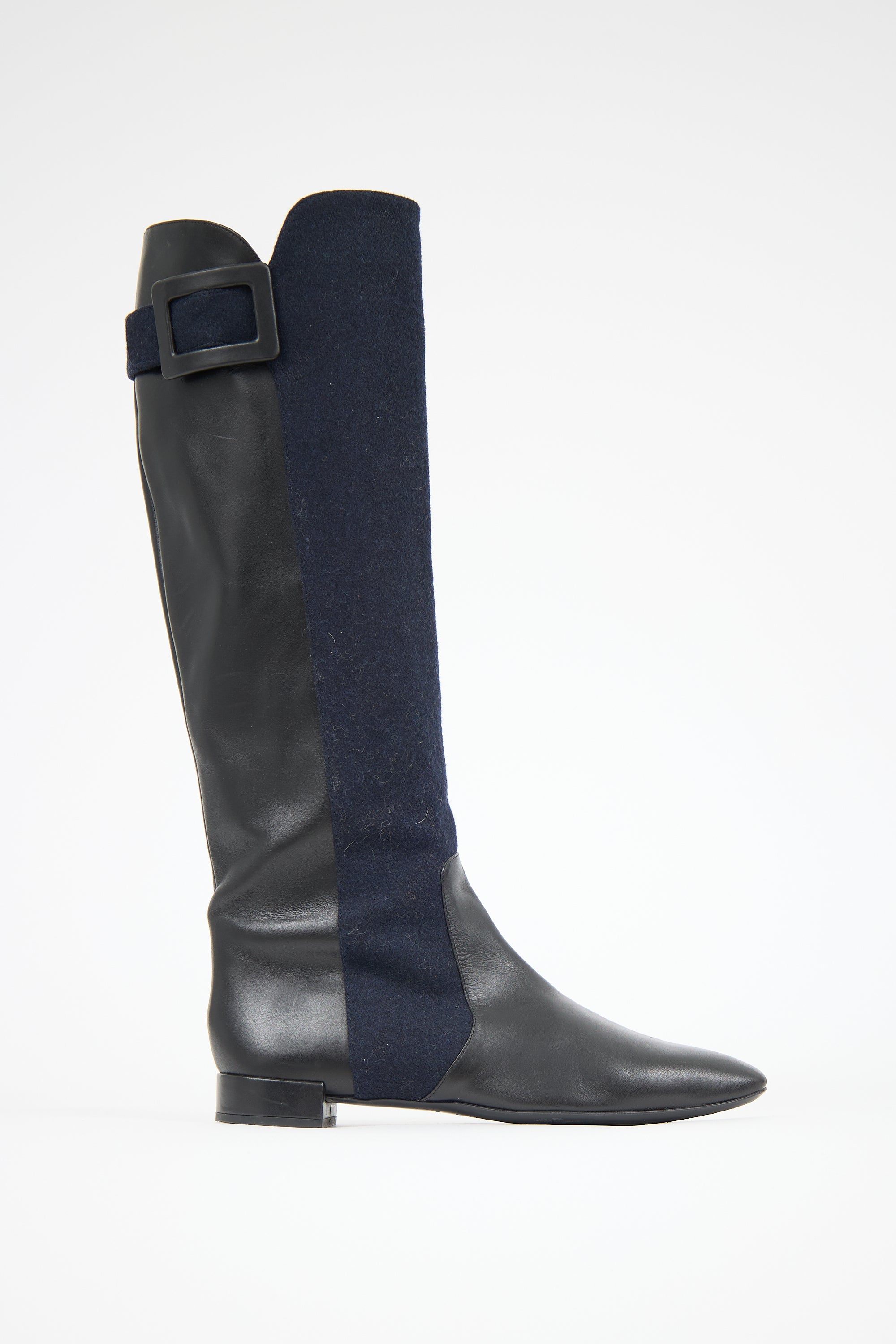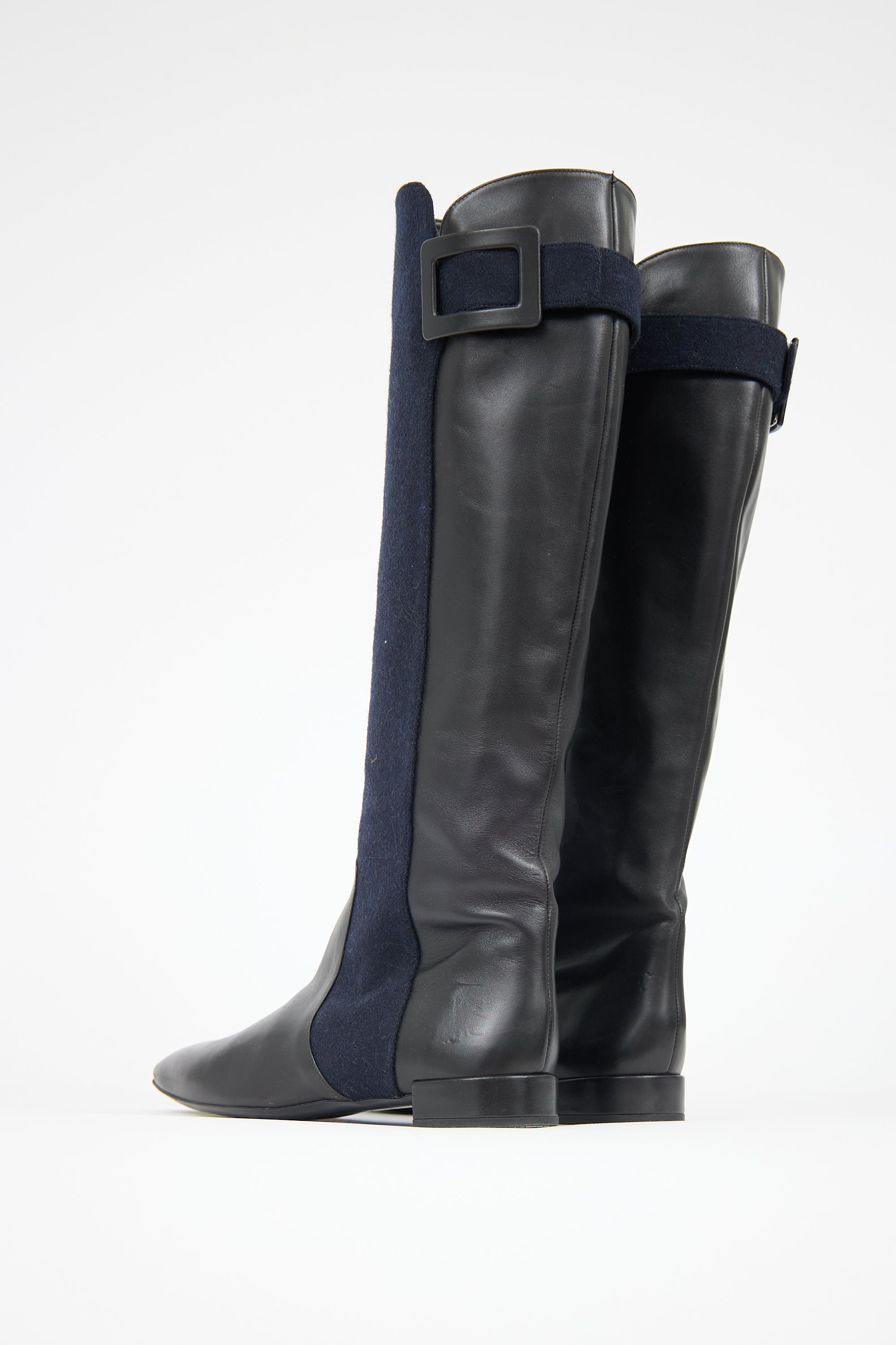 Pre-owned Roger Vivier black leather and wool boots featuring square toe, buckle strap at shaft, short block heel, and pull on entry.