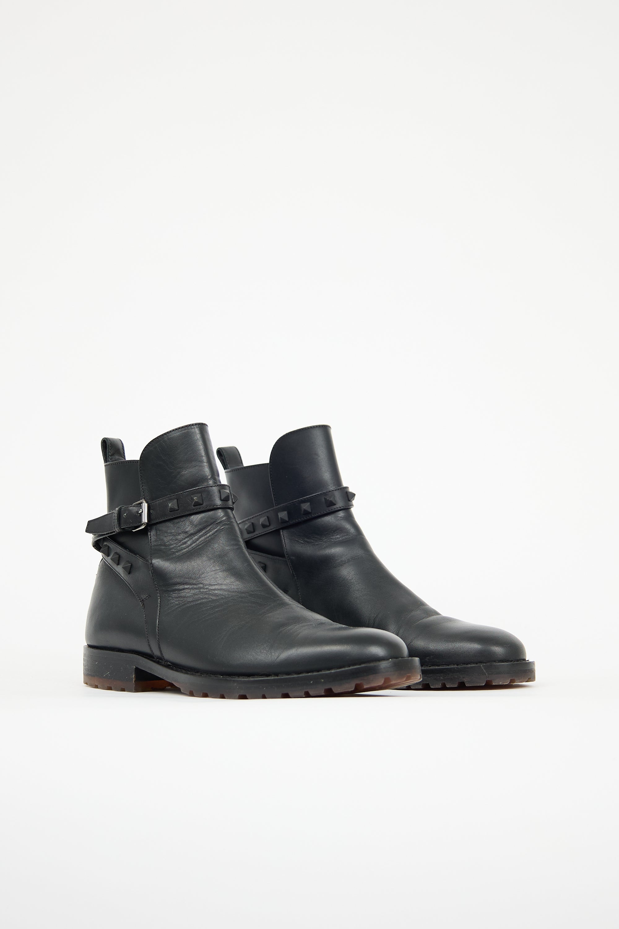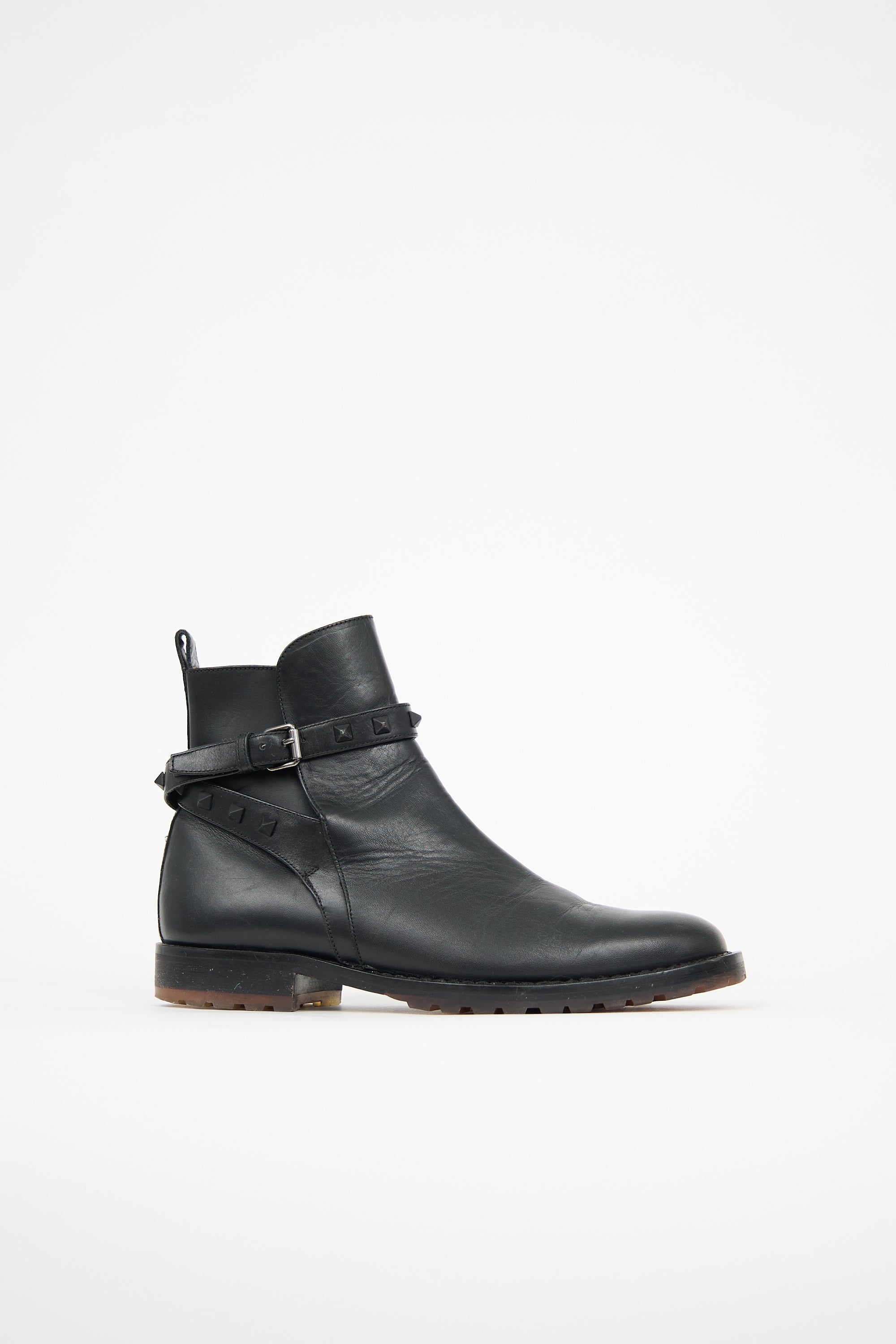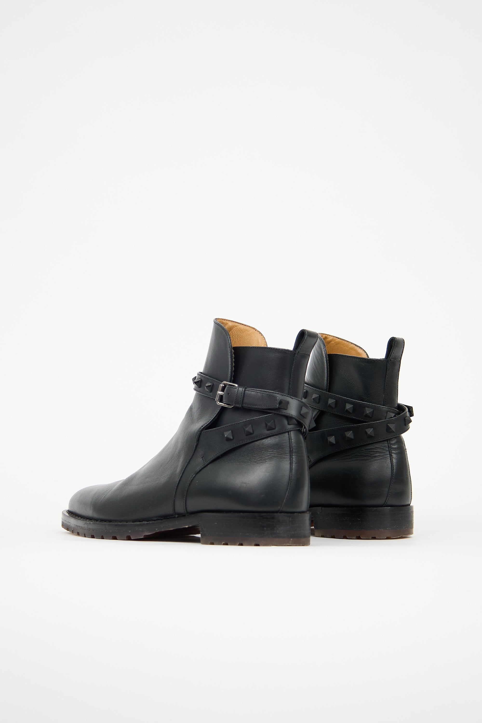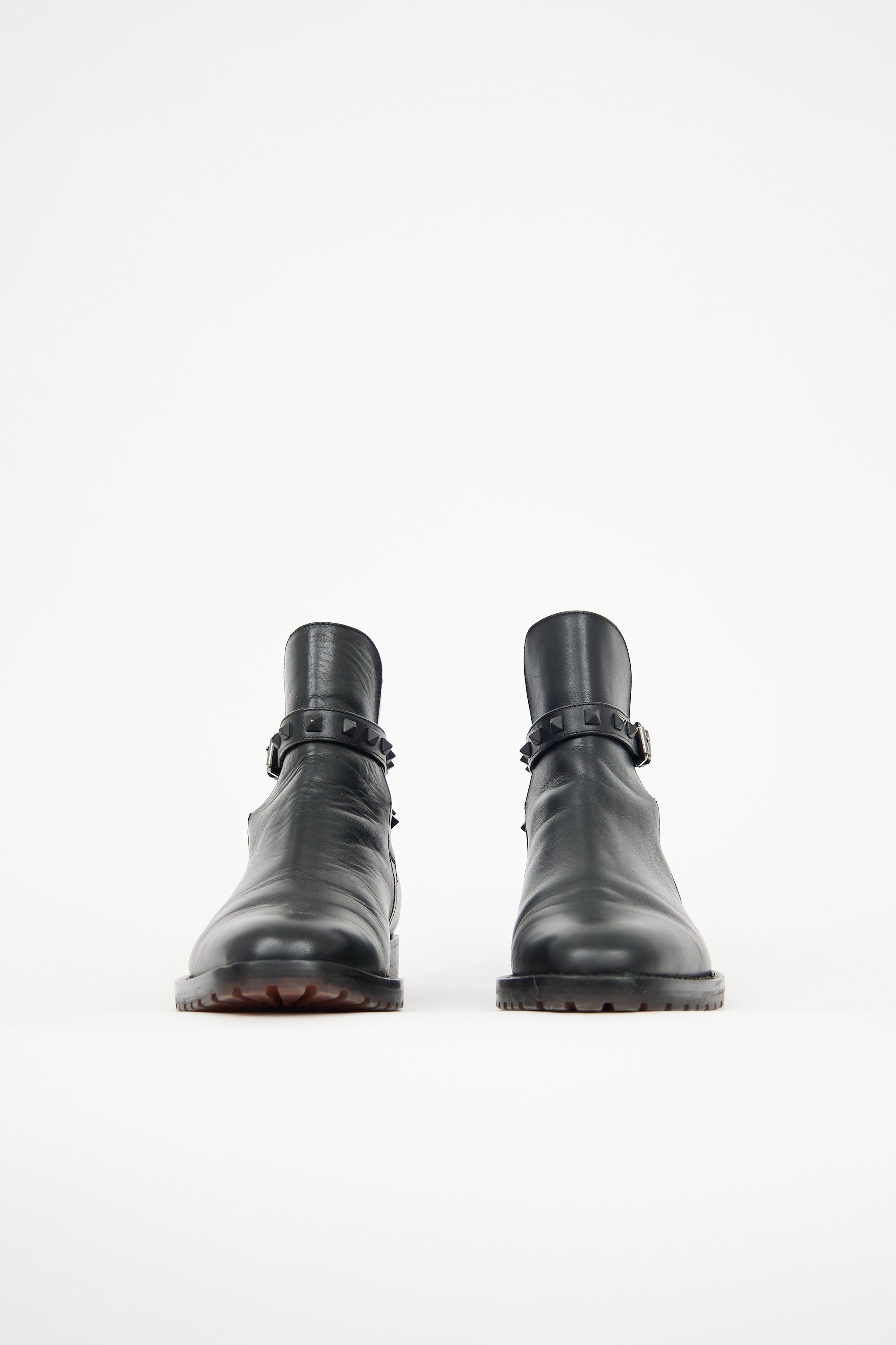 Pre-owned Valentino black leather Beatle Jodhpur boots featuring a rounded toe, adjustable ankle strap with tonal Rockstud embellishments, and treaded rubber sole.