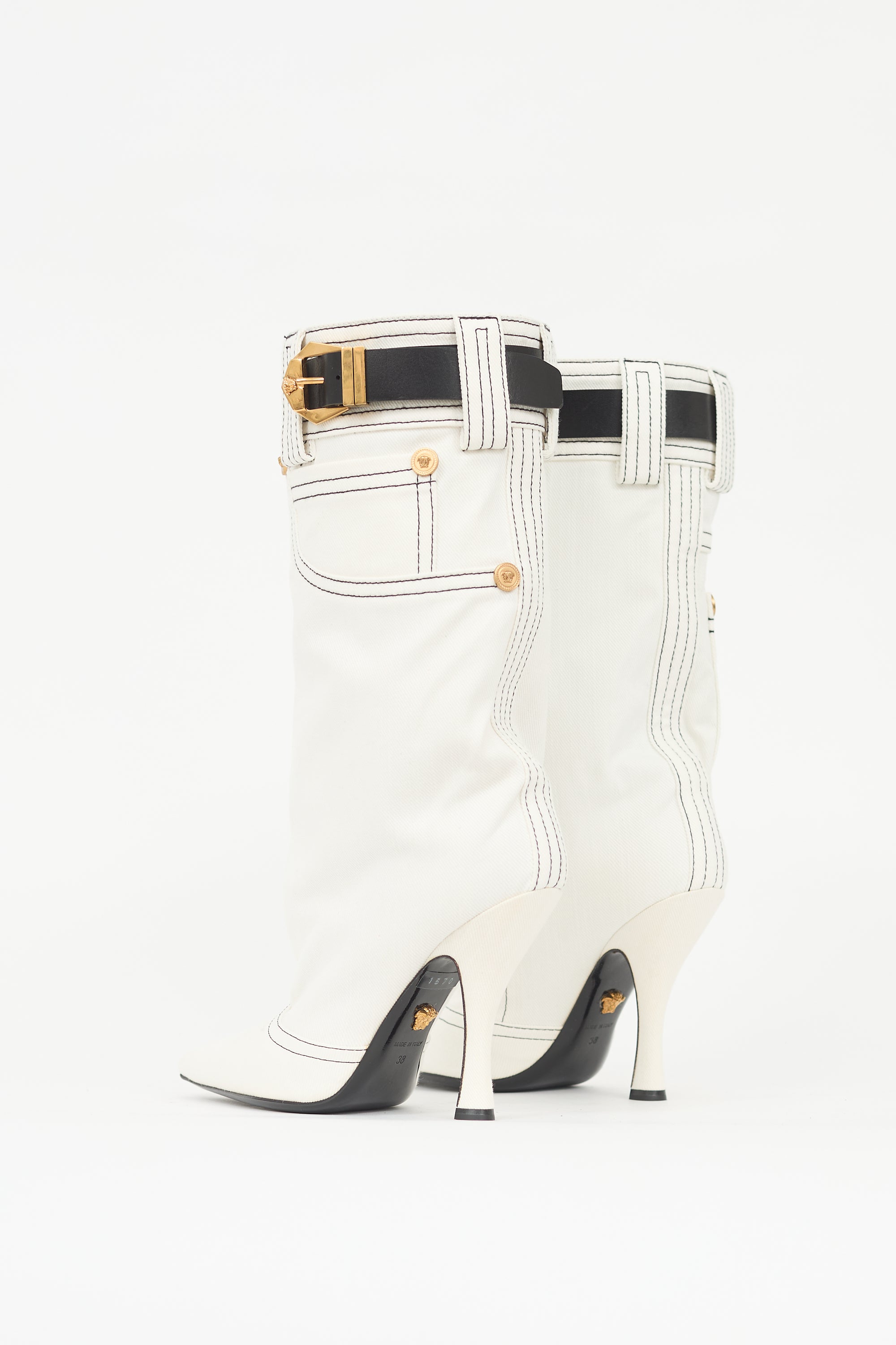Pre-owned Versace white denim boots featuring pointed toe, contrast stitch, belt loops at top with decorative belt, gold tone medusa logo at right pair, and stiletto heel. Includes original dust bag.