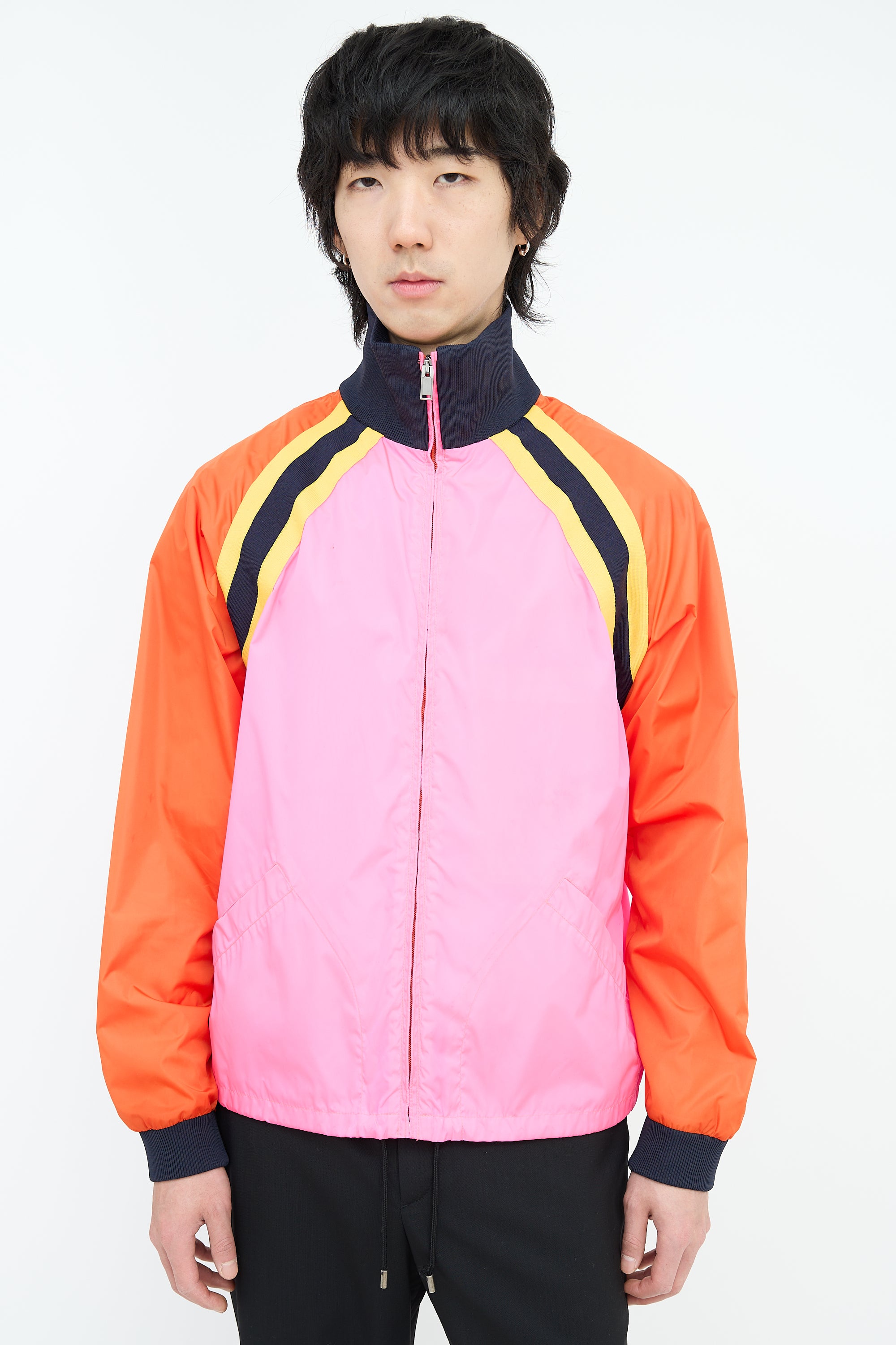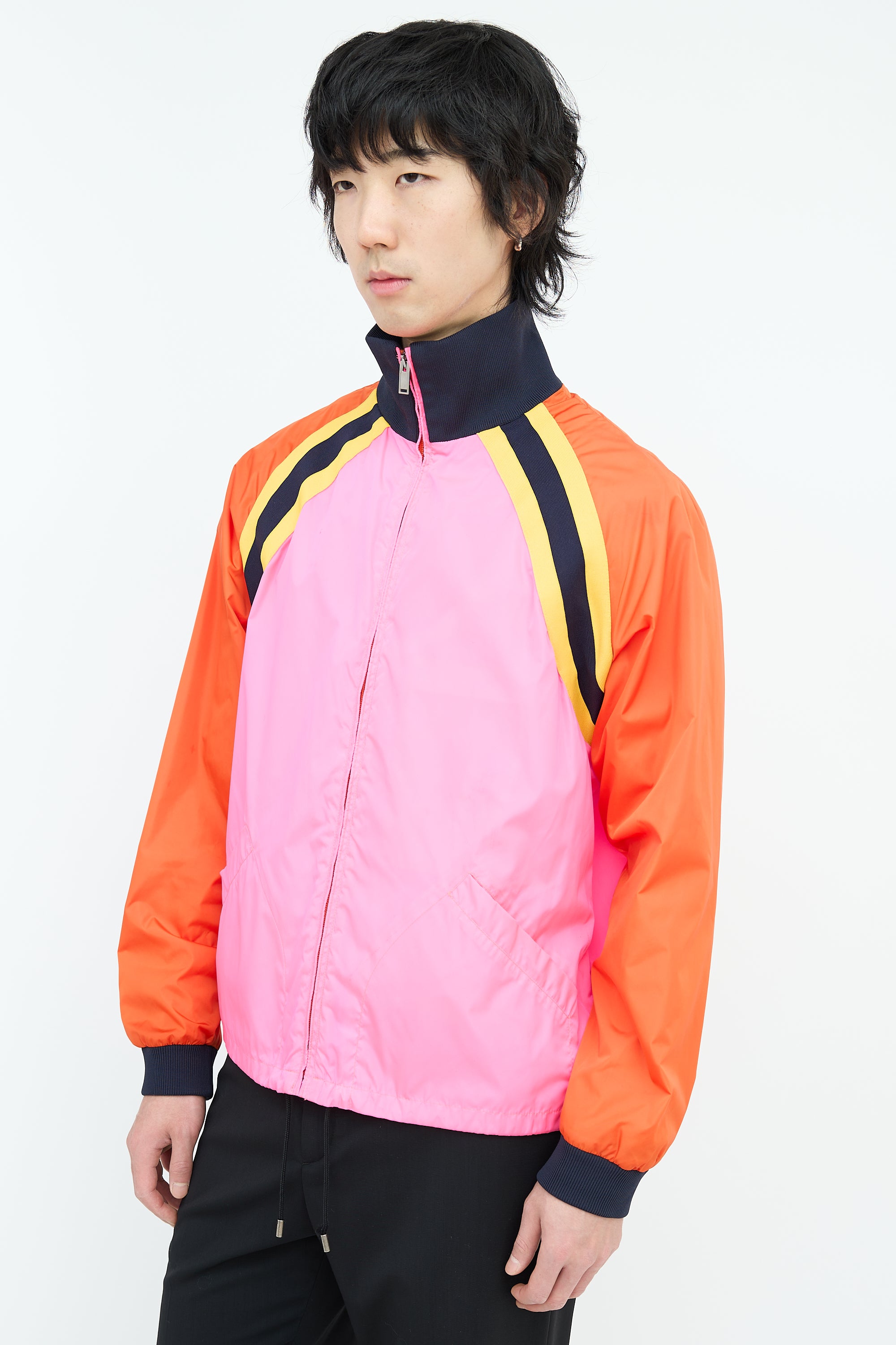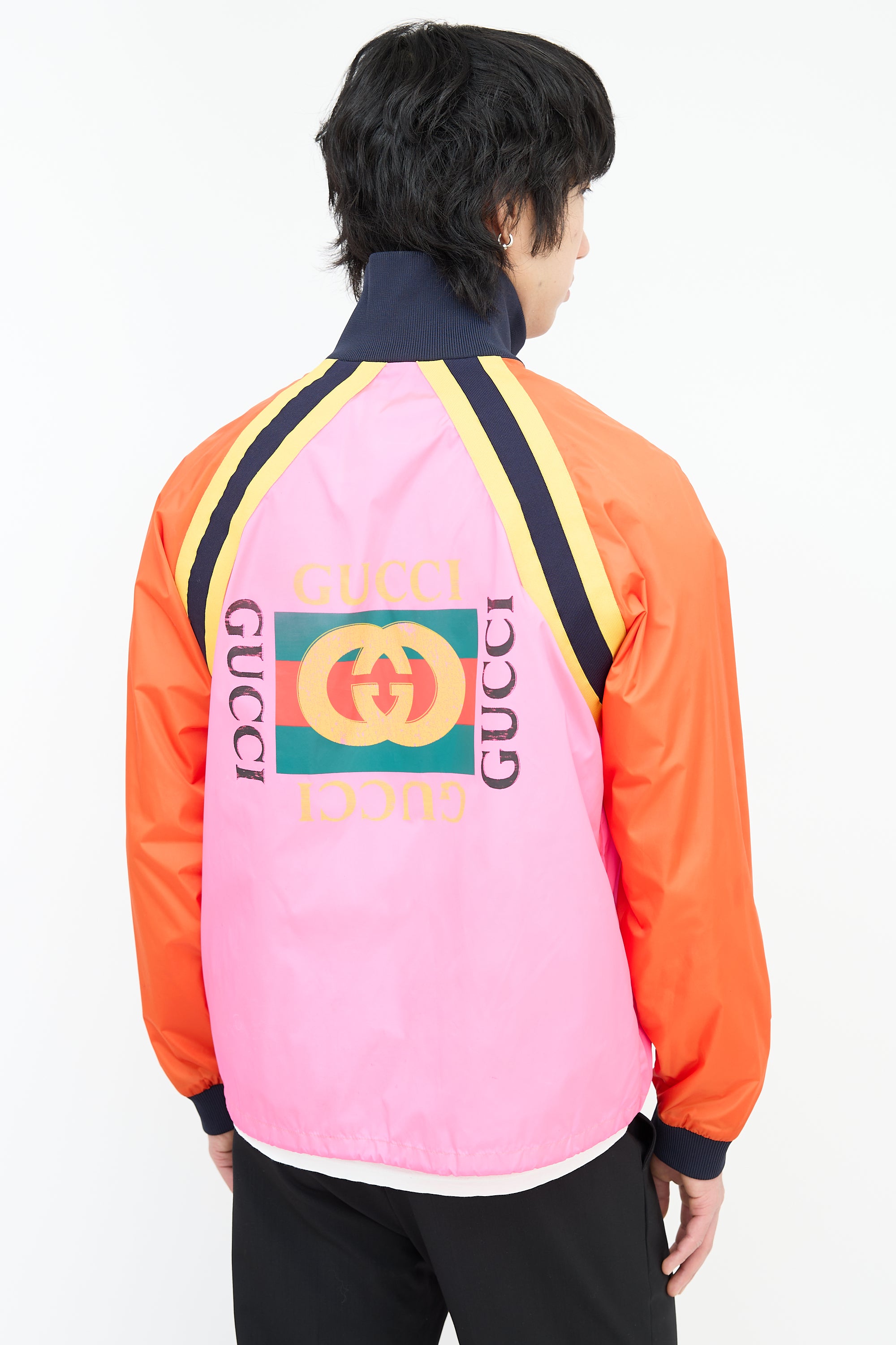 Pre-owned Gucci pink and multicolour nylon windbreaker featuring a ribbed stand collar, zip up front, two welt pockets at waist, drawstring cinch hem, interlocking GG logo printed at back, yellow and navy webbed trim, ribbed cuffs, and a zip pocket at interior.