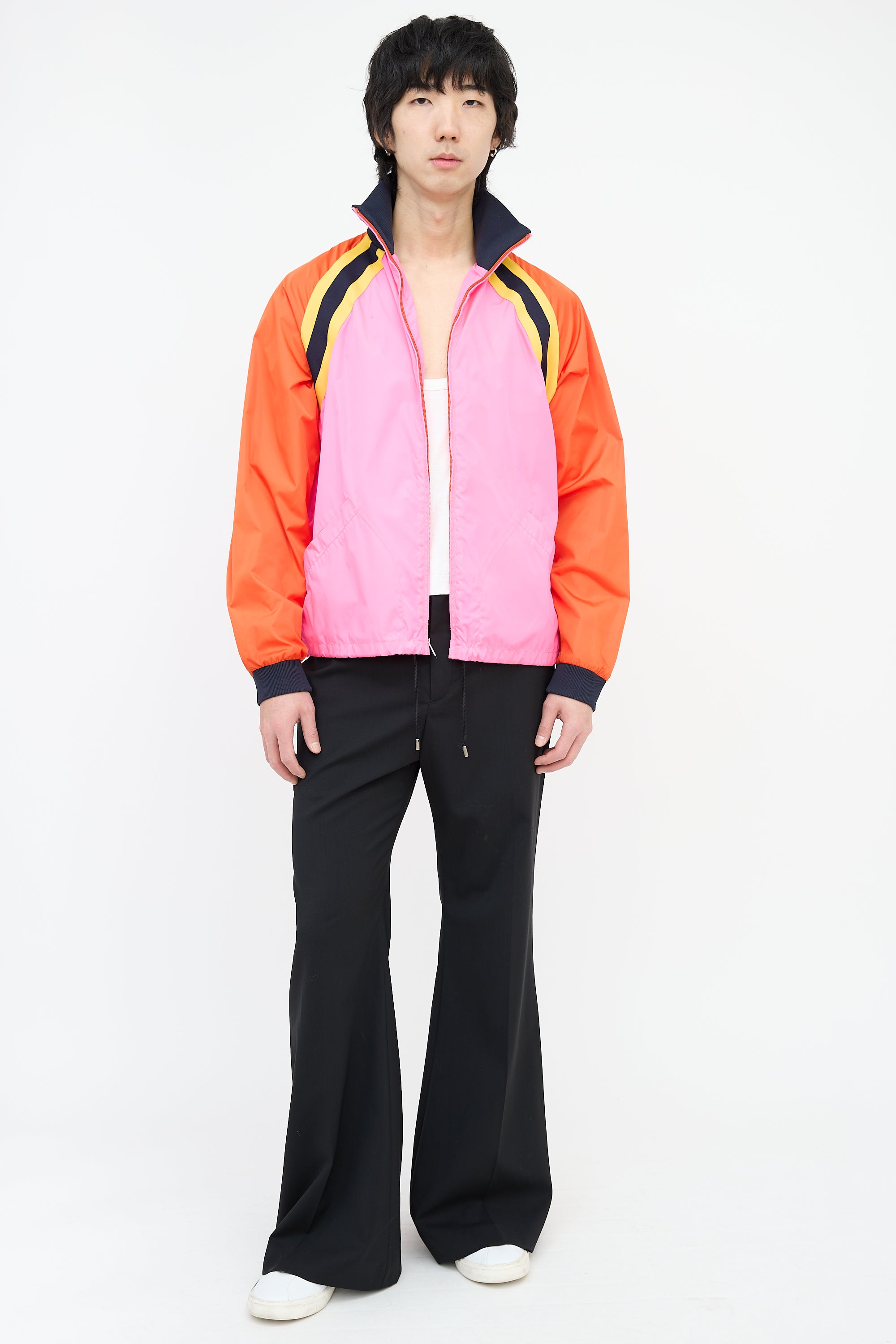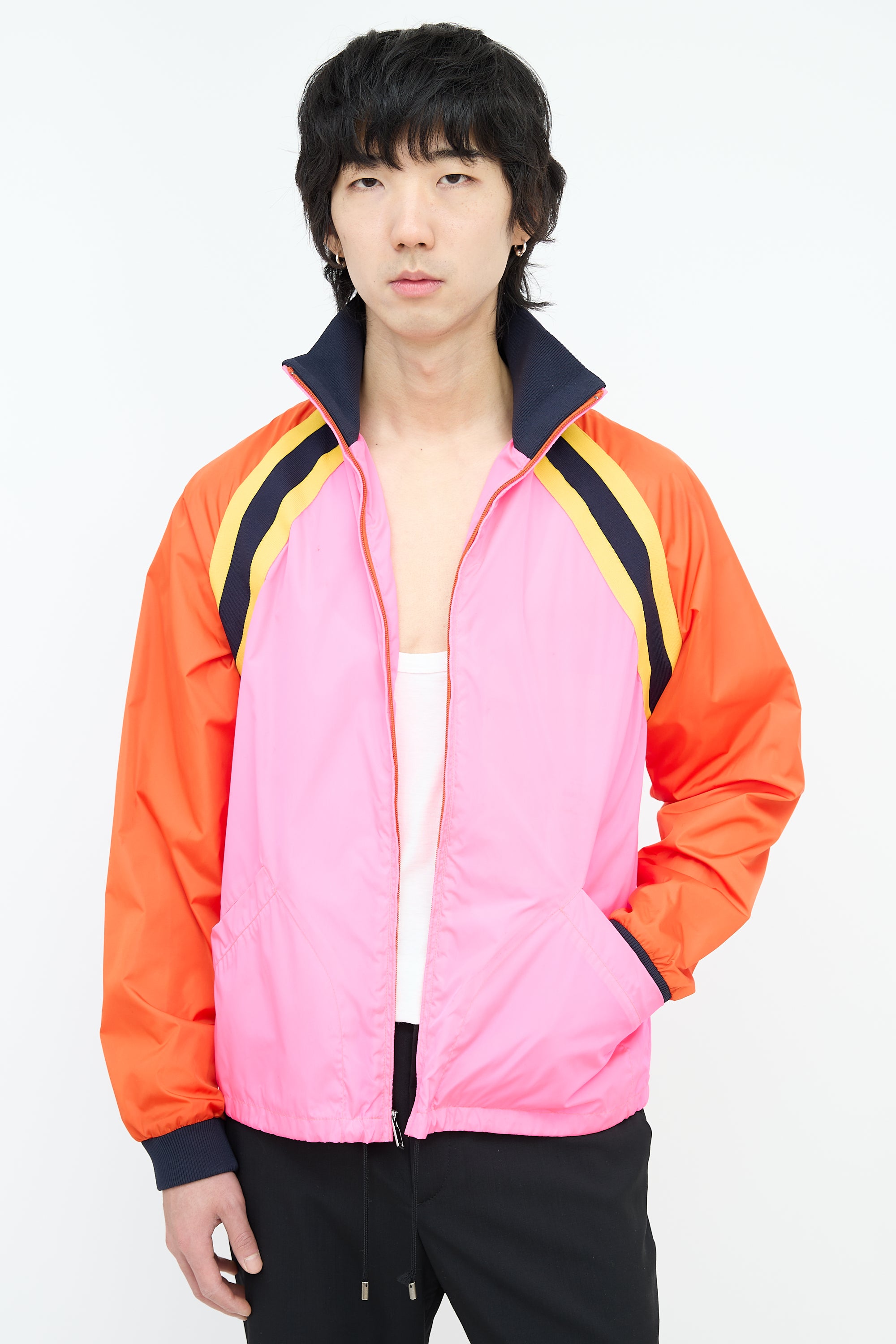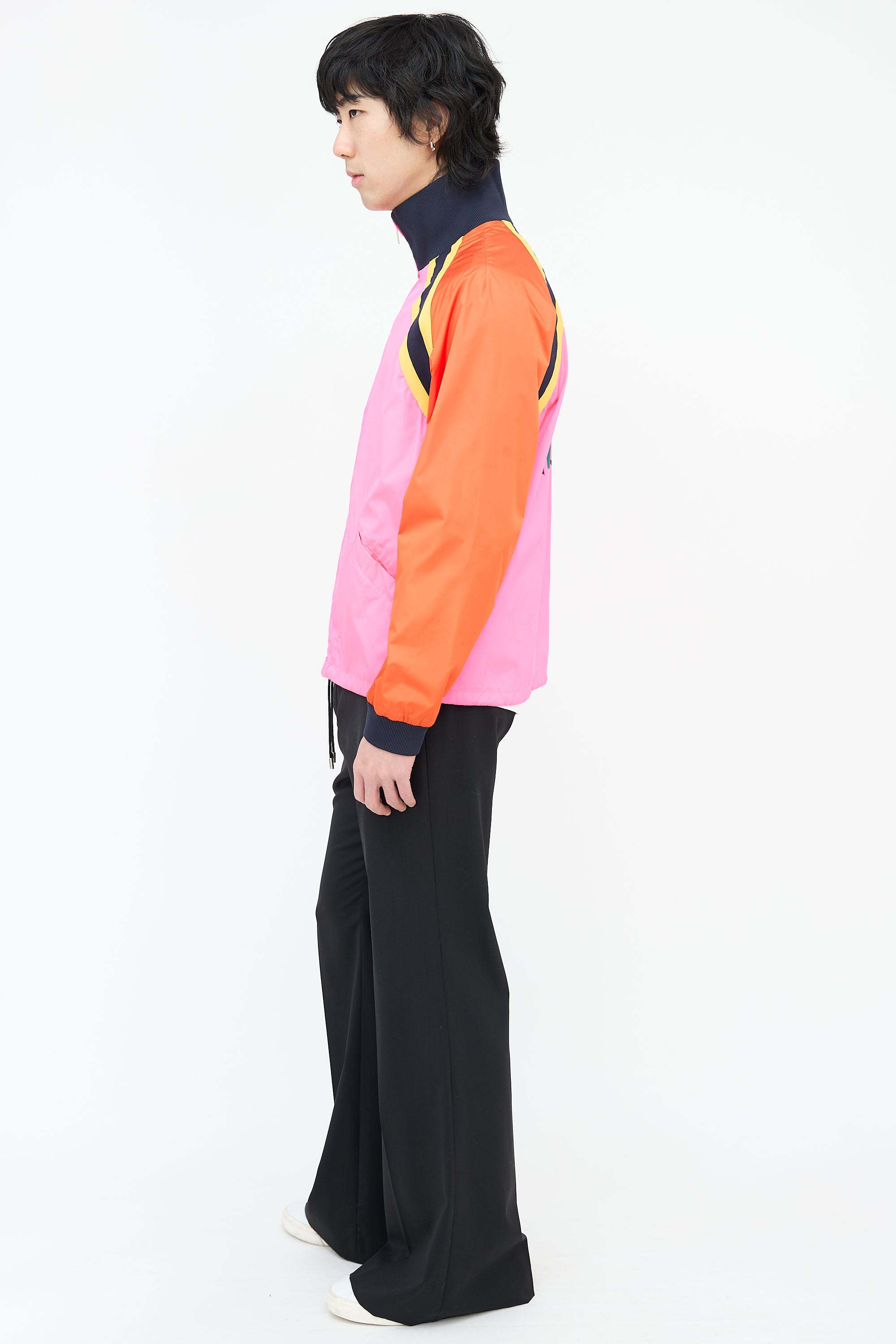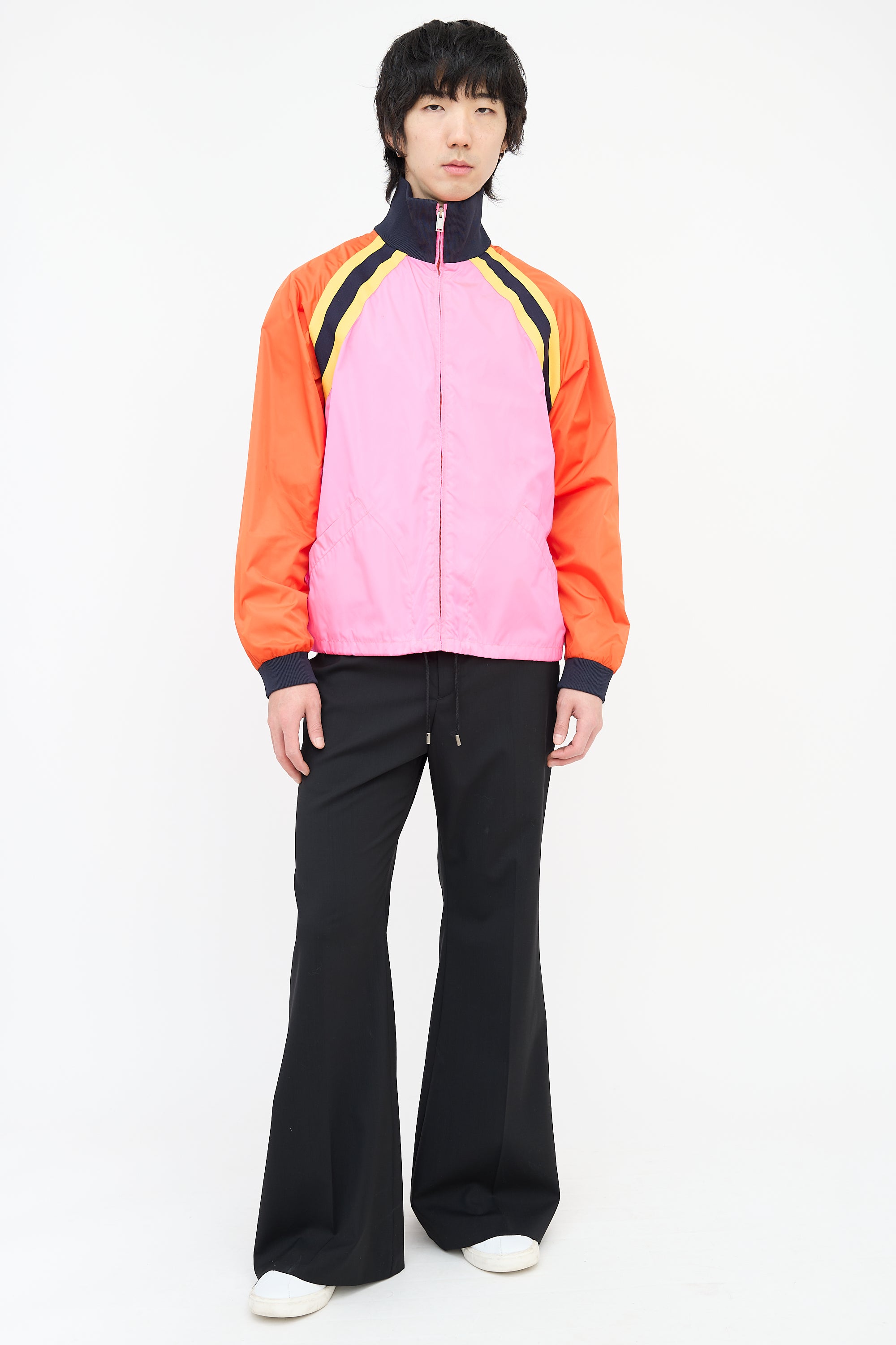 Pre-owned Gucci pink and multicolour nylon windbreaker featuring a ribbed stand collar, zip up front, two welt pockets at waist, drawstring cinch hem, interlocking GG logo printed at back, yellow and navy webbed trim, ribbed cuffs, and a zip pocket at interior.
