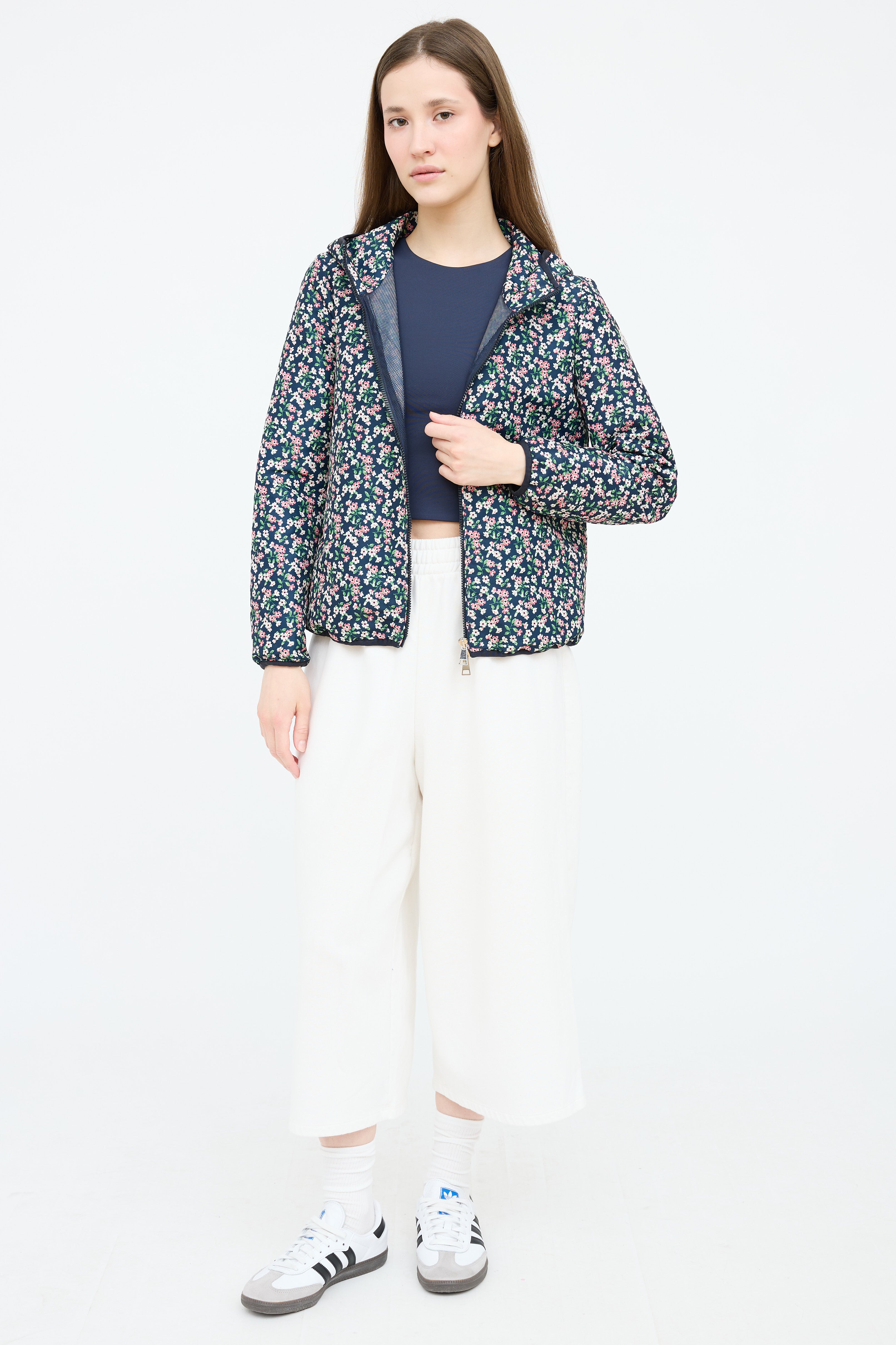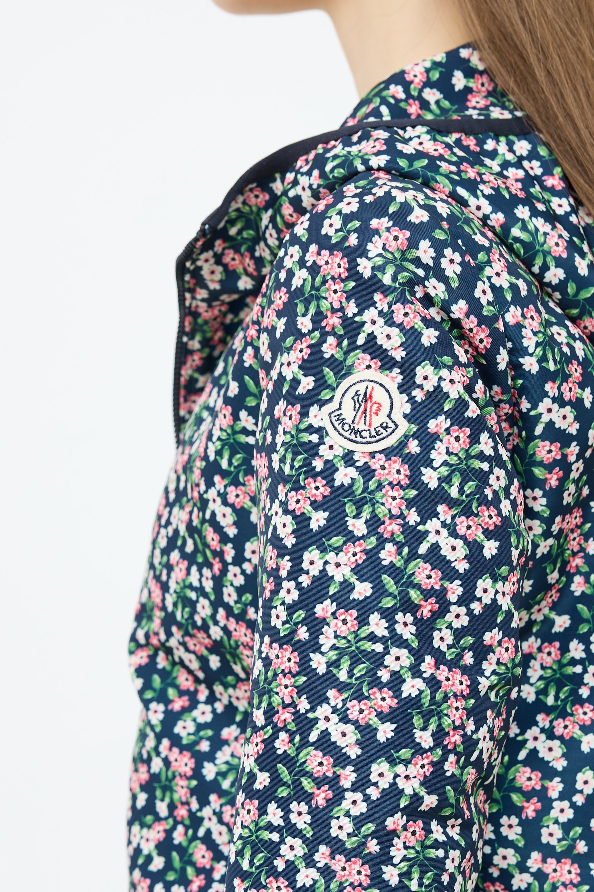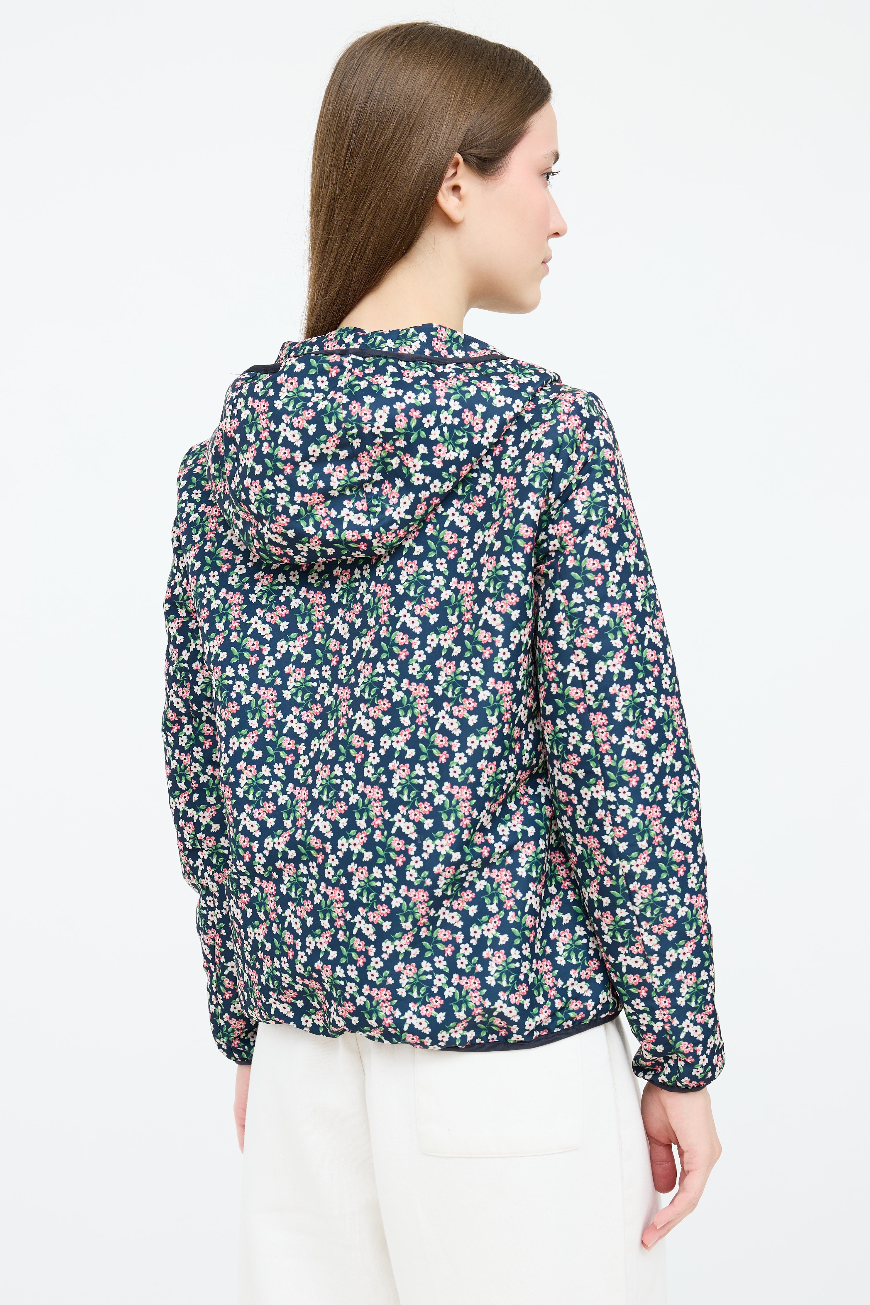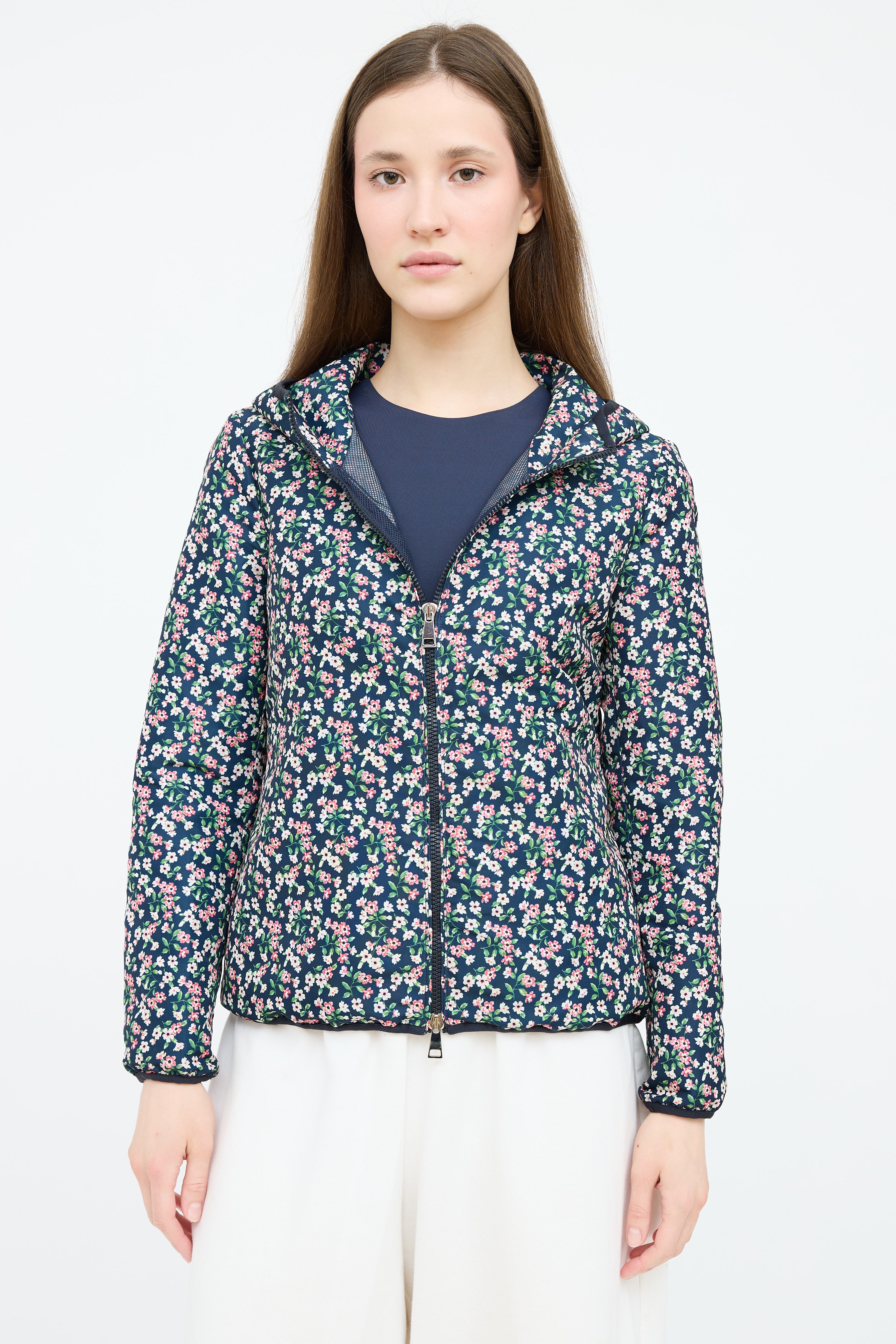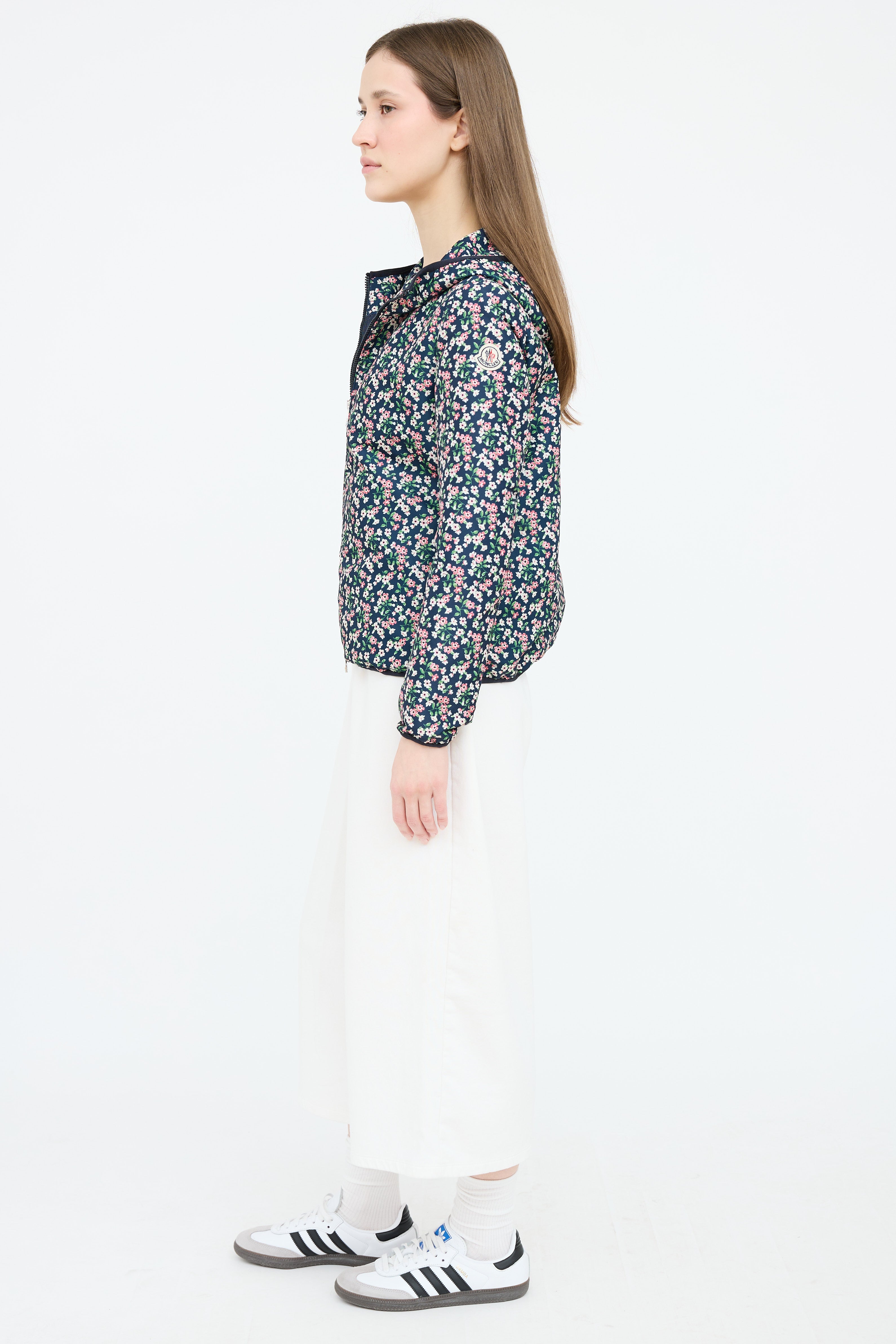 Pre-owned Moncler navy Vive windbreaker featuring a multicolour floral pattern throughout, hood with ribbed trim, long sleeves, logo patch at shoulder, two zip pockets at hip, ribbed hem, and zip closure. Lined.