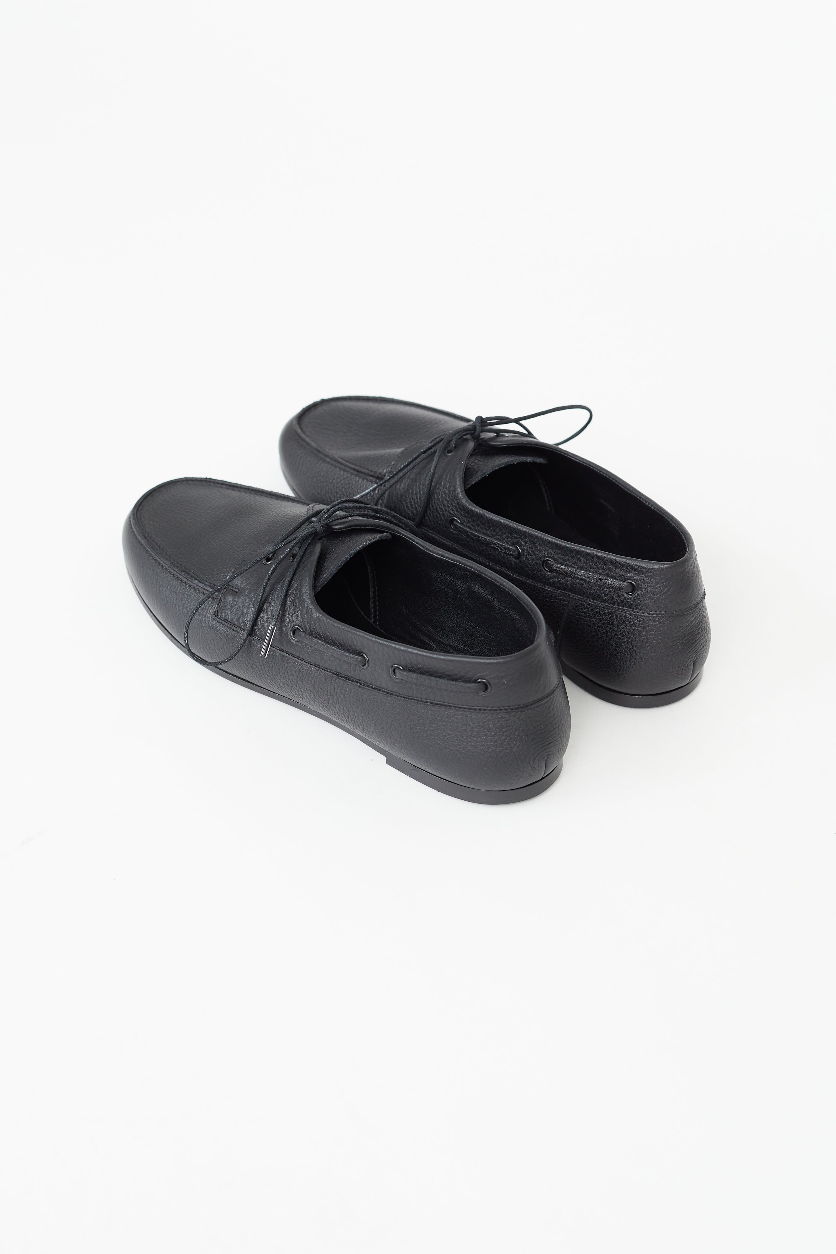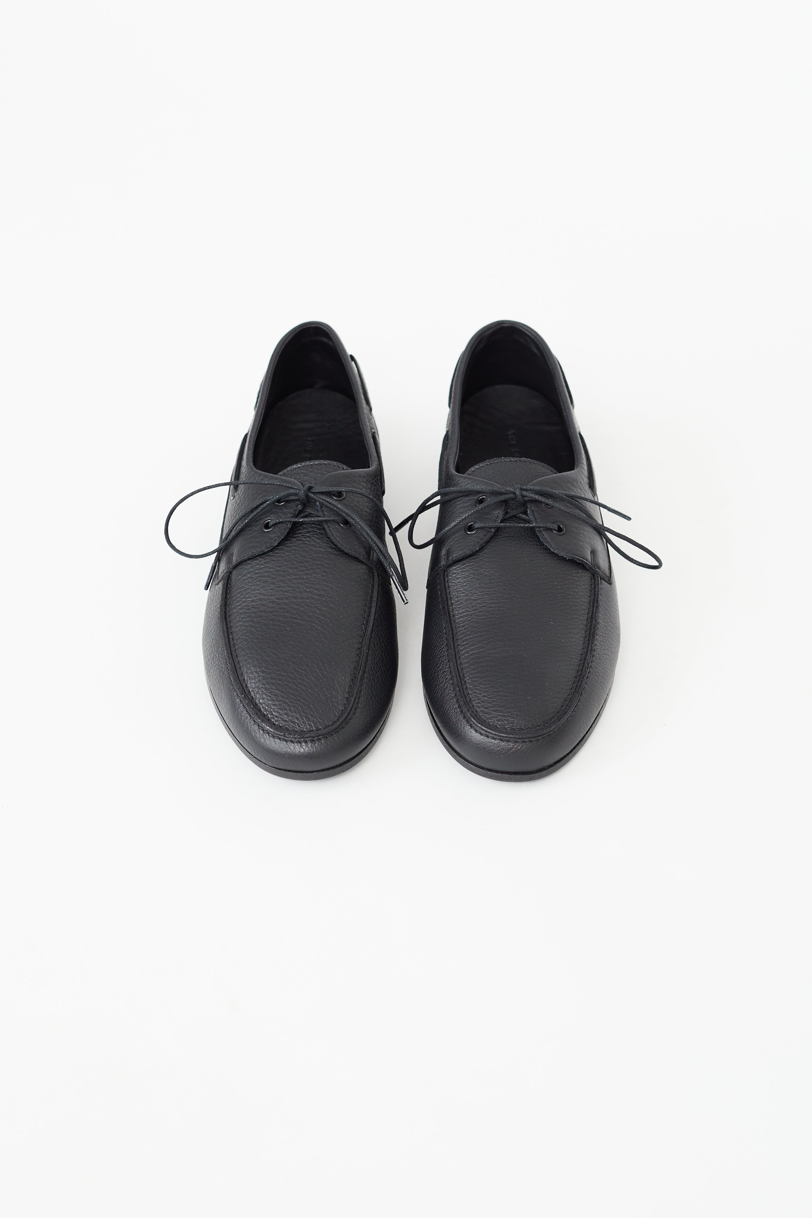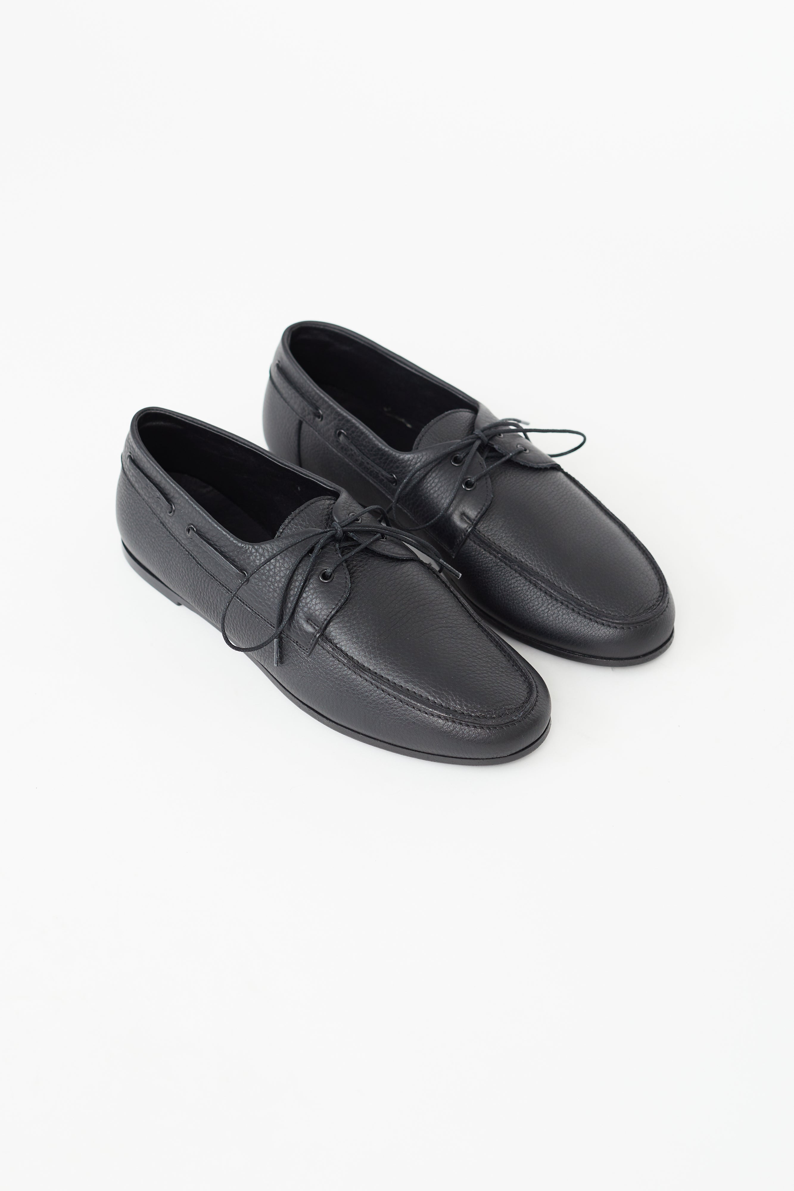 Pre-owned The Row black Sailor loafers featuring almond toe, lace up closure, and tonal stitching throughout. Comes with original dust bag and box.
