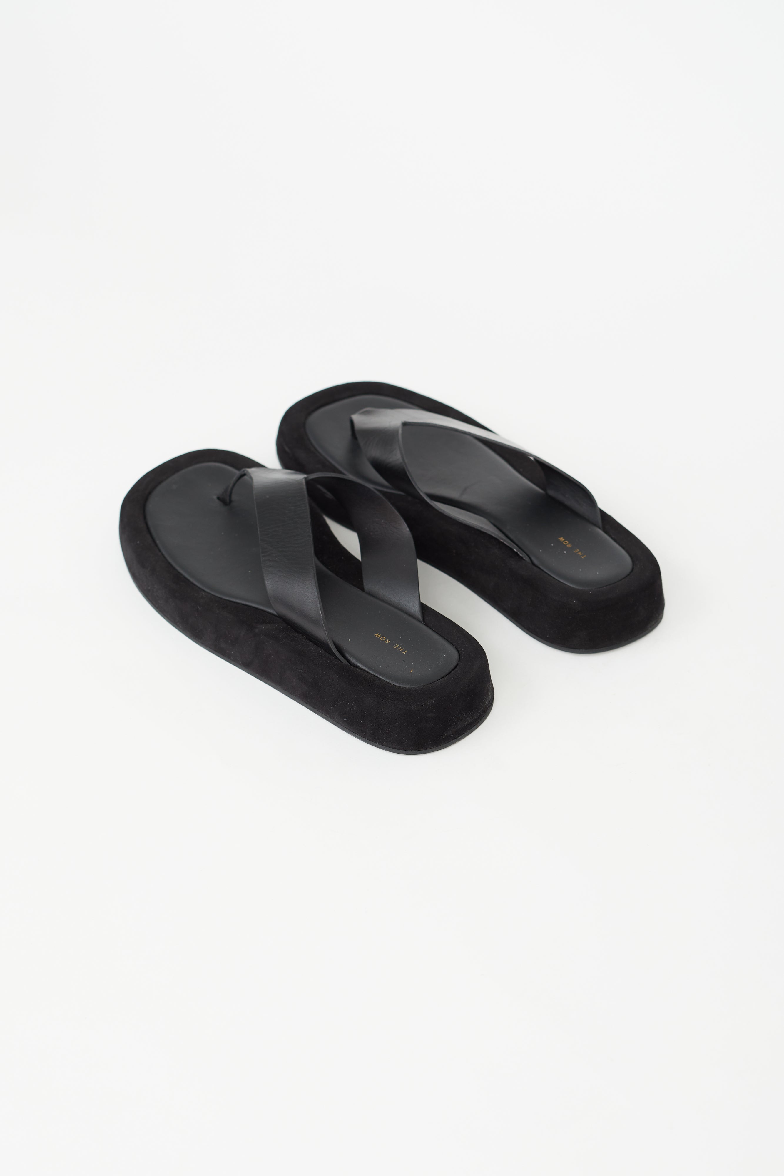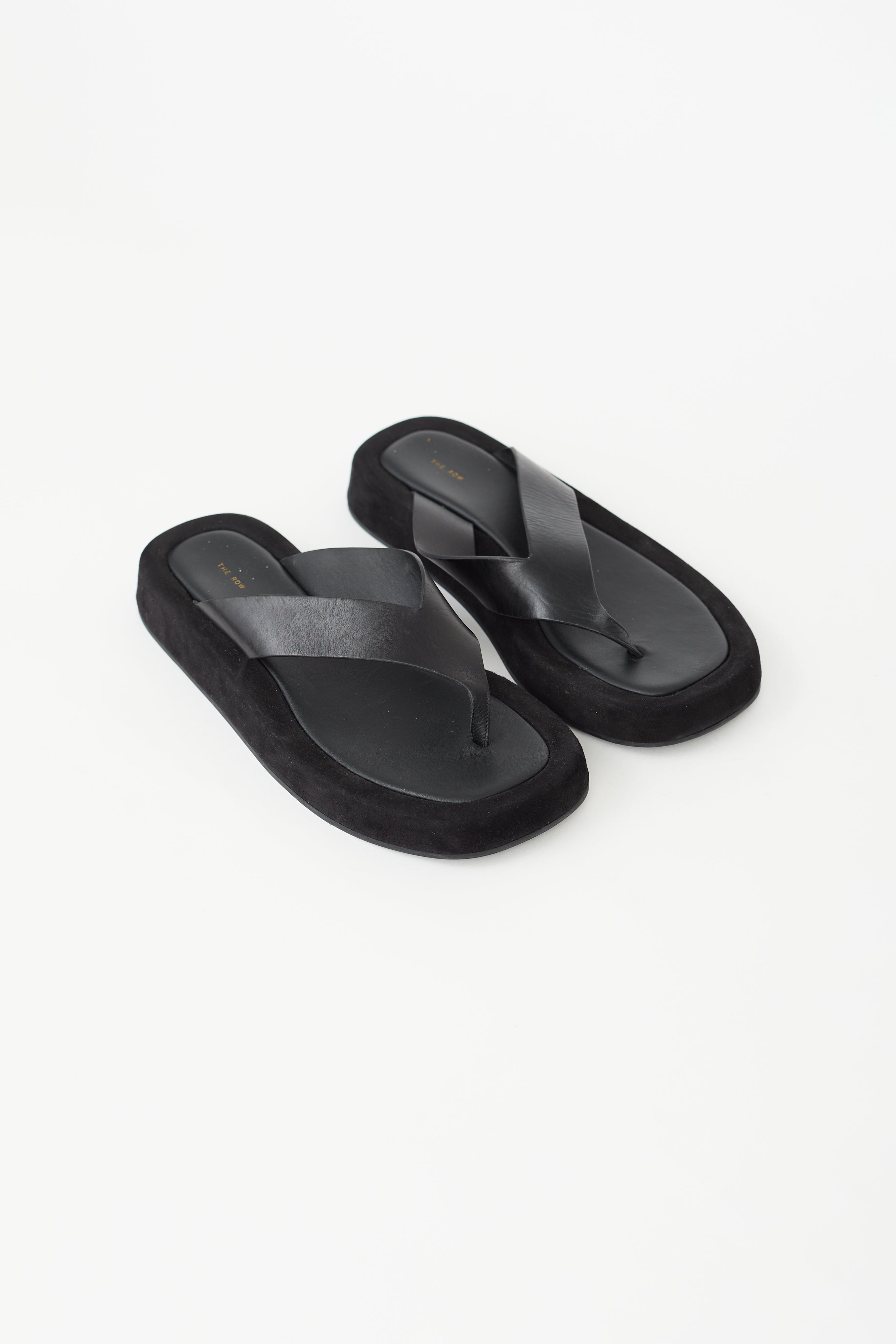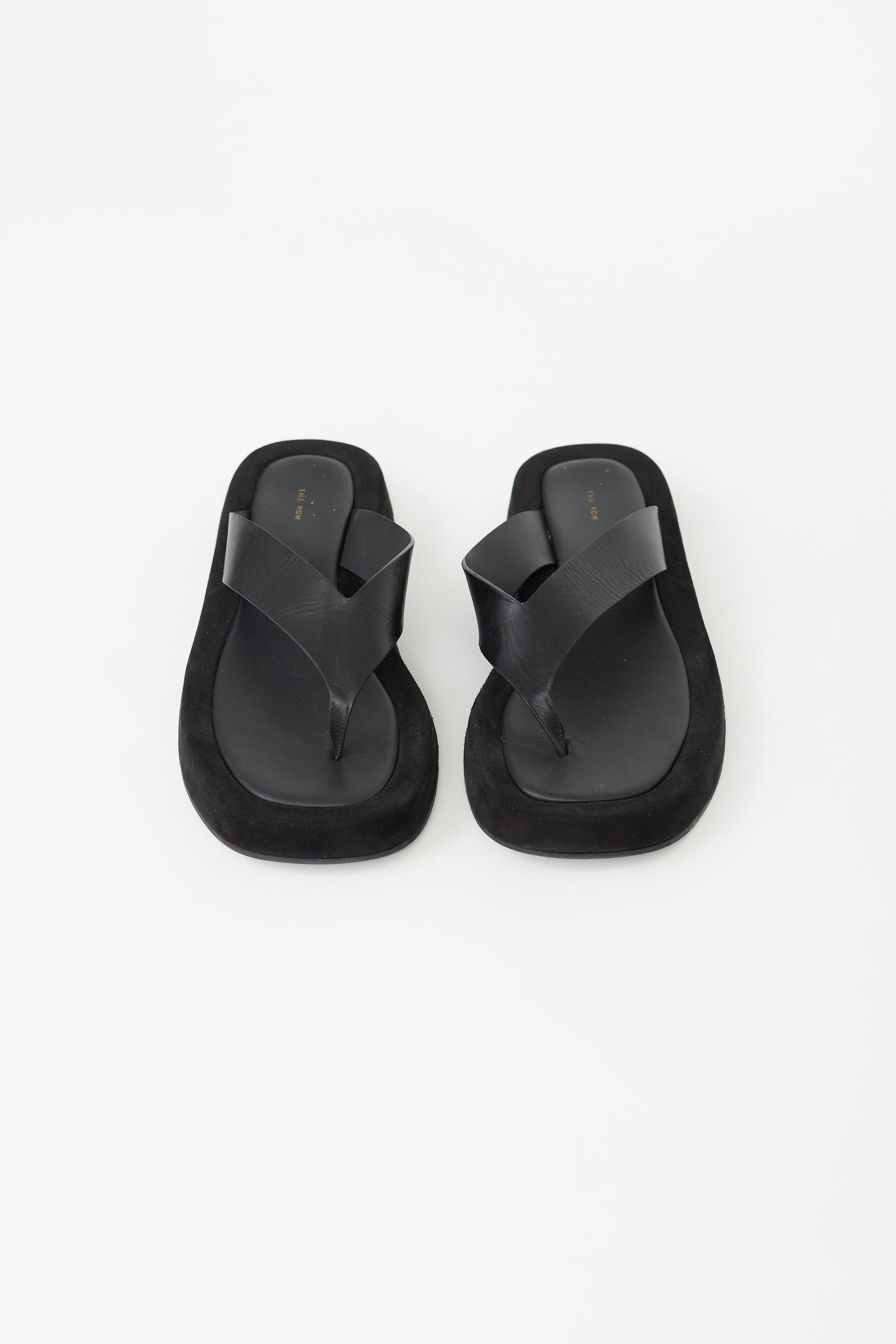 Pre-owned The Row black Ginza sandals featuring square toe, leather thong strap, gold stamped logo at insole, and suede midsole.