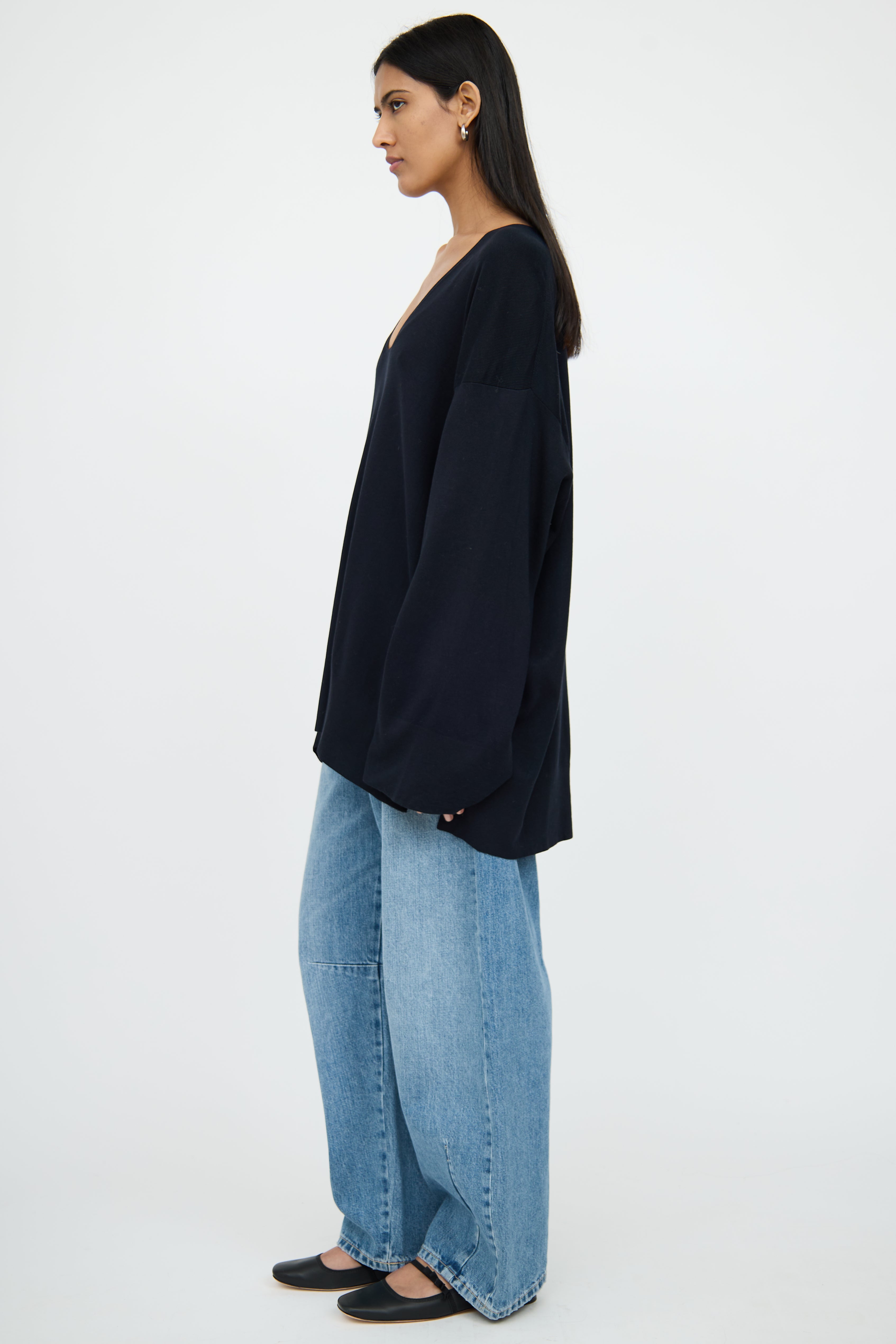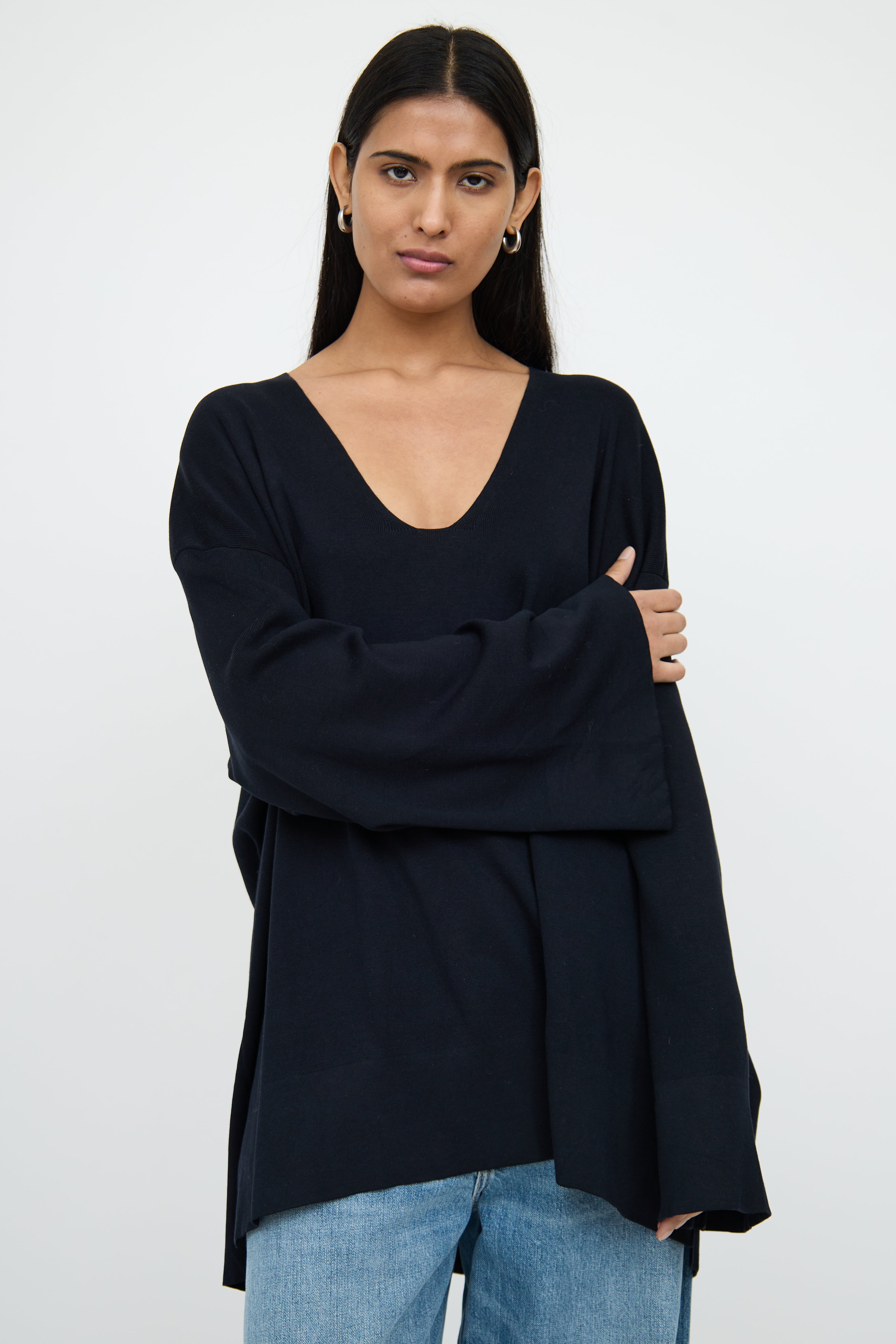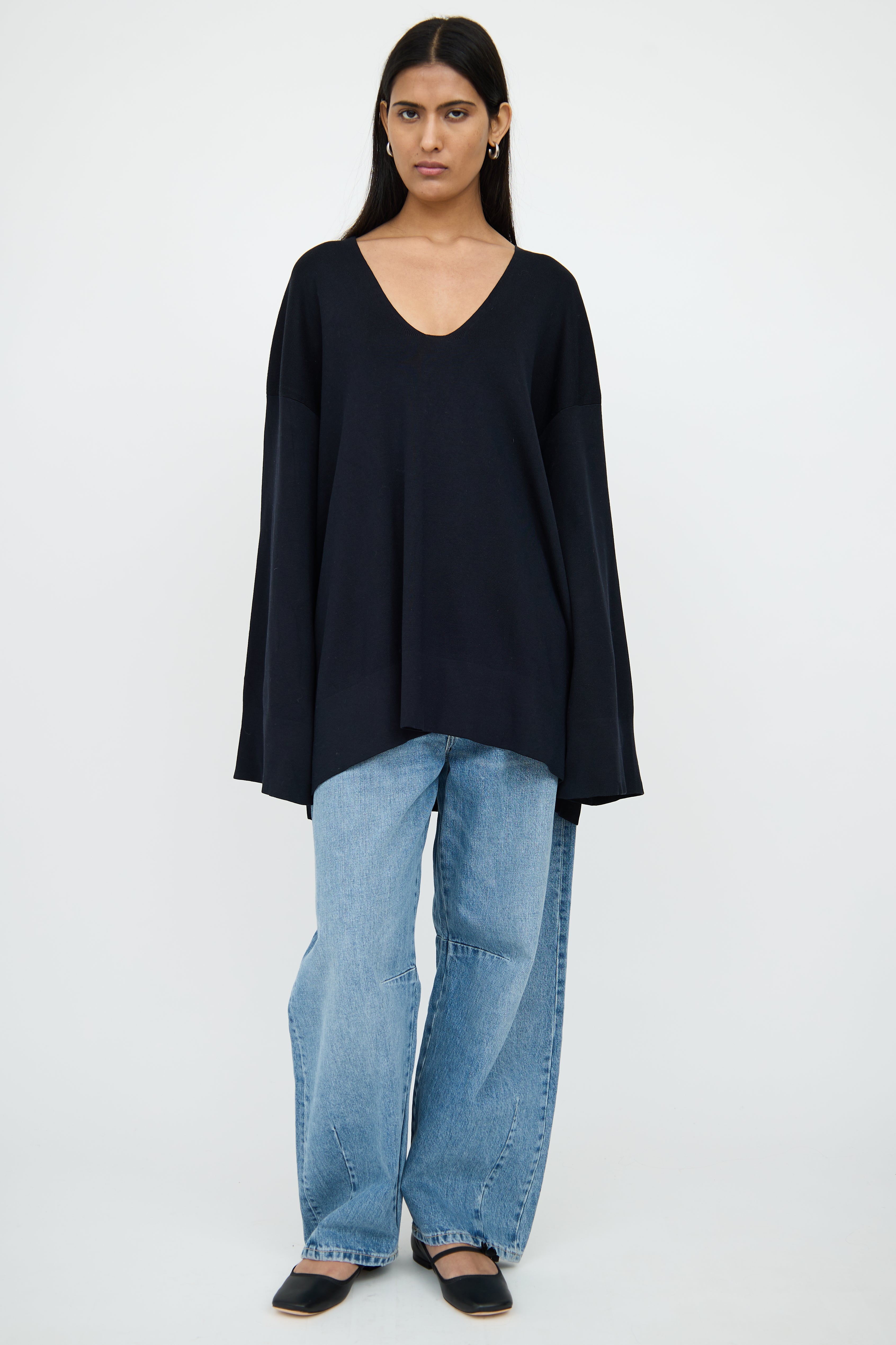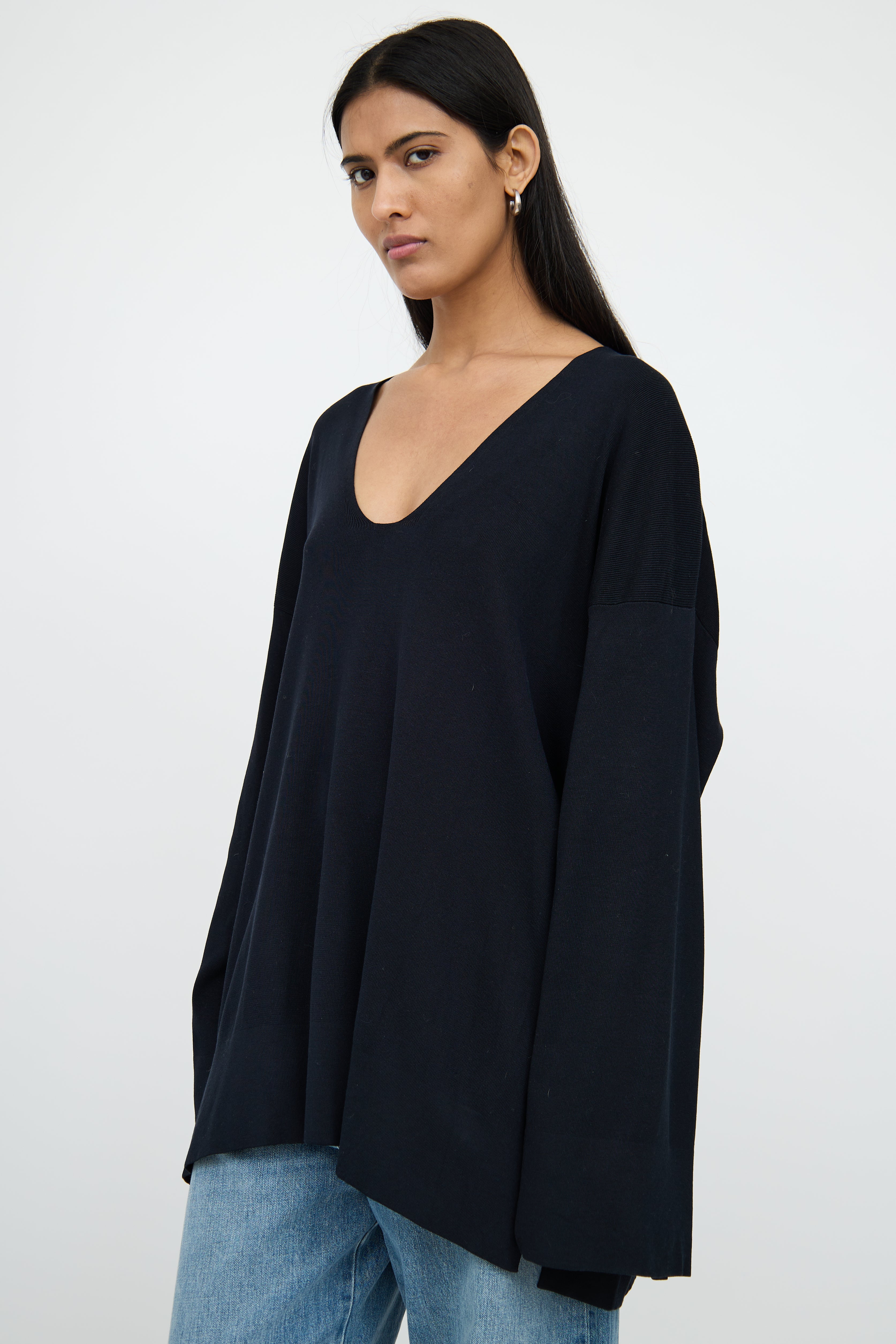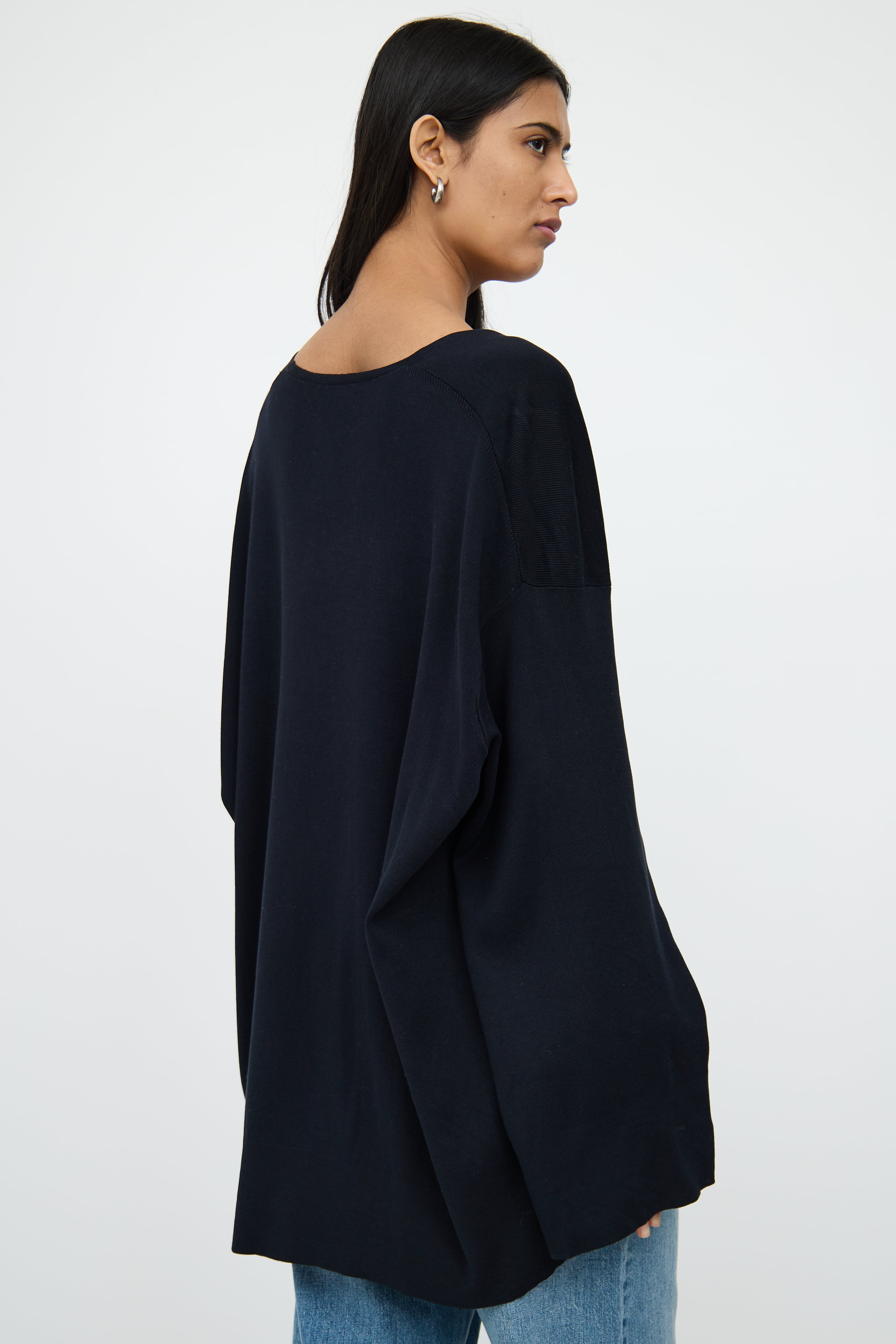 Pre-owned The Row black long sleeve tunic top featuring wide scoop neck, flare sleeves and dual slit high low hemline.