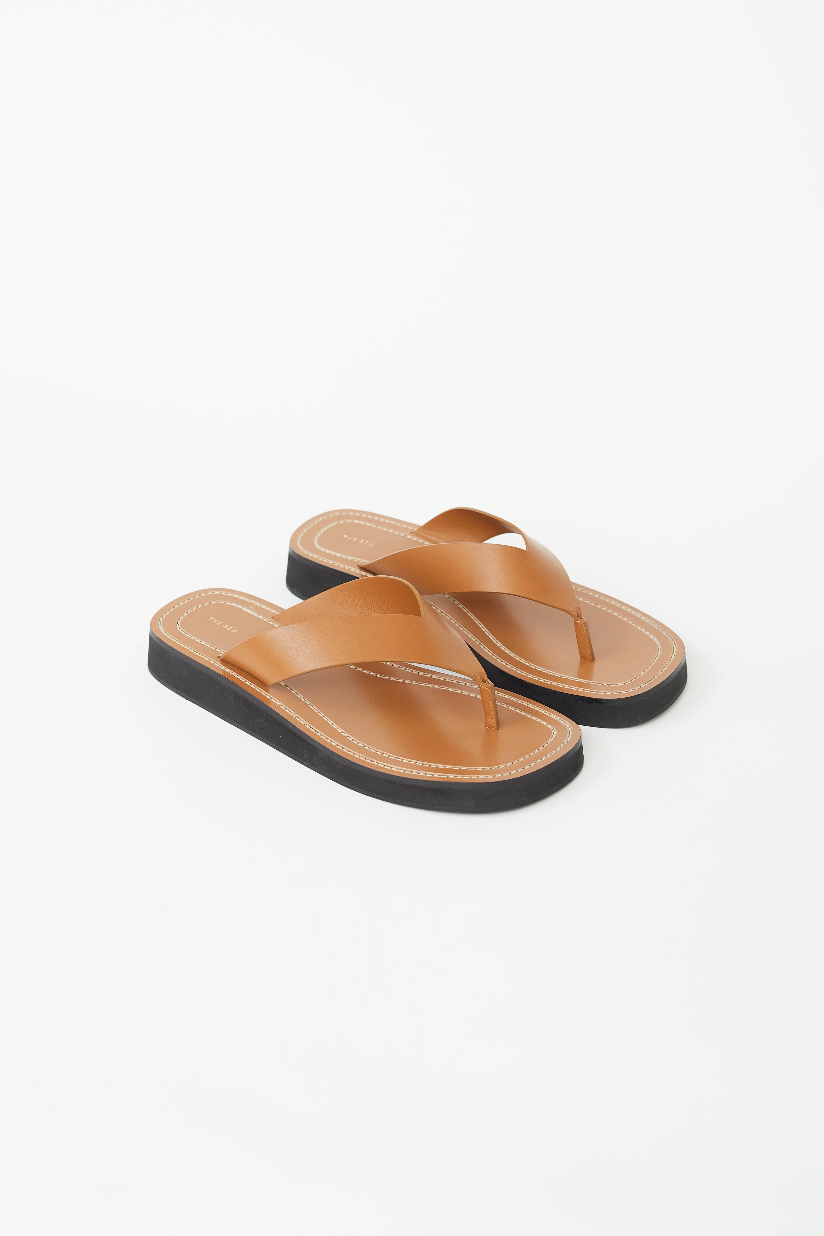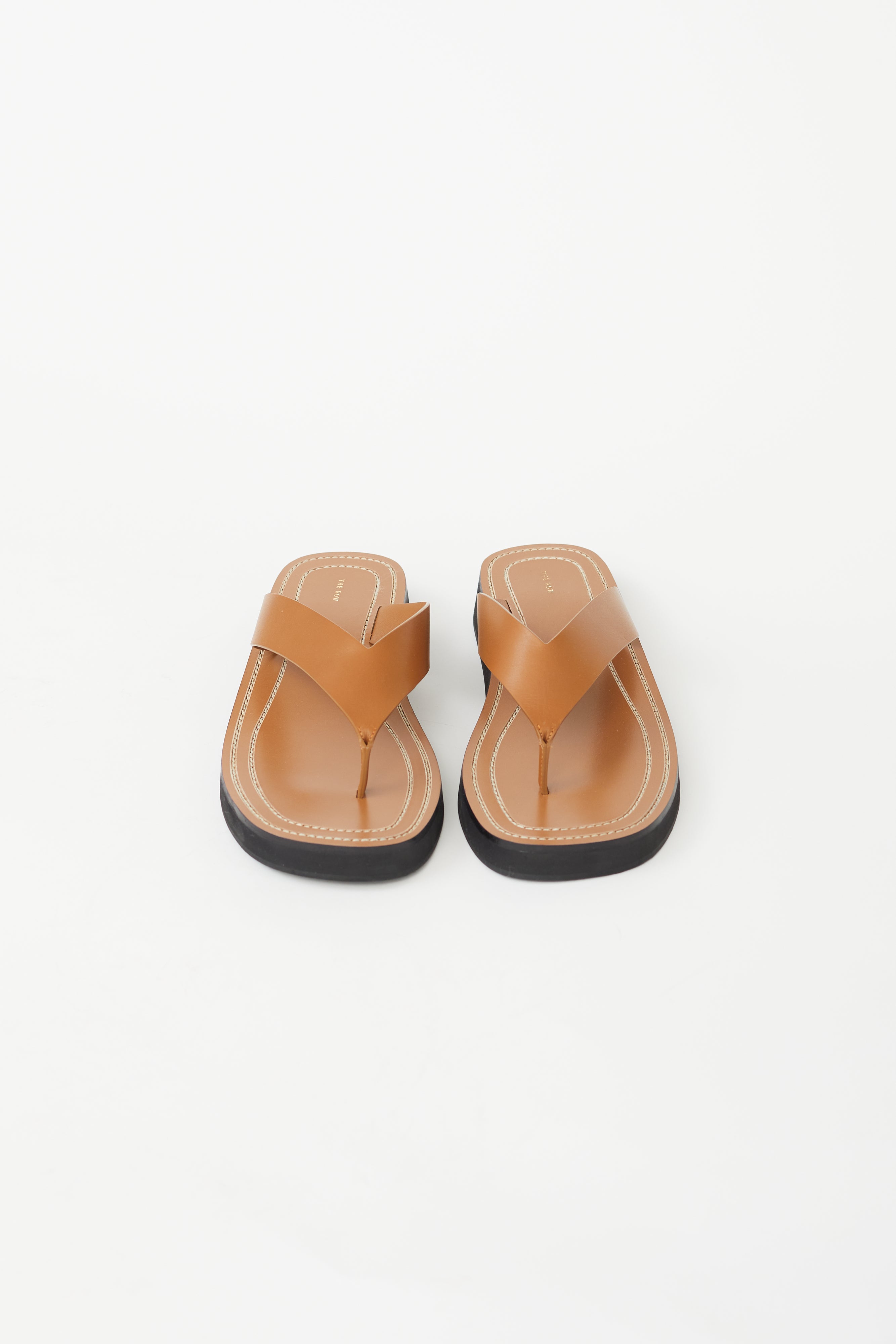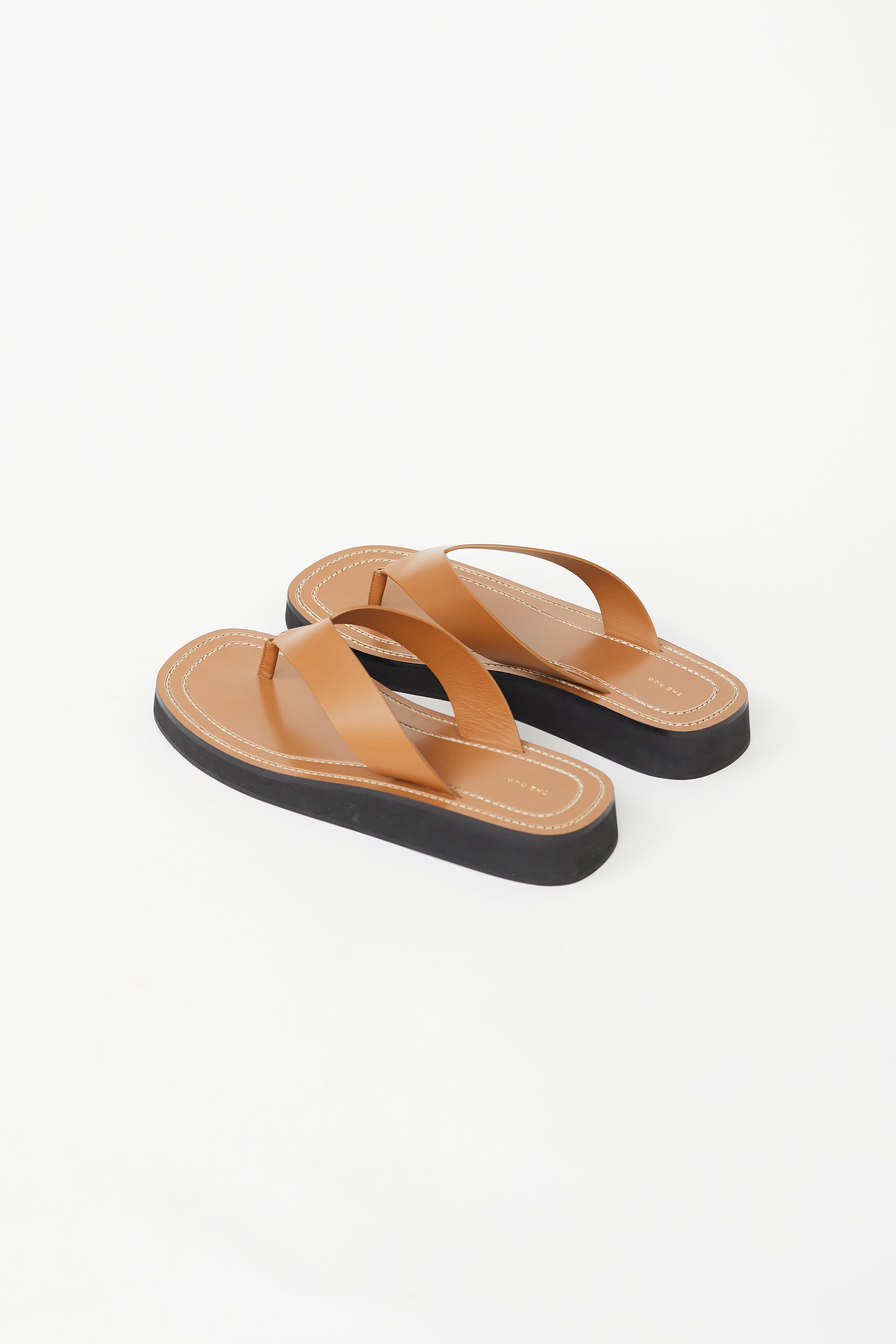 Pre-loved The Row Ginza sandals in brown featuring square toe, thong-style strap at vamp, gold-tone logo stamp at footbed, black rubber outsole, and contrast stitching at footbed. Original box and dust bag included.