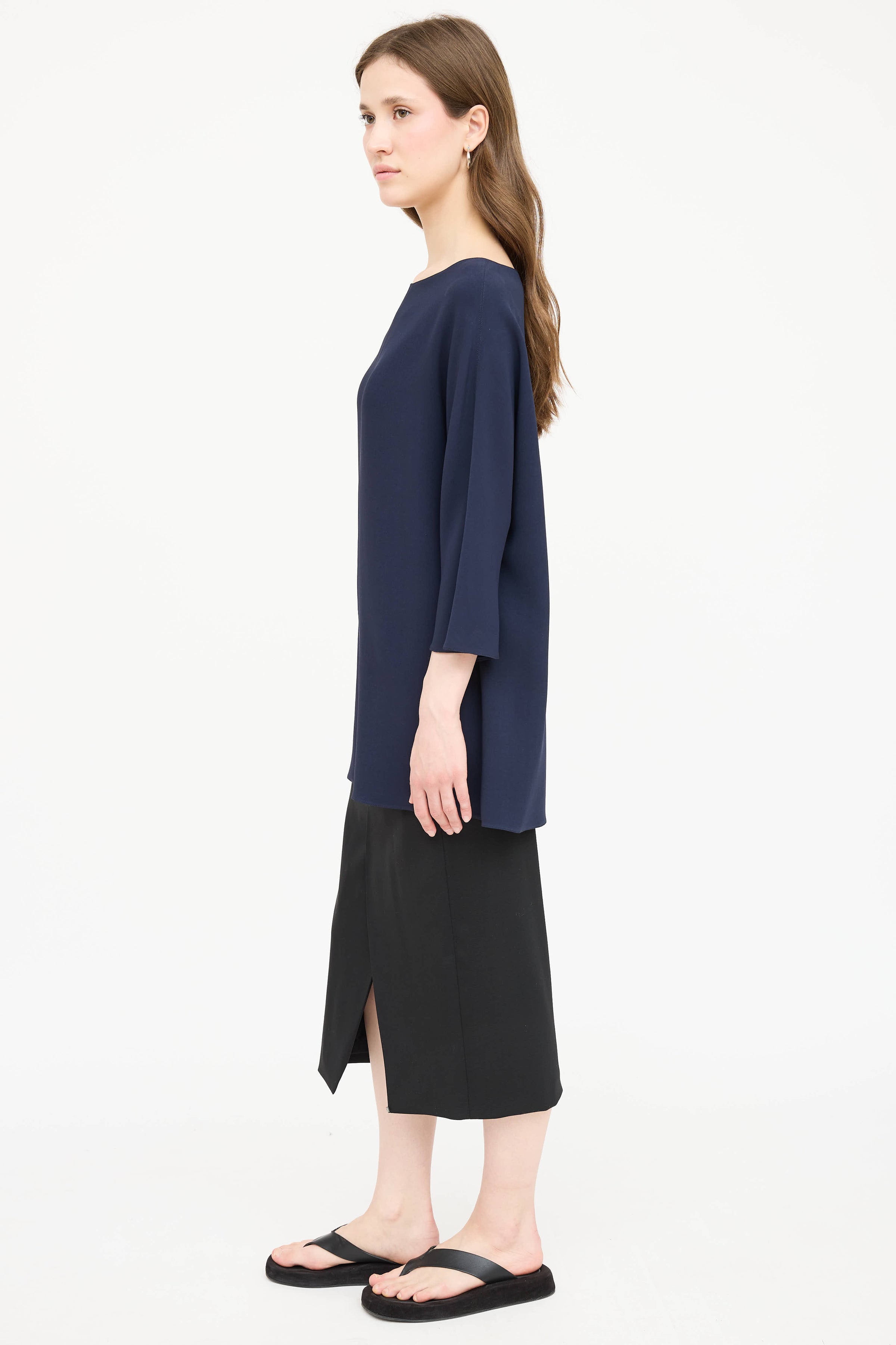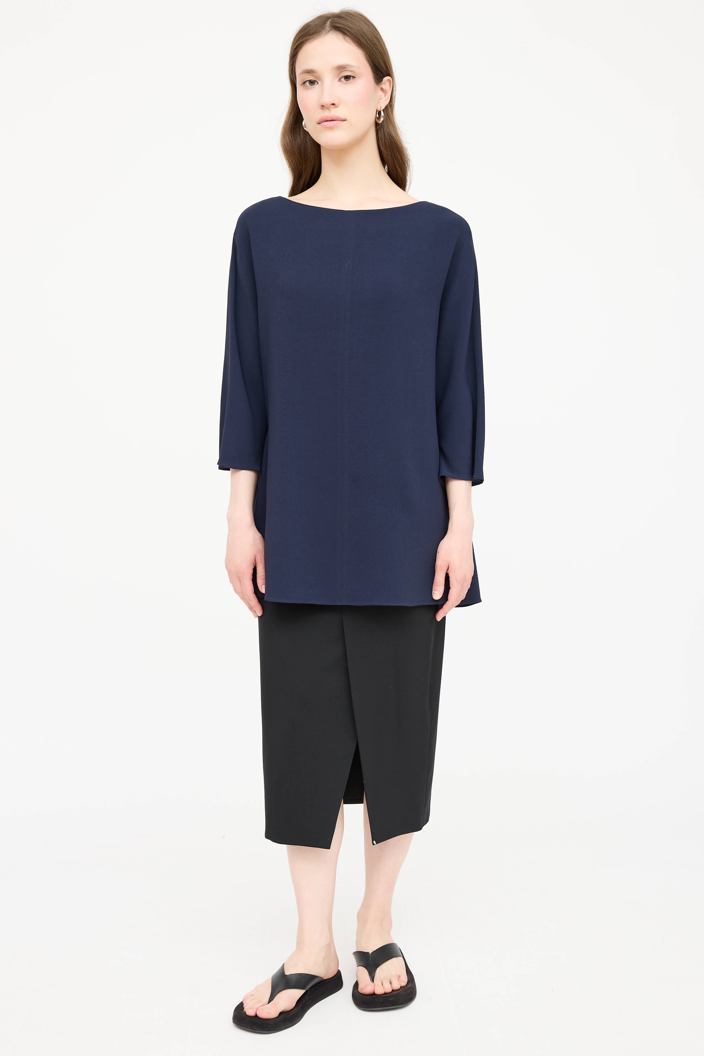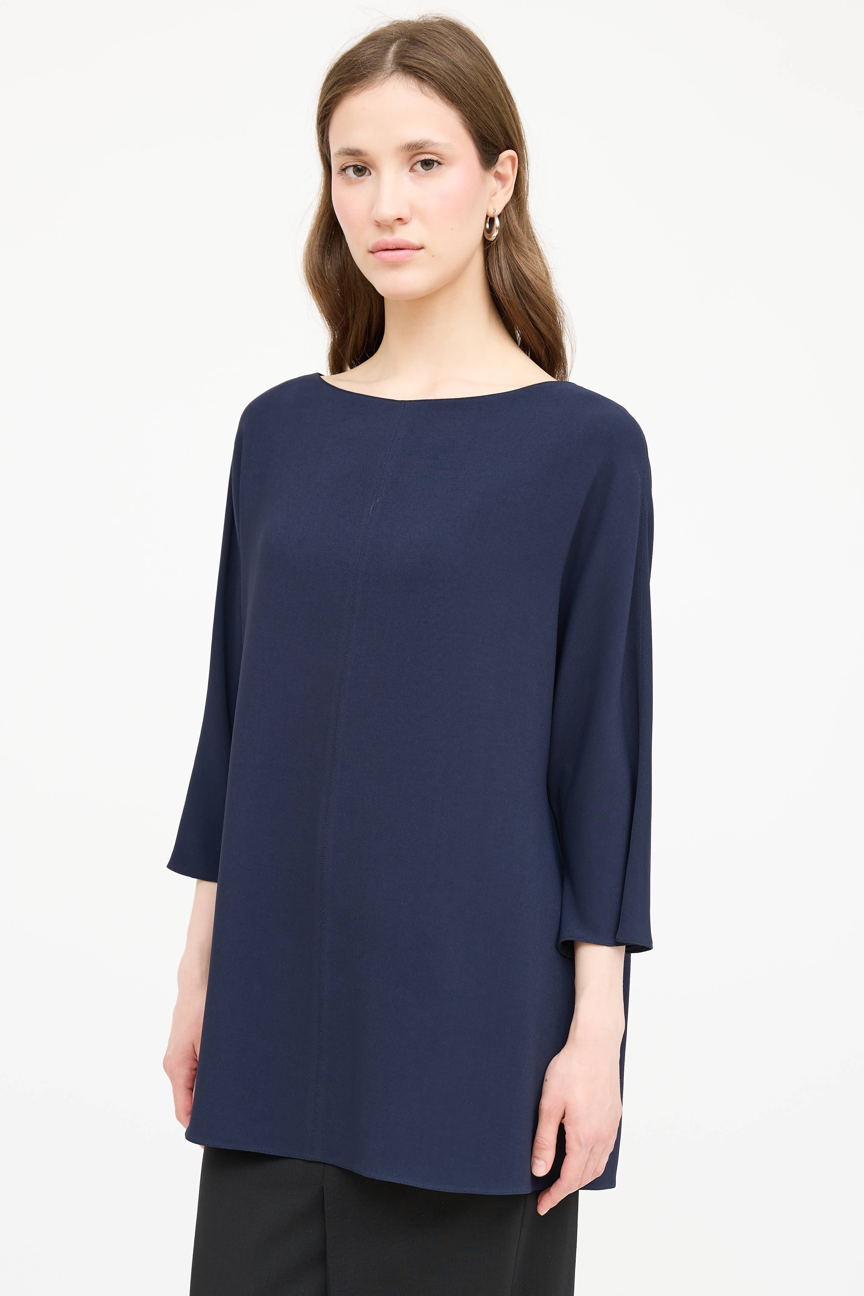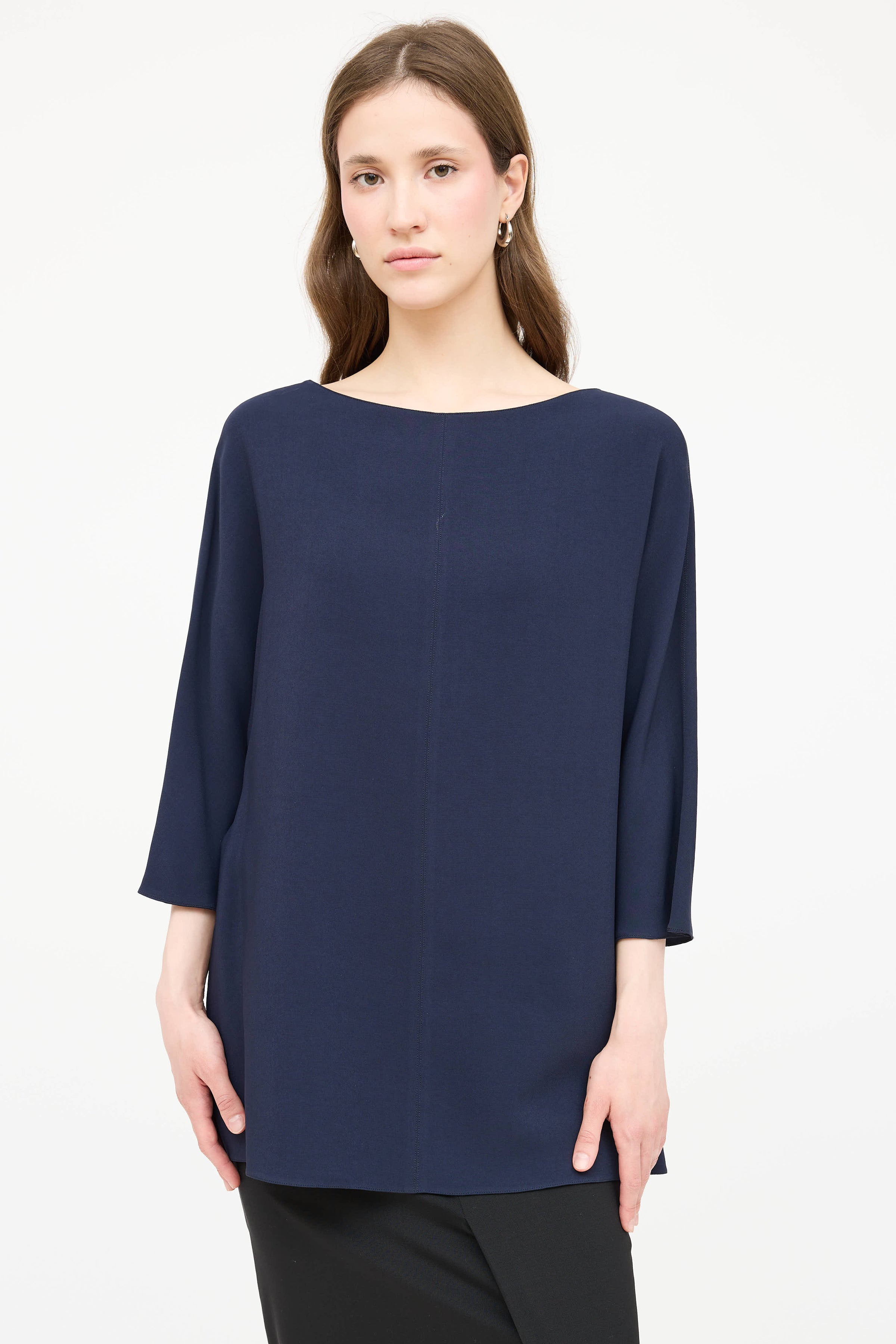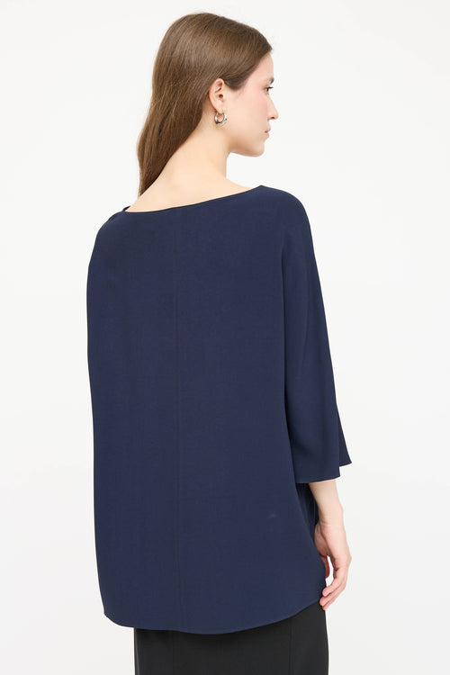 Pre-owned The Row navy top featuring a bateau neckline, short batwing sleeves, and centre seams.