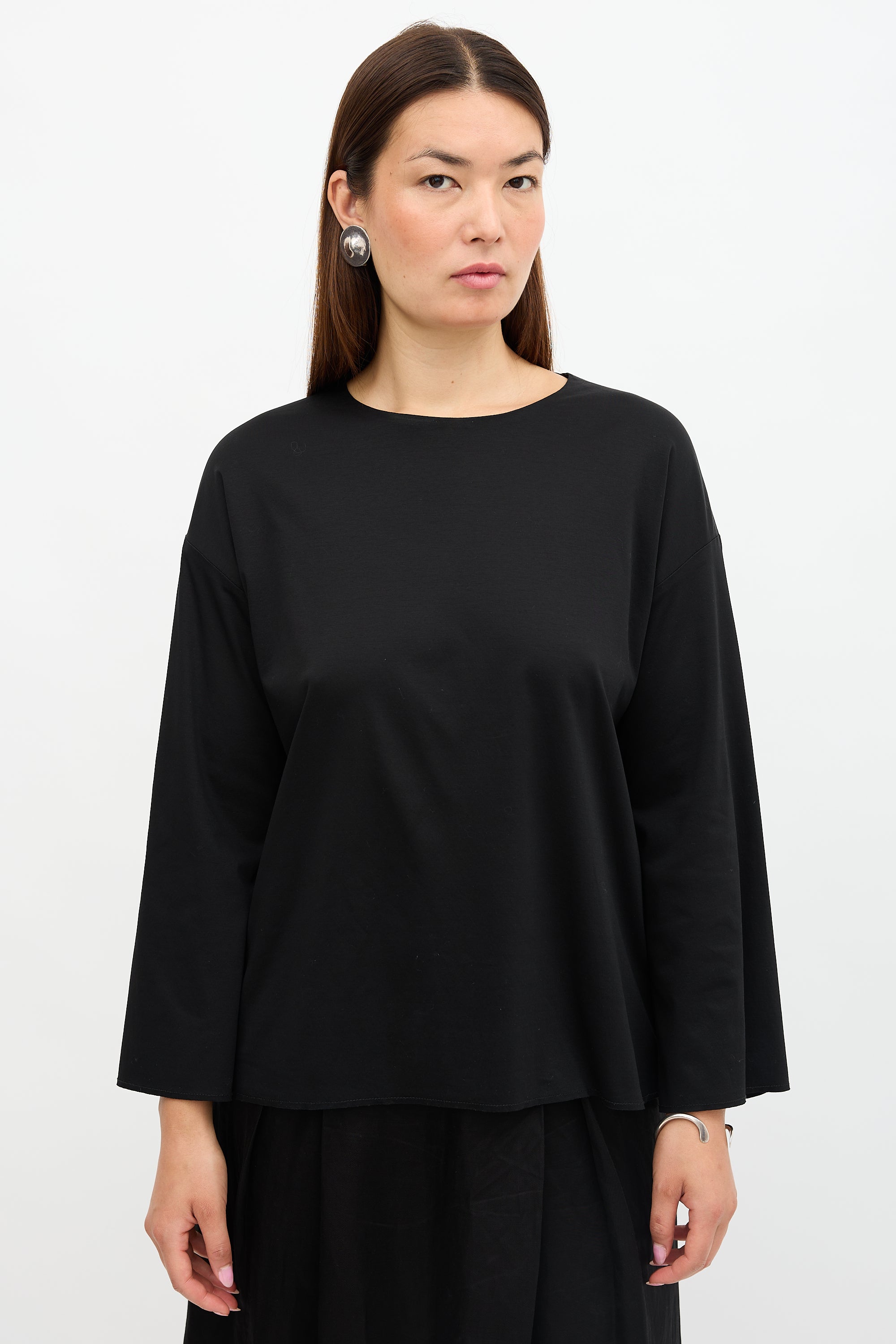 Pre-owned The Row black cotton top featuring a round neckline, long wide sleeves, drop shoulder, and centre back seam detail. Lined.