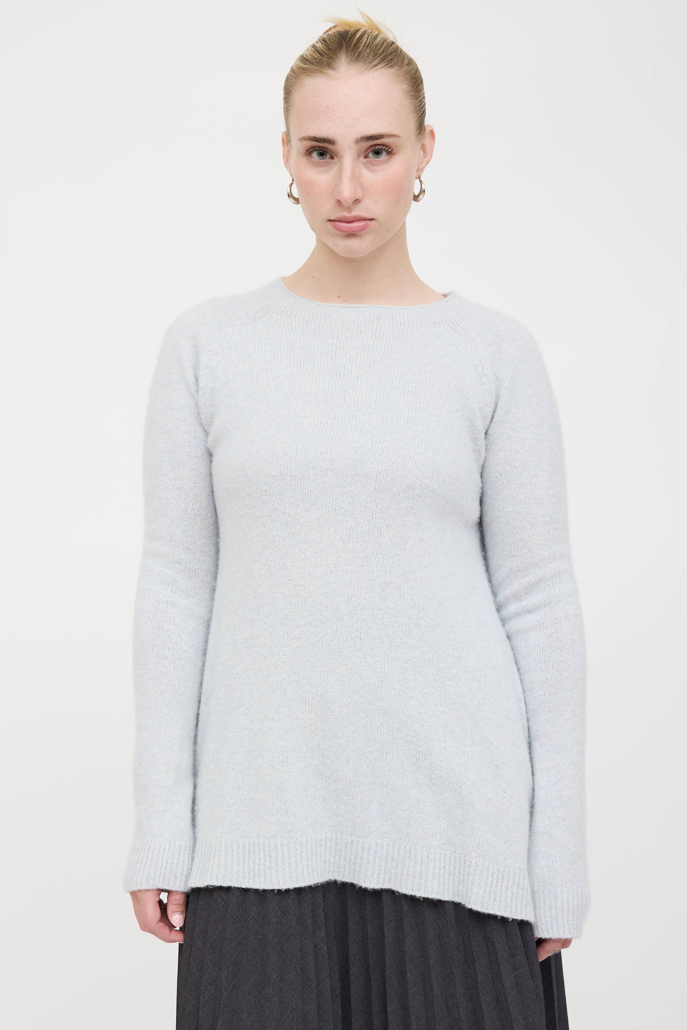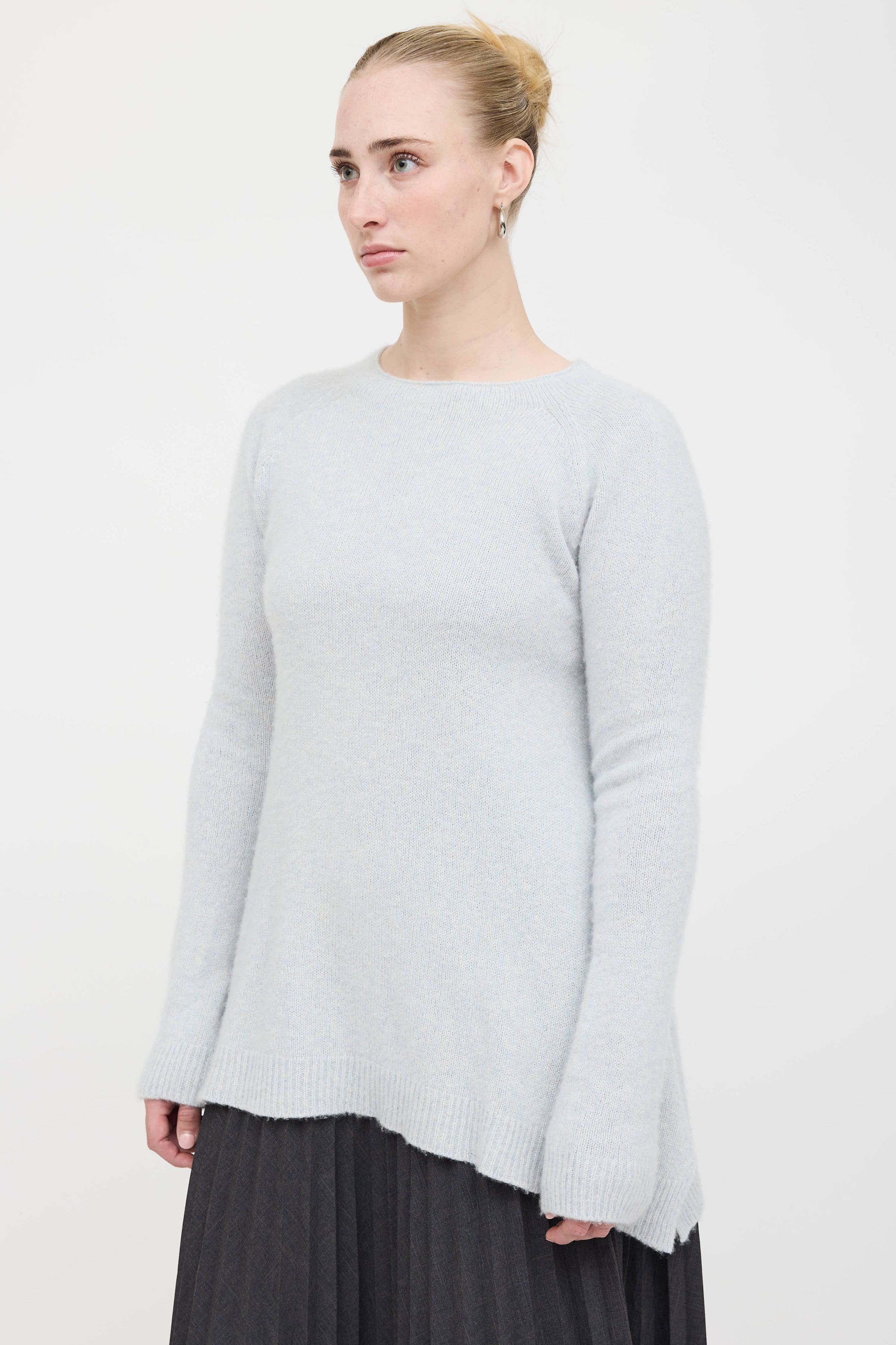 Pre-owned The Row light blue long sleeve sweater featuring round neckline, panel at back, slit at hem, and ribbed trims.