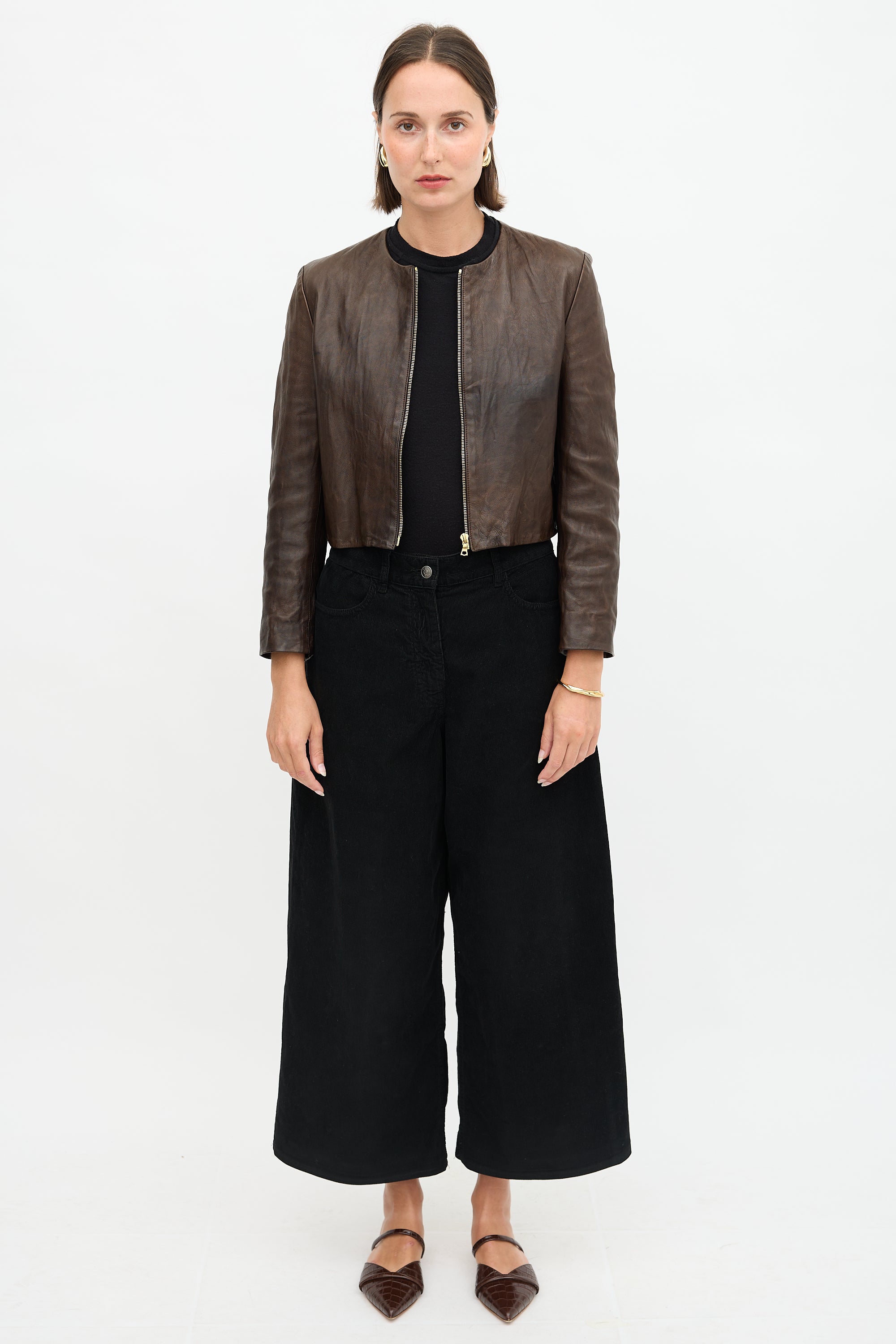 Pre-owned The Row brown leather jacket featuring collarless neckline, zip up front, and zipped cuffs. Lined.