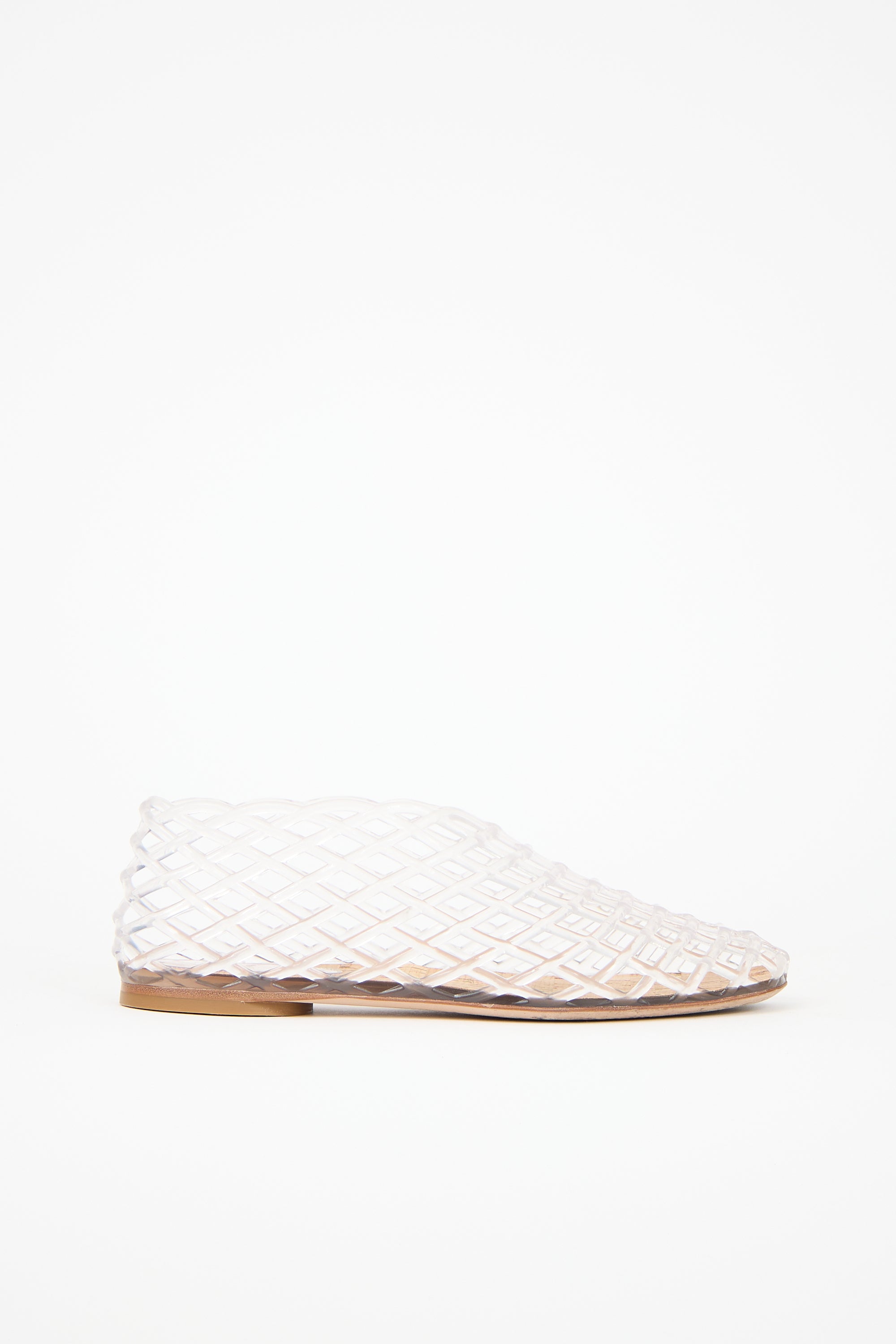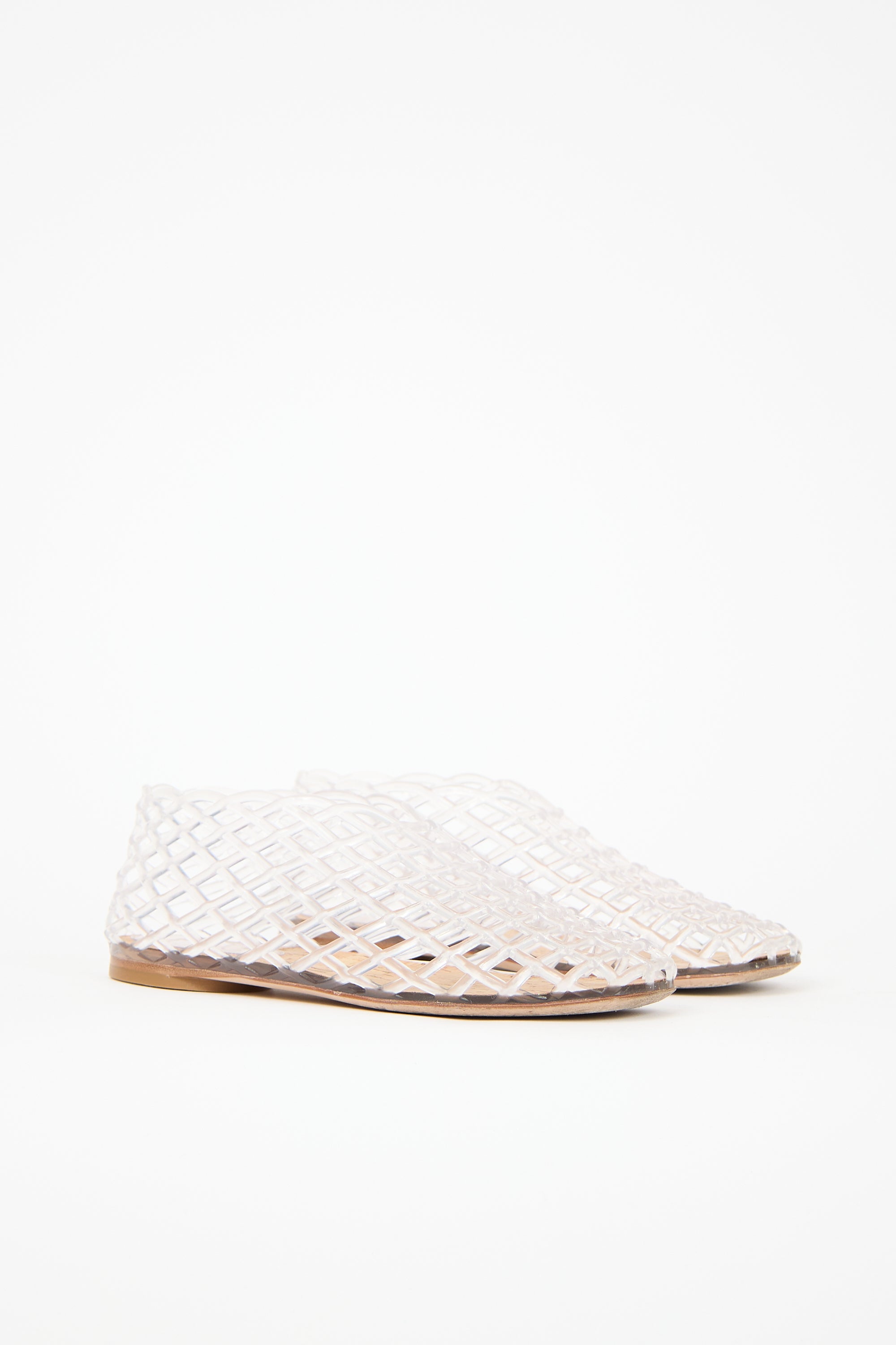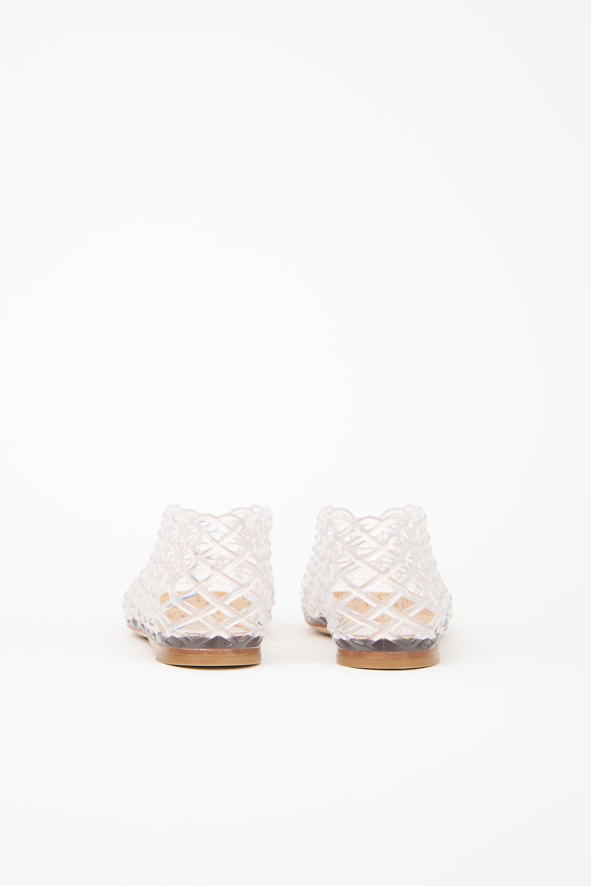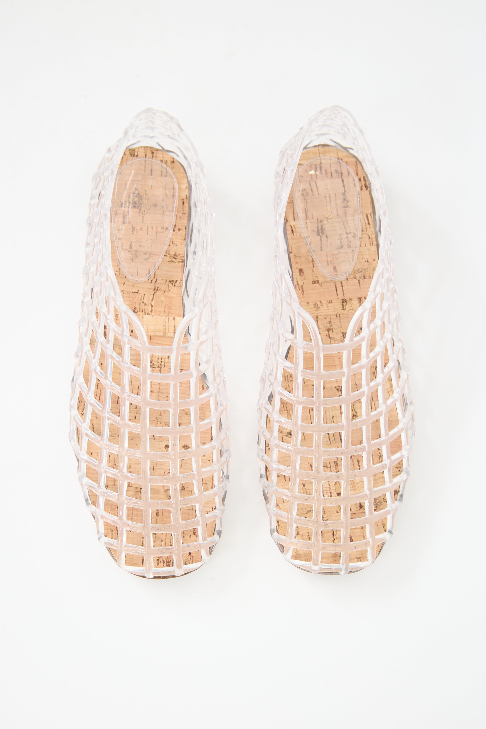 Pre-owned The Row clear Mara flats featuring rounded toe, PVC caged upper, cork insole, and leather outsole.