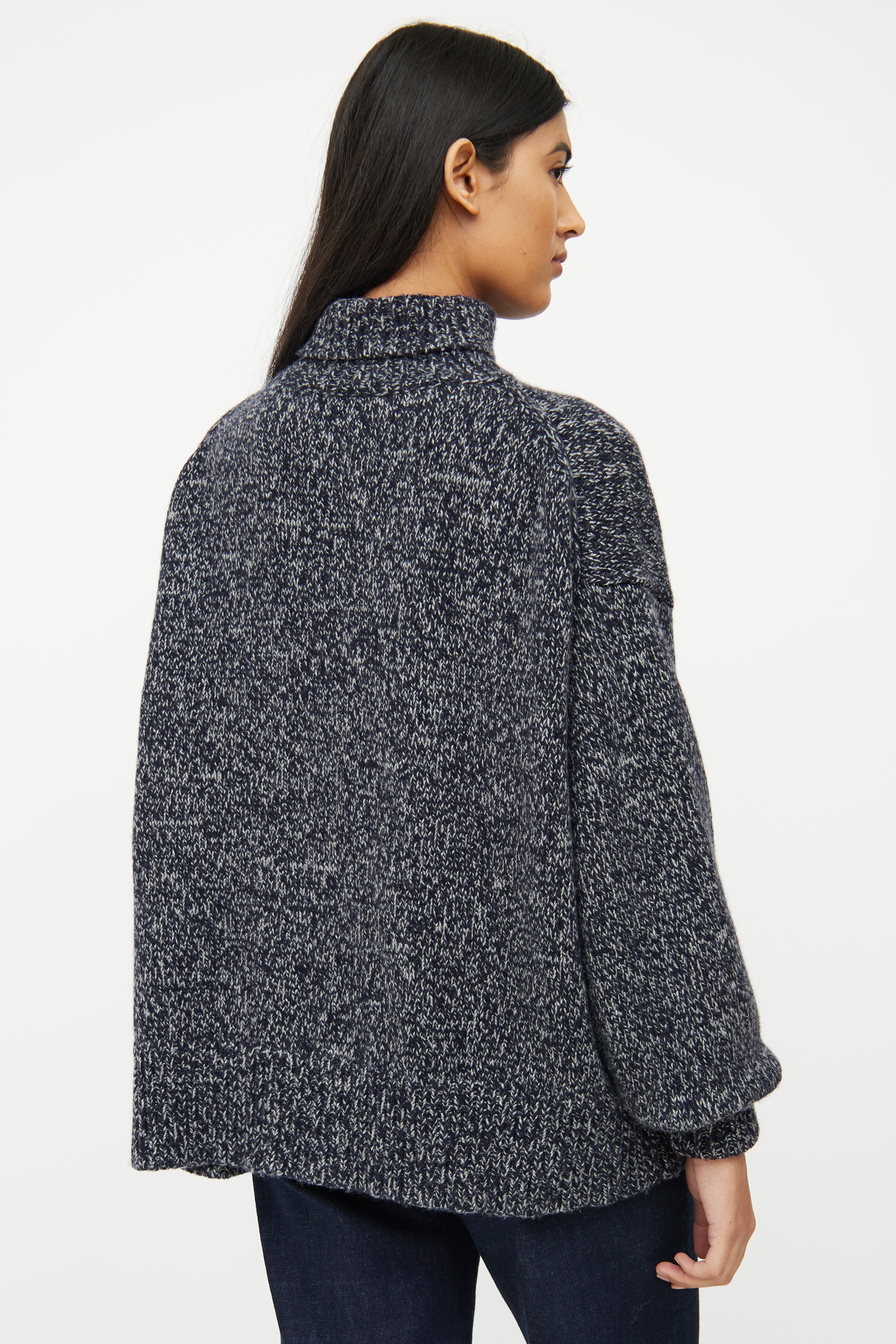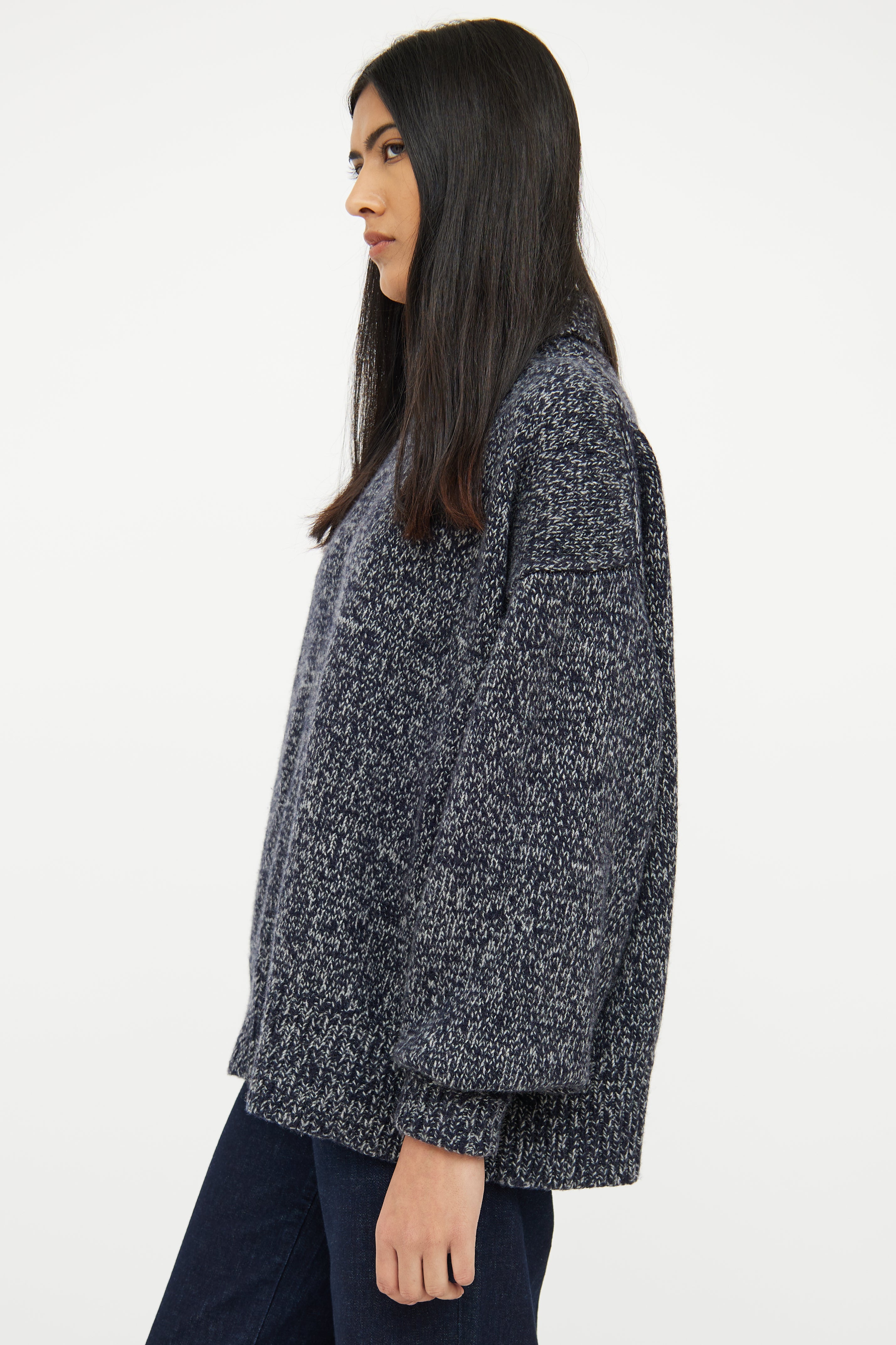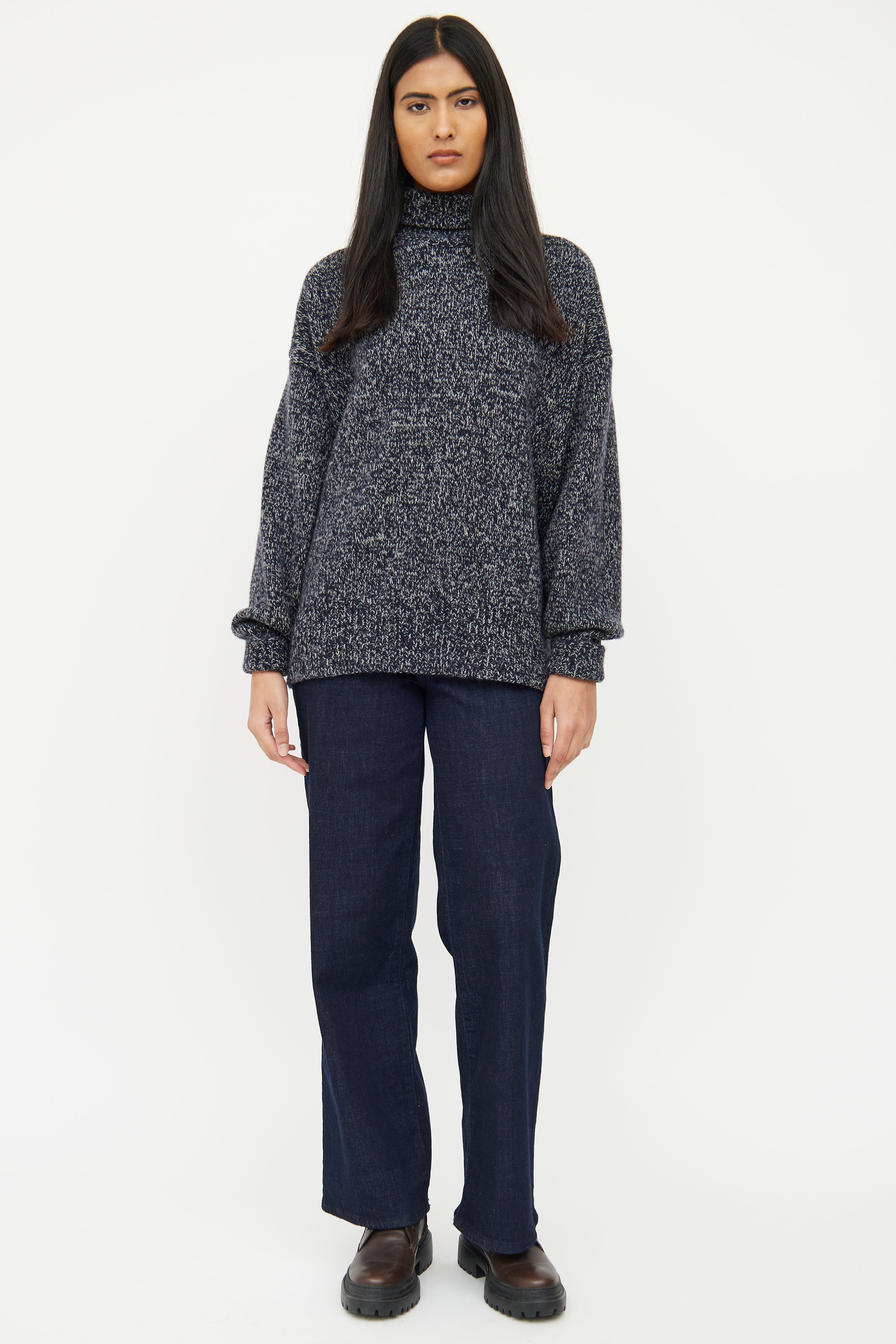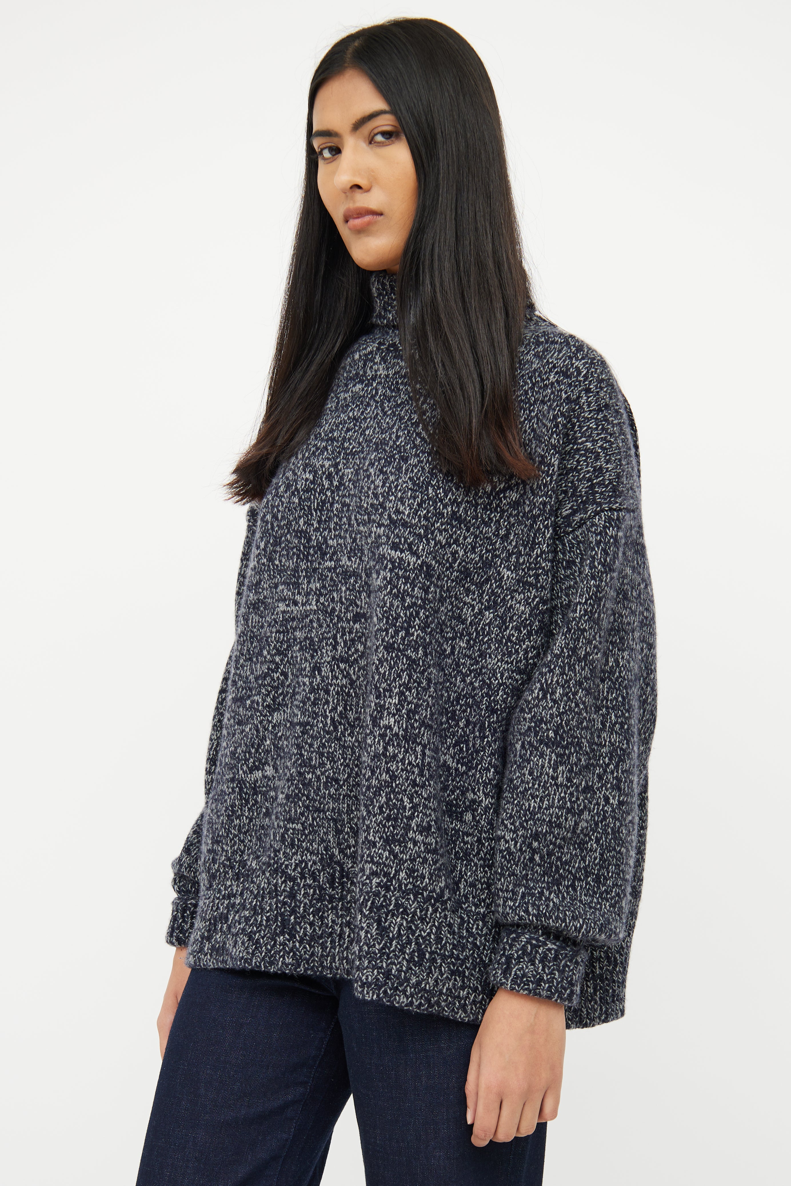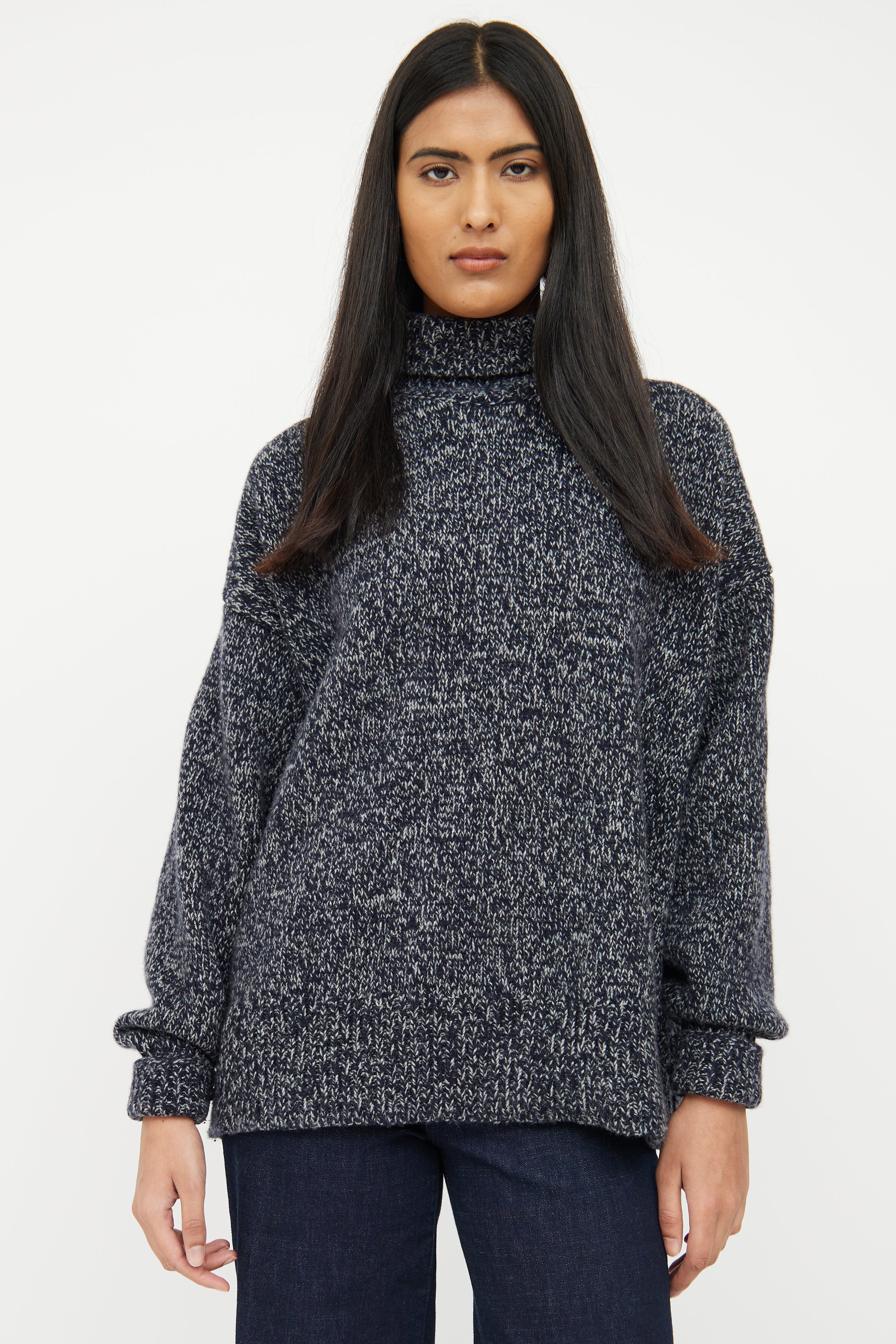 Pre-owned The Row navy and grey cashmere boucle long sleeve sweater featuring turtleneck, oversized fit, ribbed cuffs and hem.