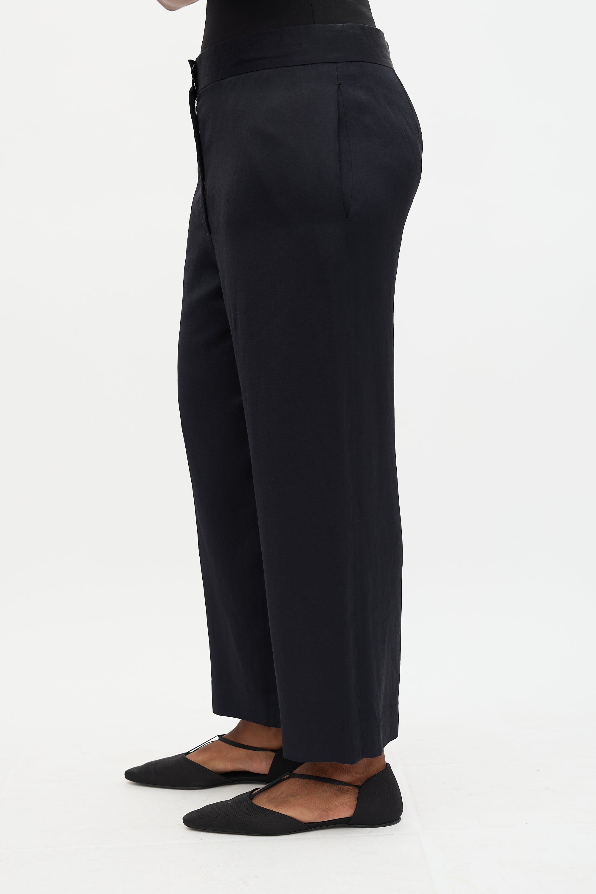 Pre-owned The Row black satin trousers featuring slot at right waist, in seam pockets, wide leg, and zip fly. Clipped to fit model.