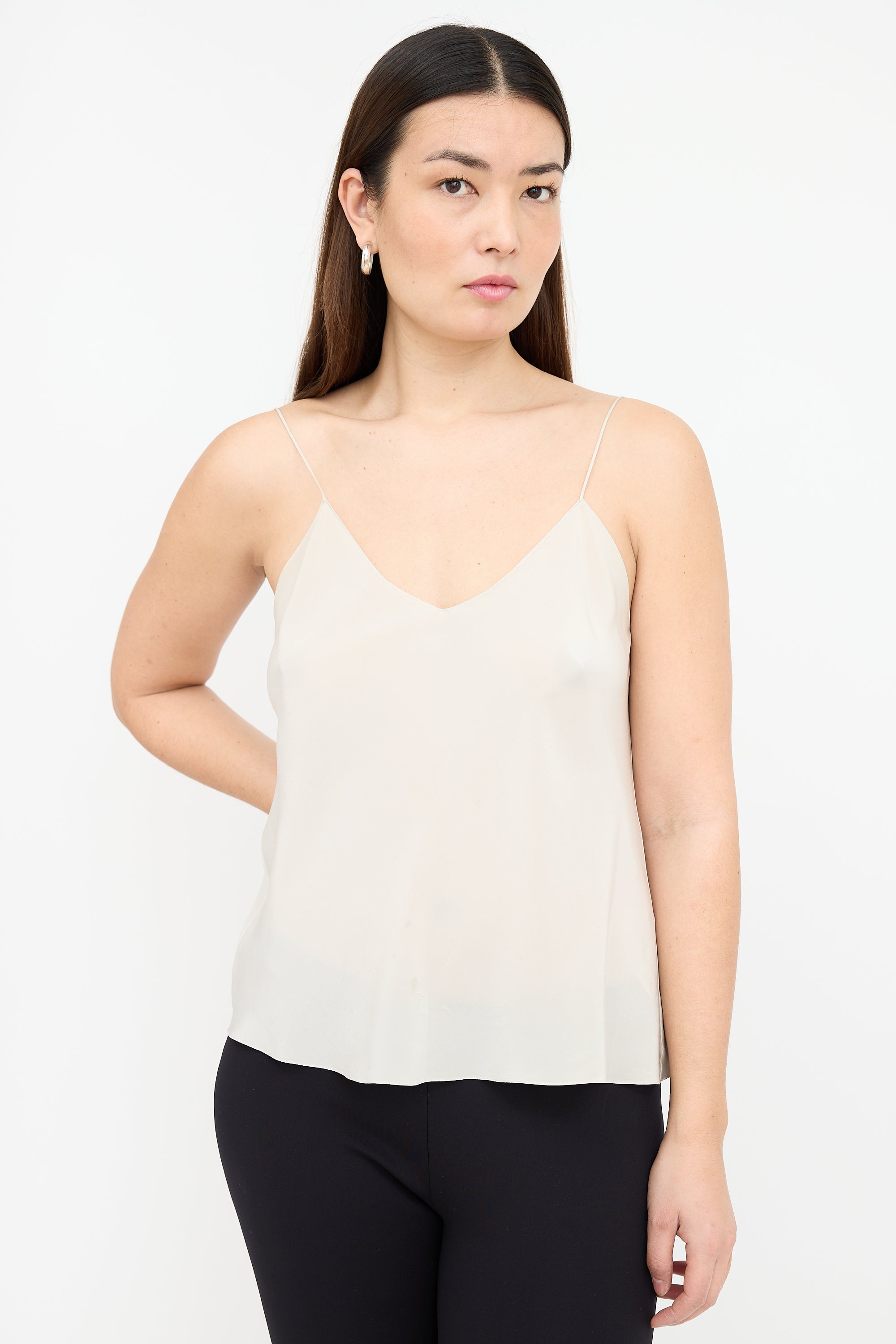 Pre-owned The Row cream silk camisole featuring a V-neckline and fixed spaghetti straps.