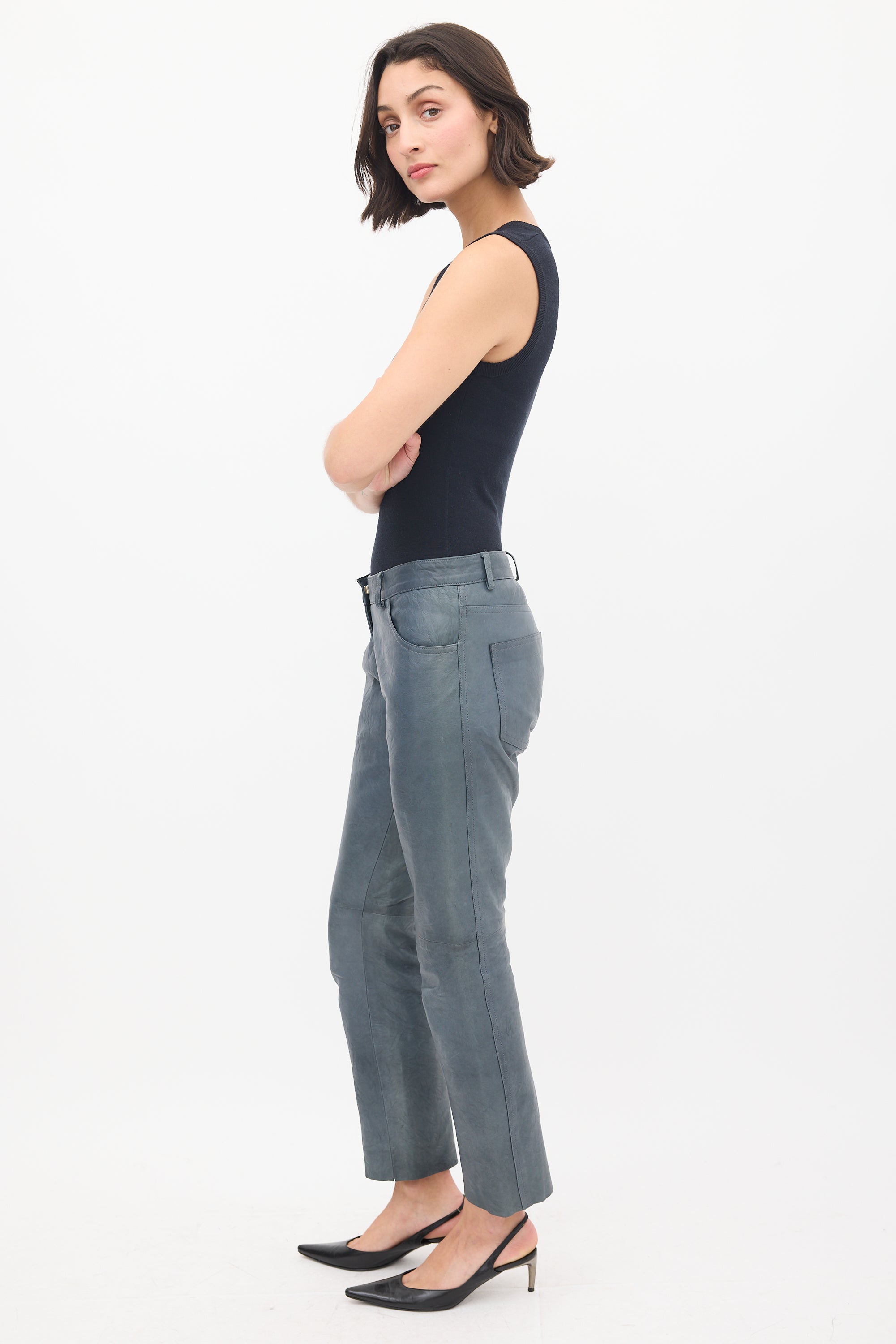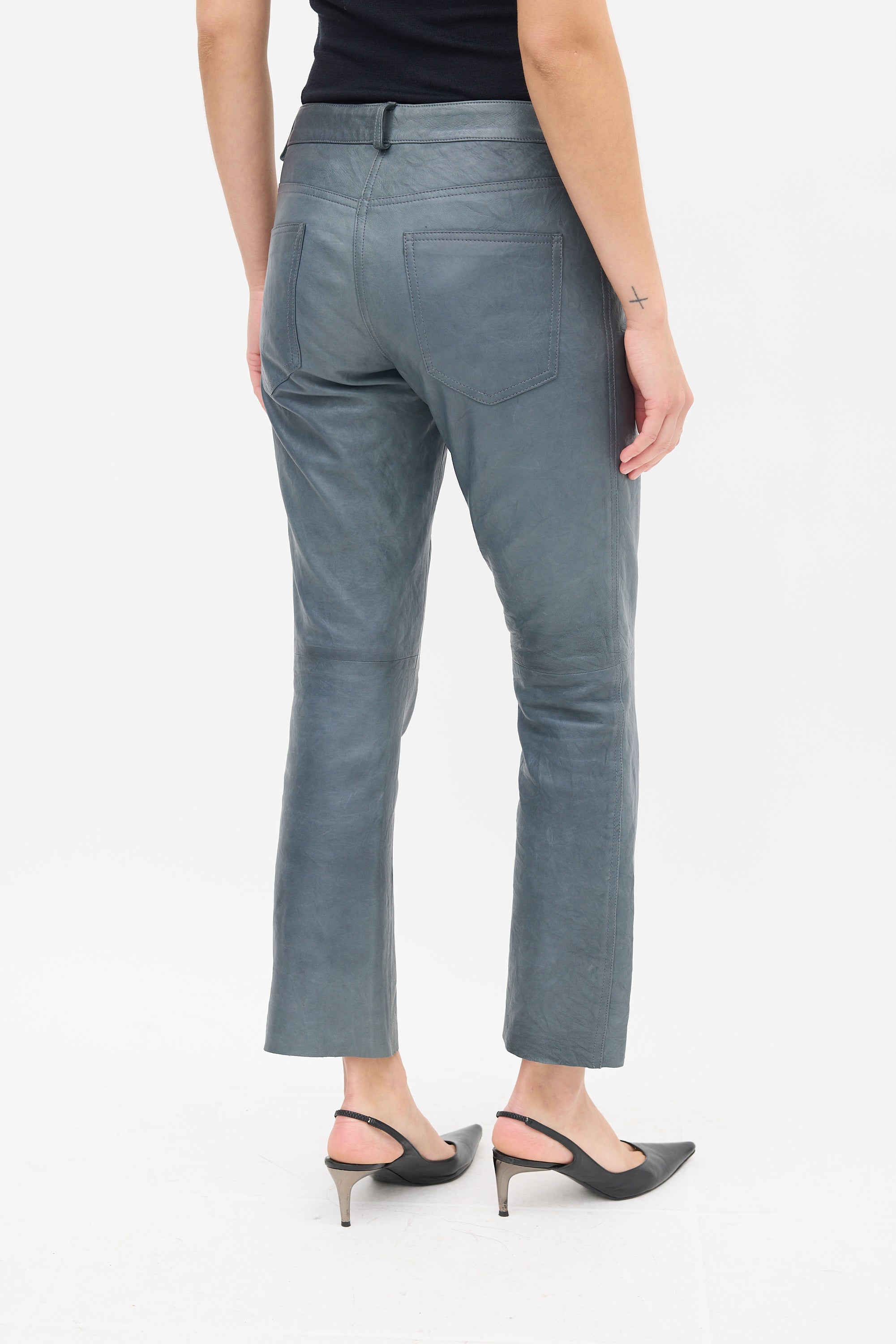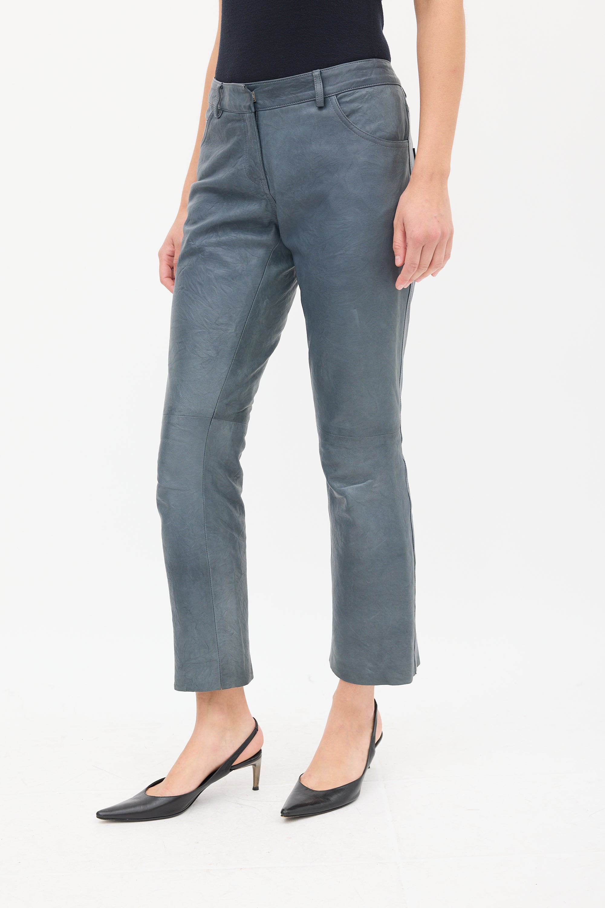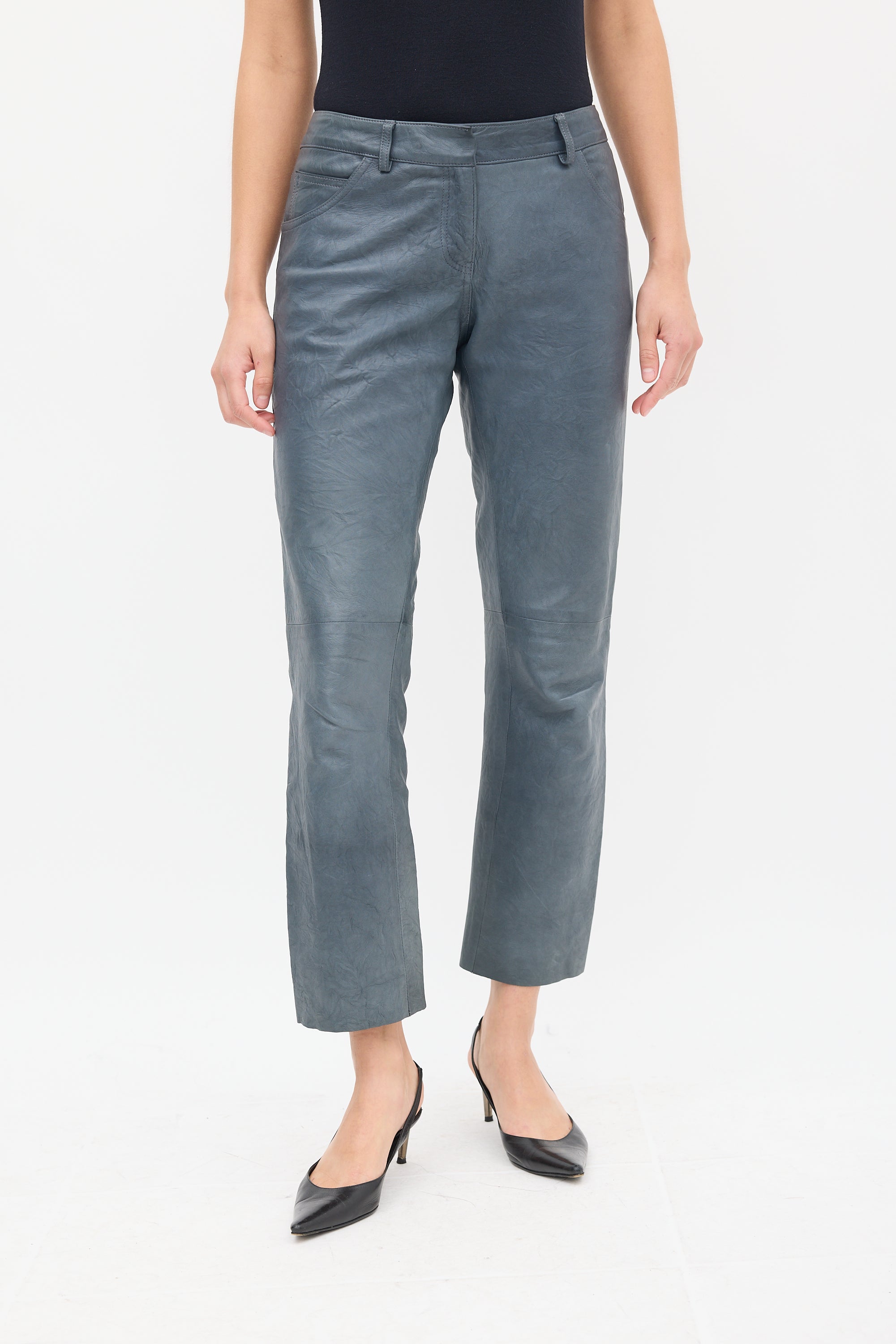 Pre-owned The Row slate grey leather trousers featuring a regular waist, straight leg, raw hem, five pocket styling, and zip fly. Lined.