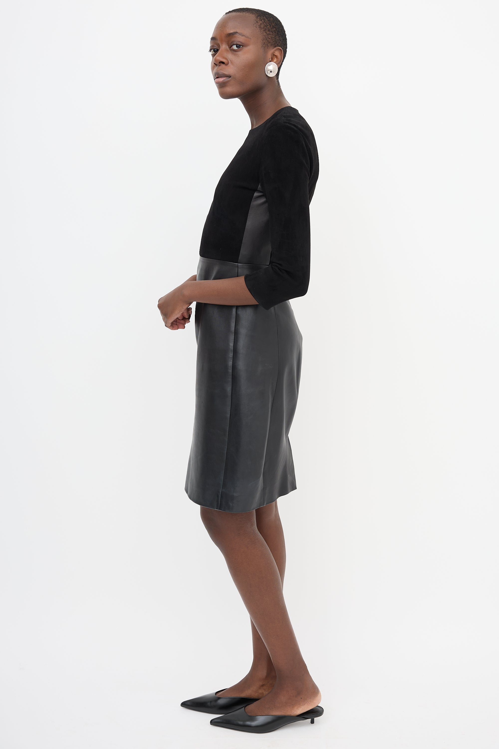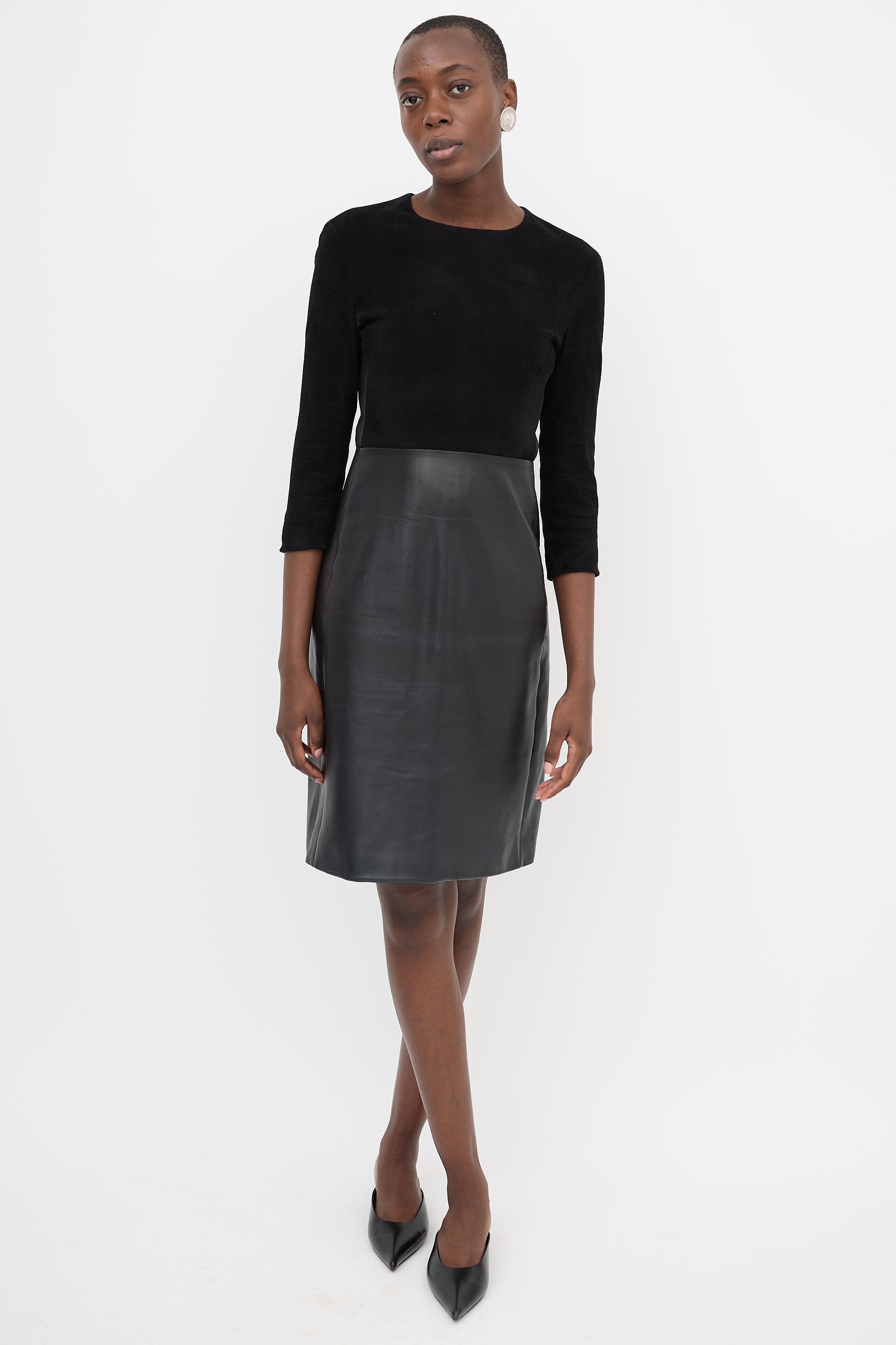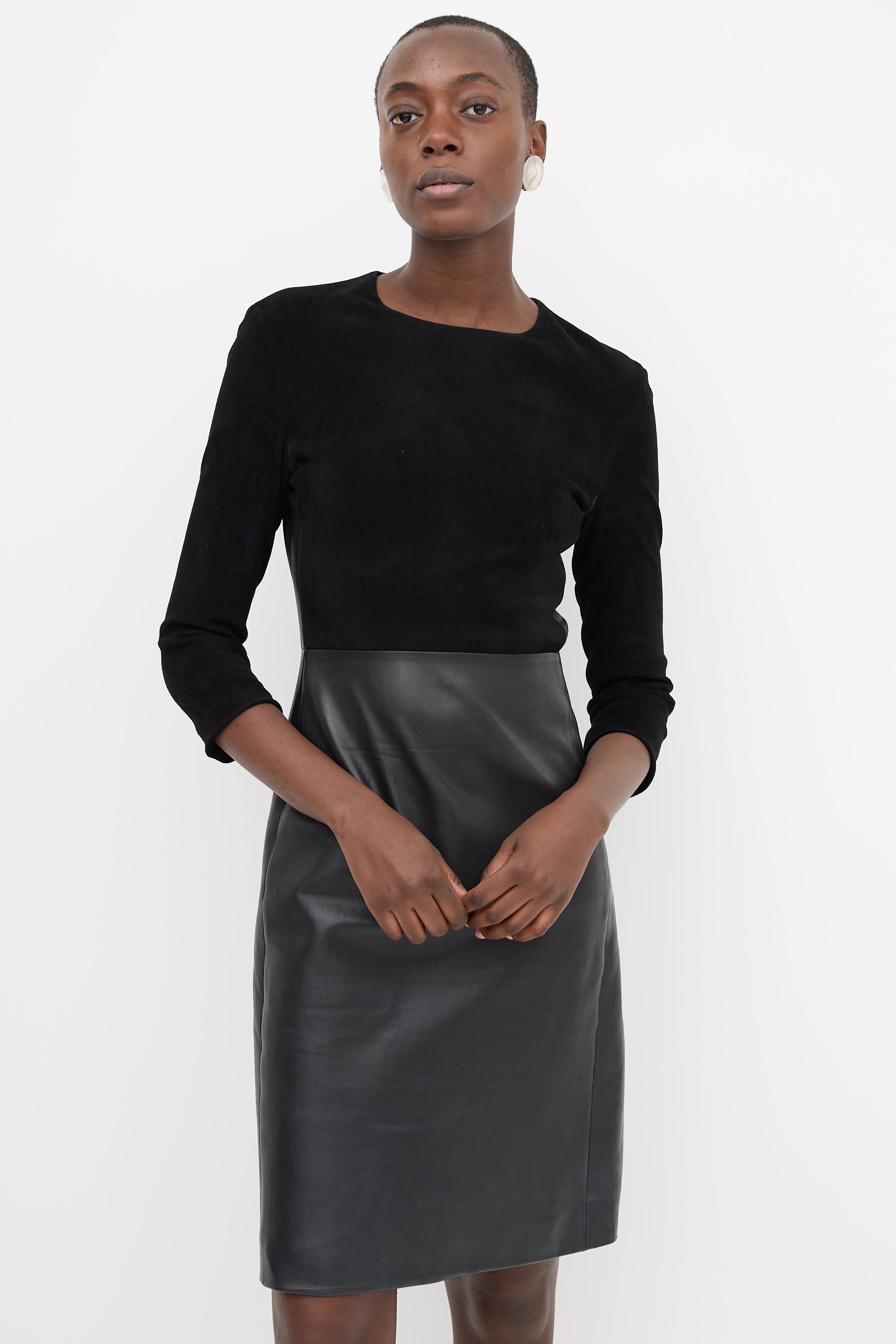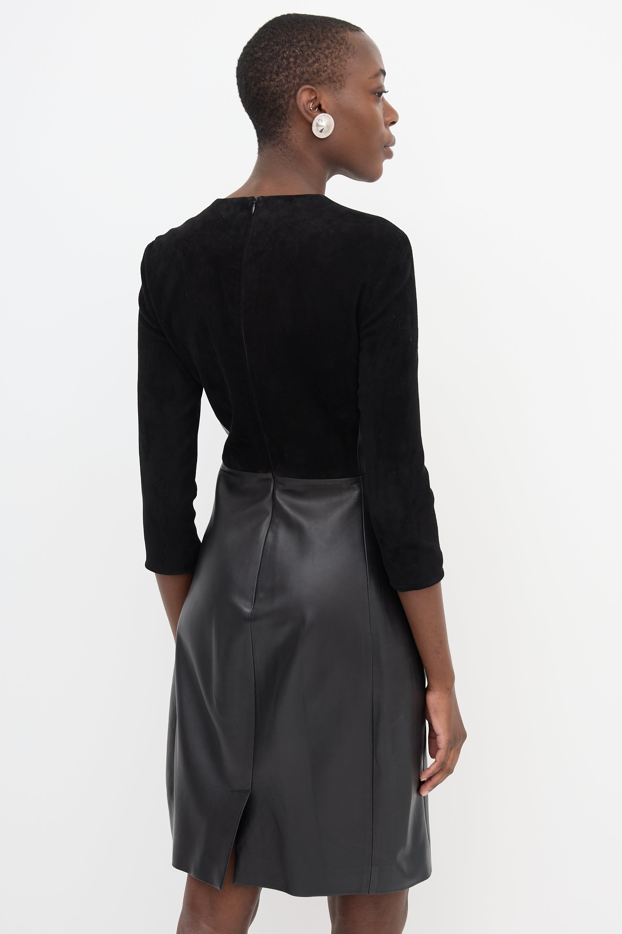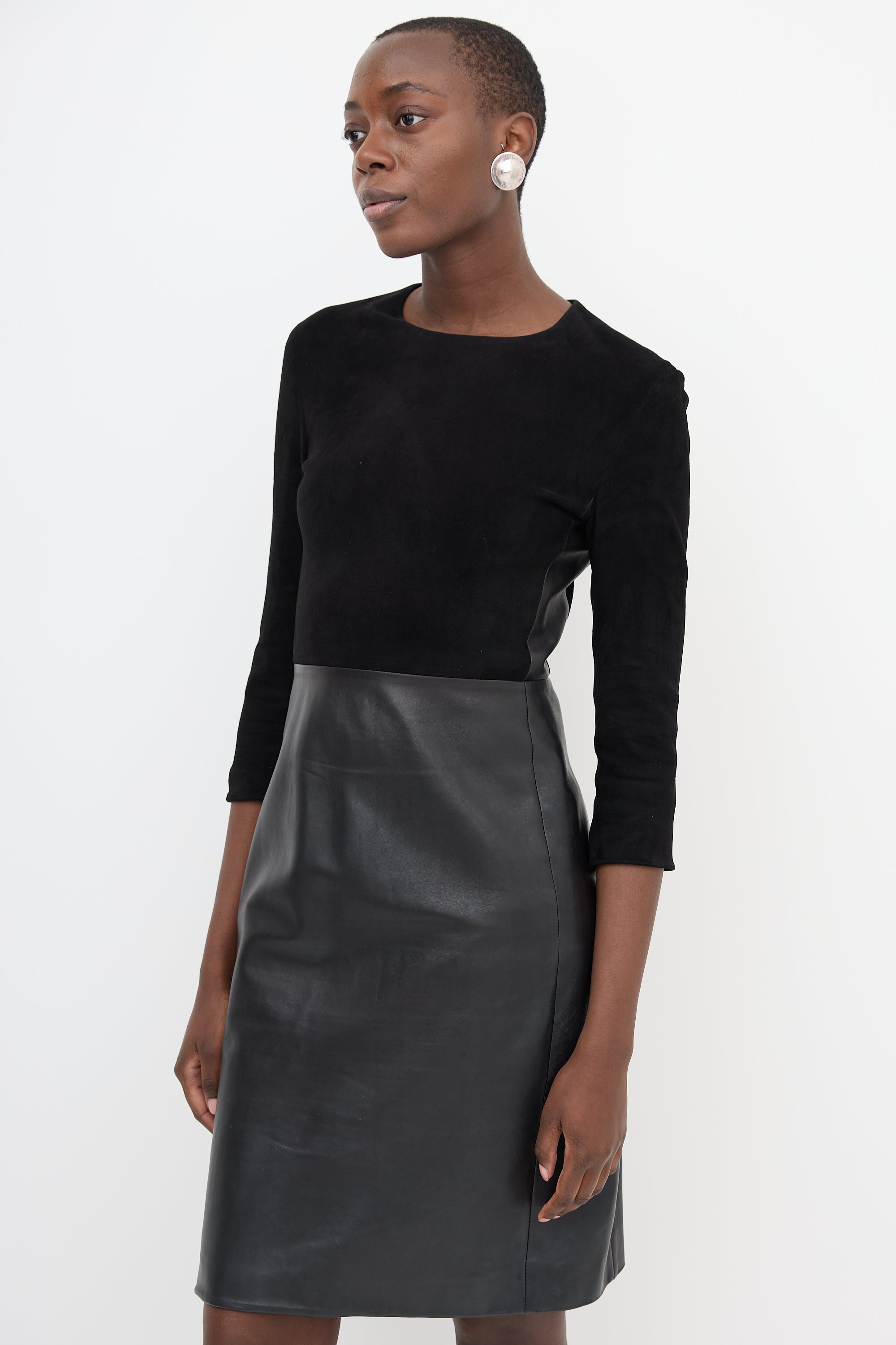 Pre-owned The Row black suede and leather midi dress featuring round neckline, back vent, three quarter sleeves, and concealed back zip. Lined.