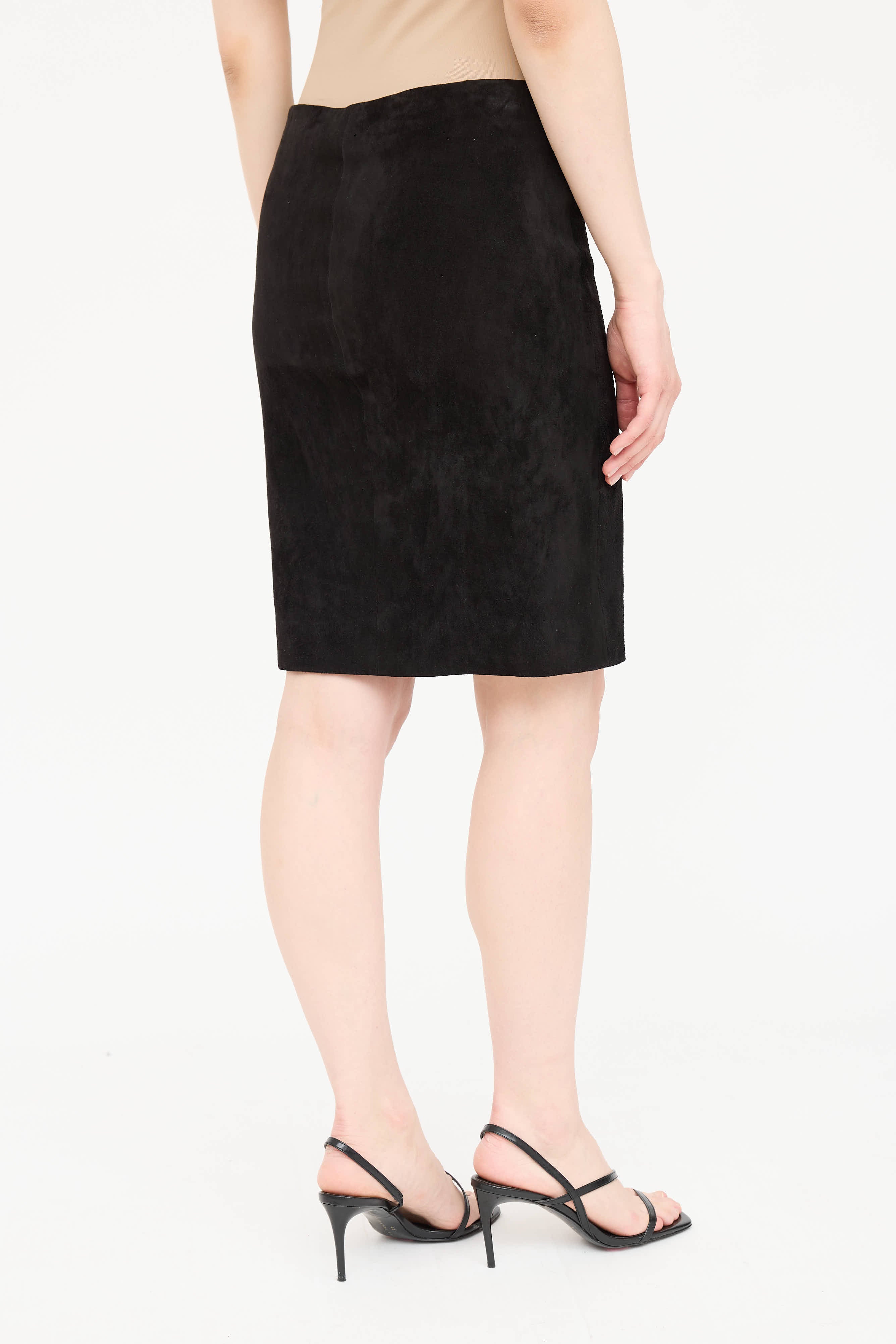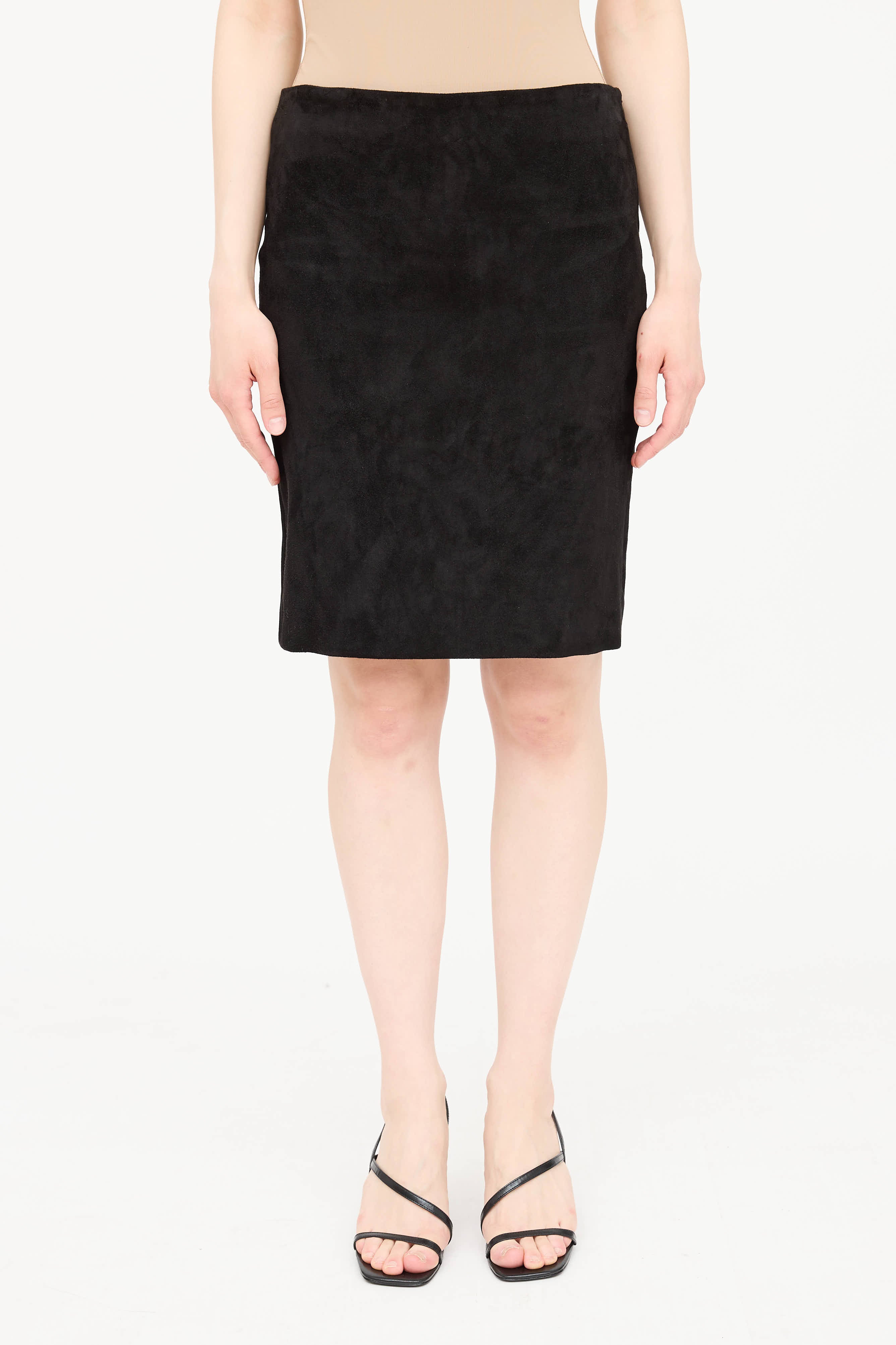 Pre-owned The Row black suede midi skirt featuring an elastic waist, and zip closure at side. Lined.