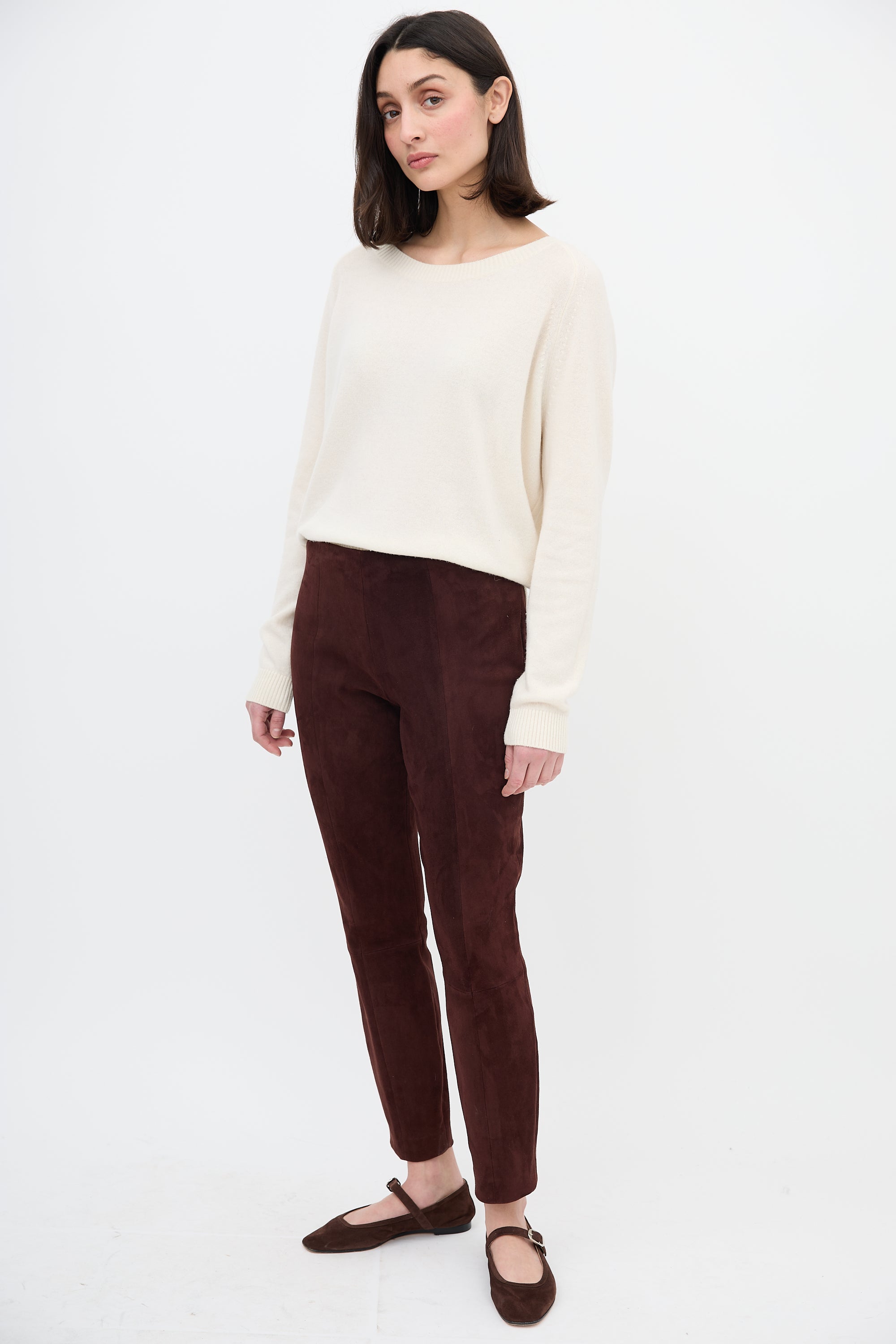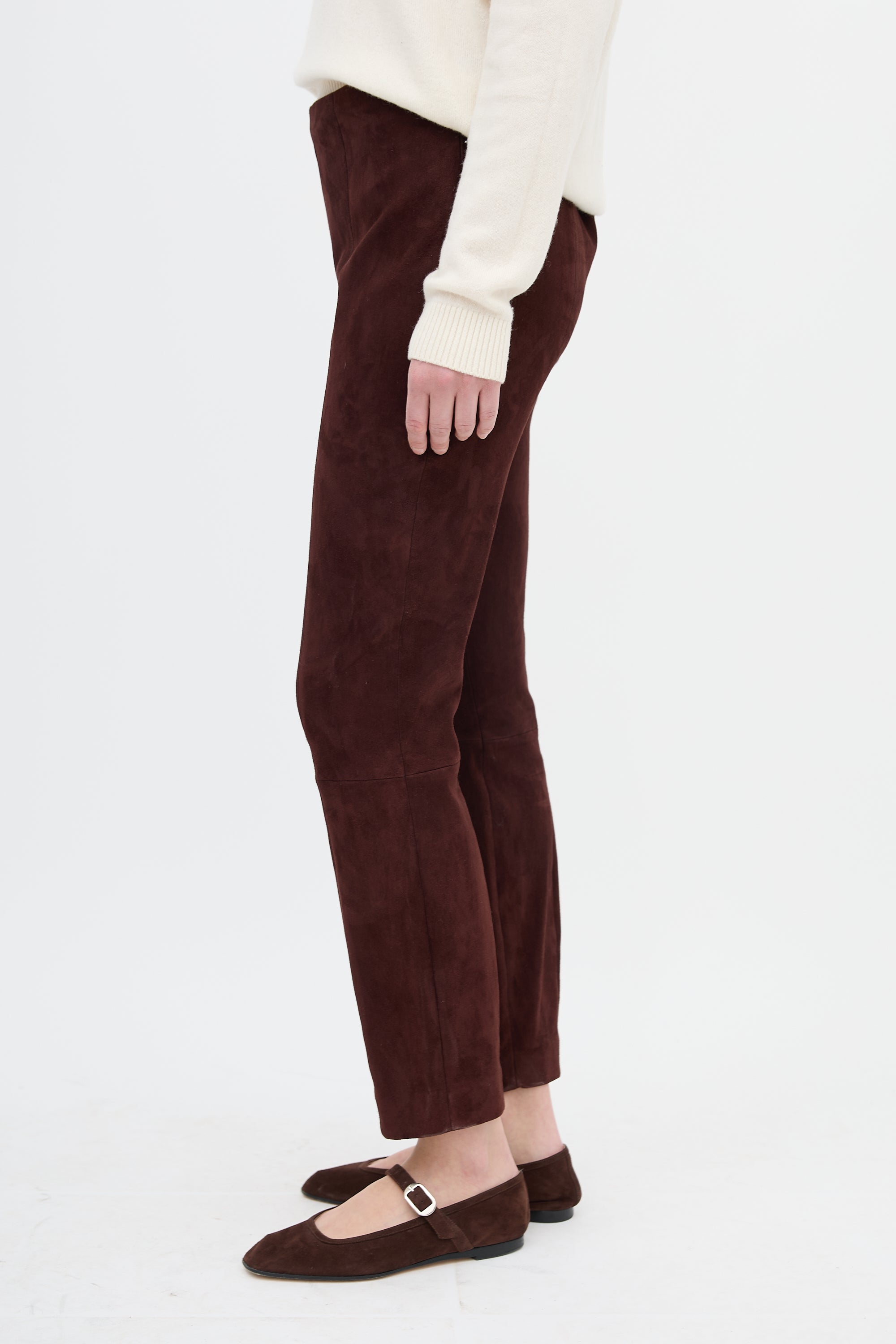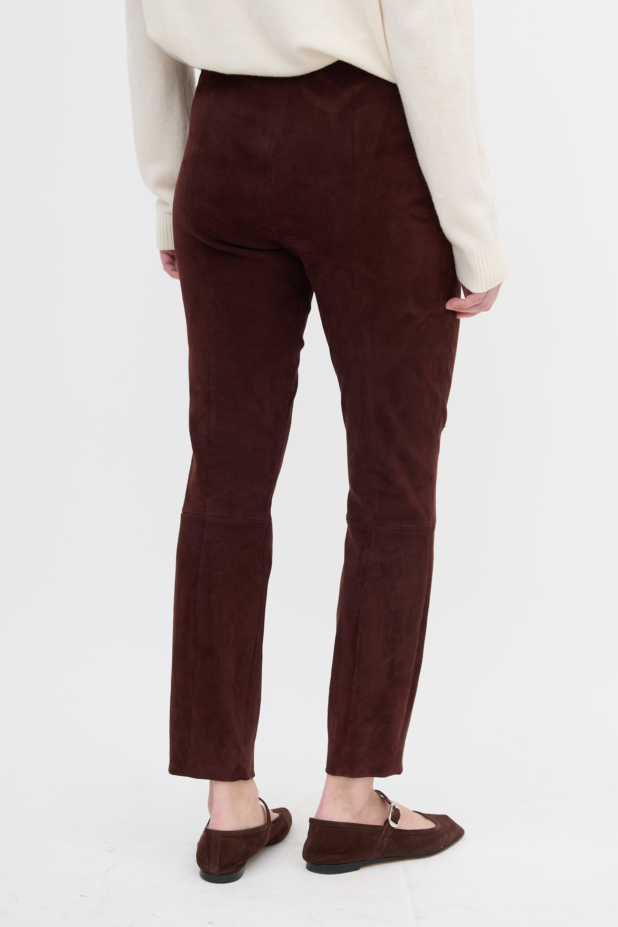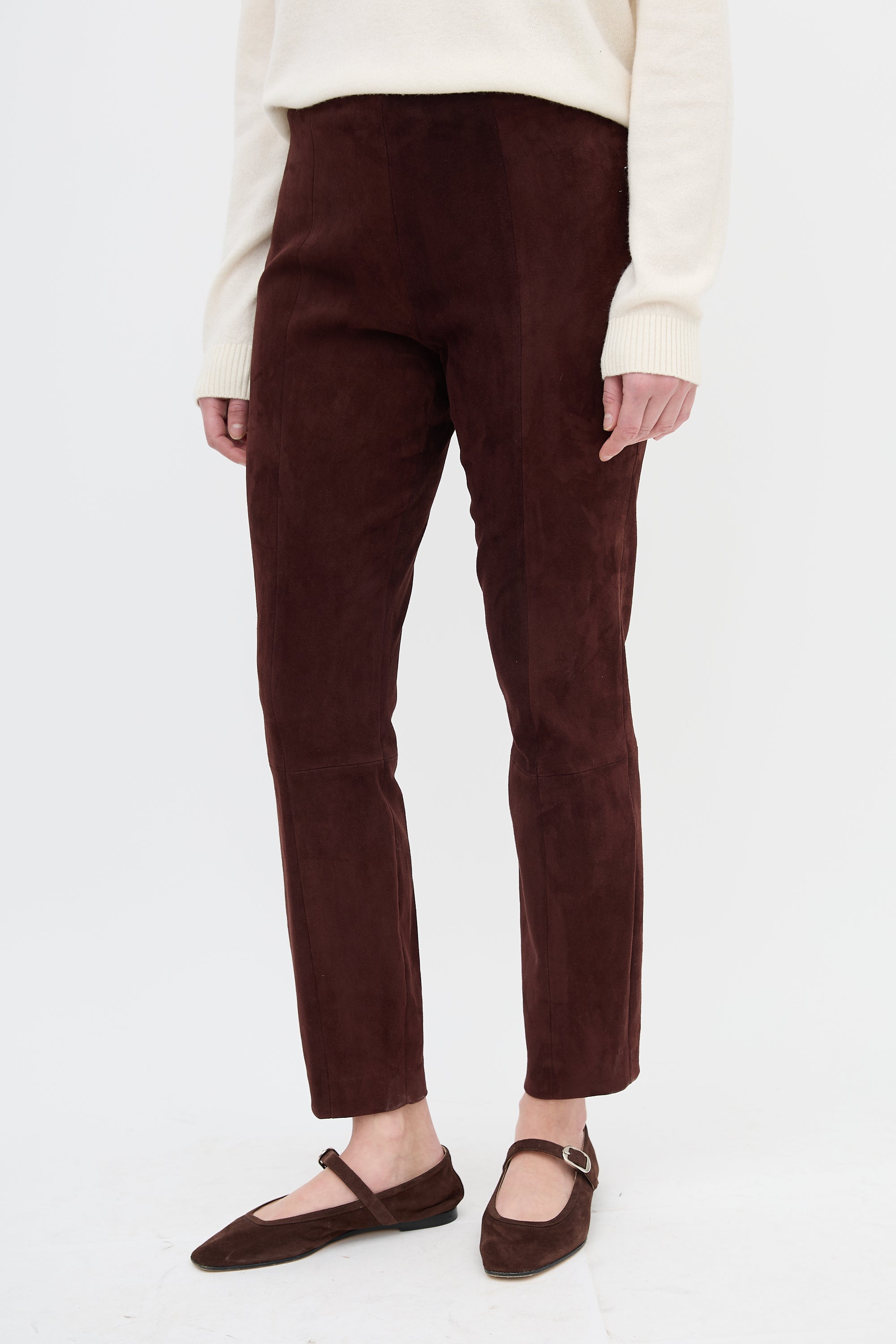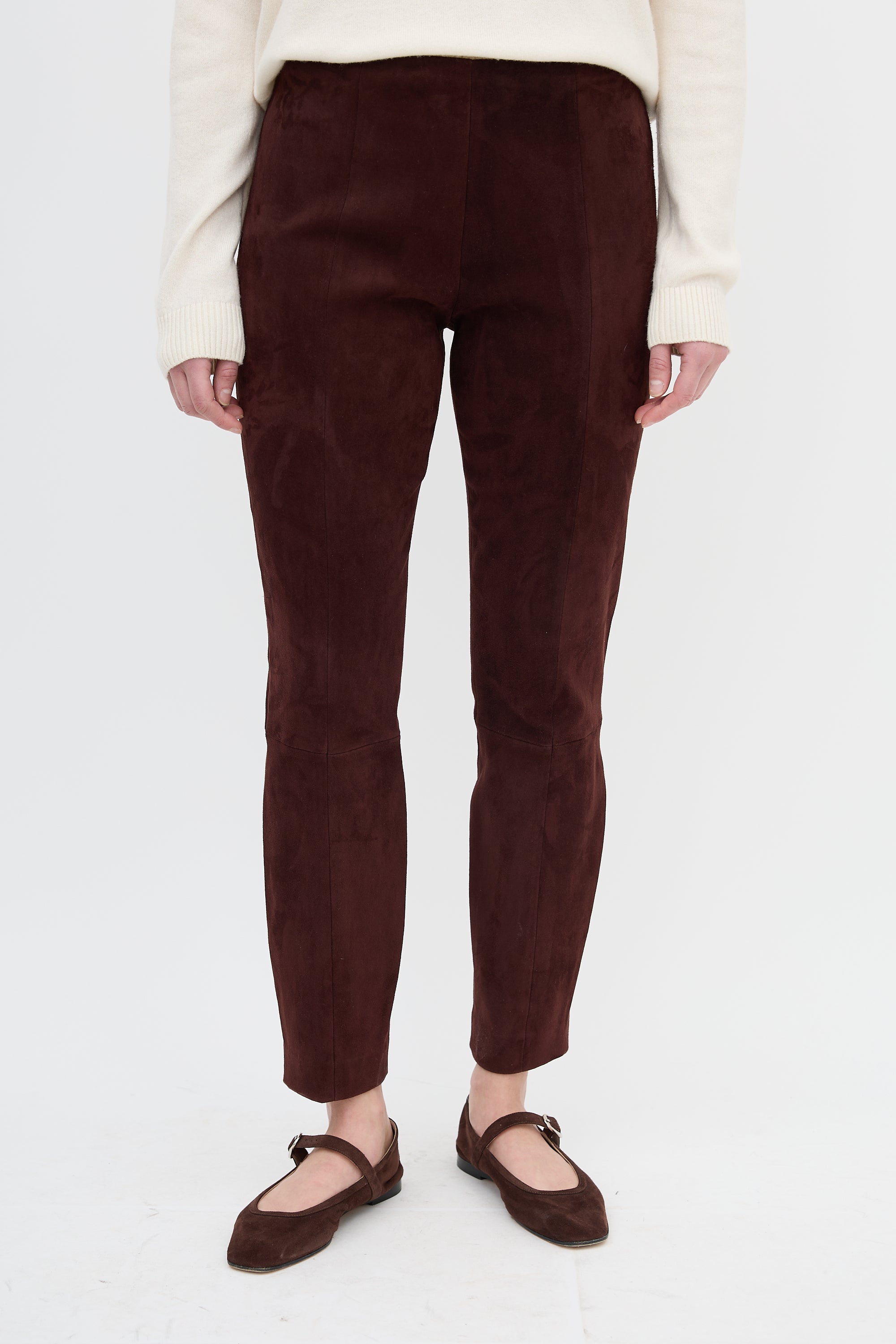 Pre-owned The Row burgundy suede slim leg stretchy pants featuring an elasticized waist and a side zip closure.
