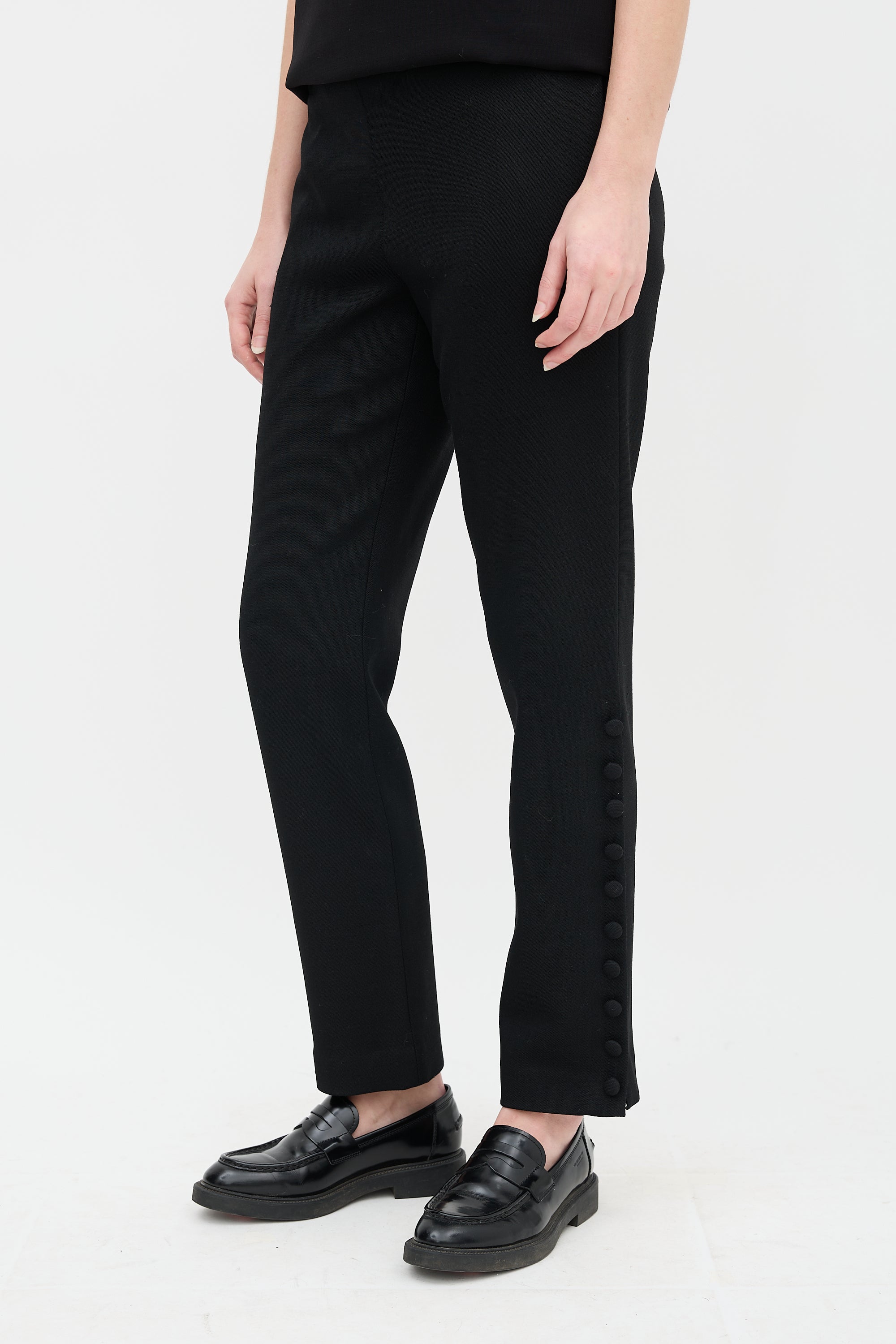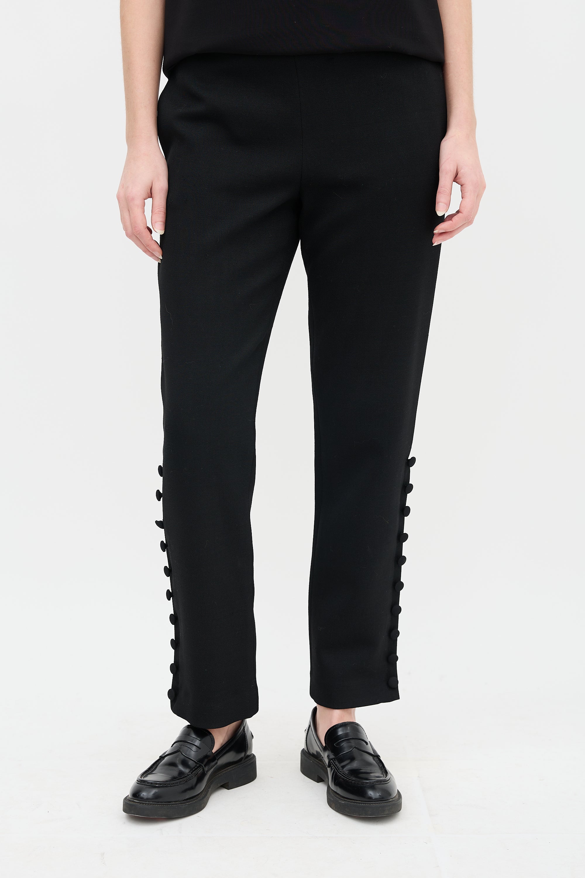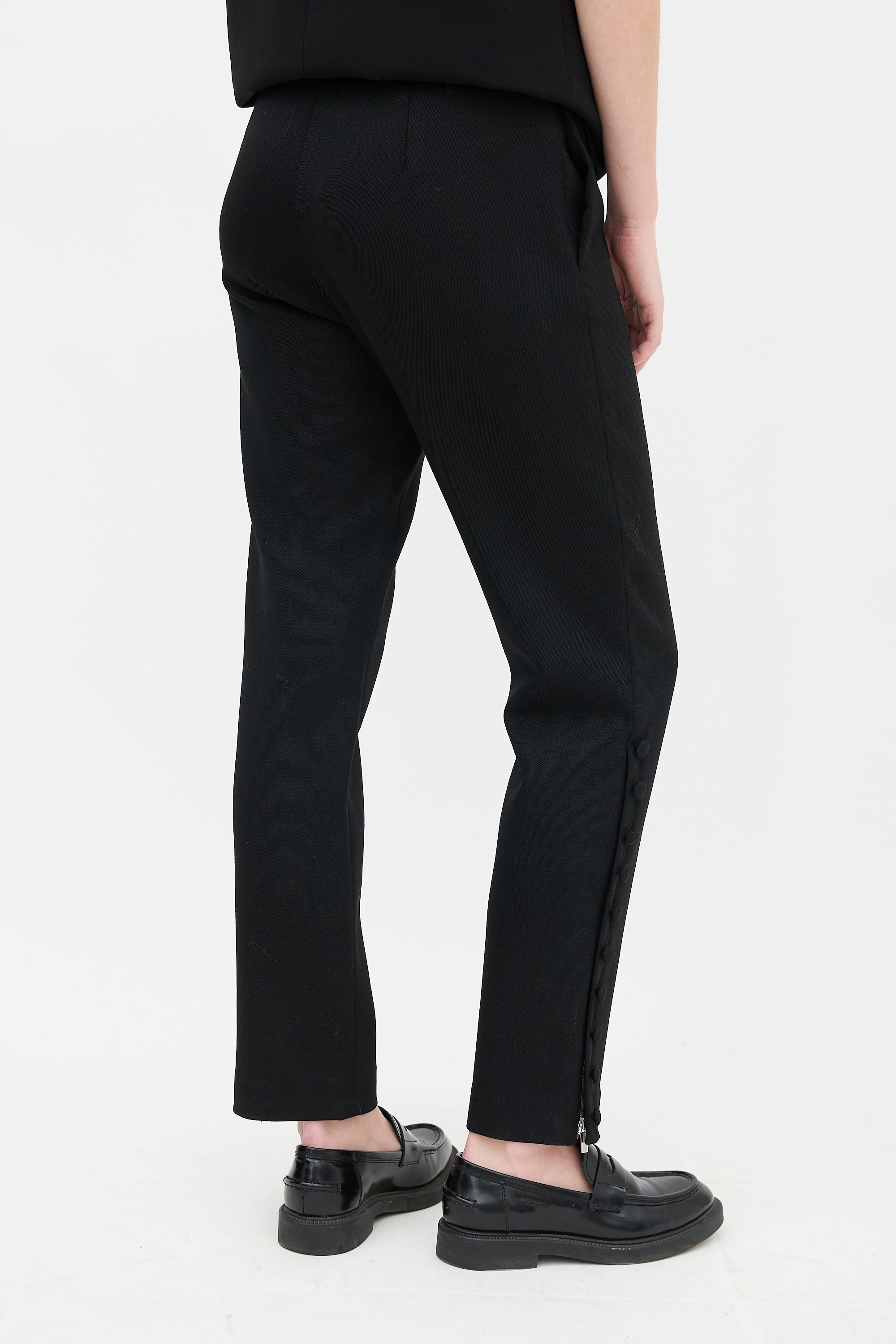 Pre-owned The Row black wool pants featuring a zip side closure, two inseam pockets at hip, and concealed zip cuffs with decorative buttons.