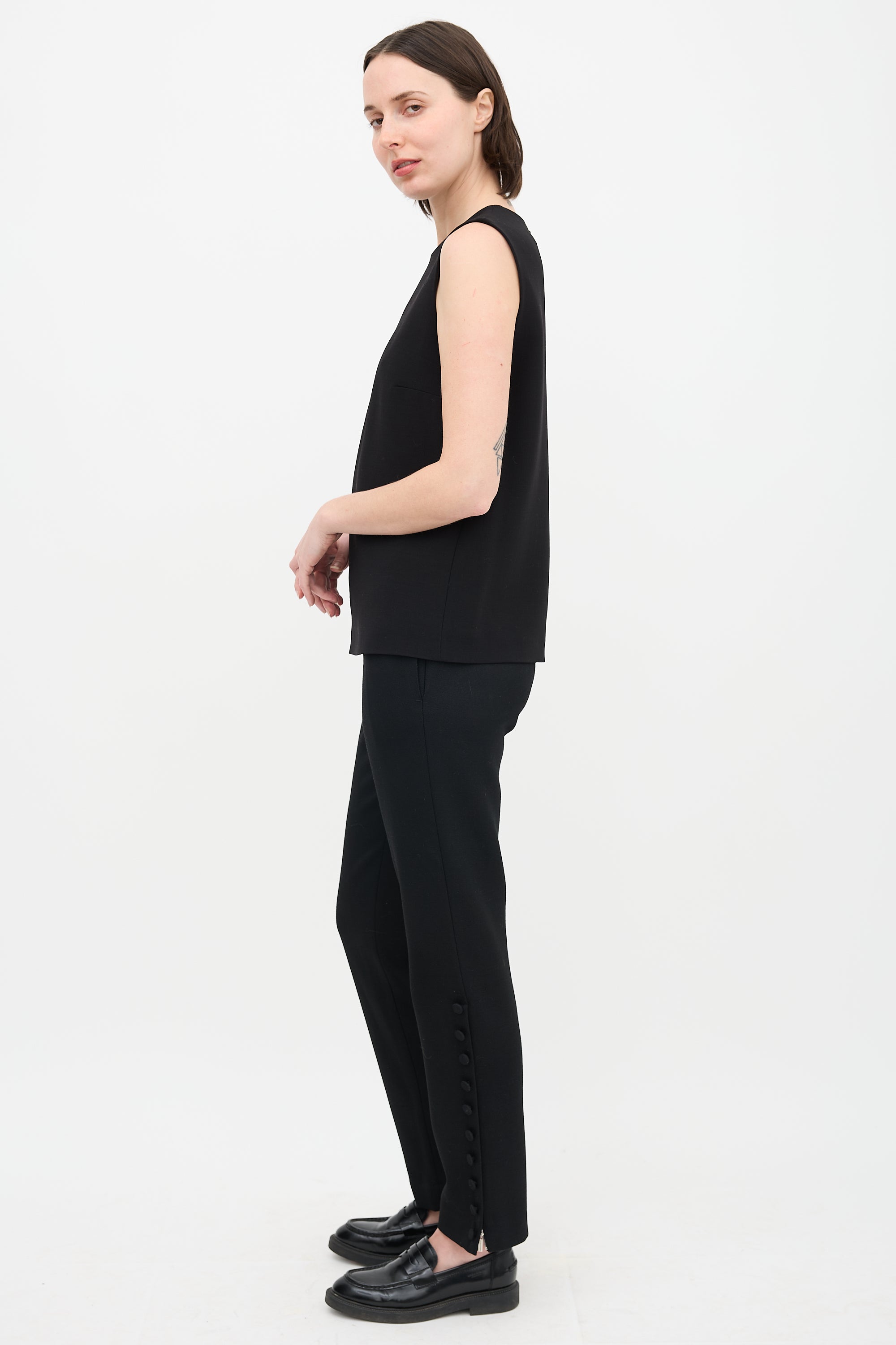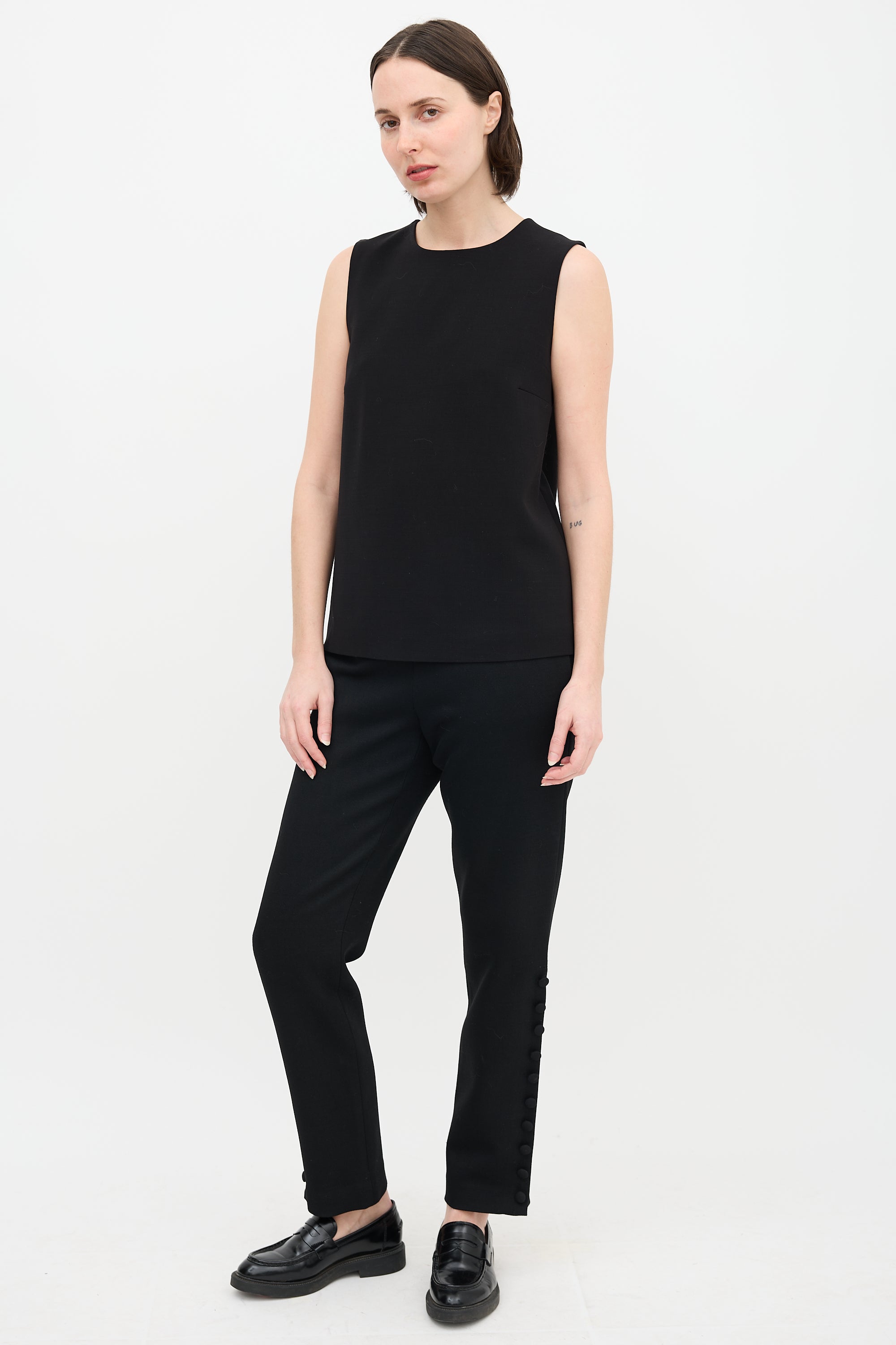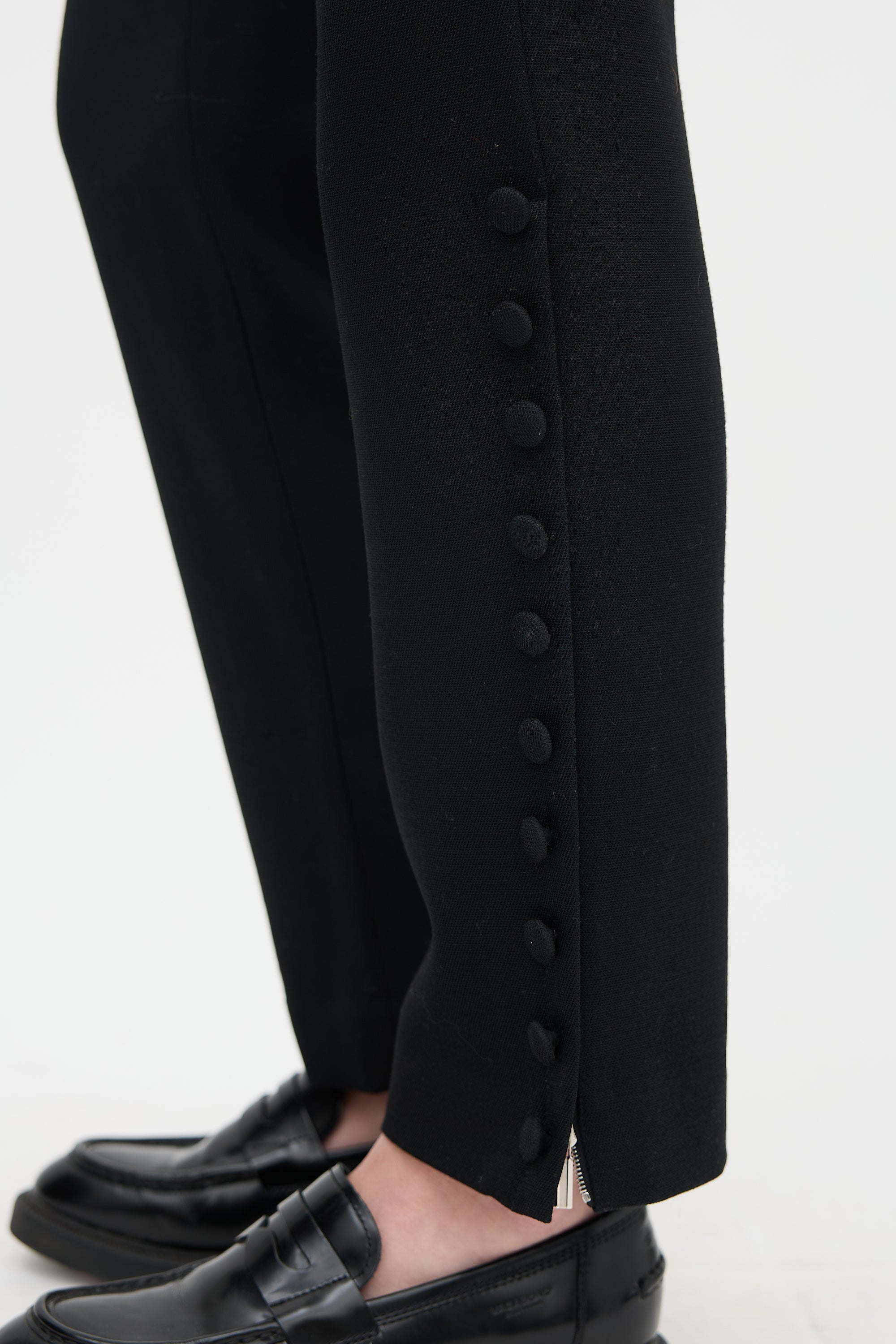 Pre-owned The Row black wool pants featuring a zip side closure, two inseam pockets at hip, and concealed zip cuffs with decorative buttons.