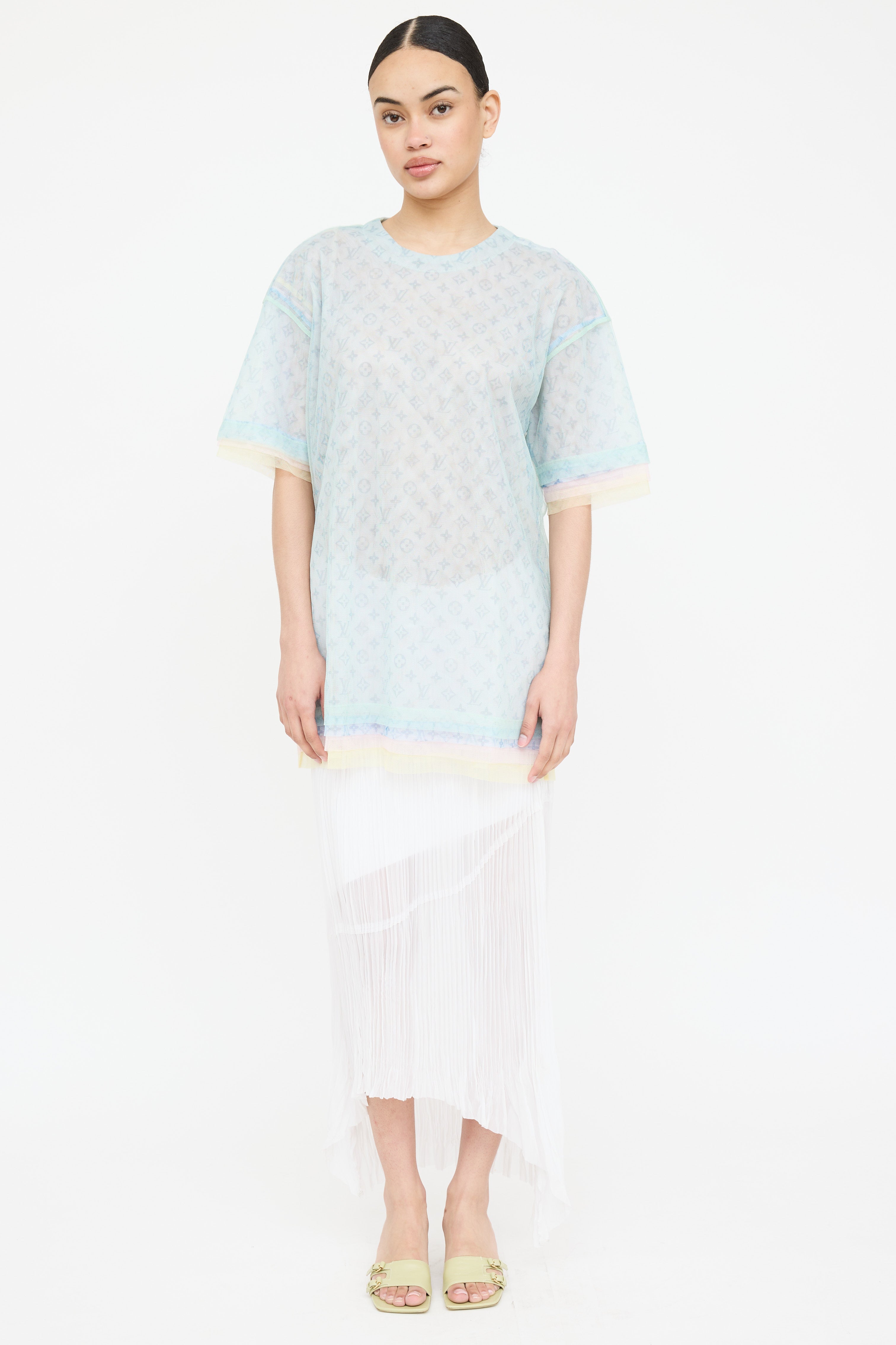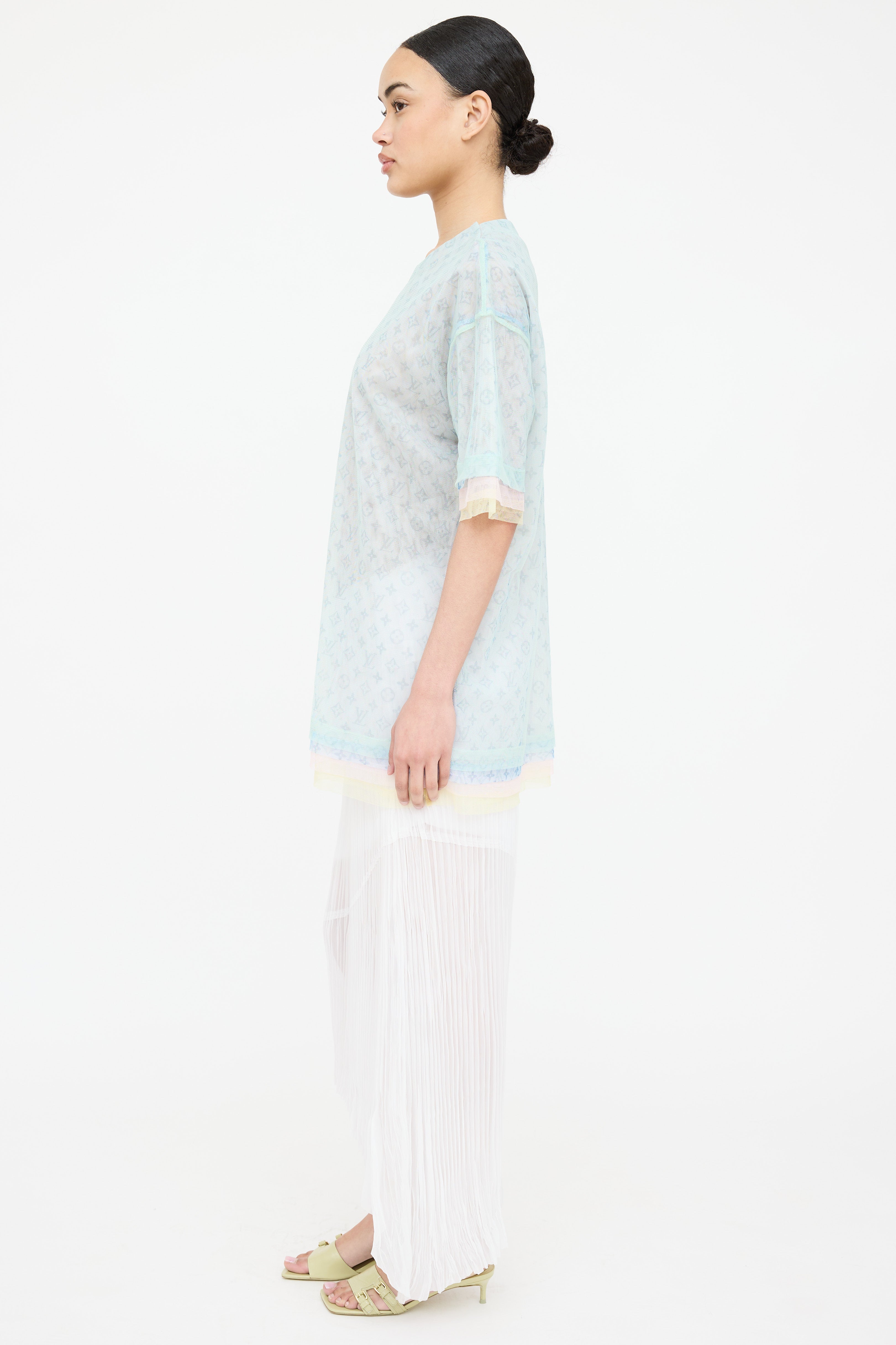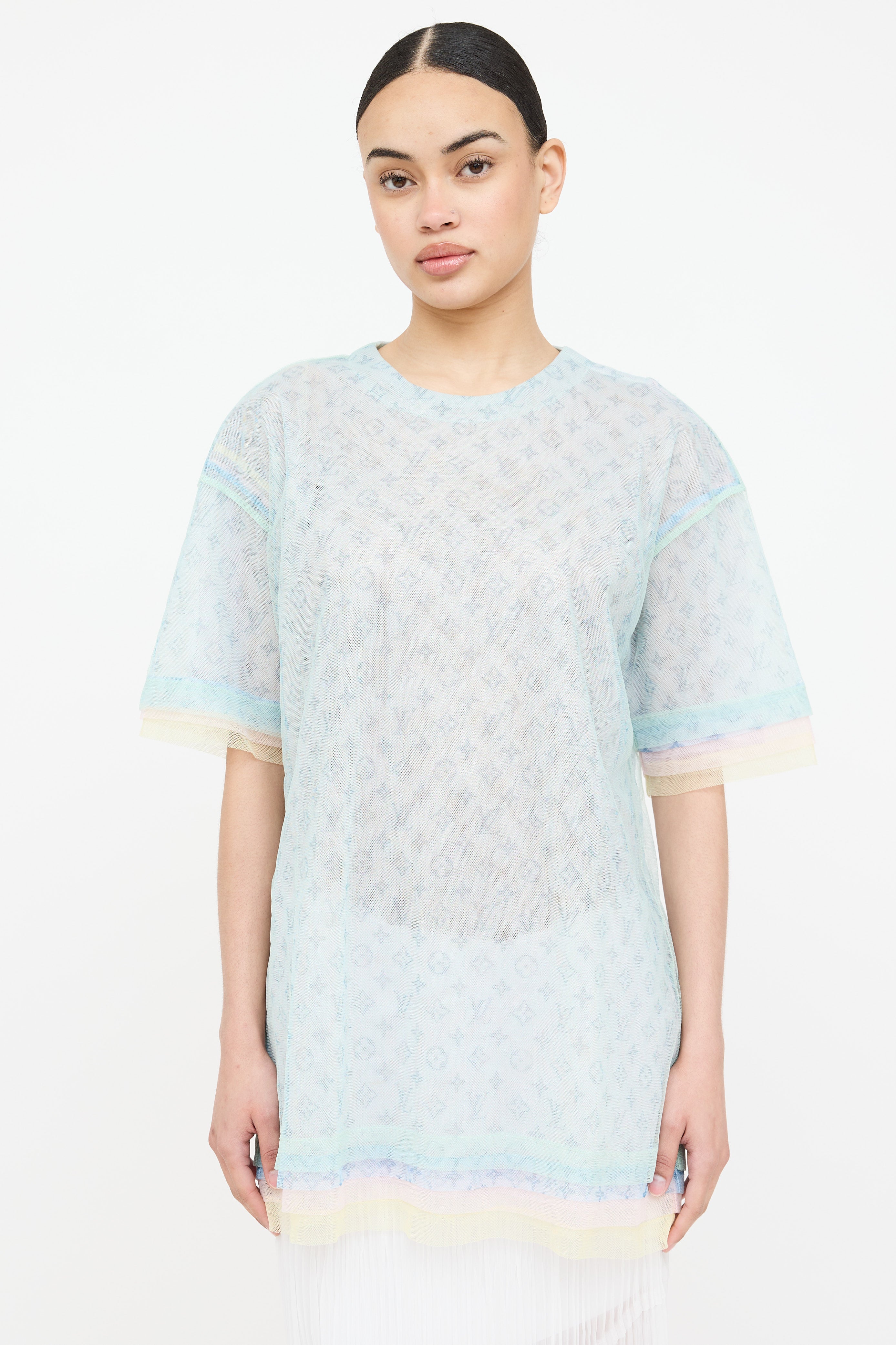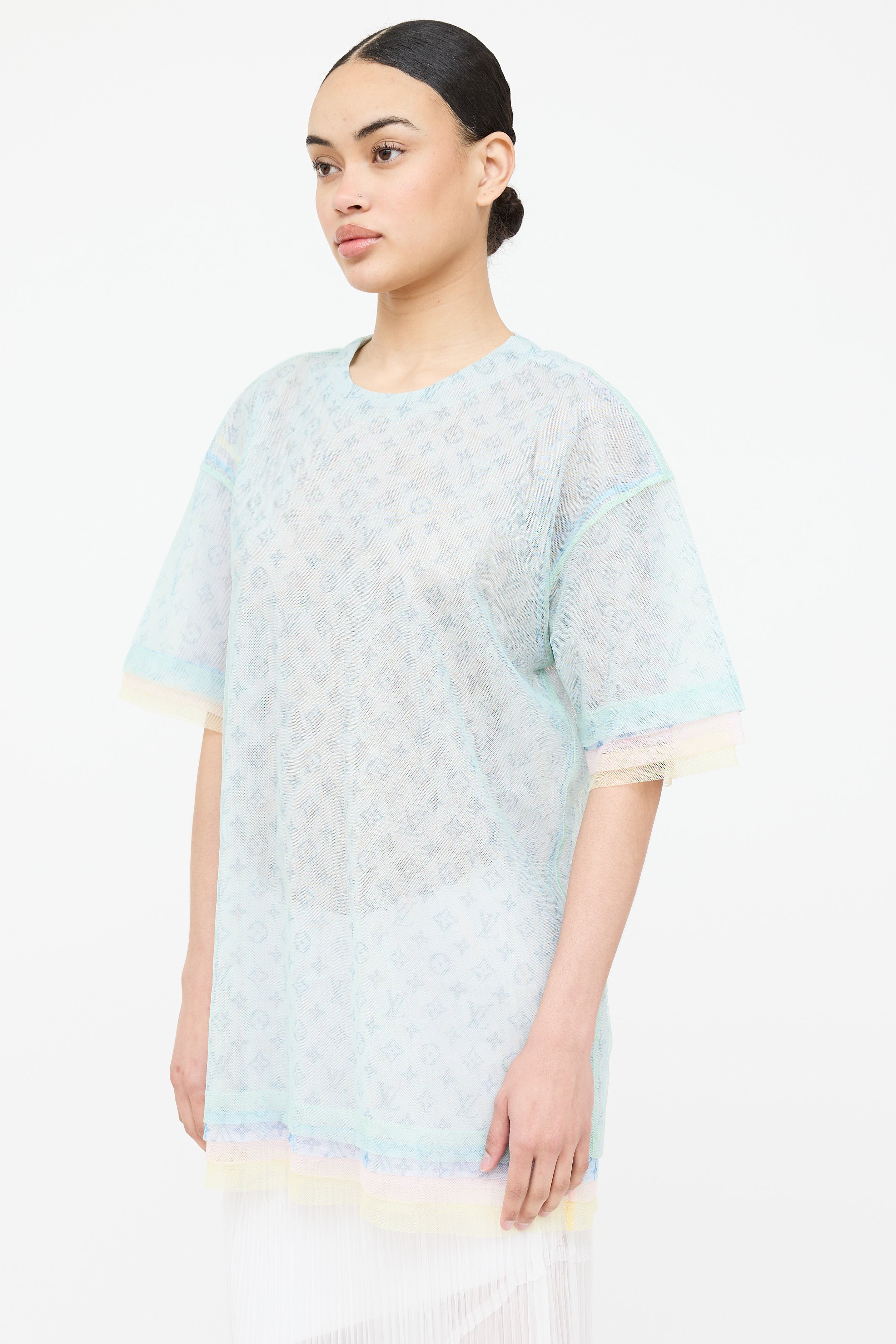 Pre-owned Louis Vuitton blue mesh top featuring a tonal monogram throughout, round neckline, velcro detail at shoulder, layered detailing, and short sleeves. From the Spring/Summer 2020 collection by Virgil Abloh.