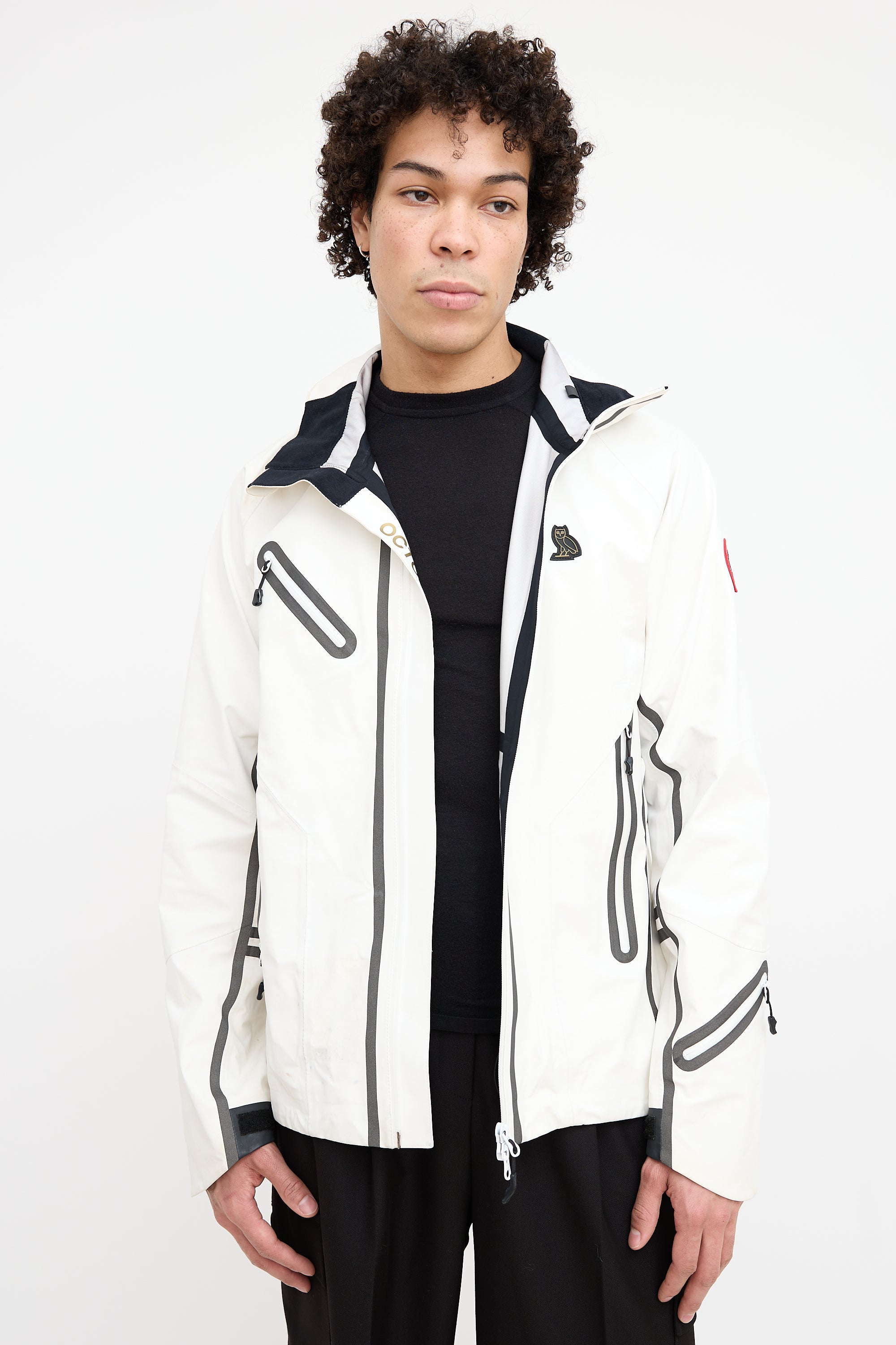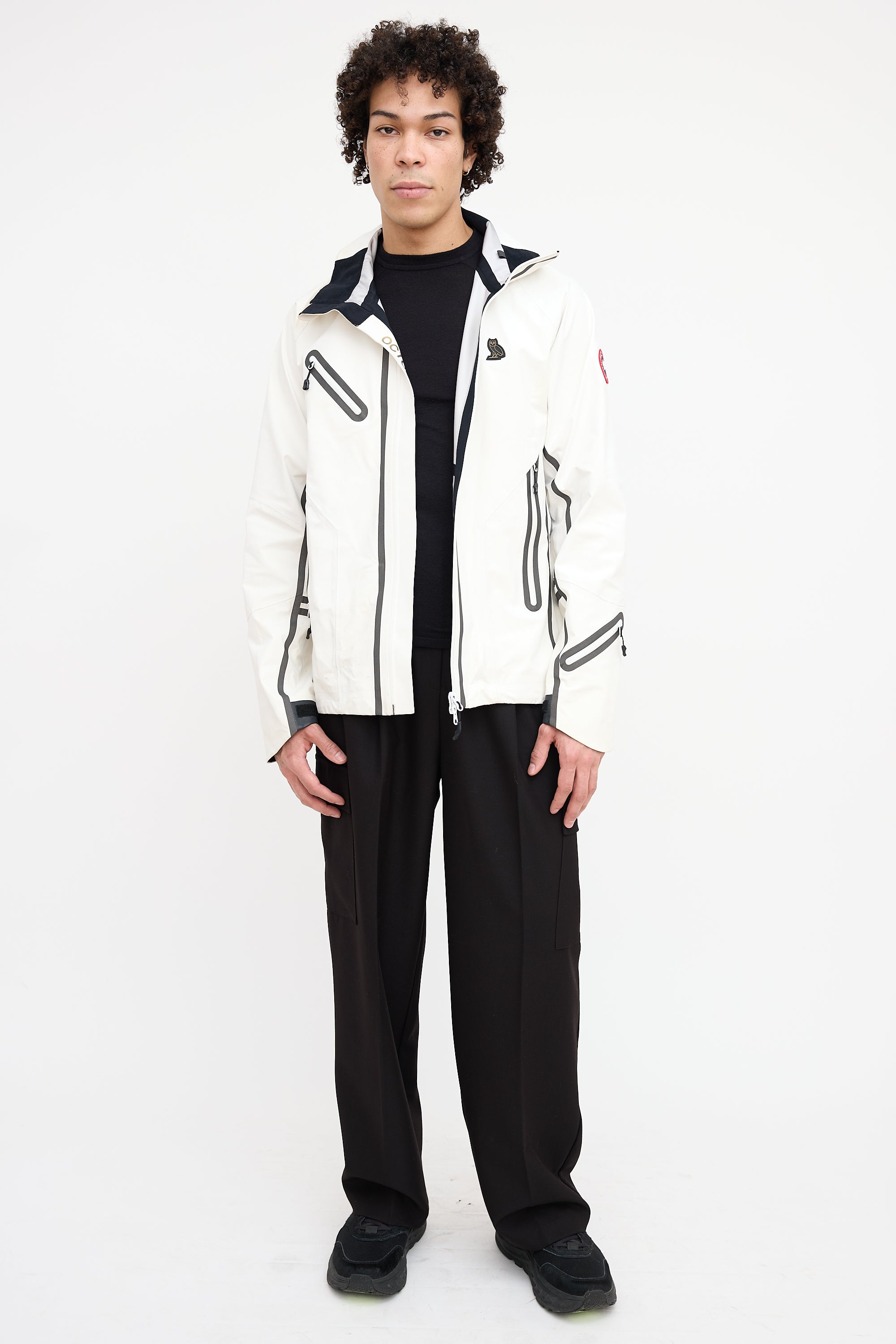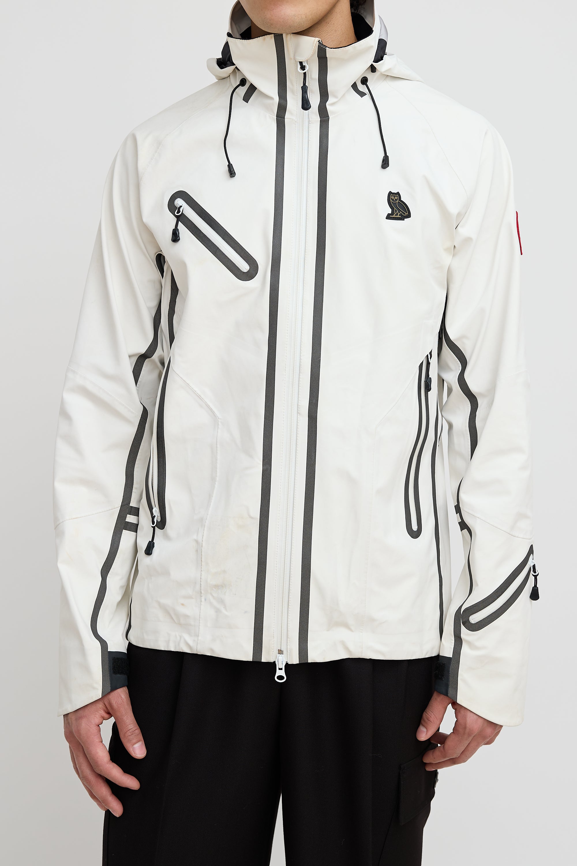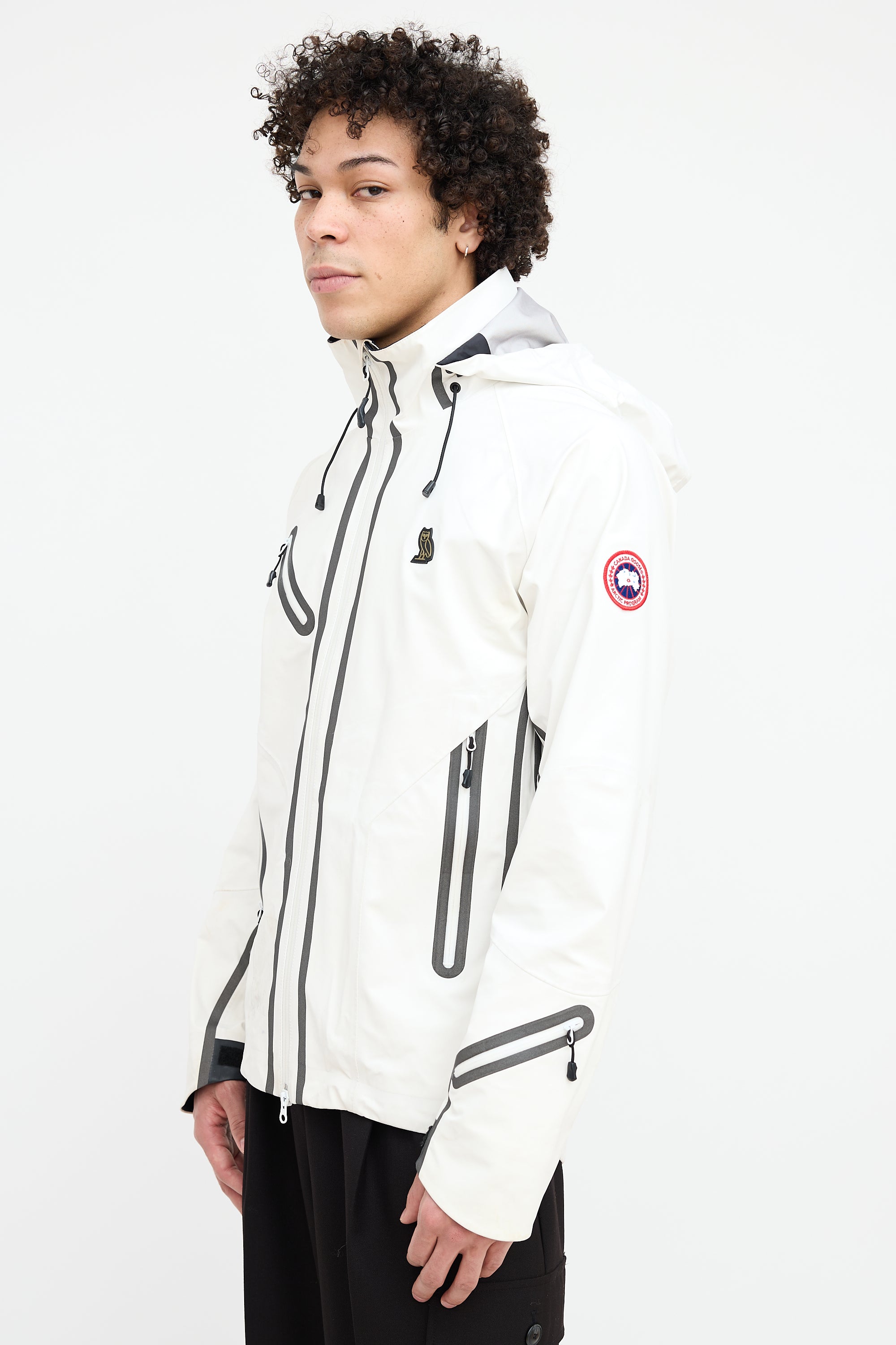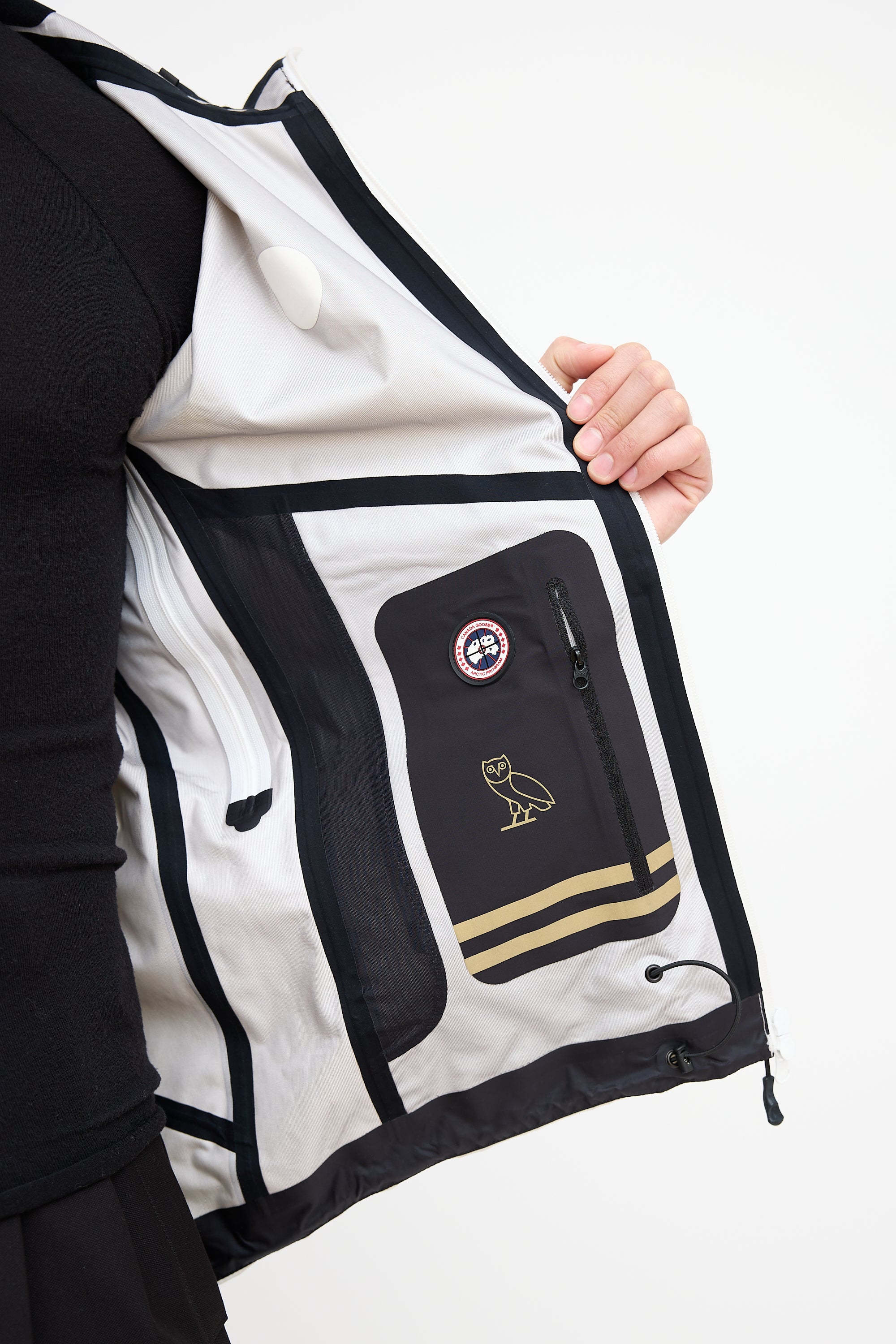 Pre-owned Canada Goose x OVO white Timber Shell jacket featuring a funnel collar, adjustable elasticized hood, zip pocket at right chest, logo embroidered at left chest, logo patch at left shoulder, contrast lining, two zip pockets at hip, zip vents at underarms, inner zip pocket, and two-way zip closure at front.