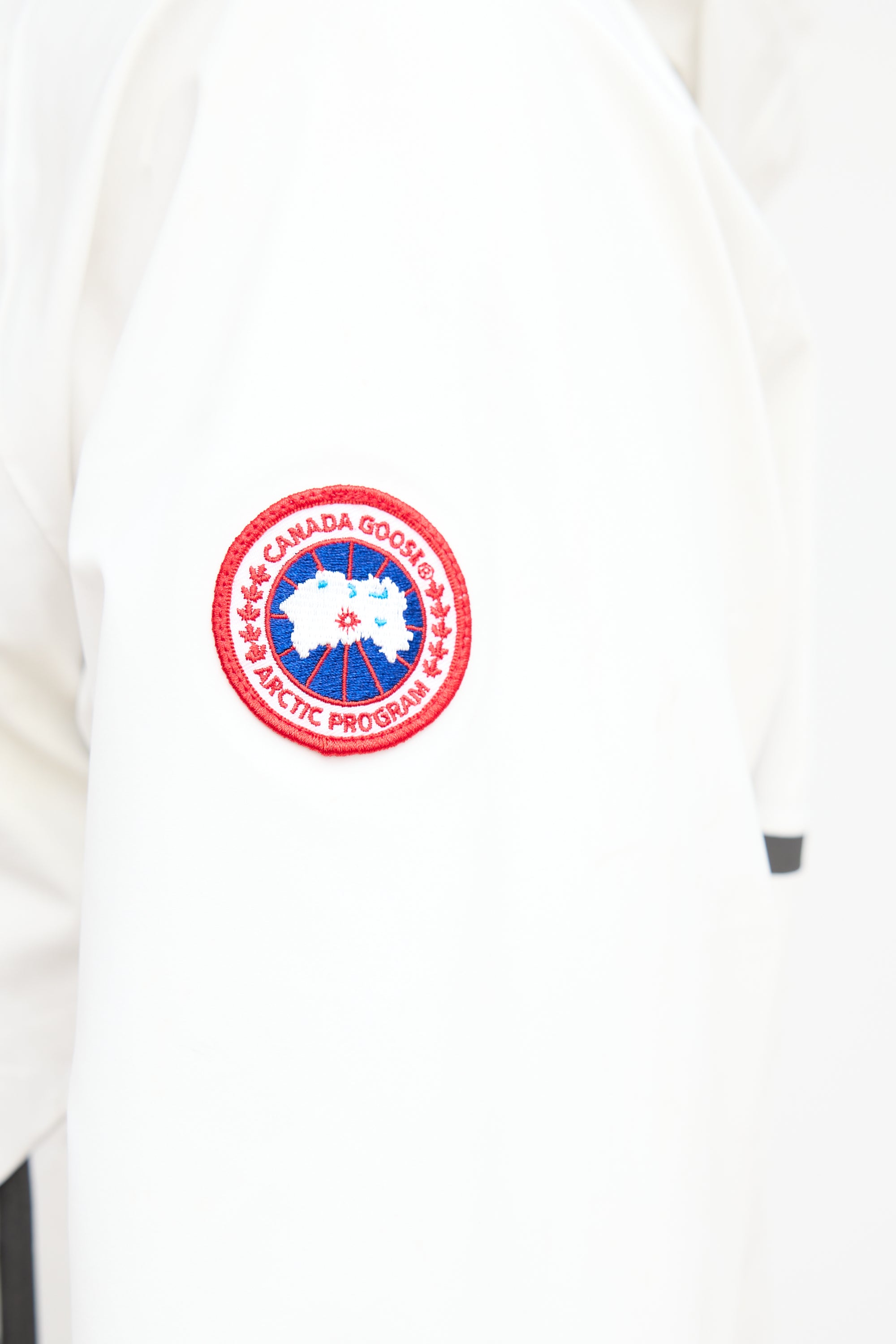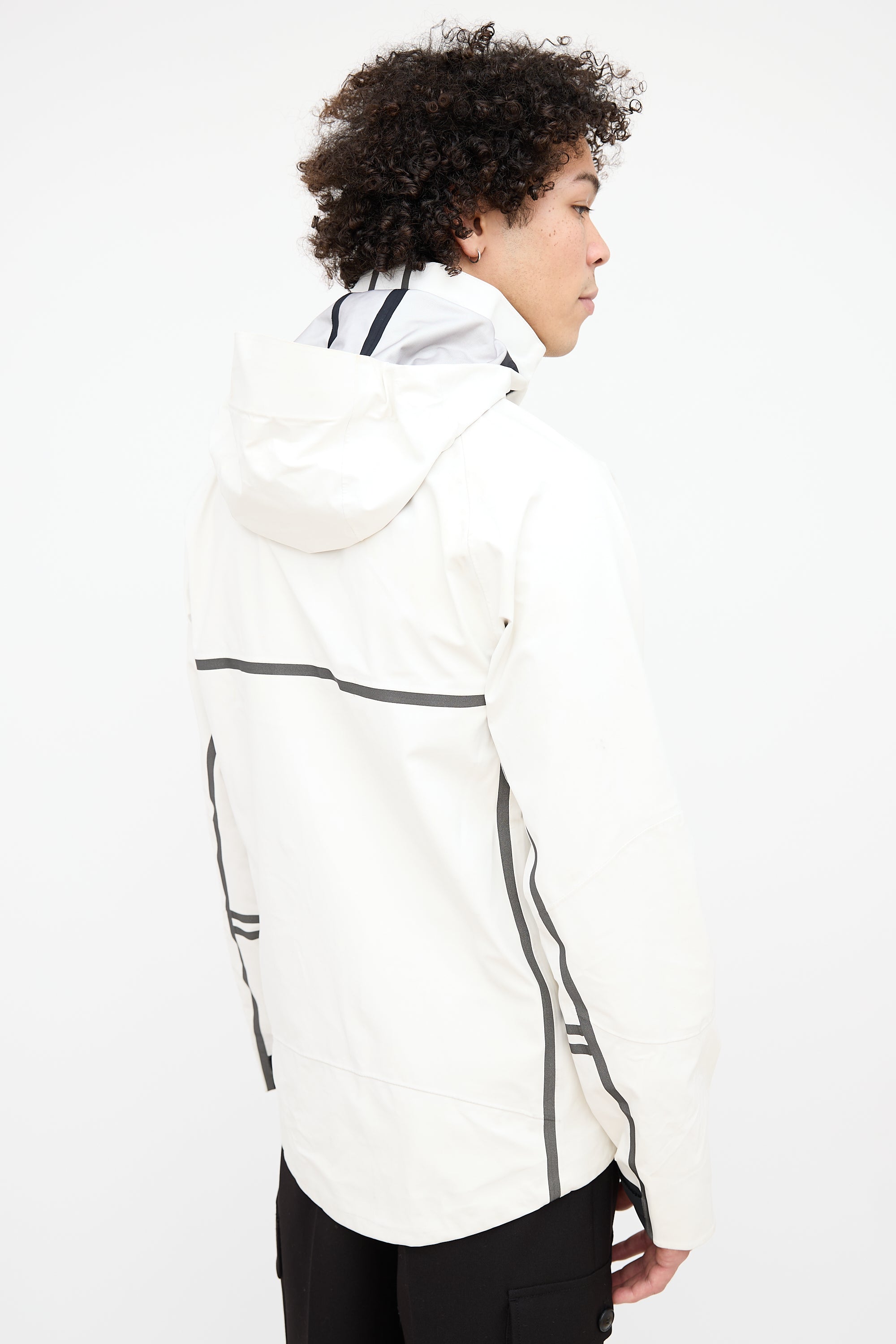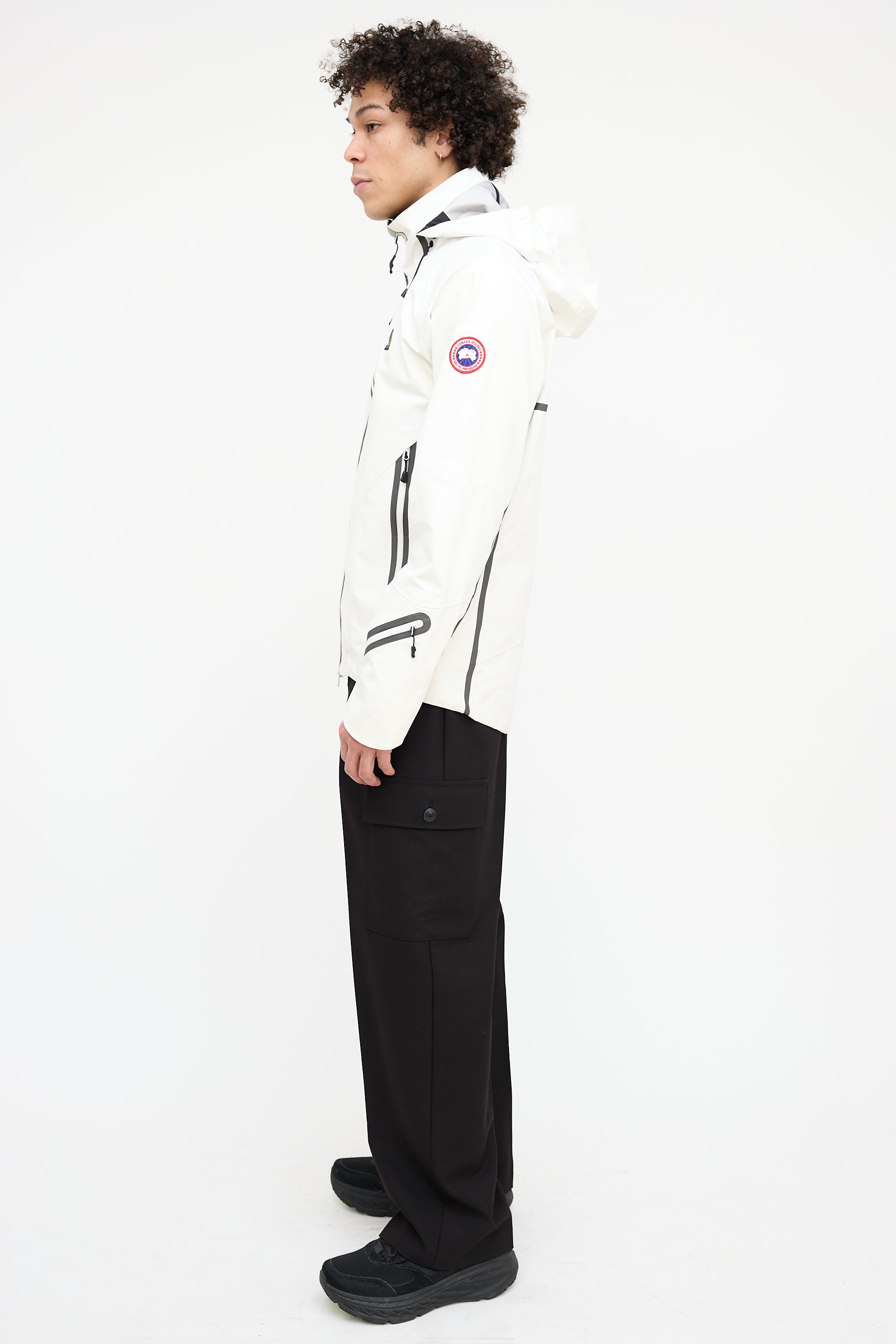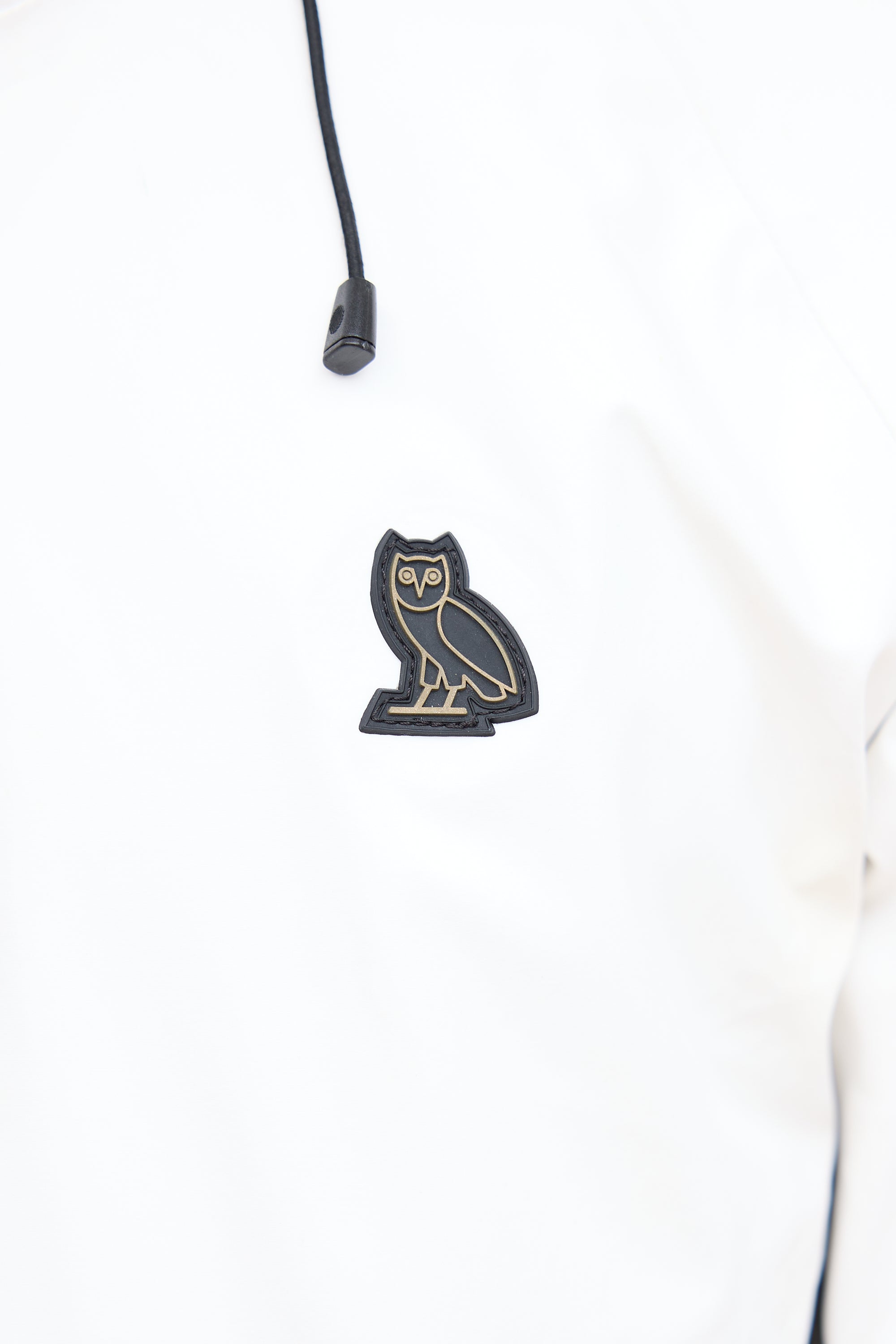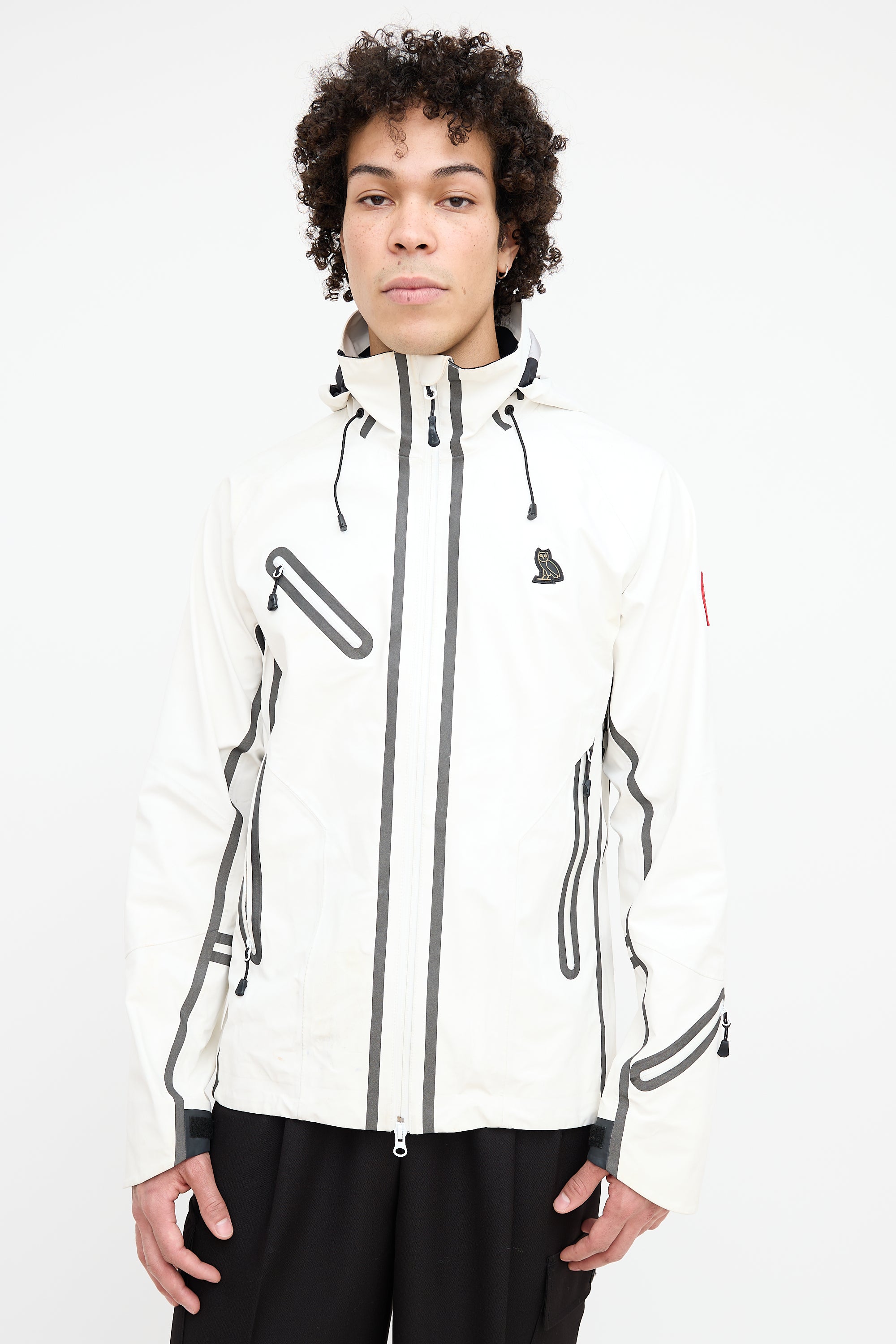 Pre-owned Canada Goose x OVO white Timber Shell jacket featuring a funnel collar, adjustable elasticized hood, zip pocket at right chest, logo embroidered at left chest, logo patch at left shoulder, contrast lining, two zip pockets at hip, zip vents at underarms, inner zip pocket, and two-way zip closure at front.