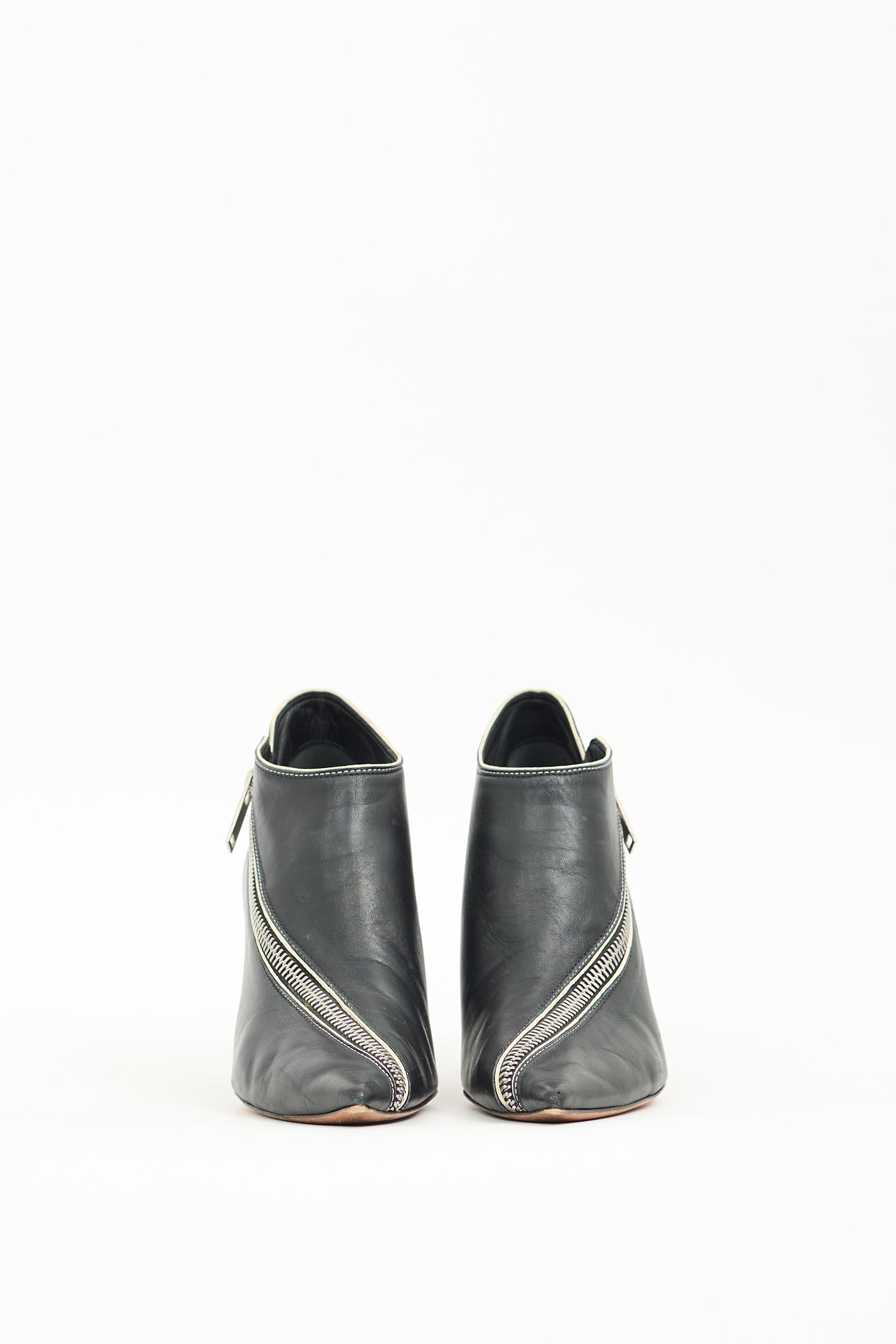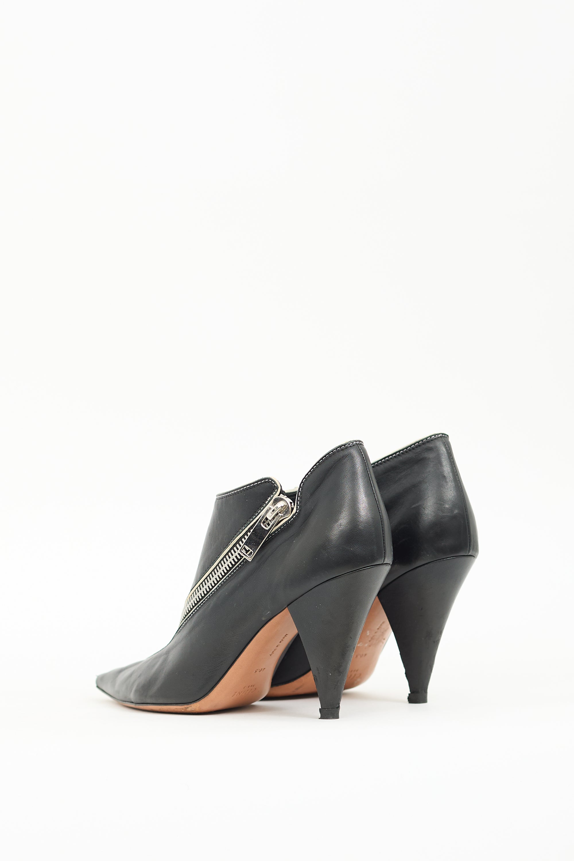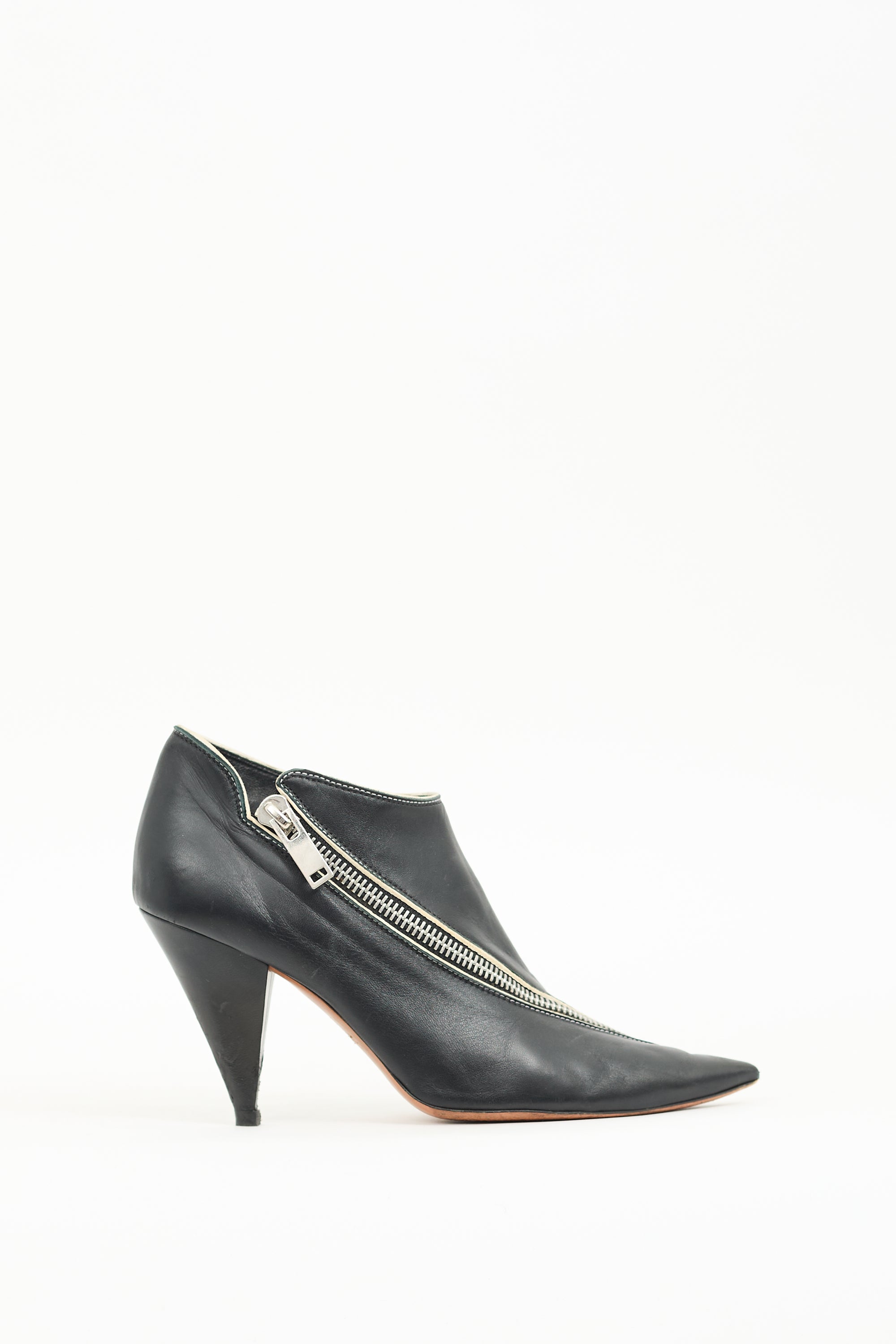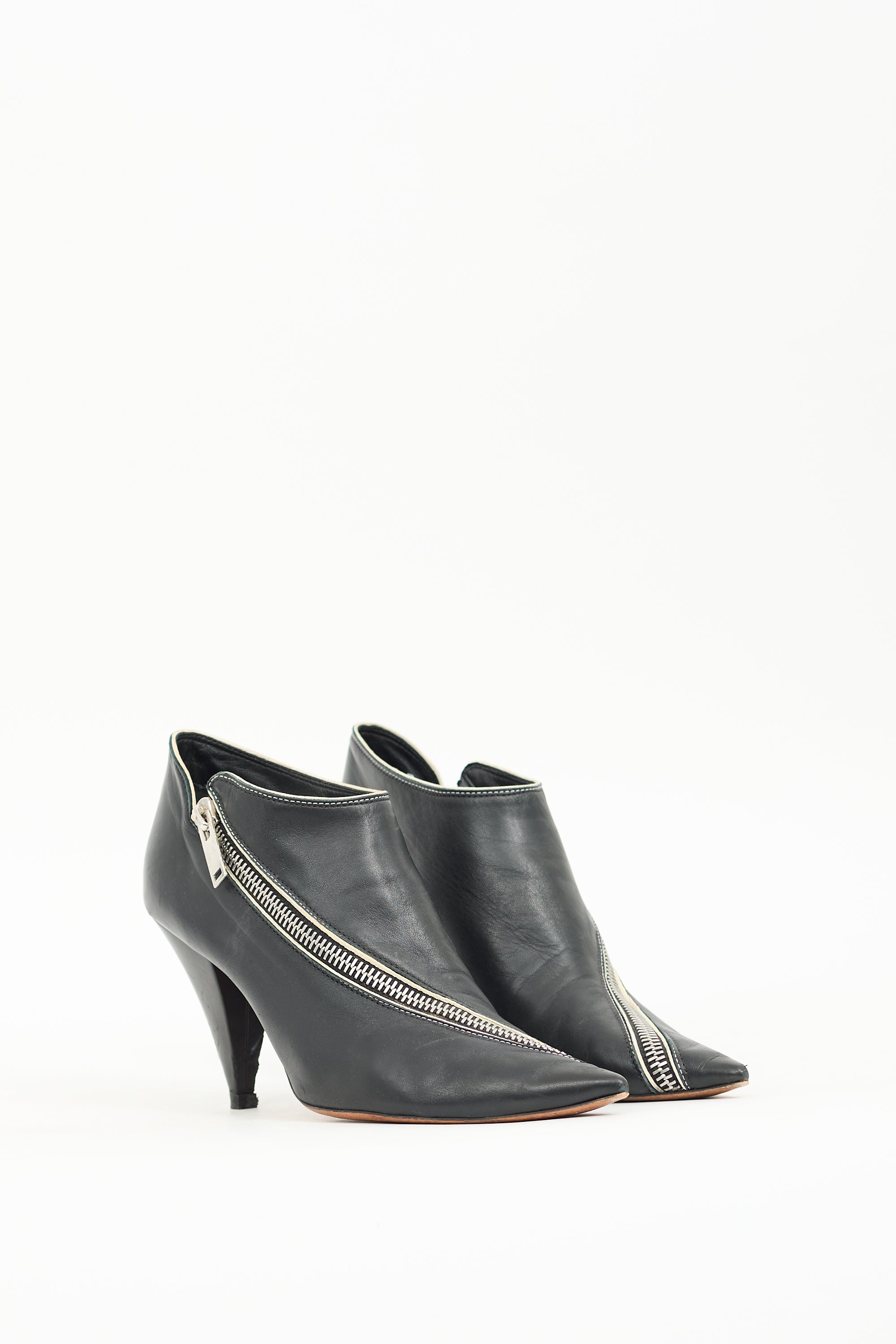 Pre-owned Celine black leather asymmetrical zip boots featuring pointed toe, silver tone zip closure across toe and upper, low cut ankle shaft, and covered cone heel.