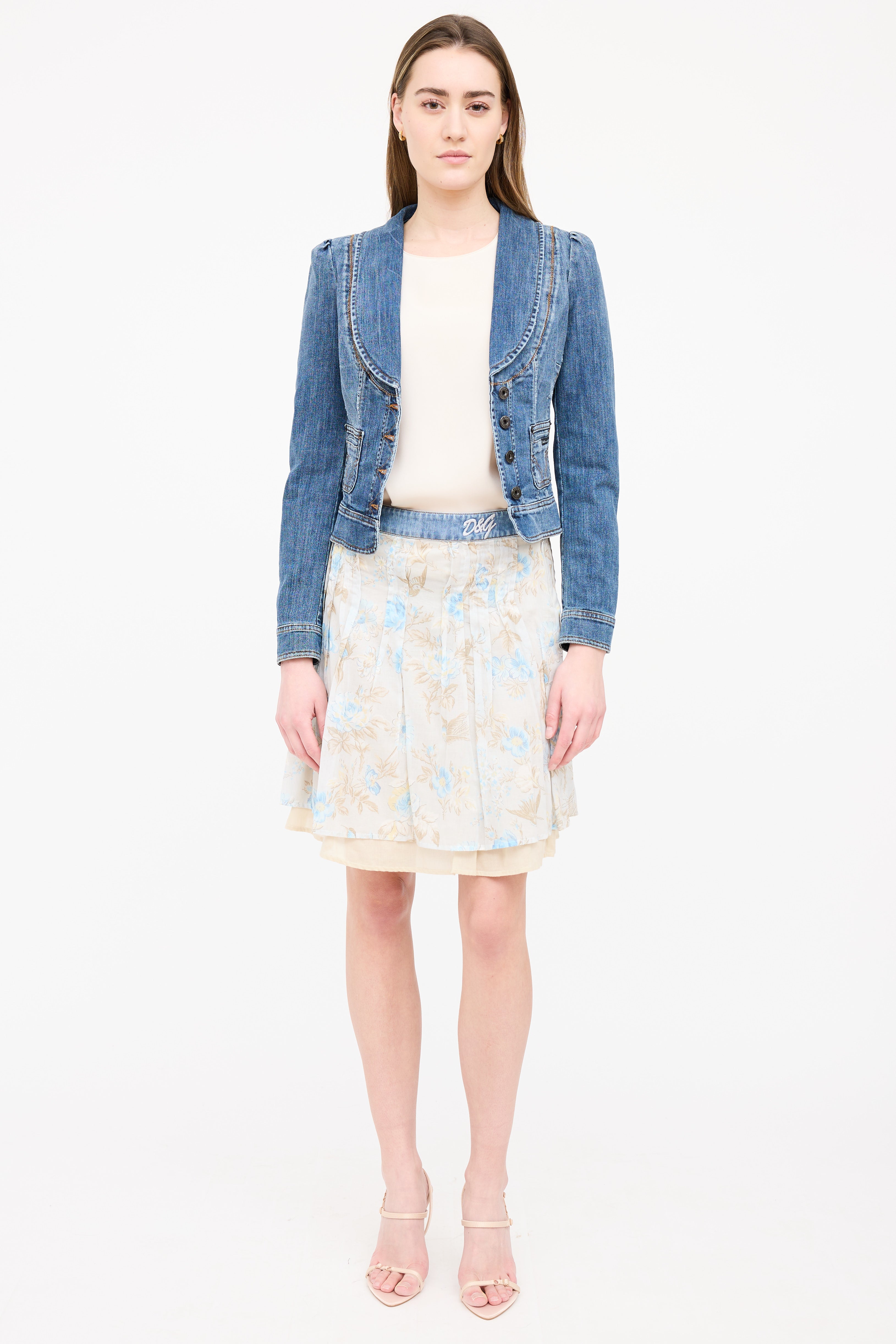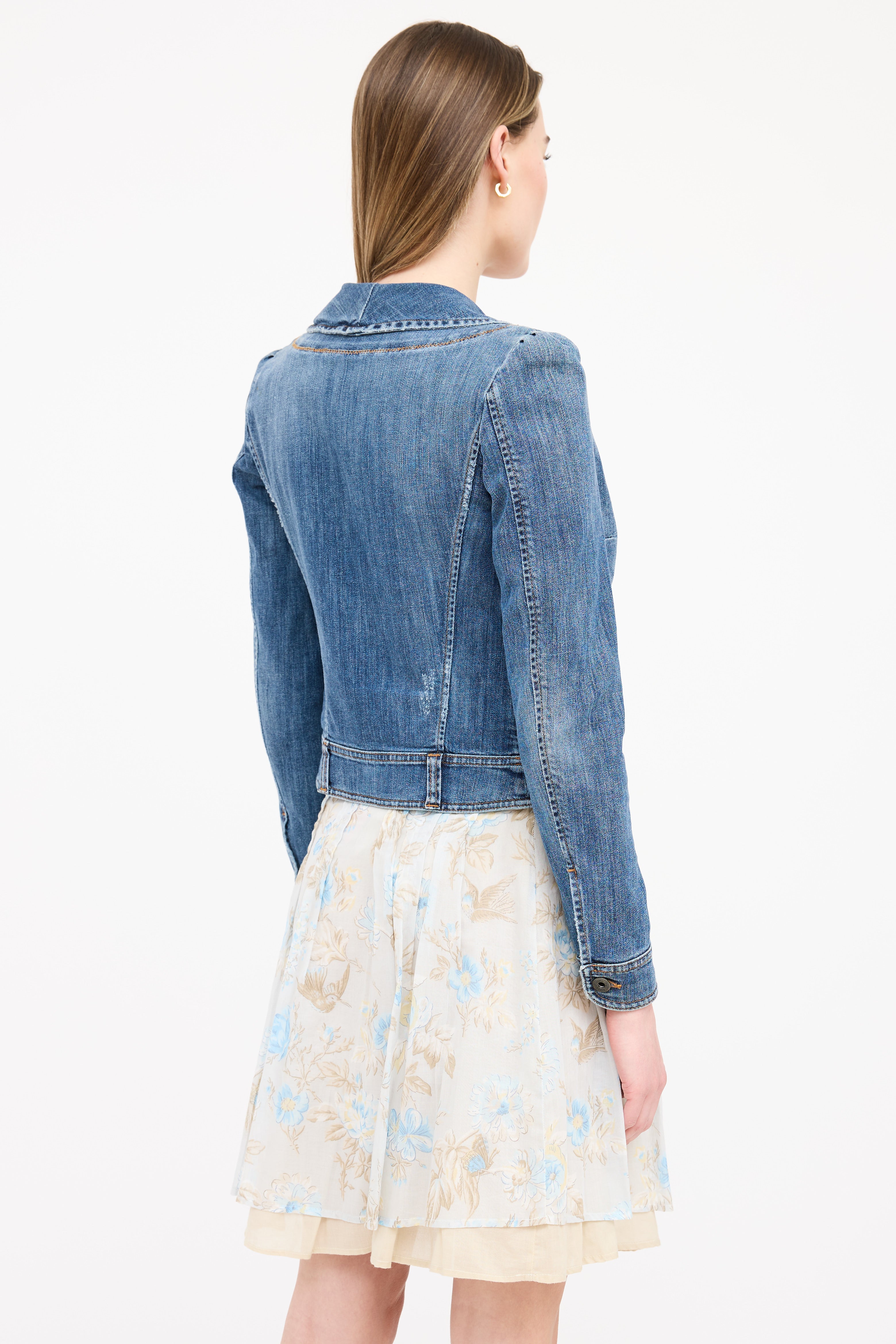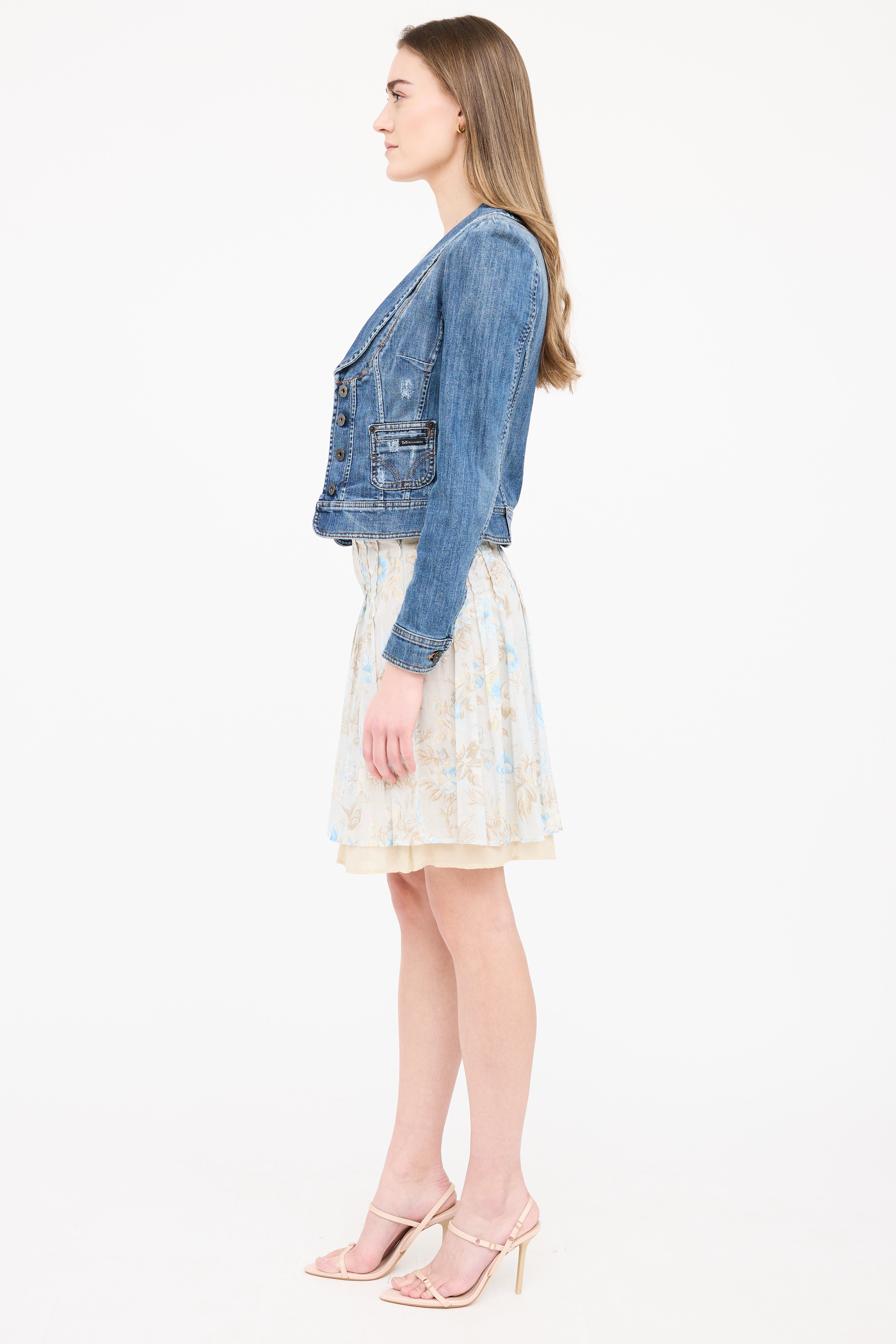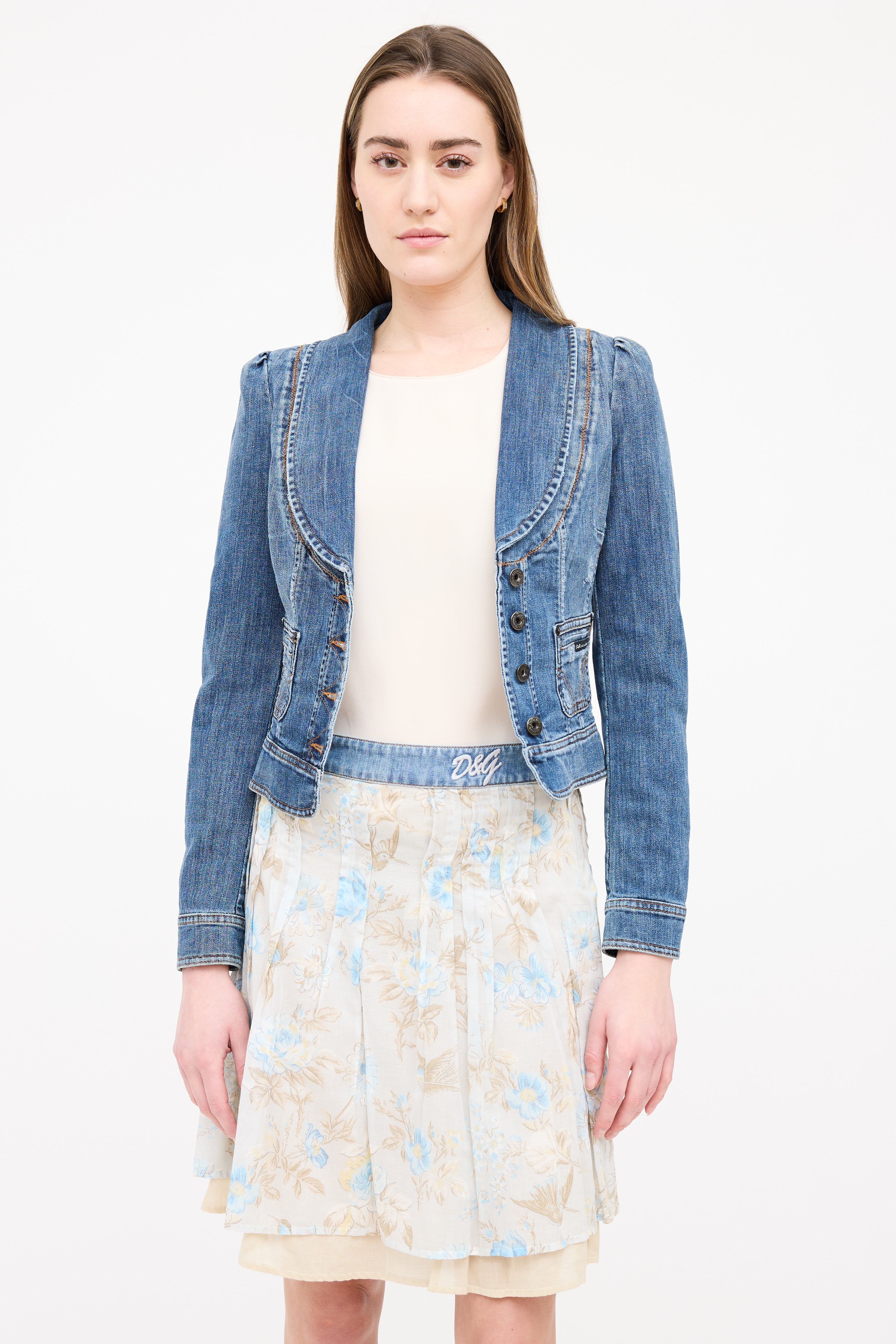Pre-owned D&G medium wash denim blazer featuring a shawl collar, long sleeves with buttoned cuffs, two slip pockets at hip, intentional distressing, and button up closure.