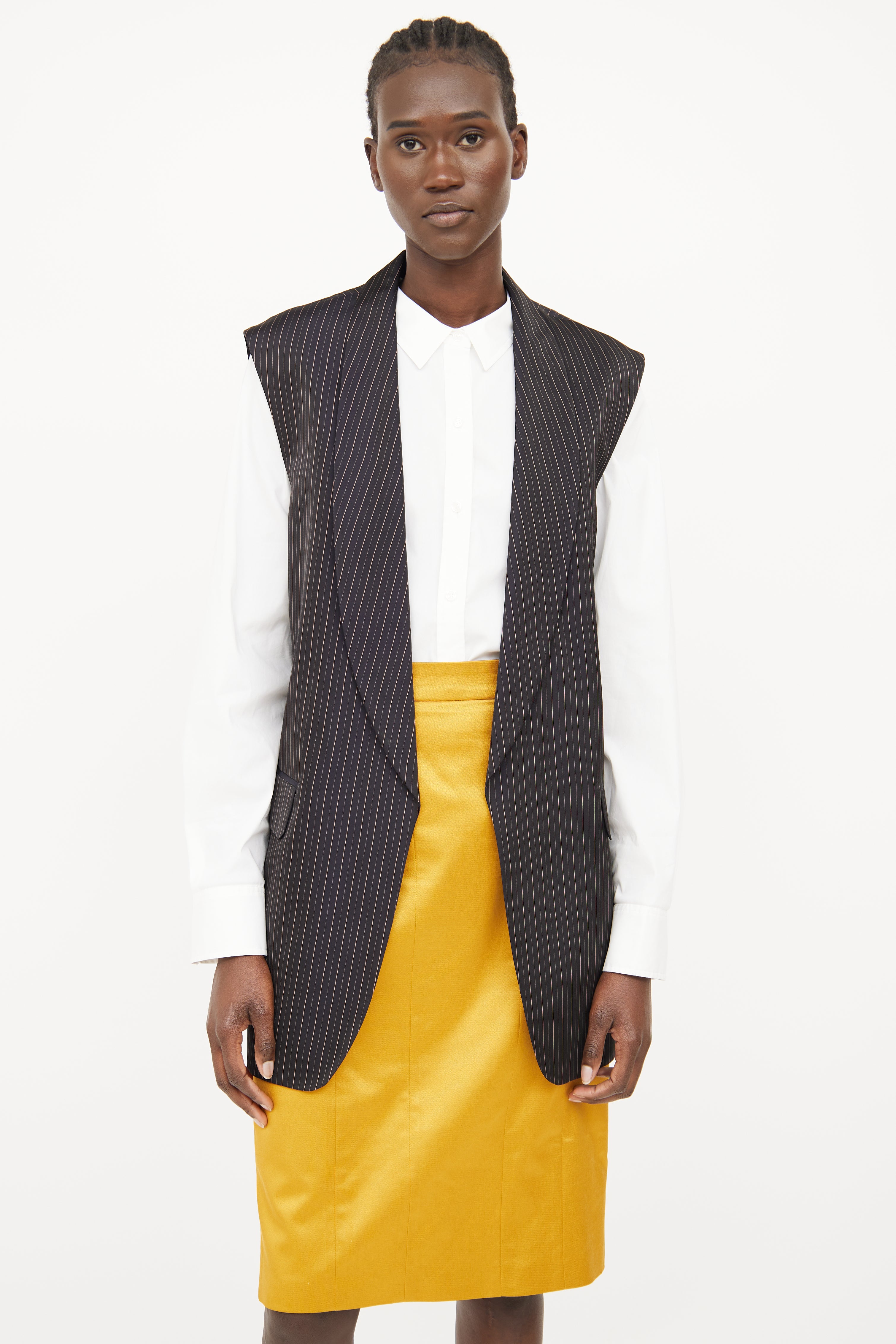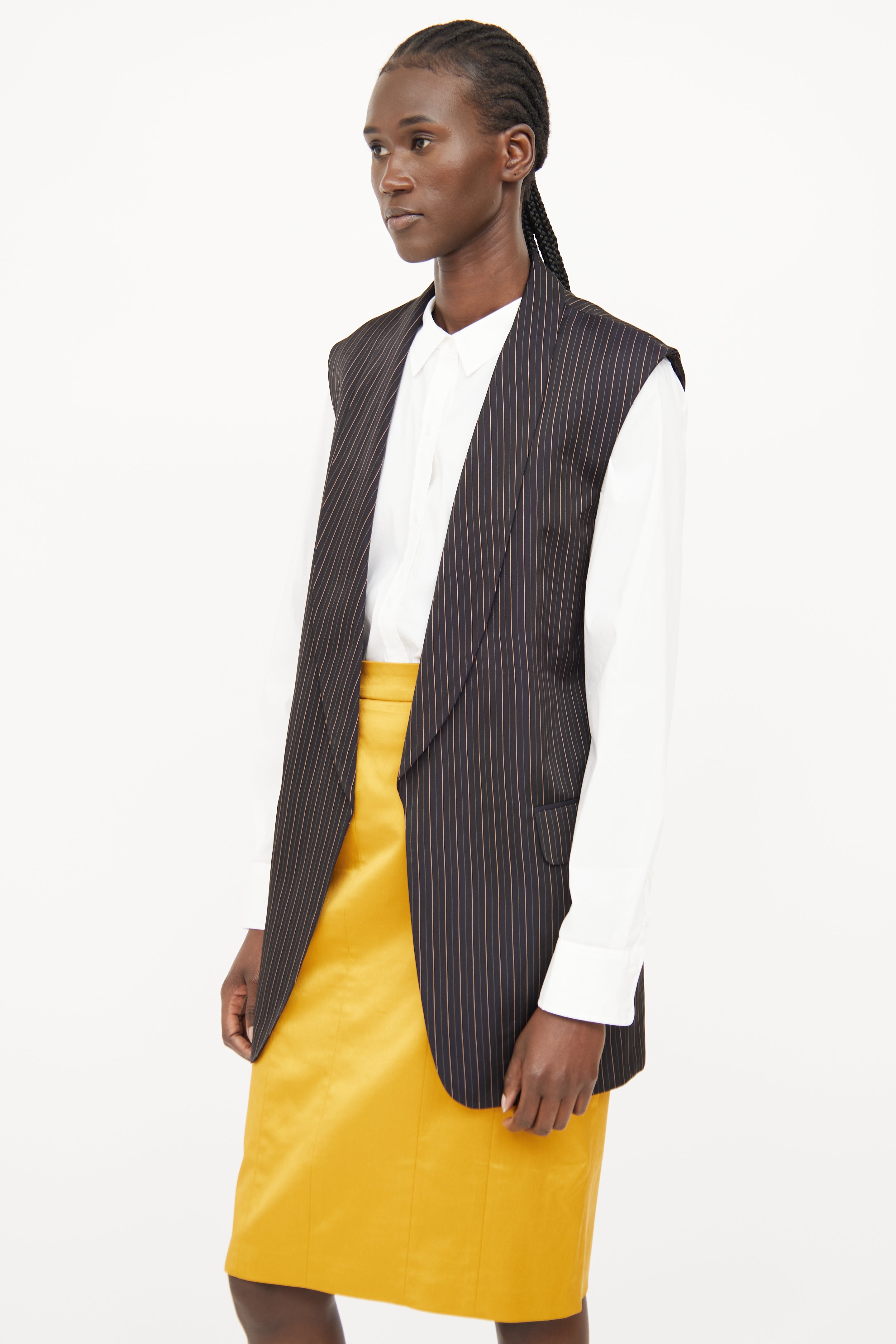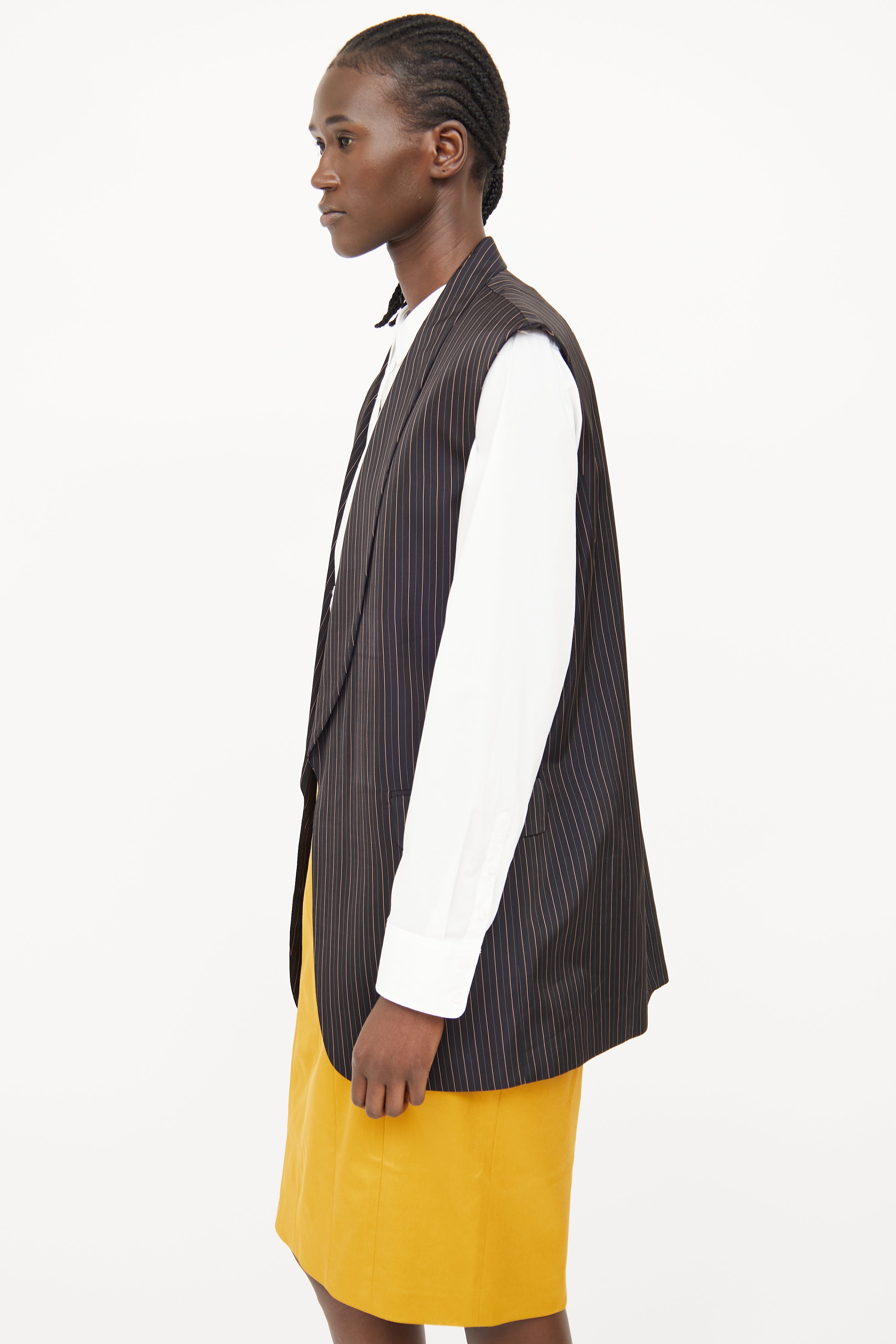 Pre-owned Dries Van Noten black and brown vest featuring shawl lapel, striped pattern throughout, stitched dual flap pockets on waist and vent on back.