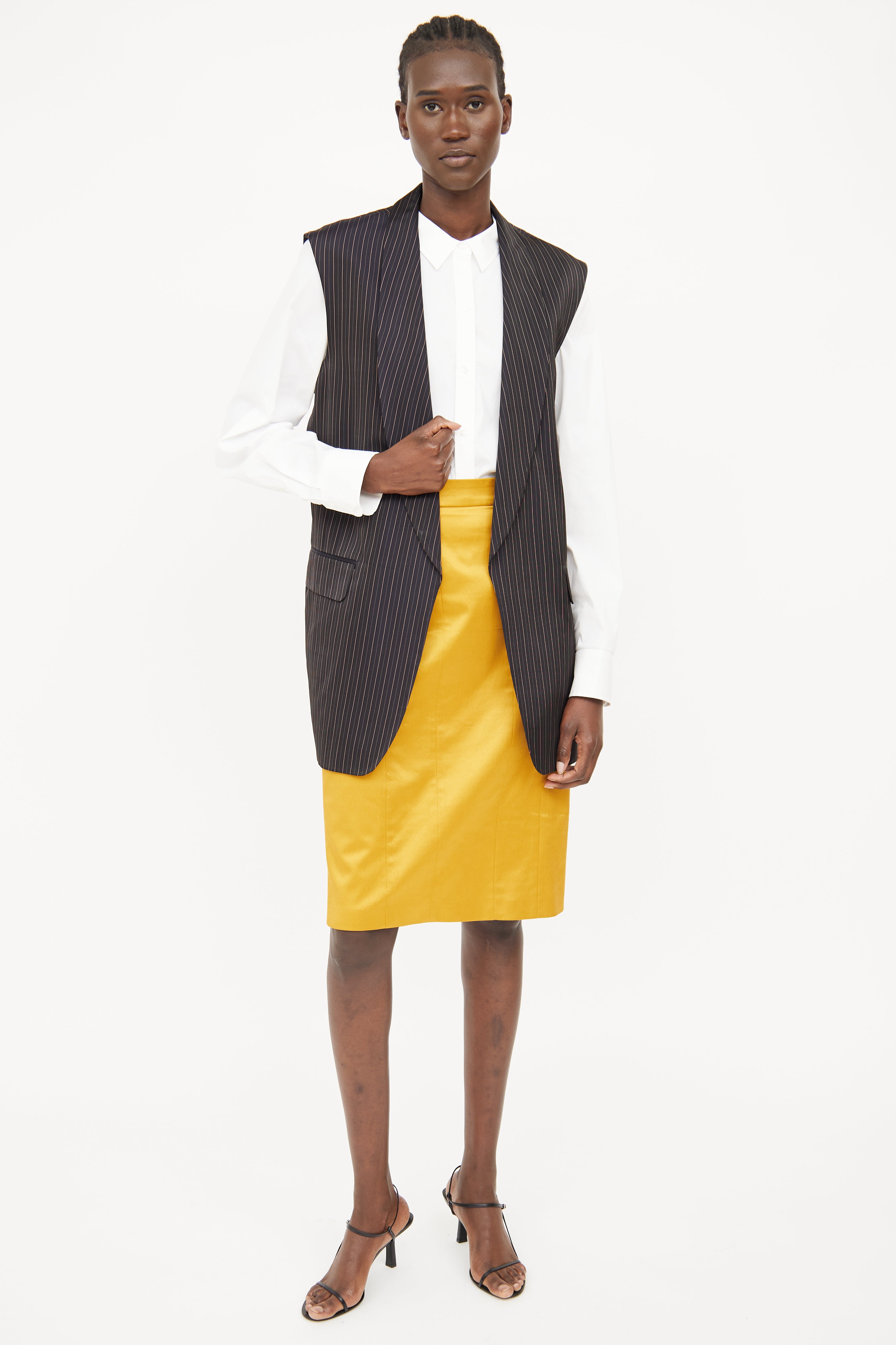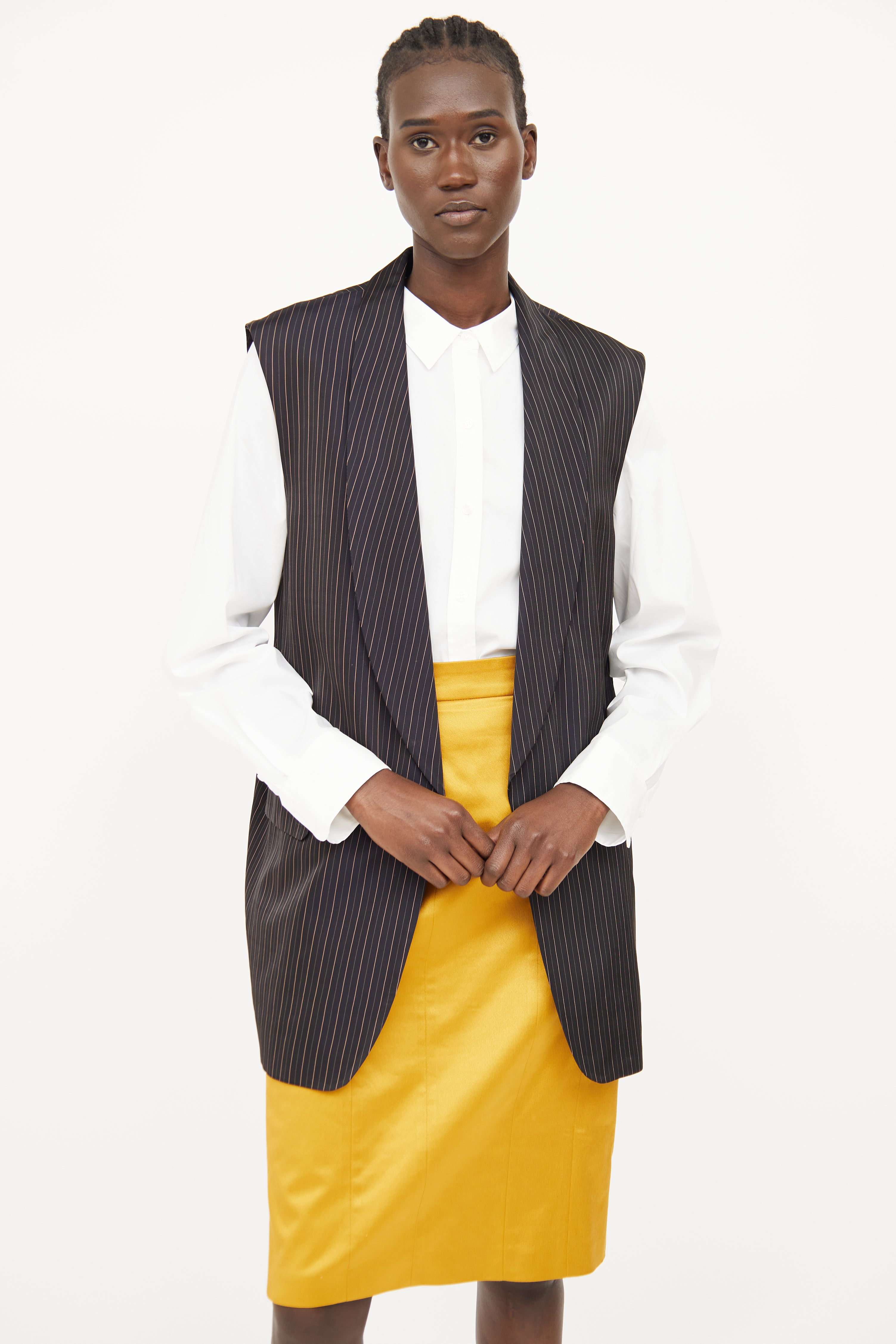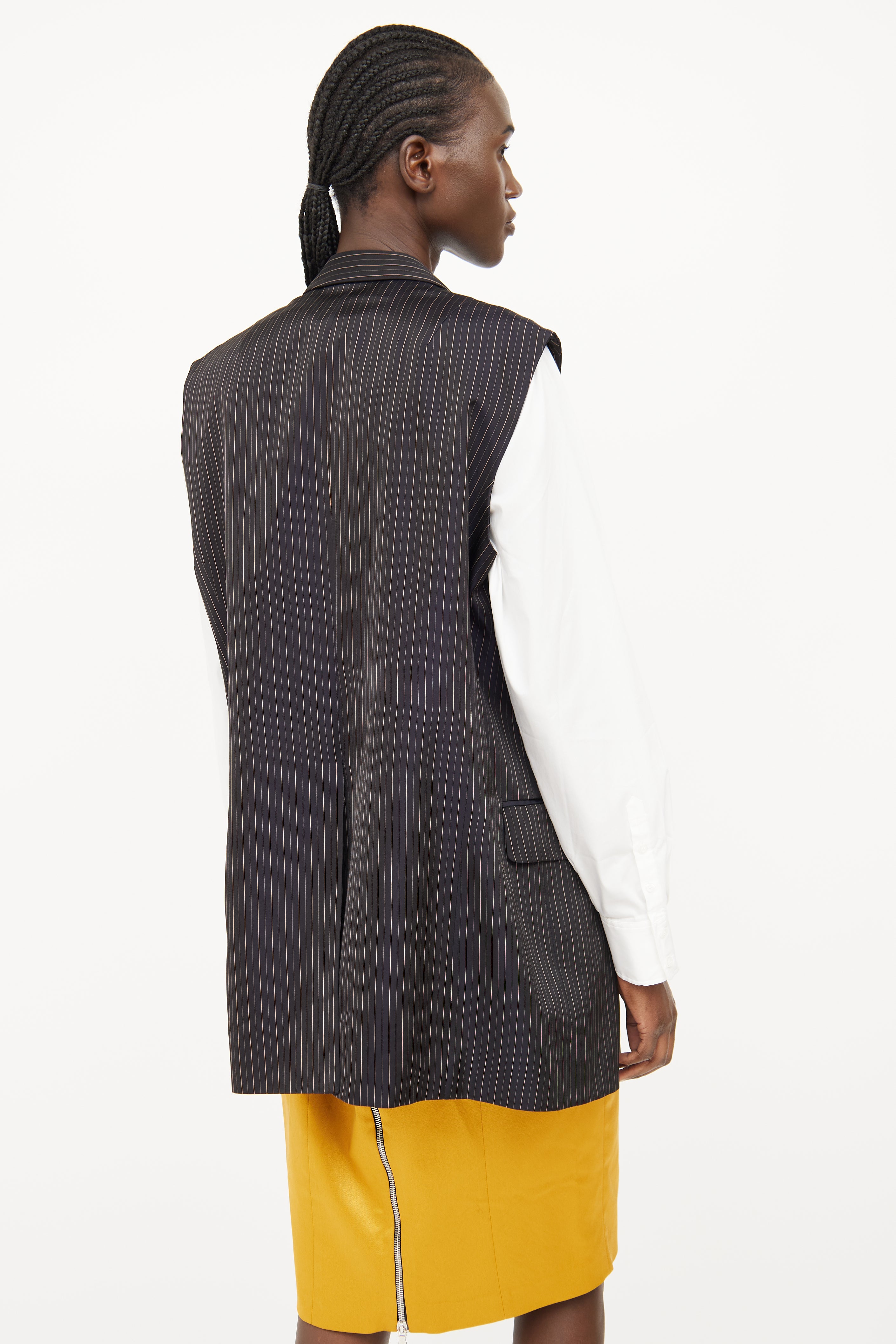 Pre-owned Dries Van Noten black and brown vest featuring shawl lapel, striped pattern throughout, stitched dual flap pockets on waist and vent on back.
