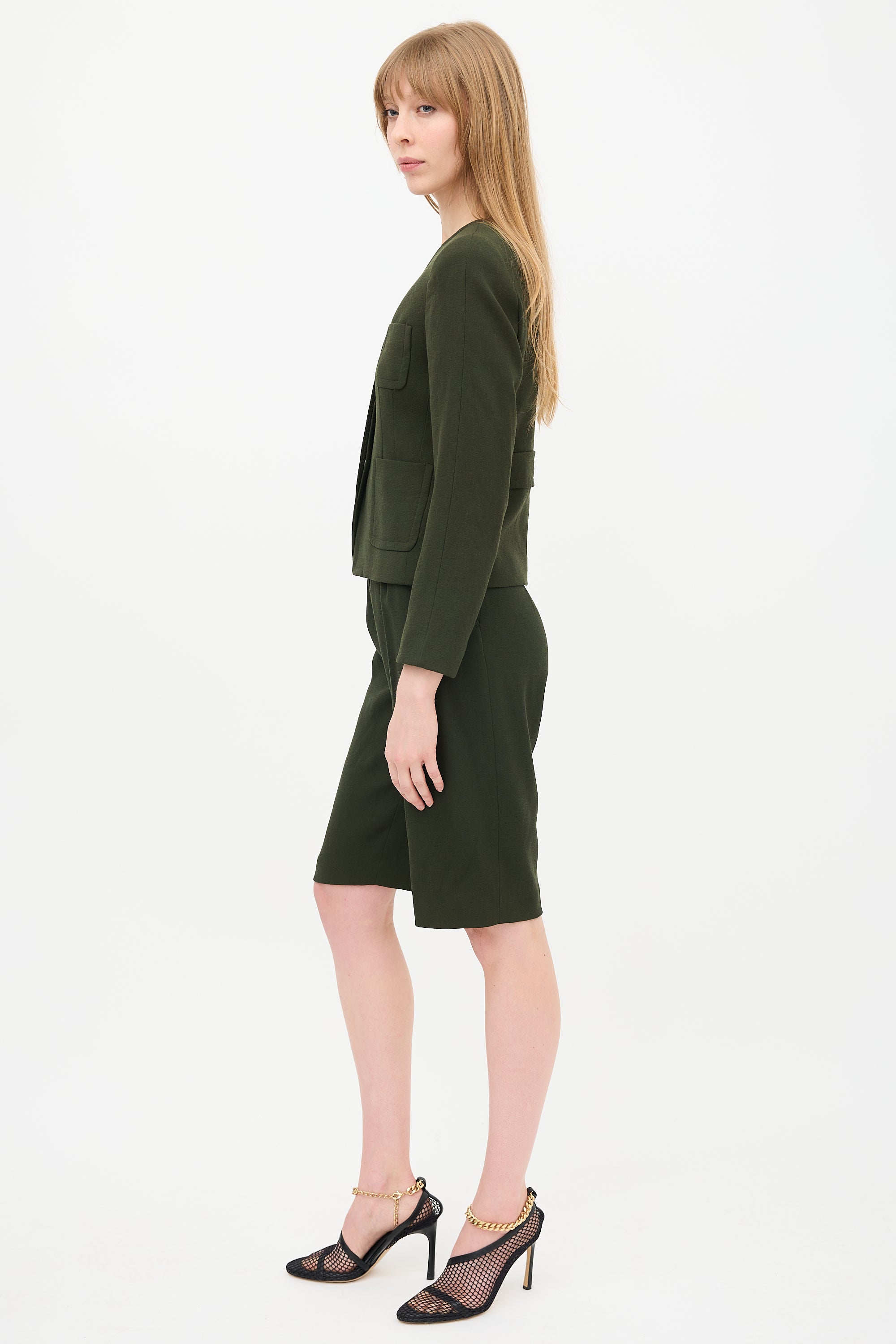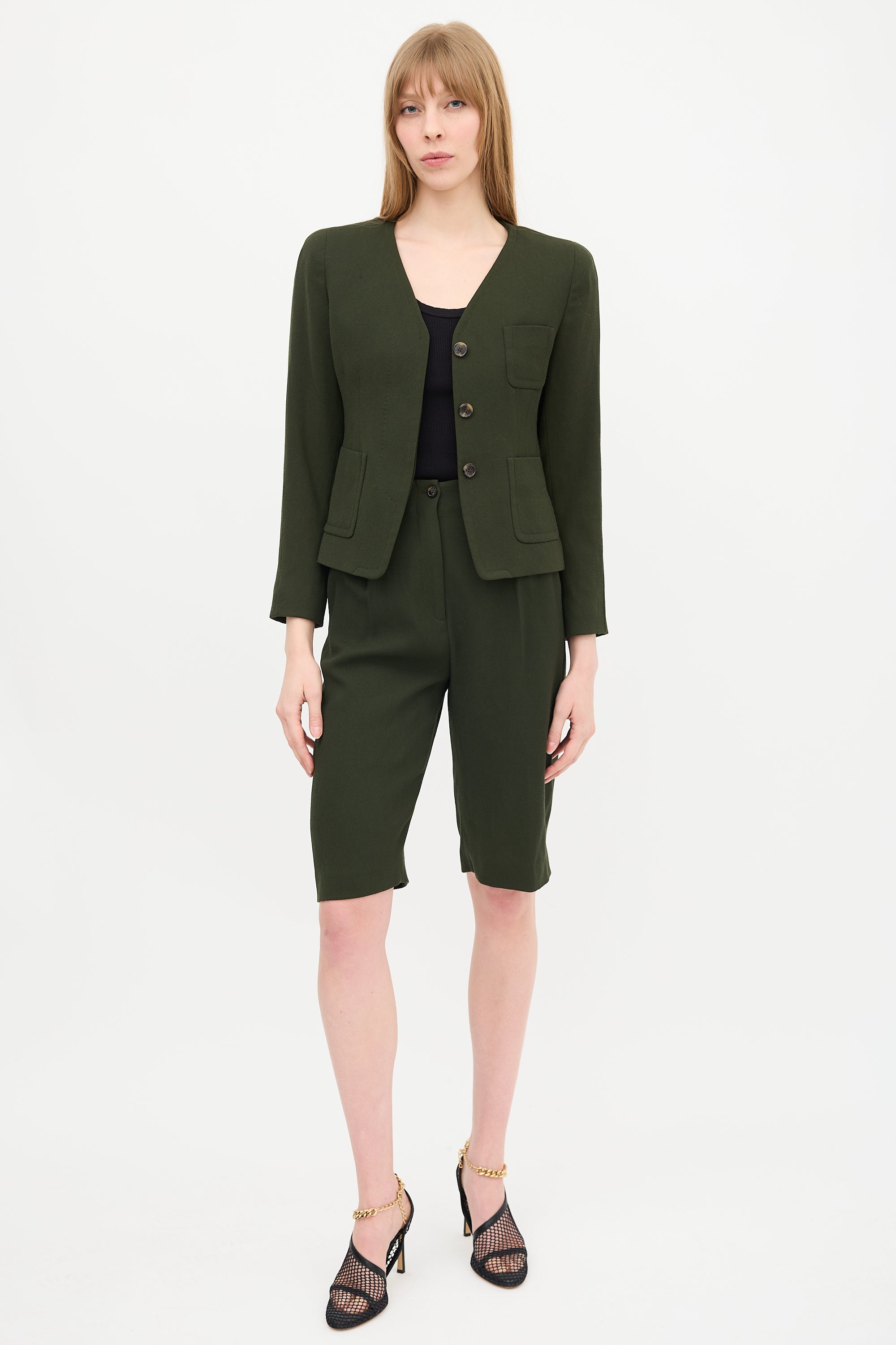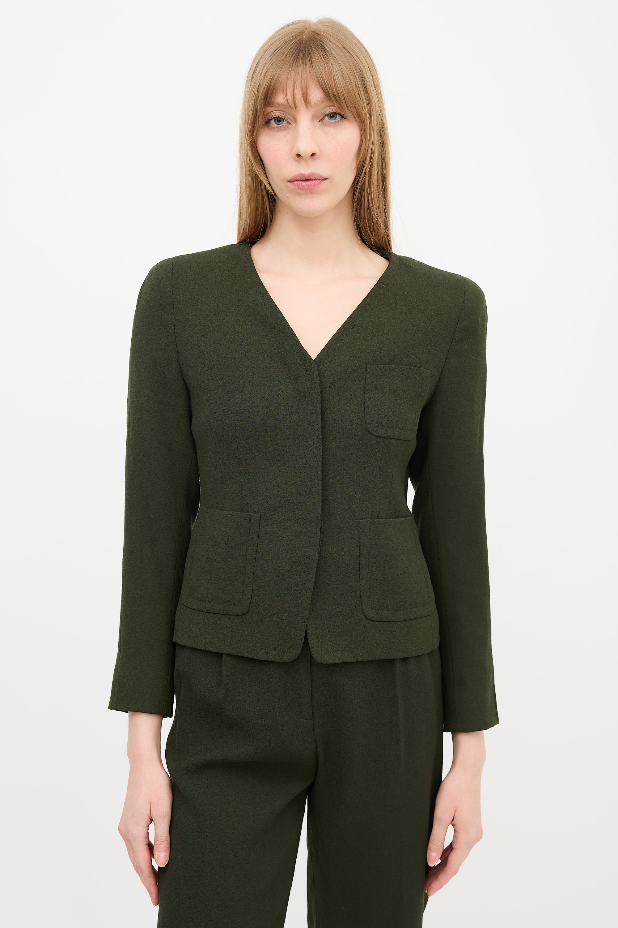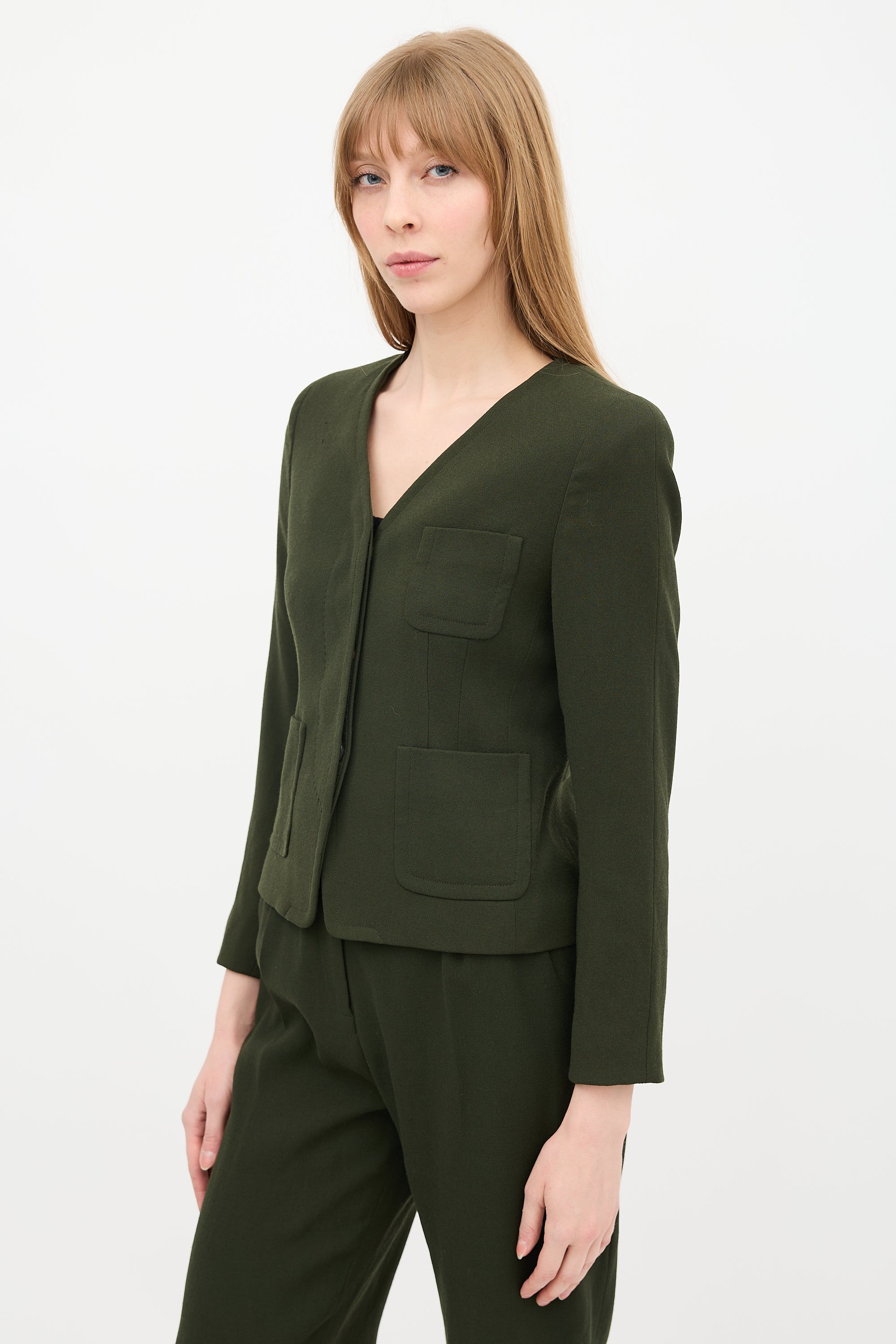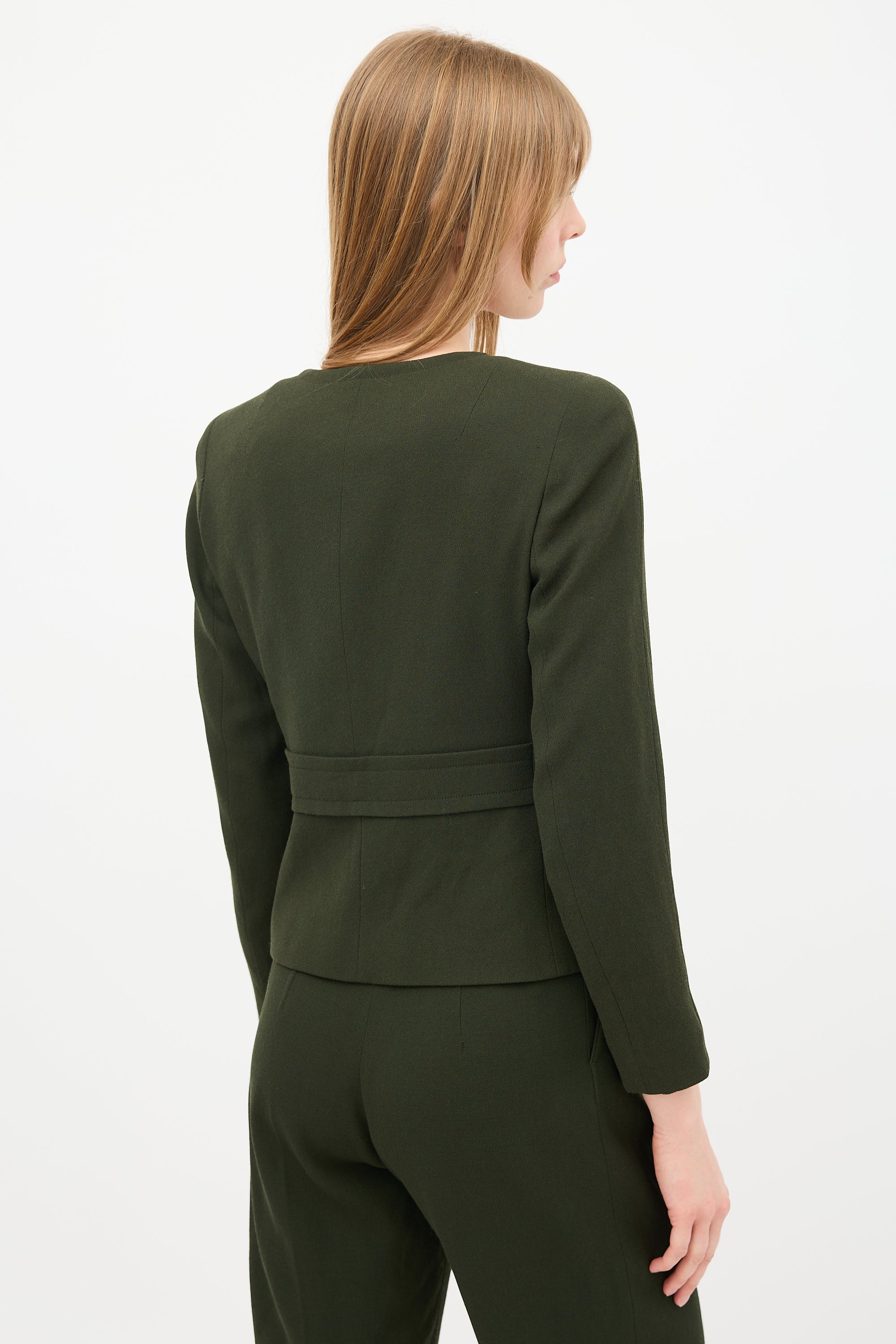 Pre-owned Dries Van Noten green wool blend crepe jacket featuring V-neckline, concealed button front, three front patch pockets, and back belt detail. Lined.