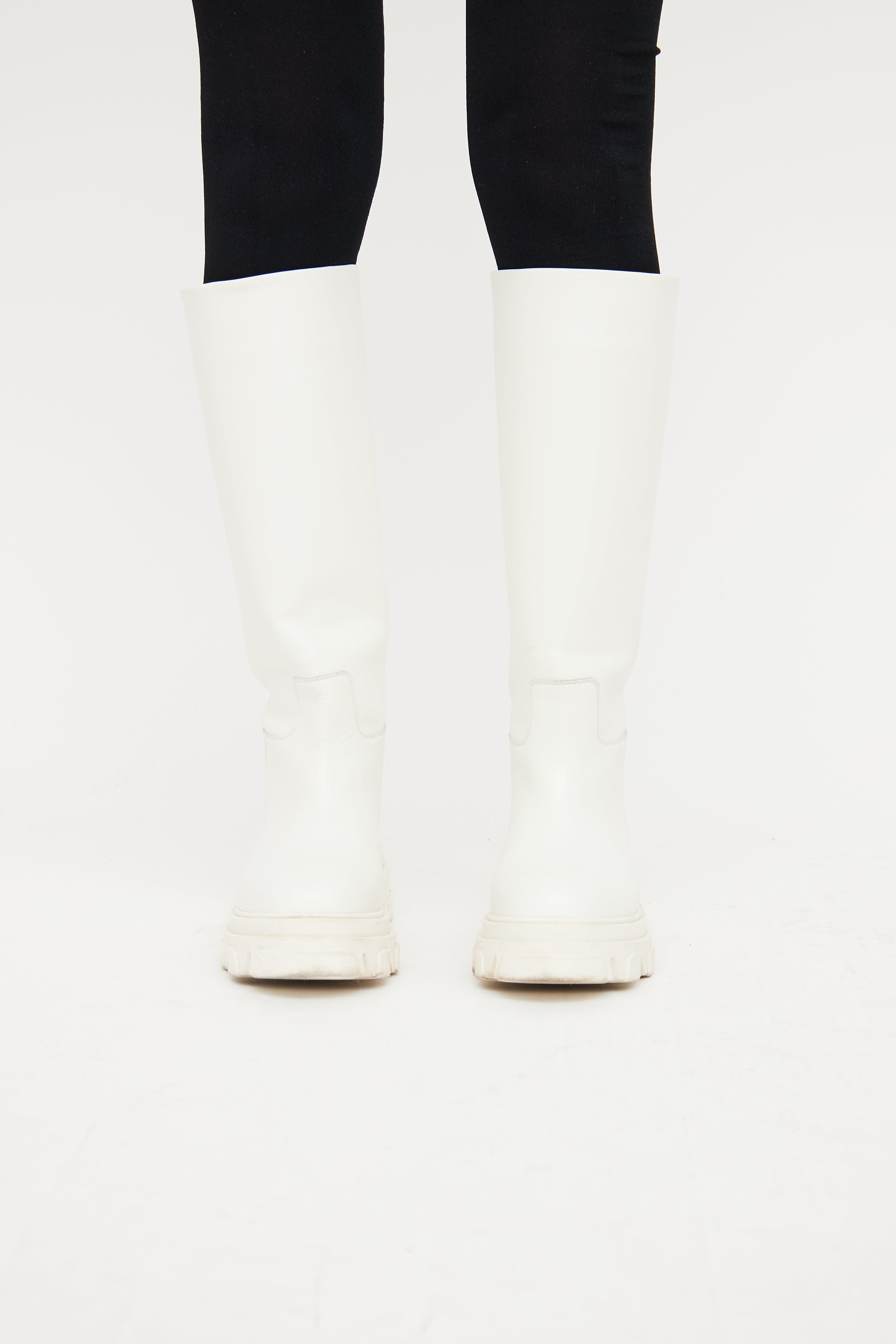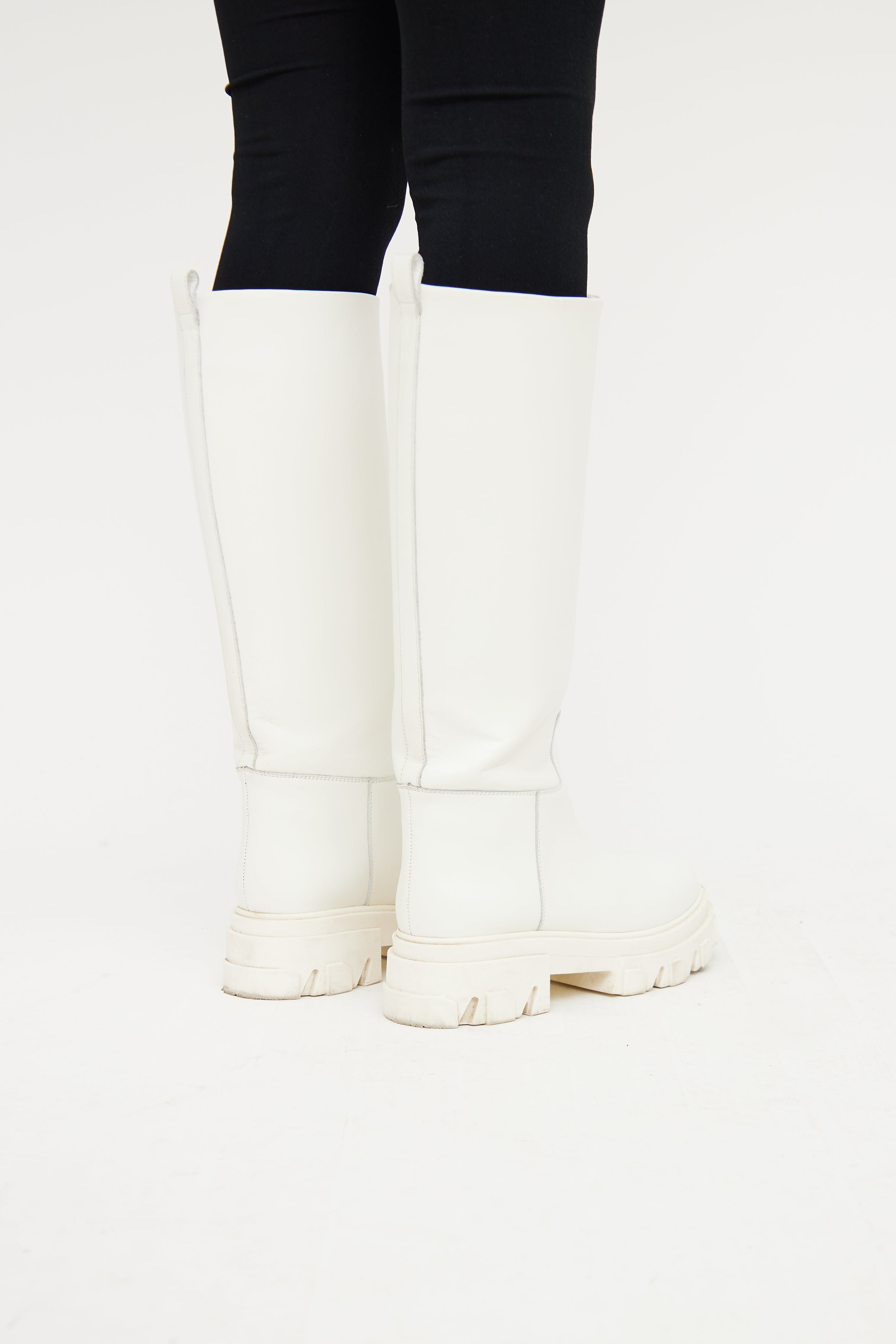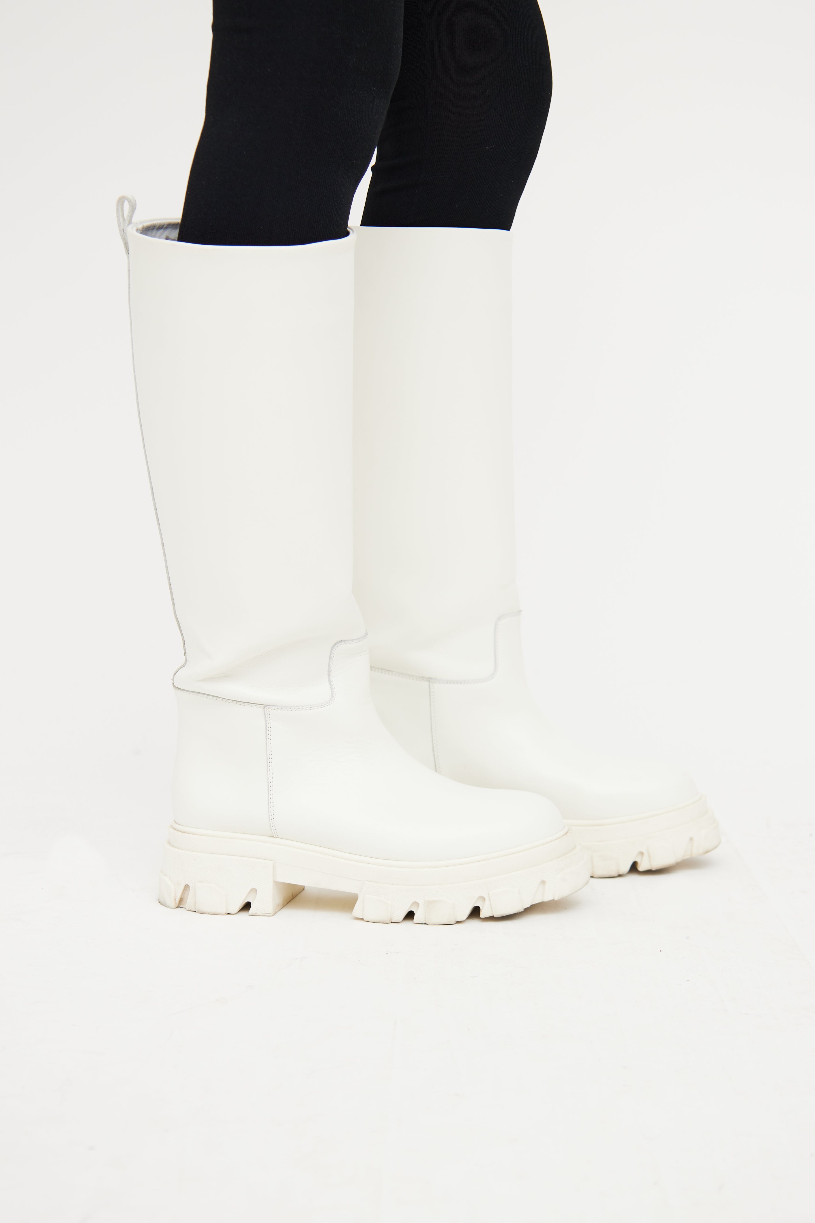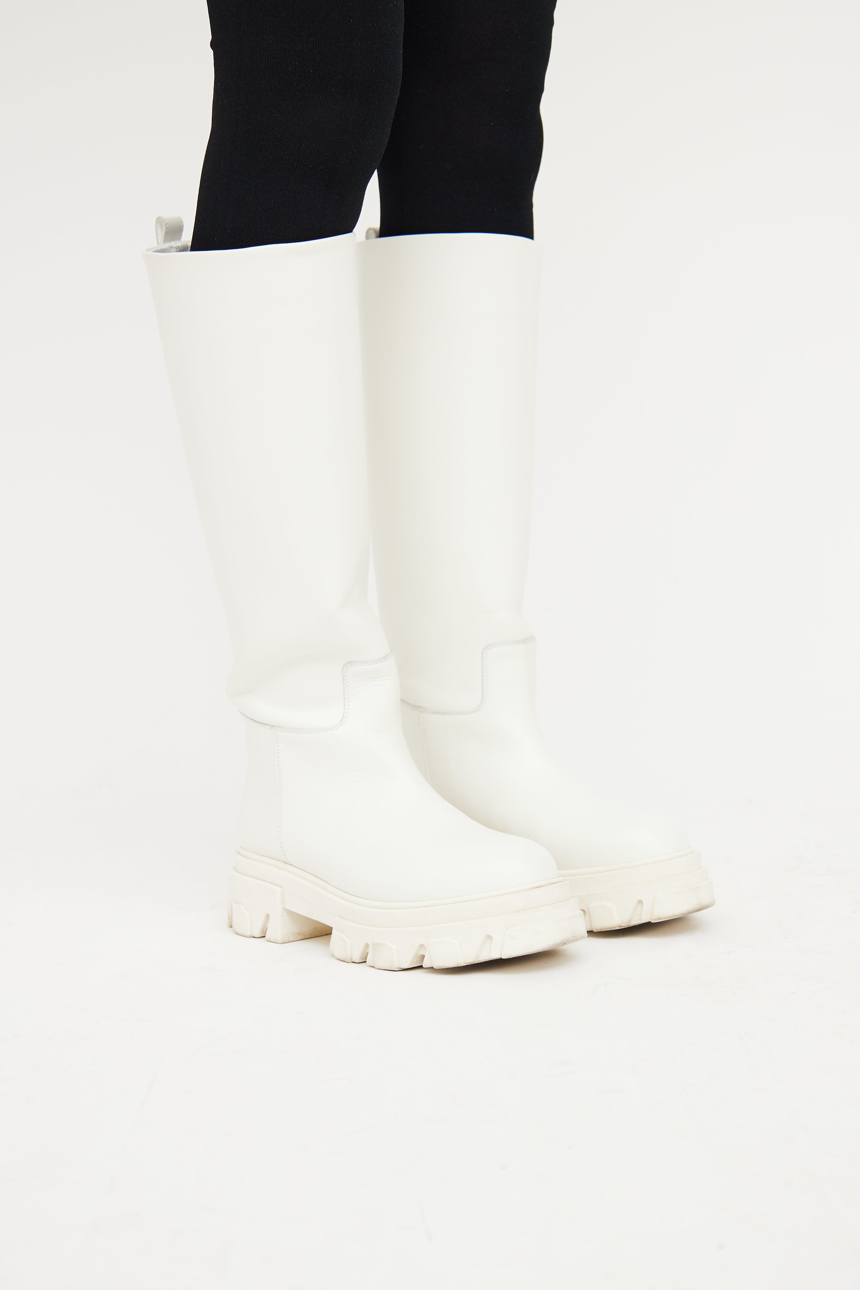 Gia x Pernille Teisbaek white tall boot featuring rounded toe, slip on entry with pull tab, and rubber platform treaded outsole.