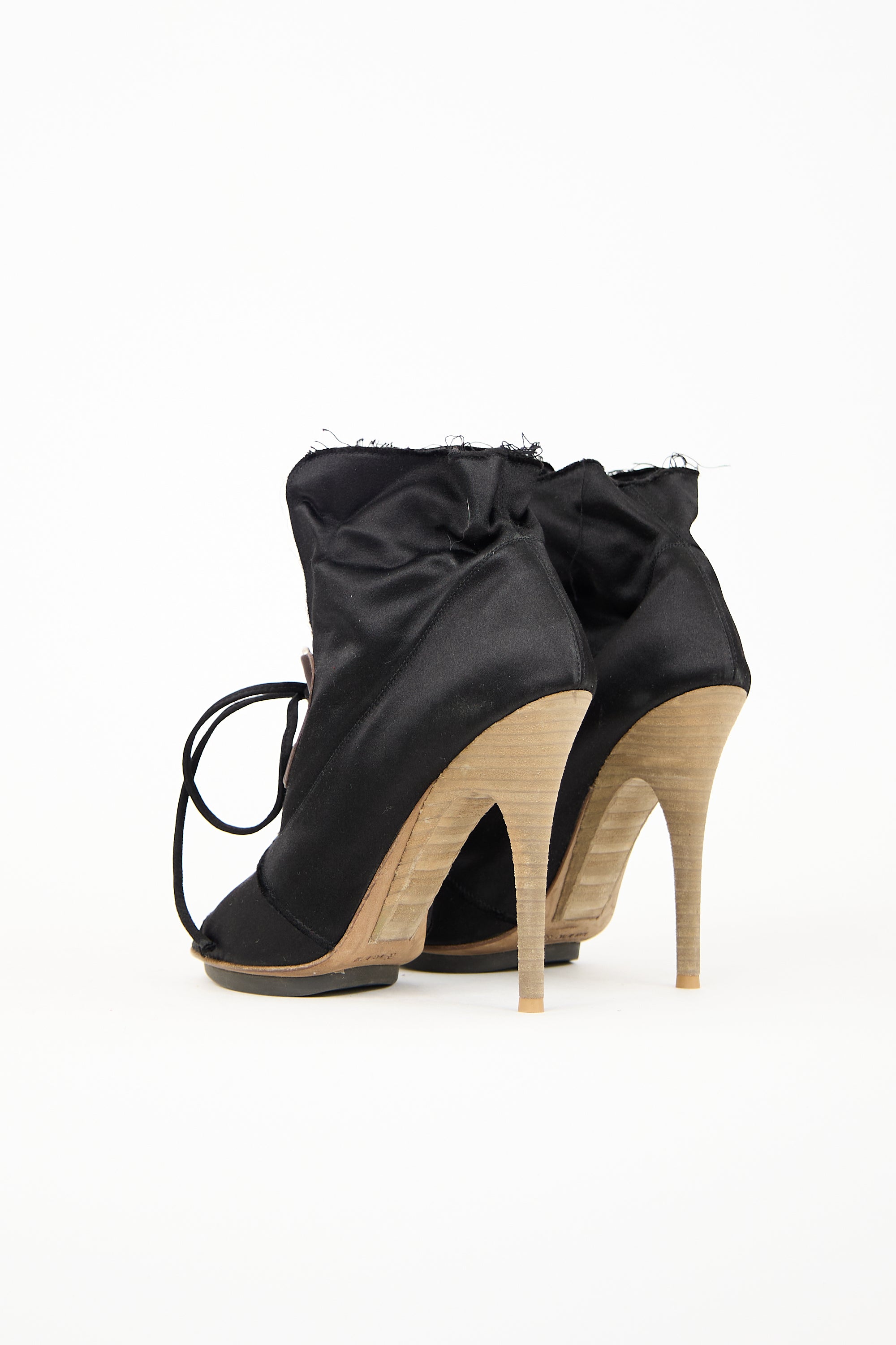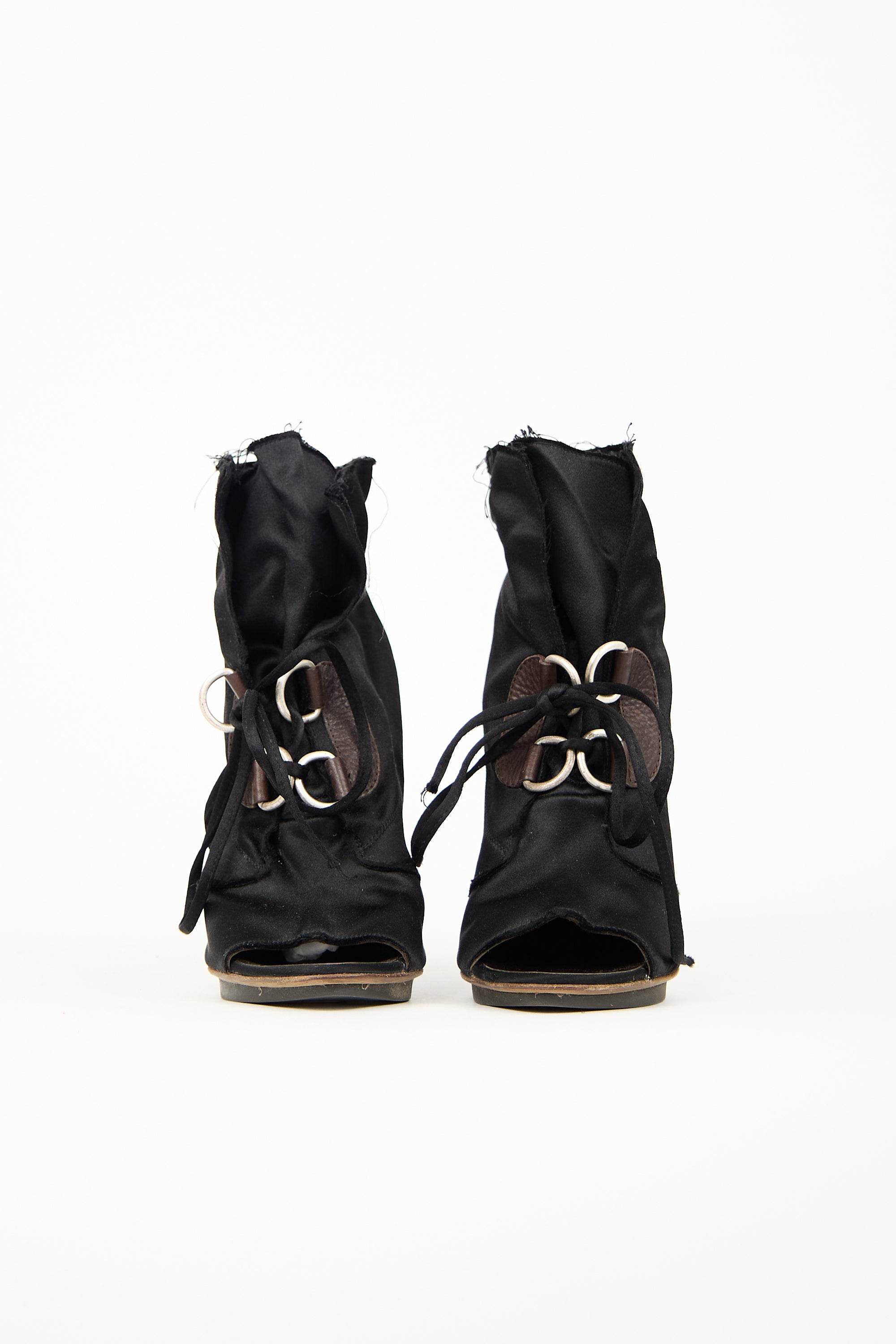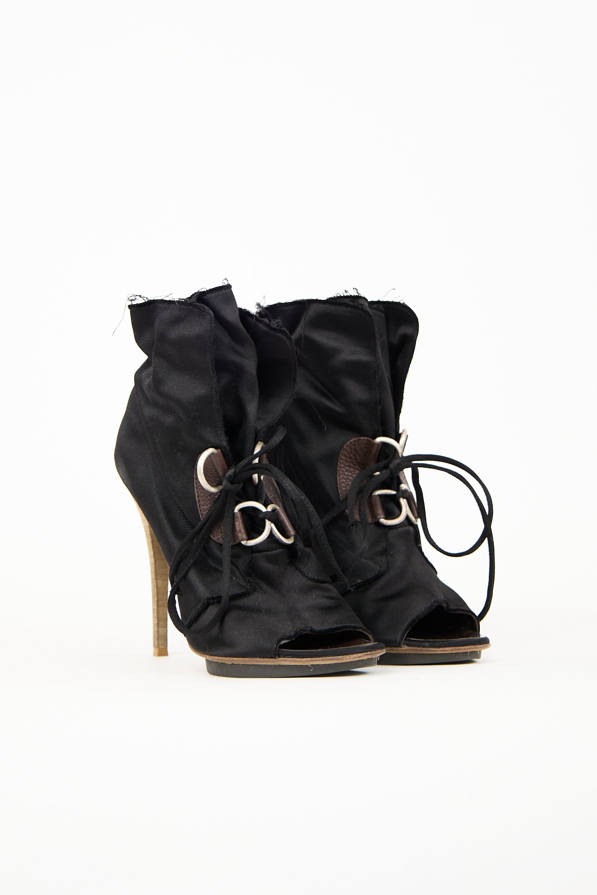 Pre-owned Giuseppe Zanotti black satin heeled boots featuring an almond peep toe, lace up closure with silver tone D-rings, brown leather panels at vamp, and stacked stiletto heel.