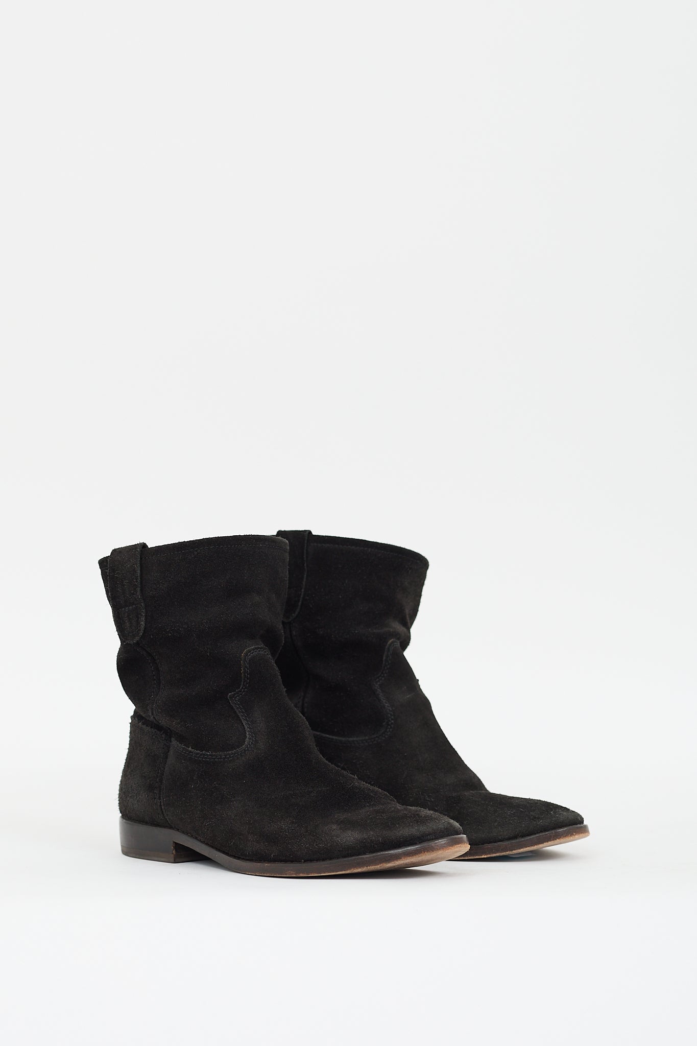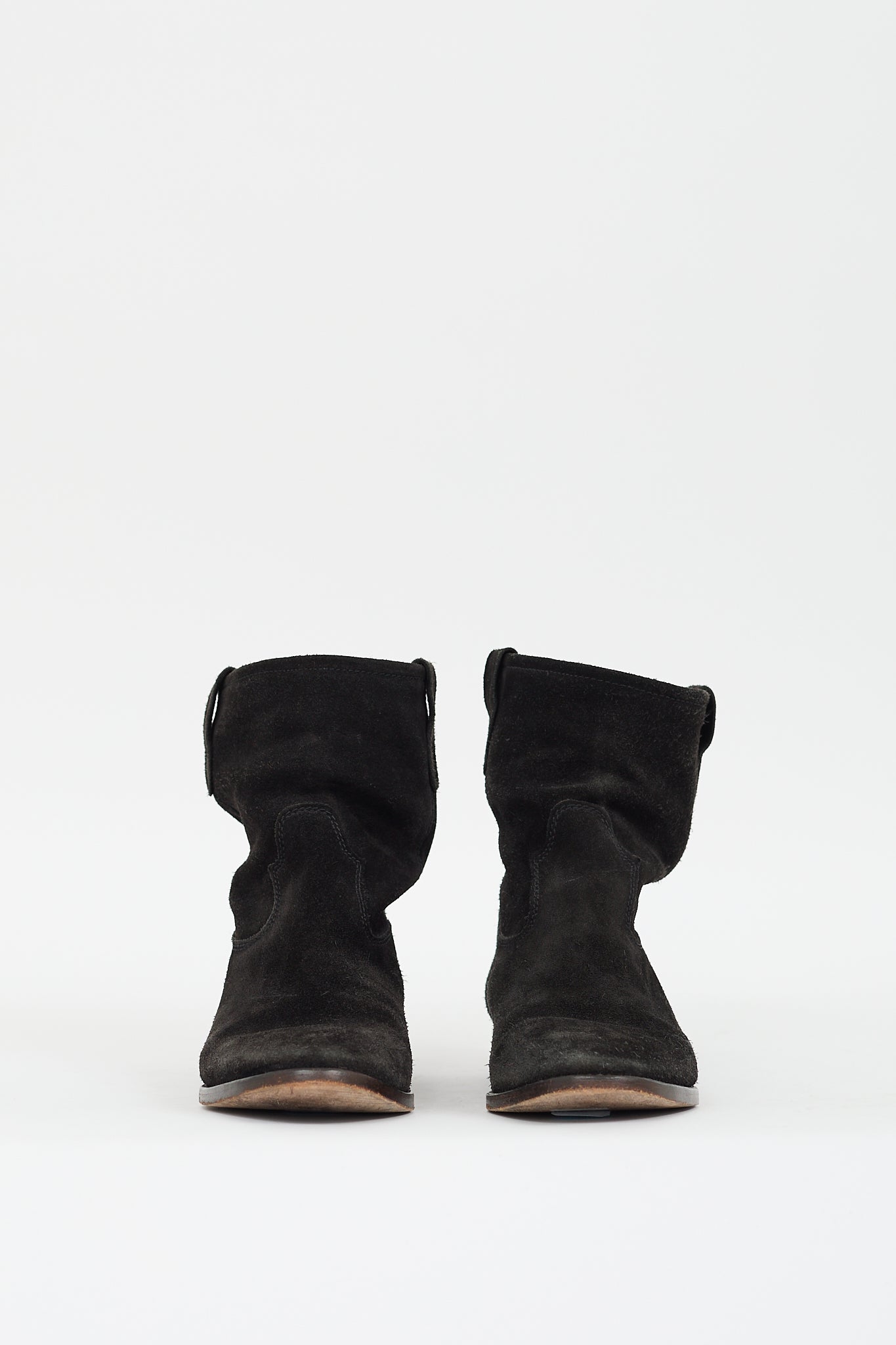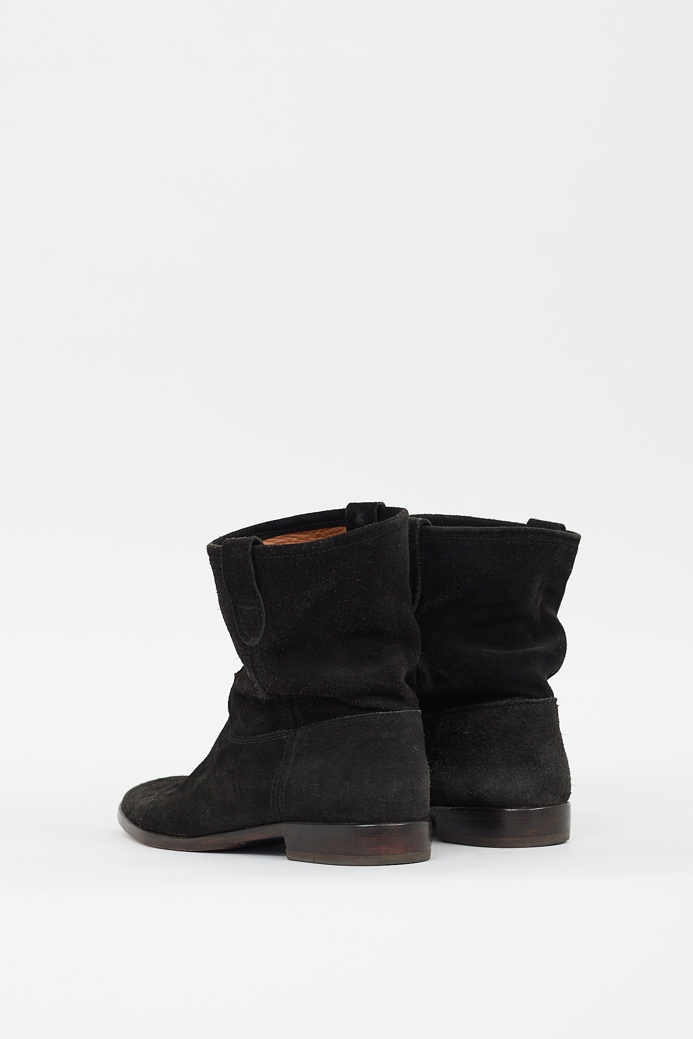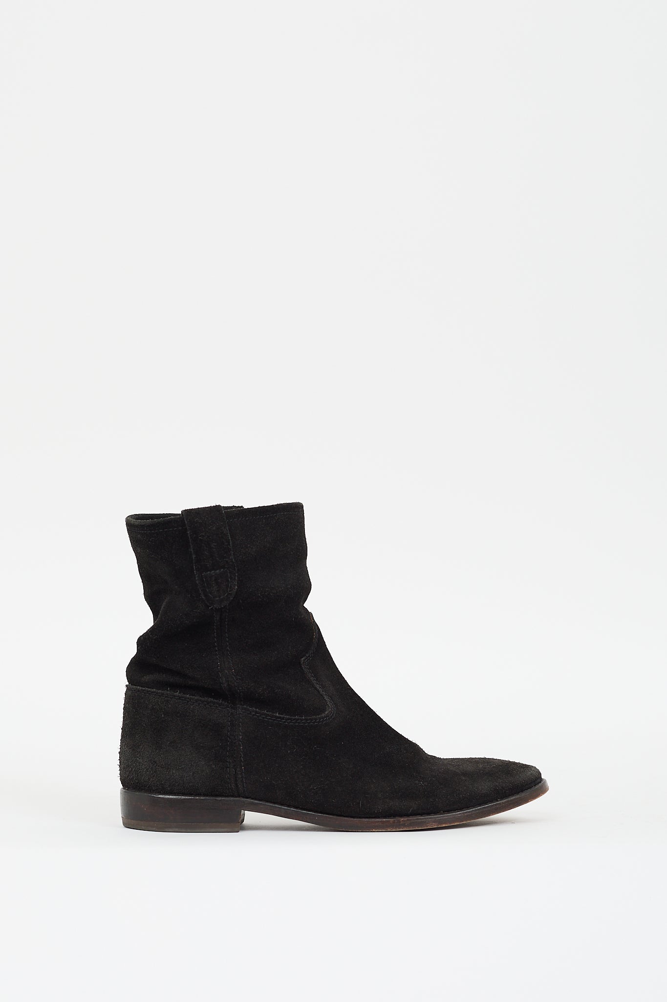 Pre-owned Isabel Marant black suede ankle boots featuring tapered rounded toe, suede pull tabs at sides, stacked heel and pull on entry.