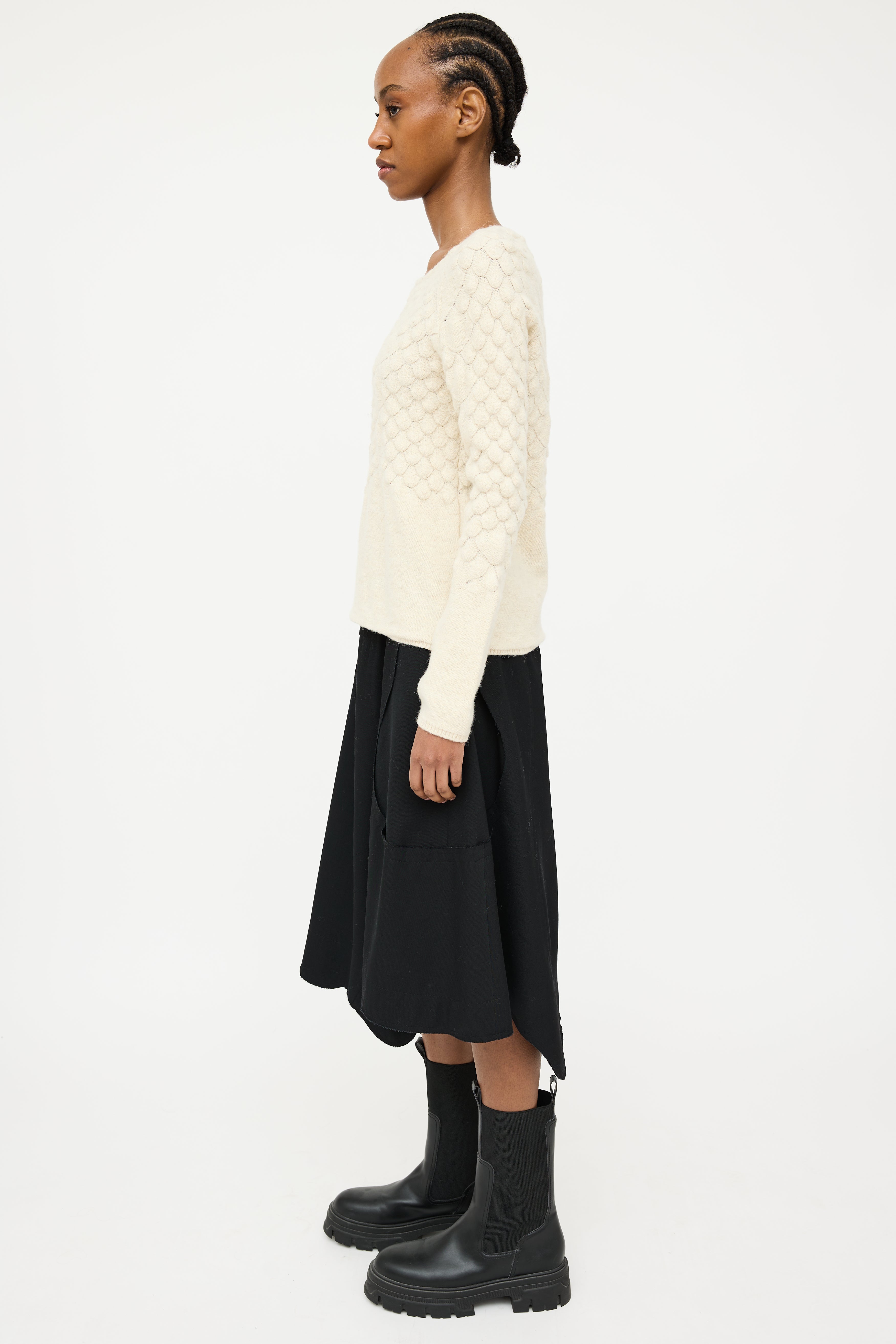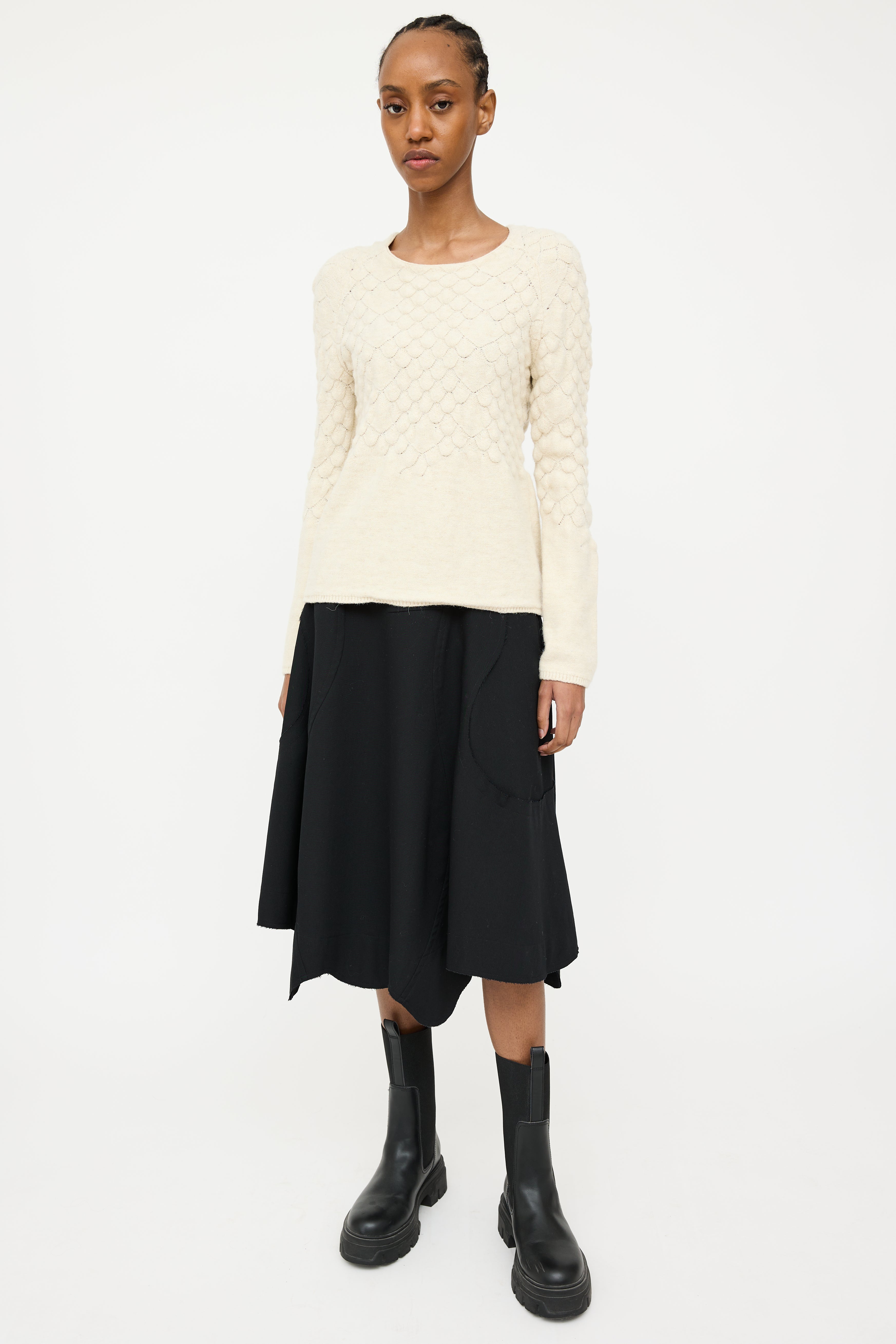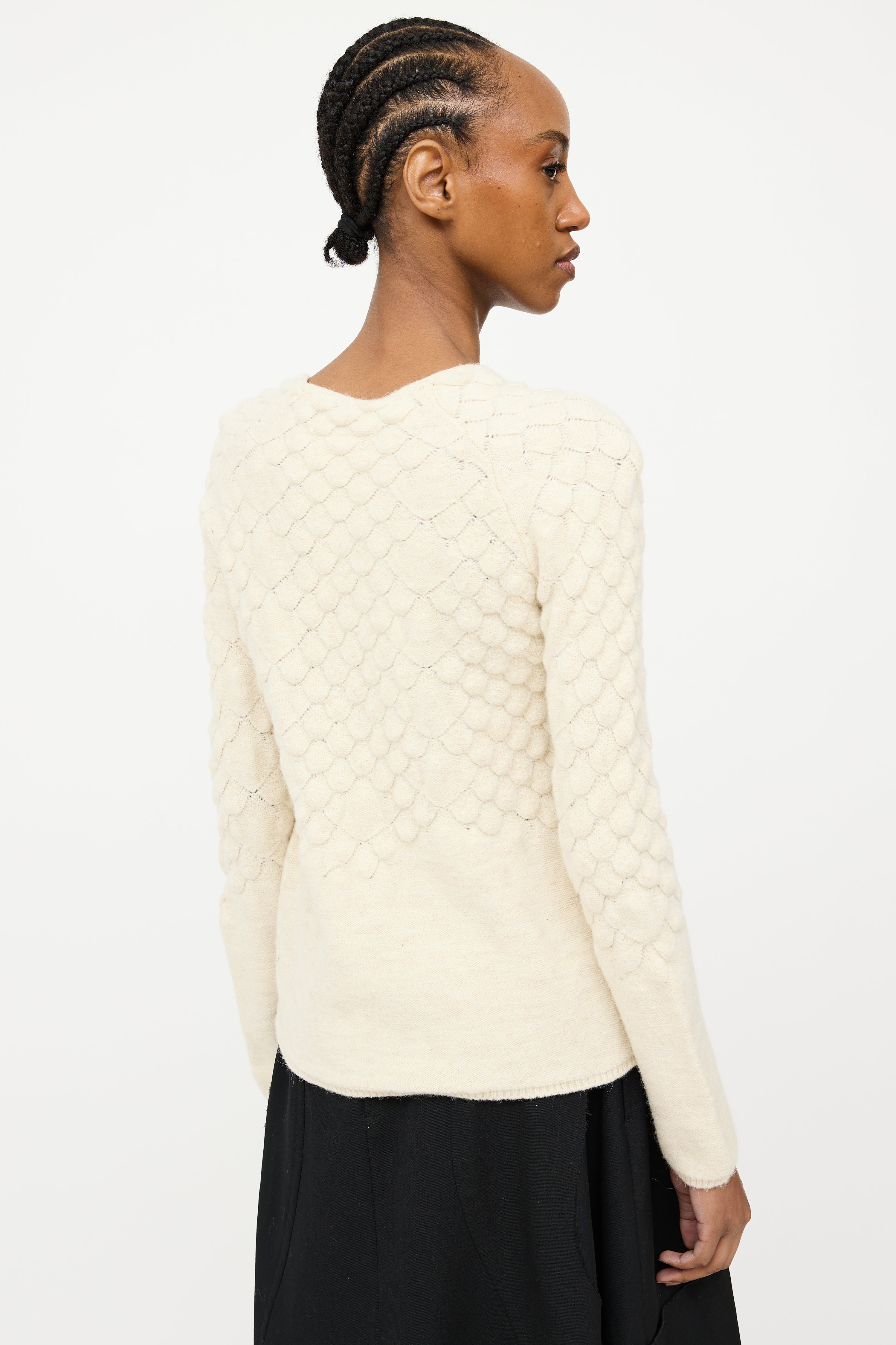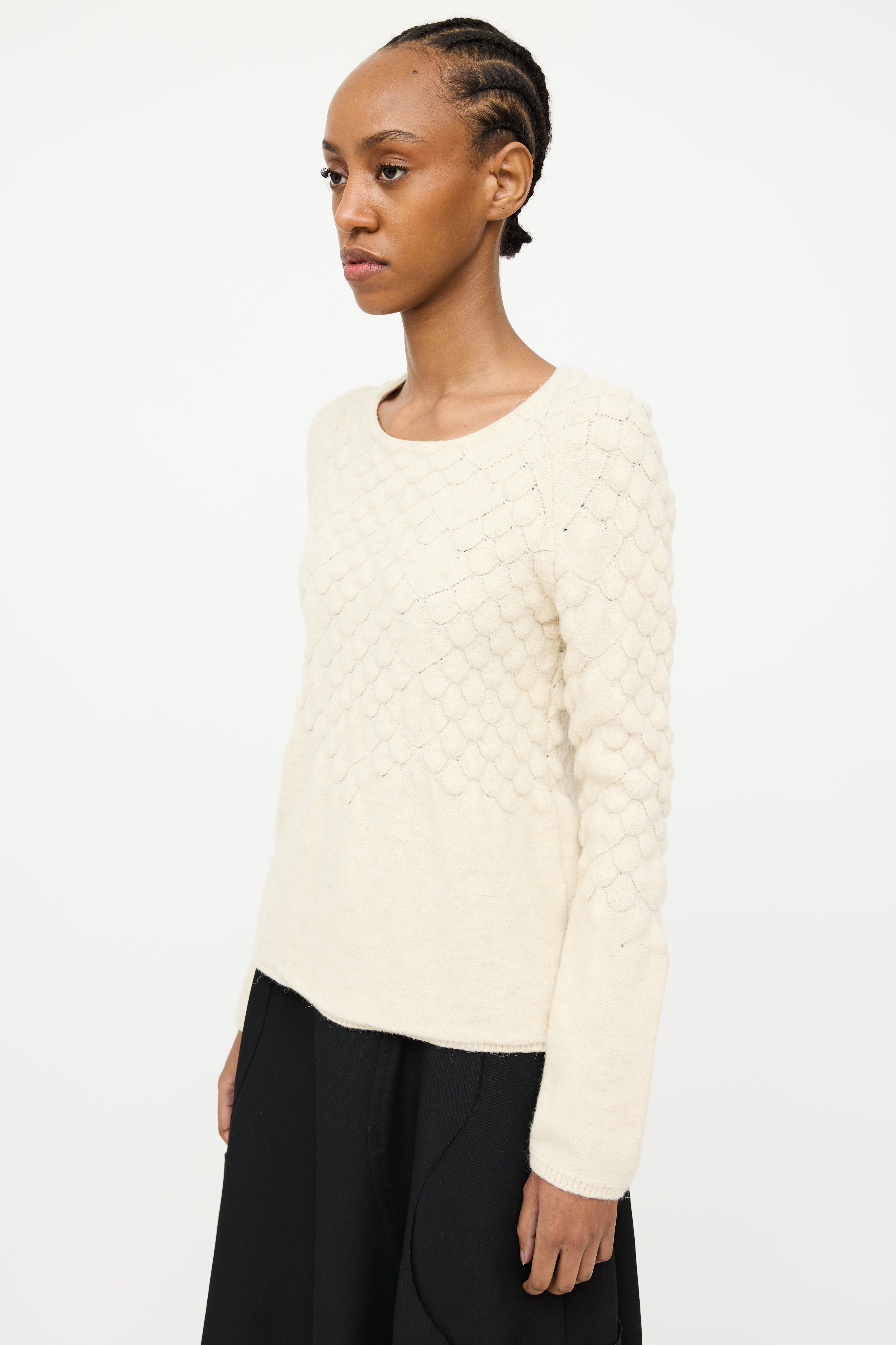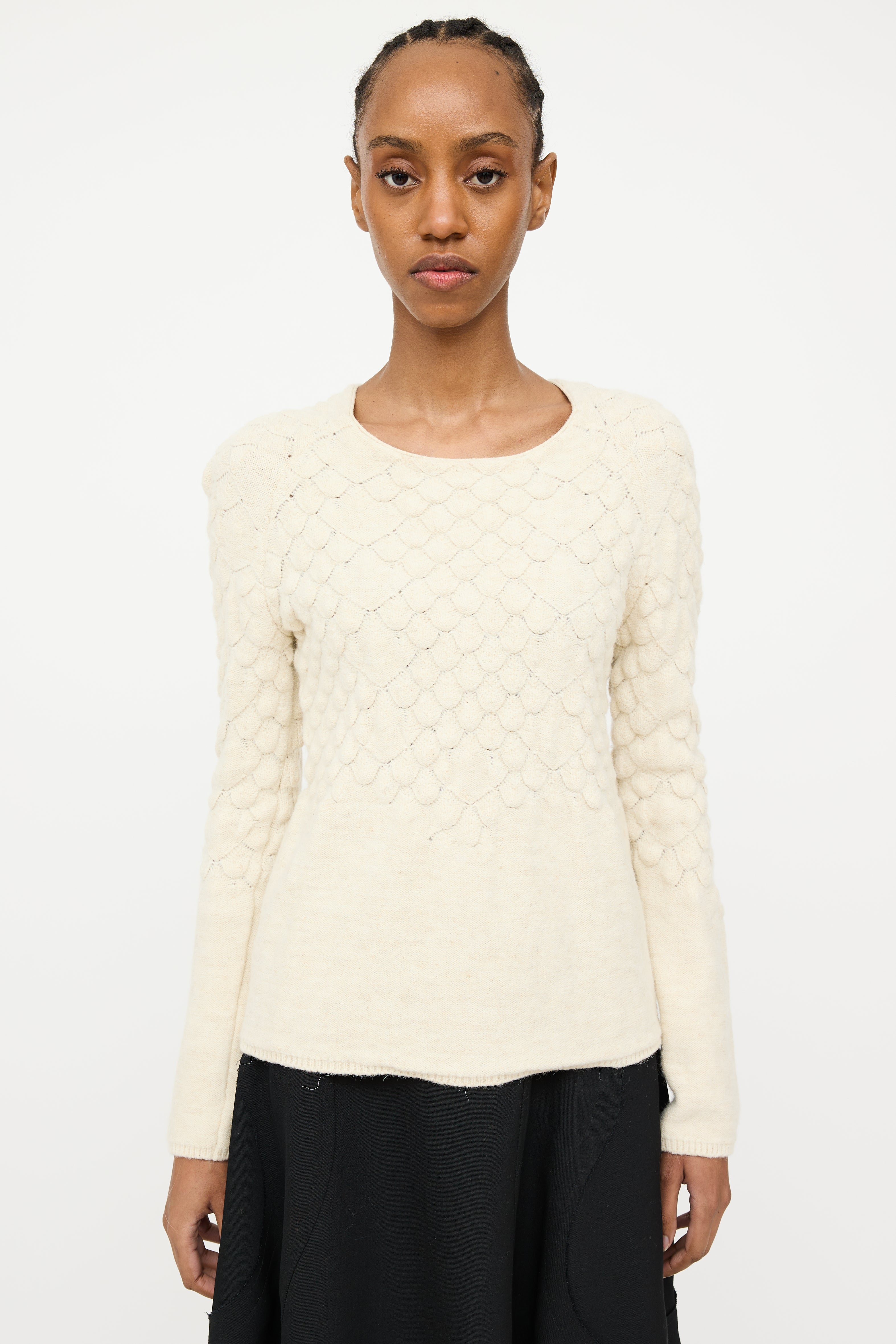 Pre-owned MM6 Maison Margiela cream wool knit sweater featuring a round neckline, long raglan sleeves, and scalloped pattern throughout.