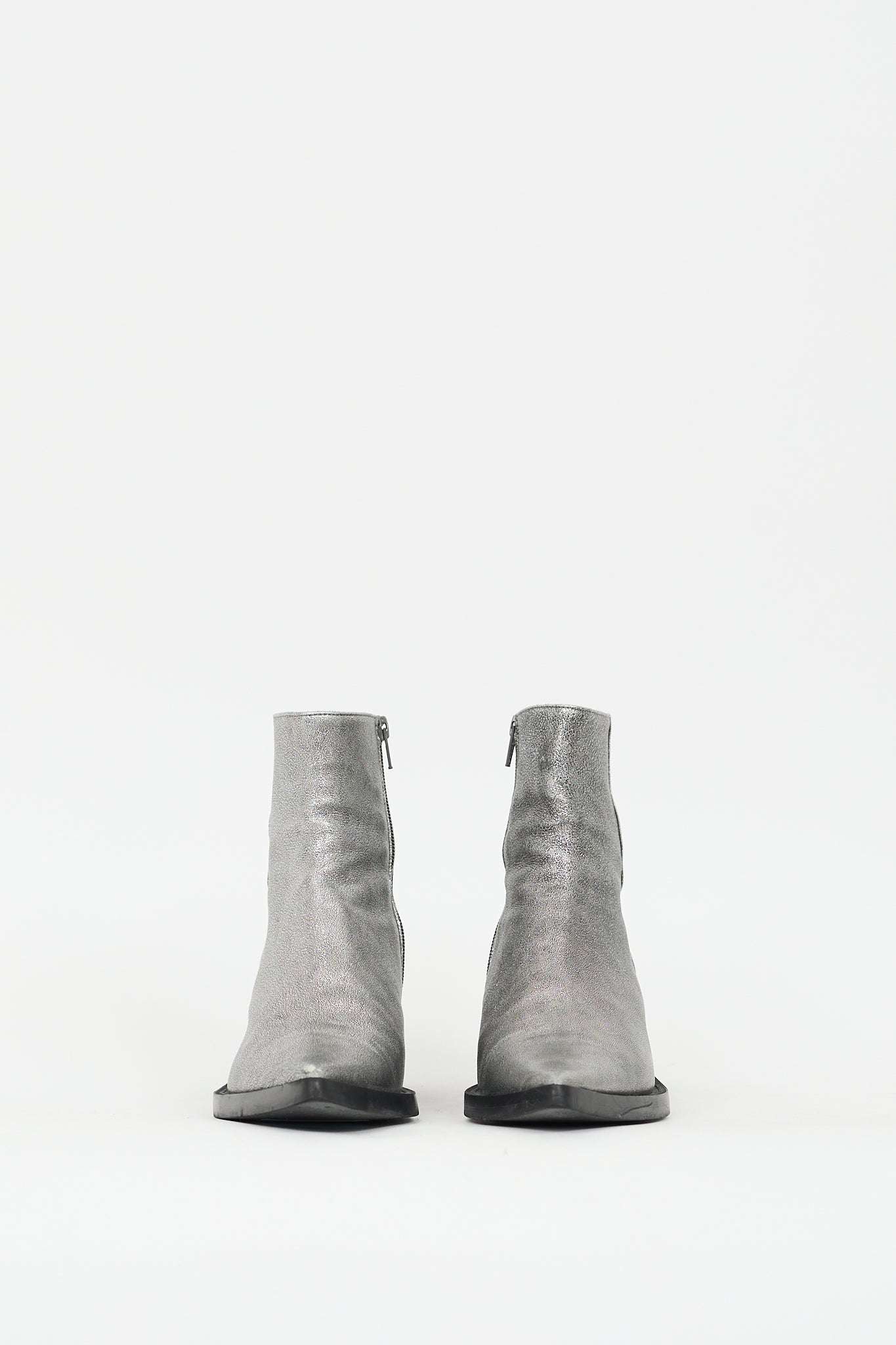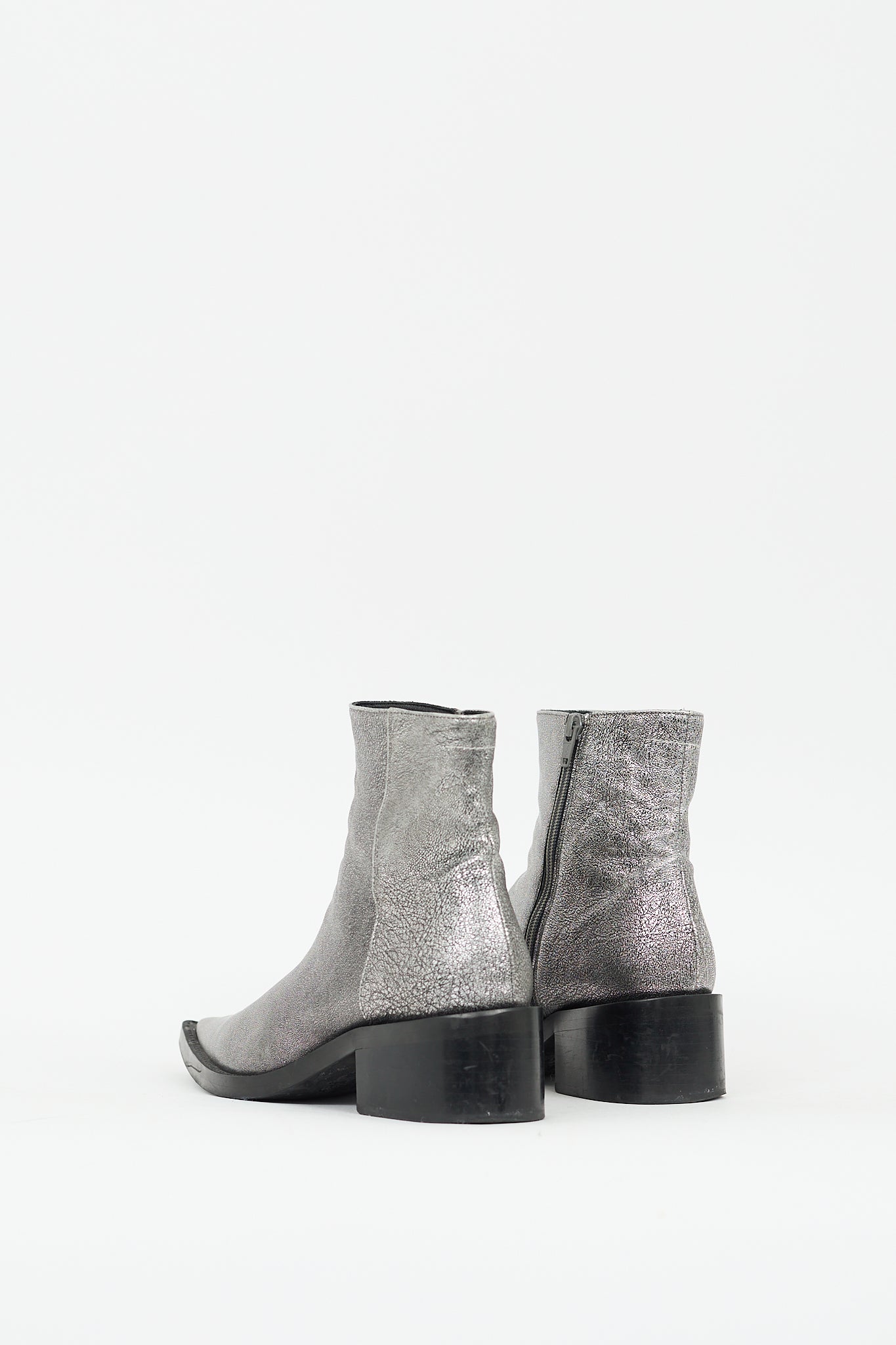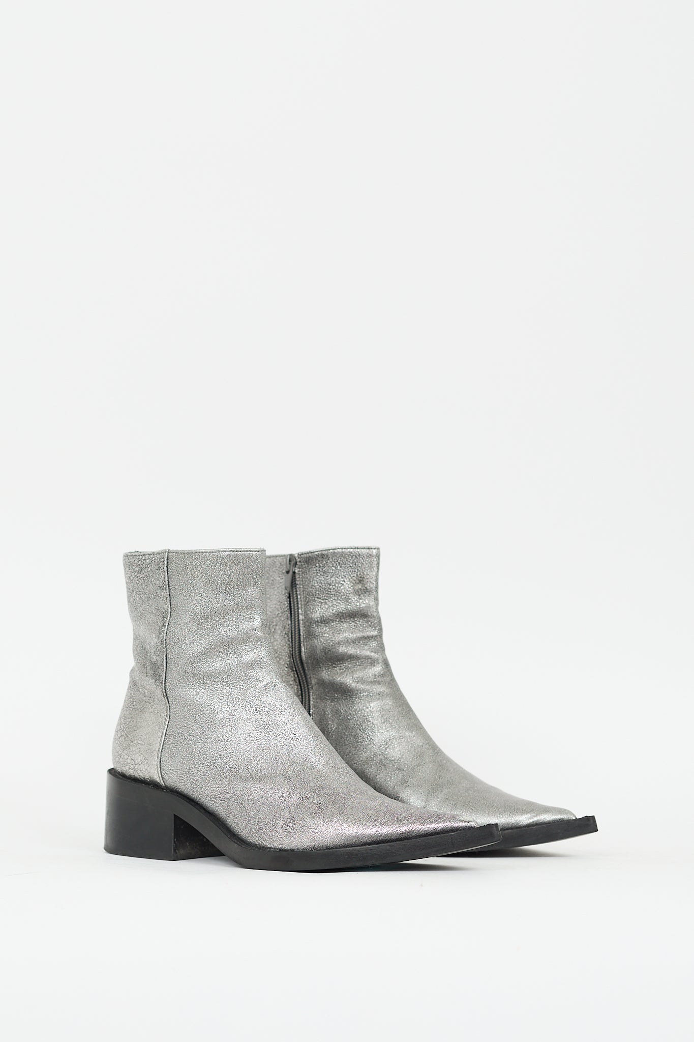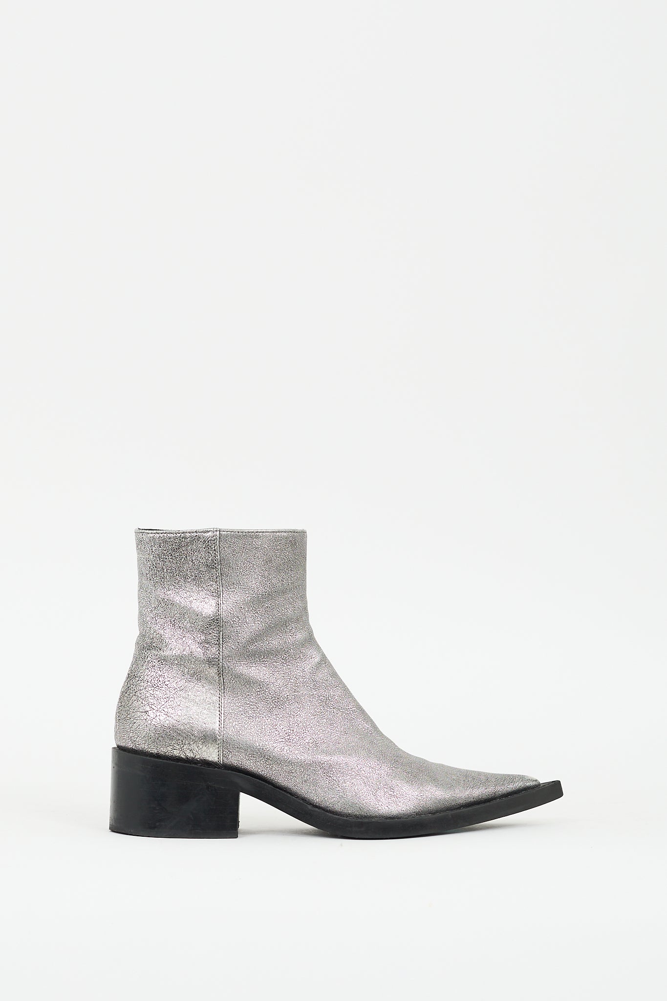 Pre-owned MM6 Maison Margiela silver leather ankle boots featuring pointed toe, inner side zip closure, black short stacked block heel, and pull on entry.